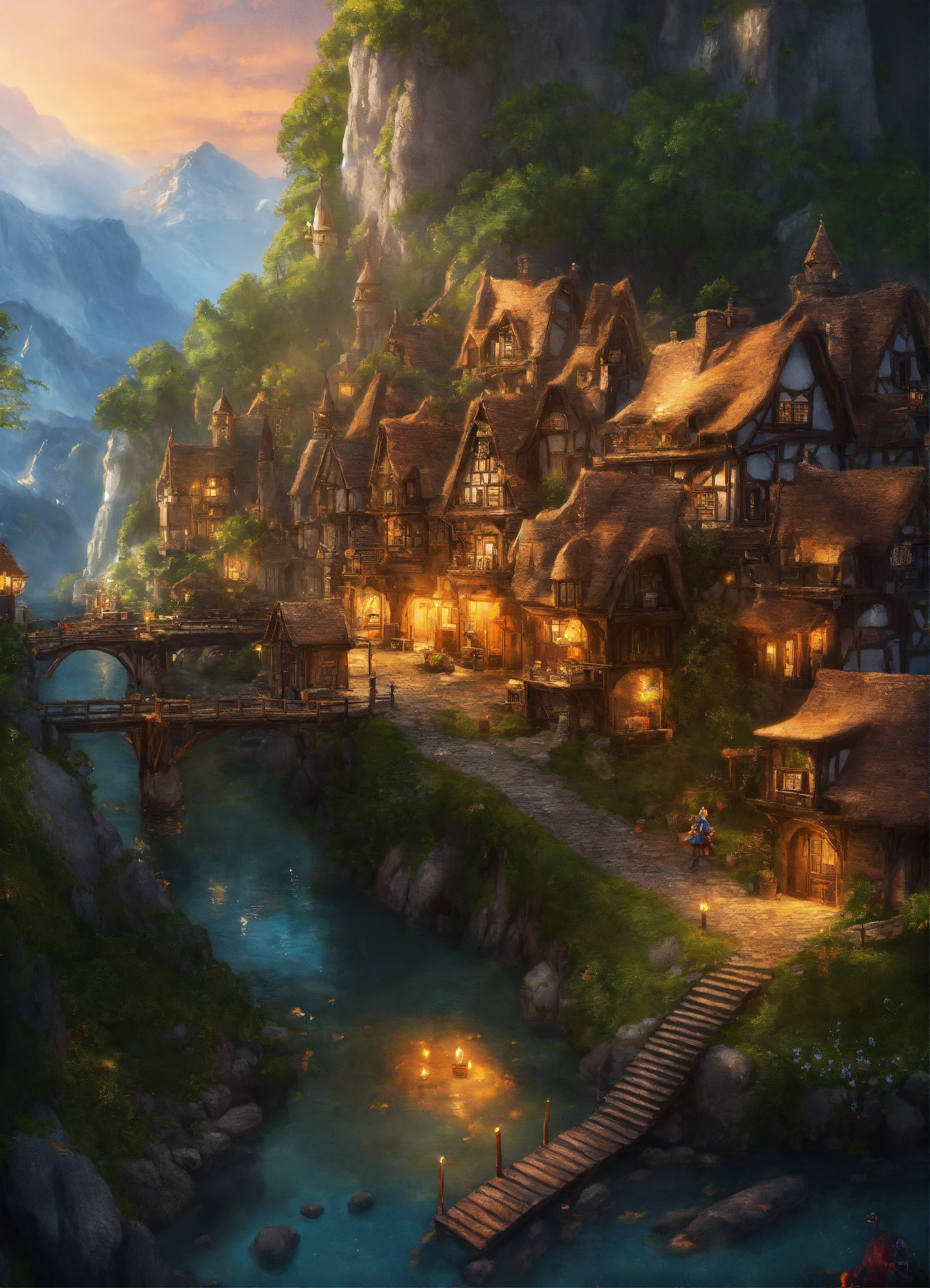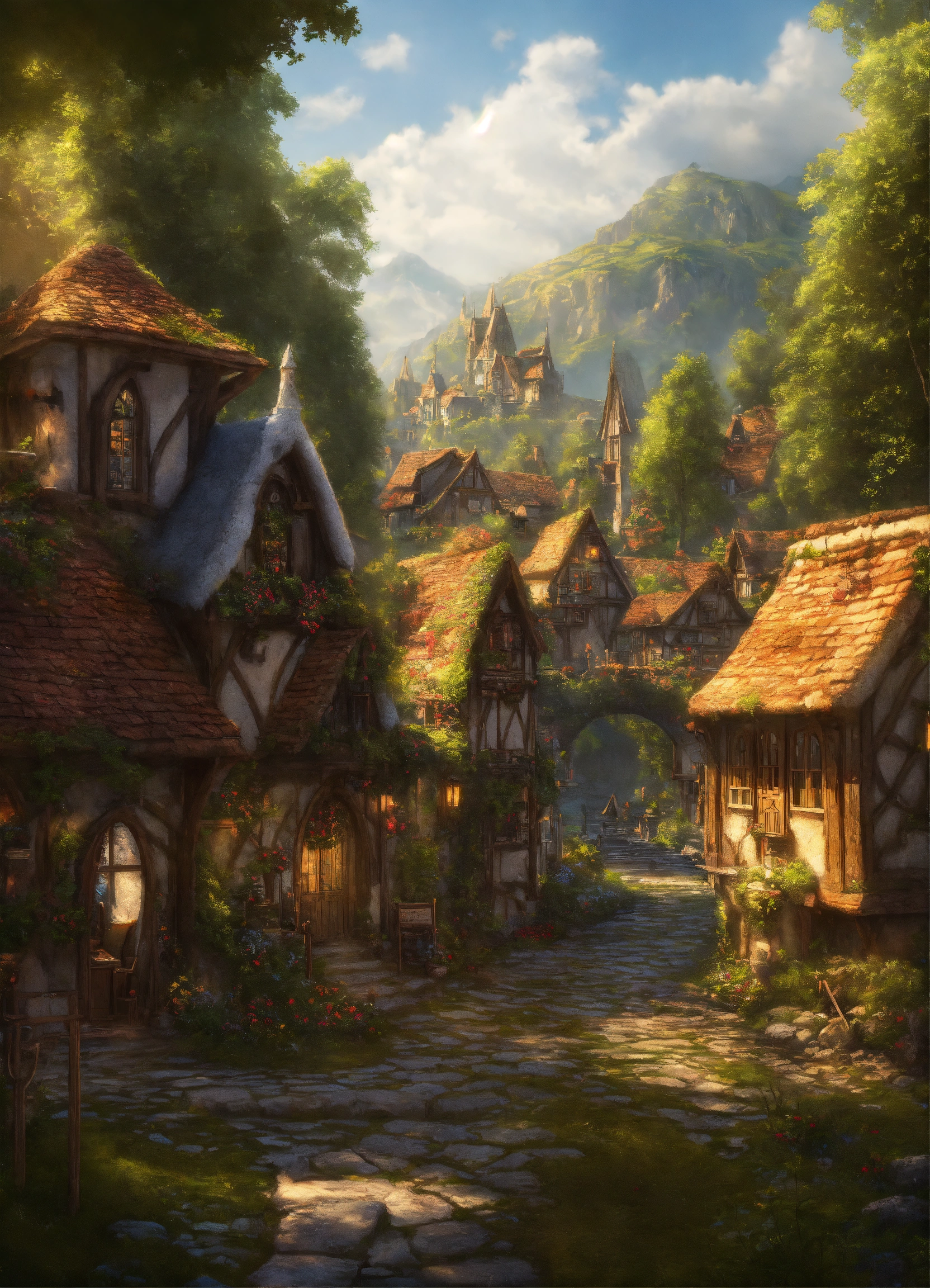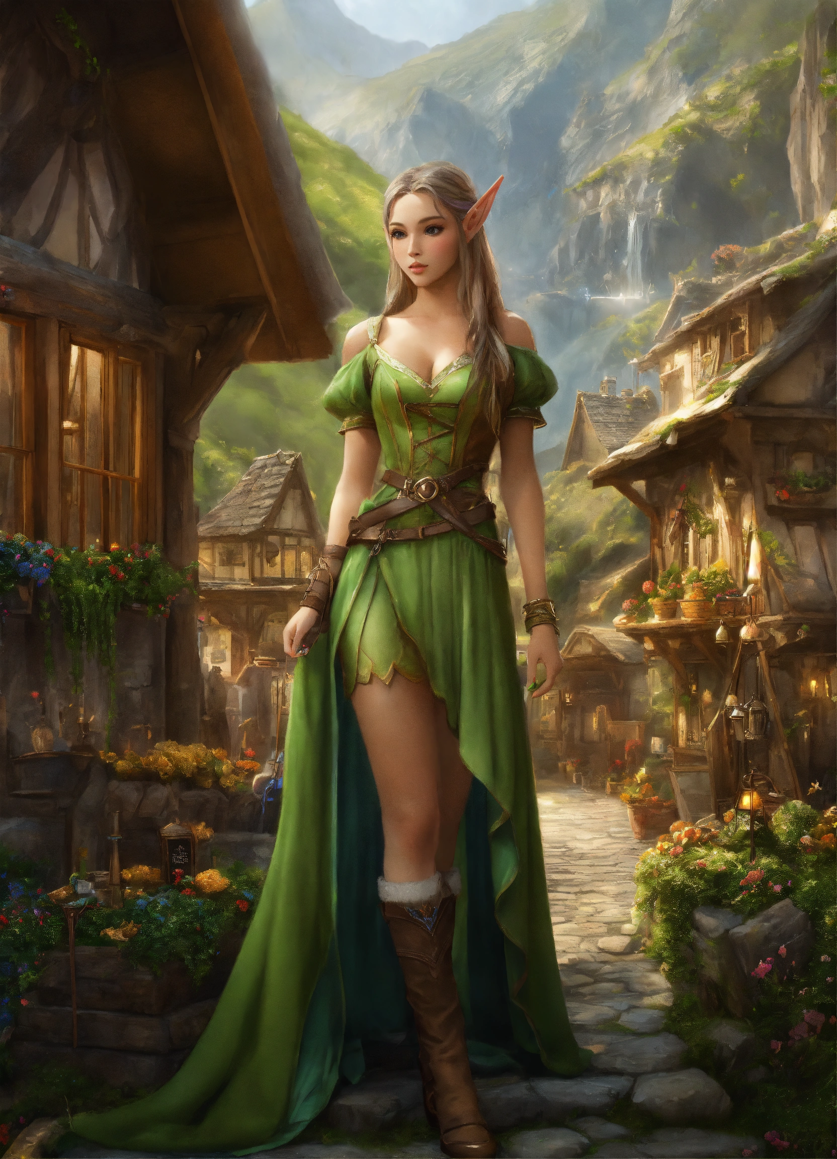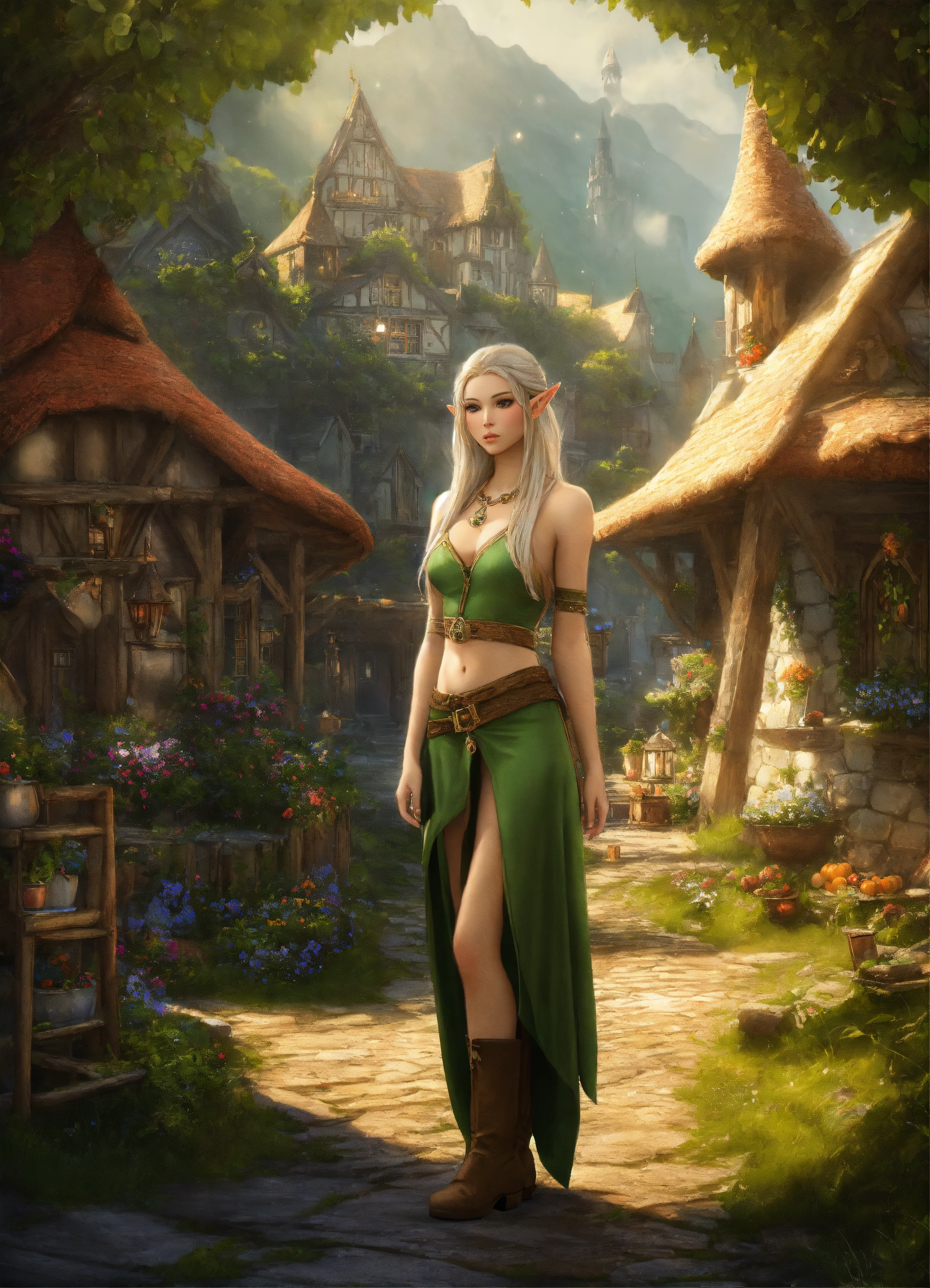 Beautiful elf town with a full body beautiful elf in it perfect clarity photorealistic high definition realistic art photo