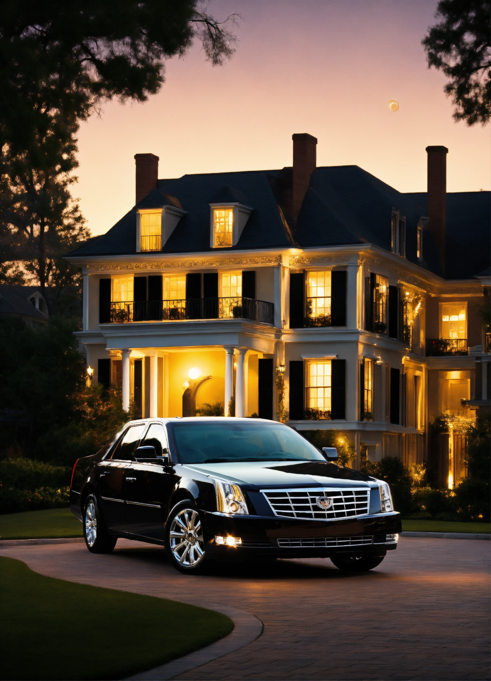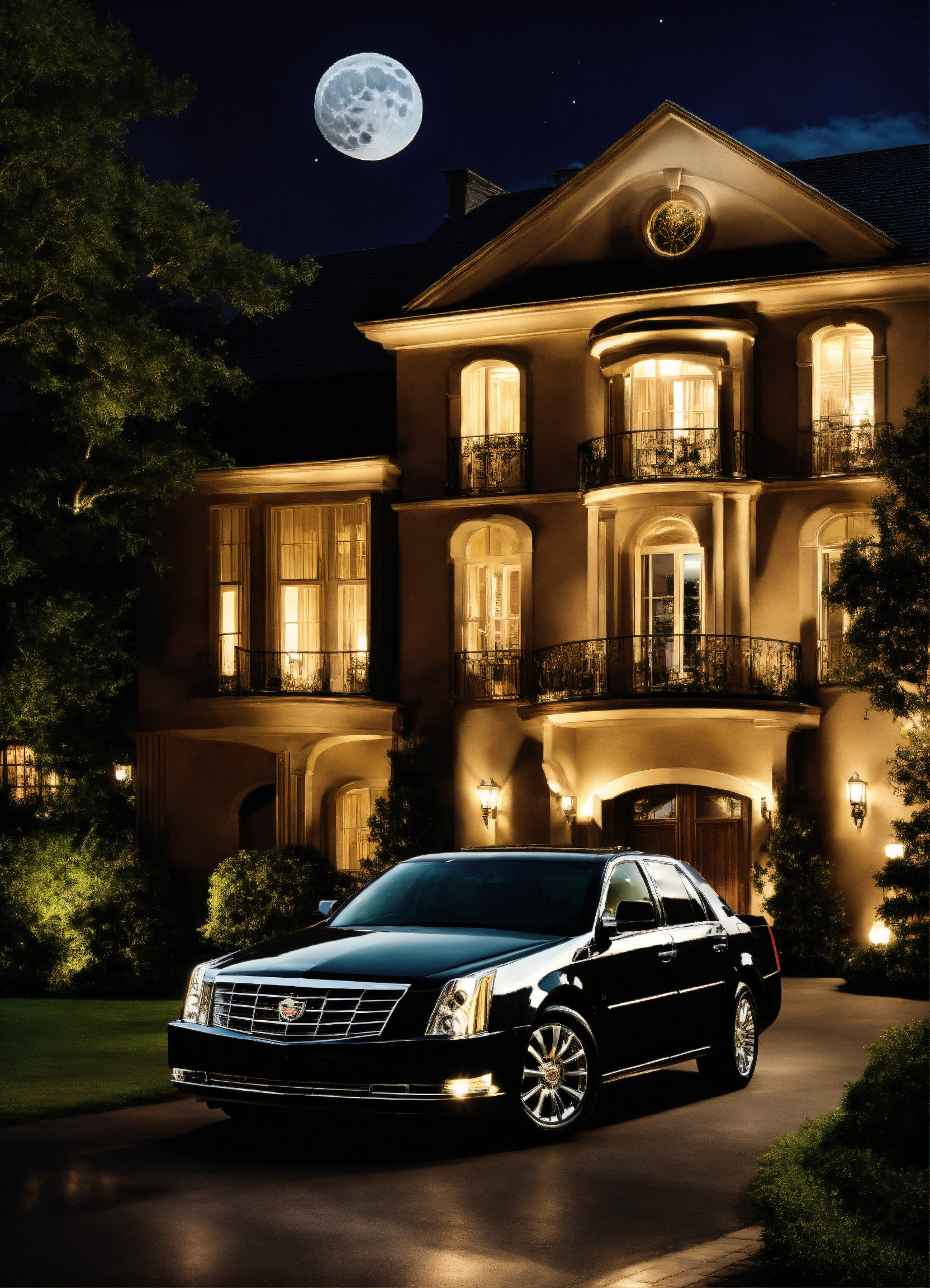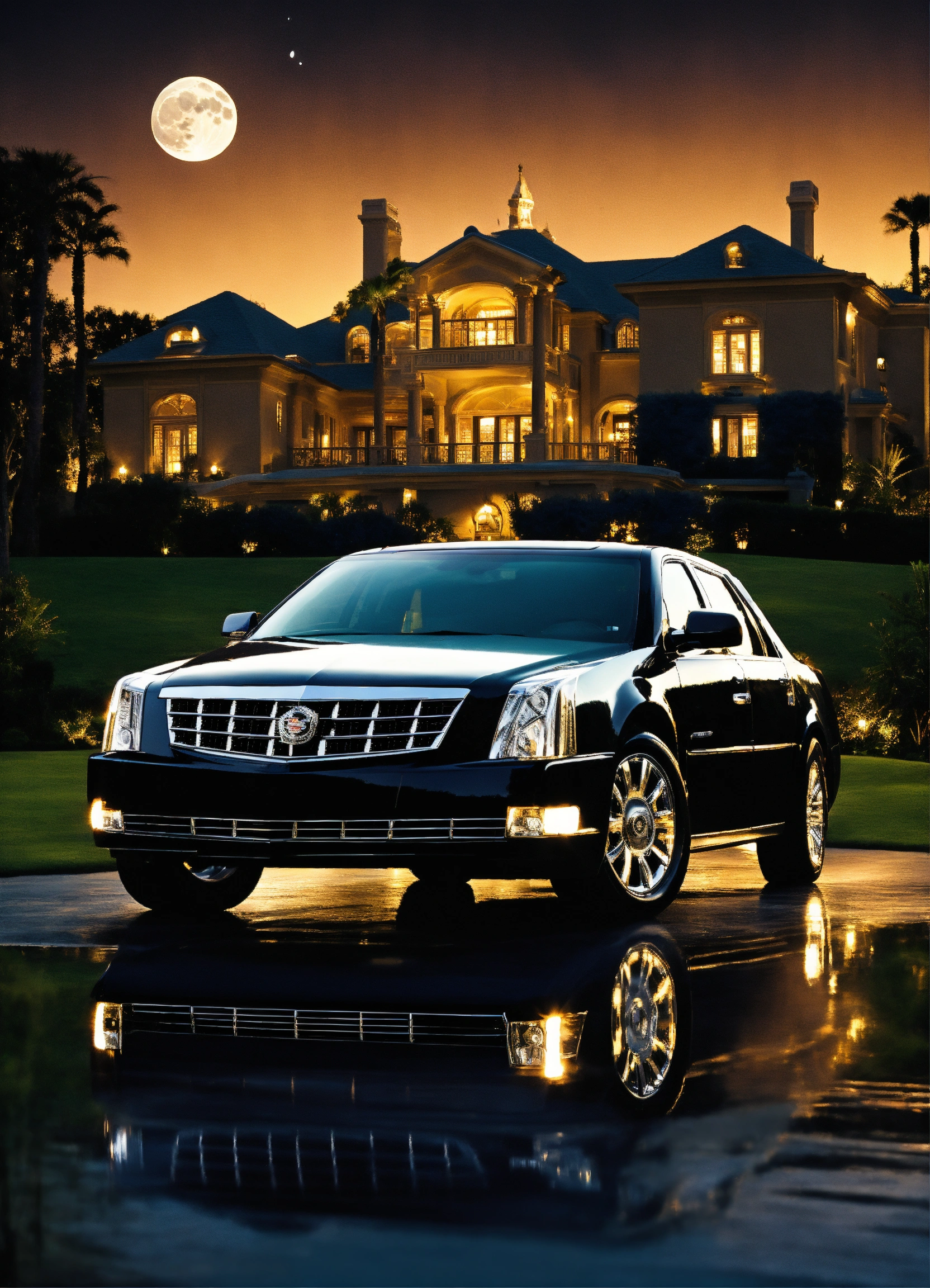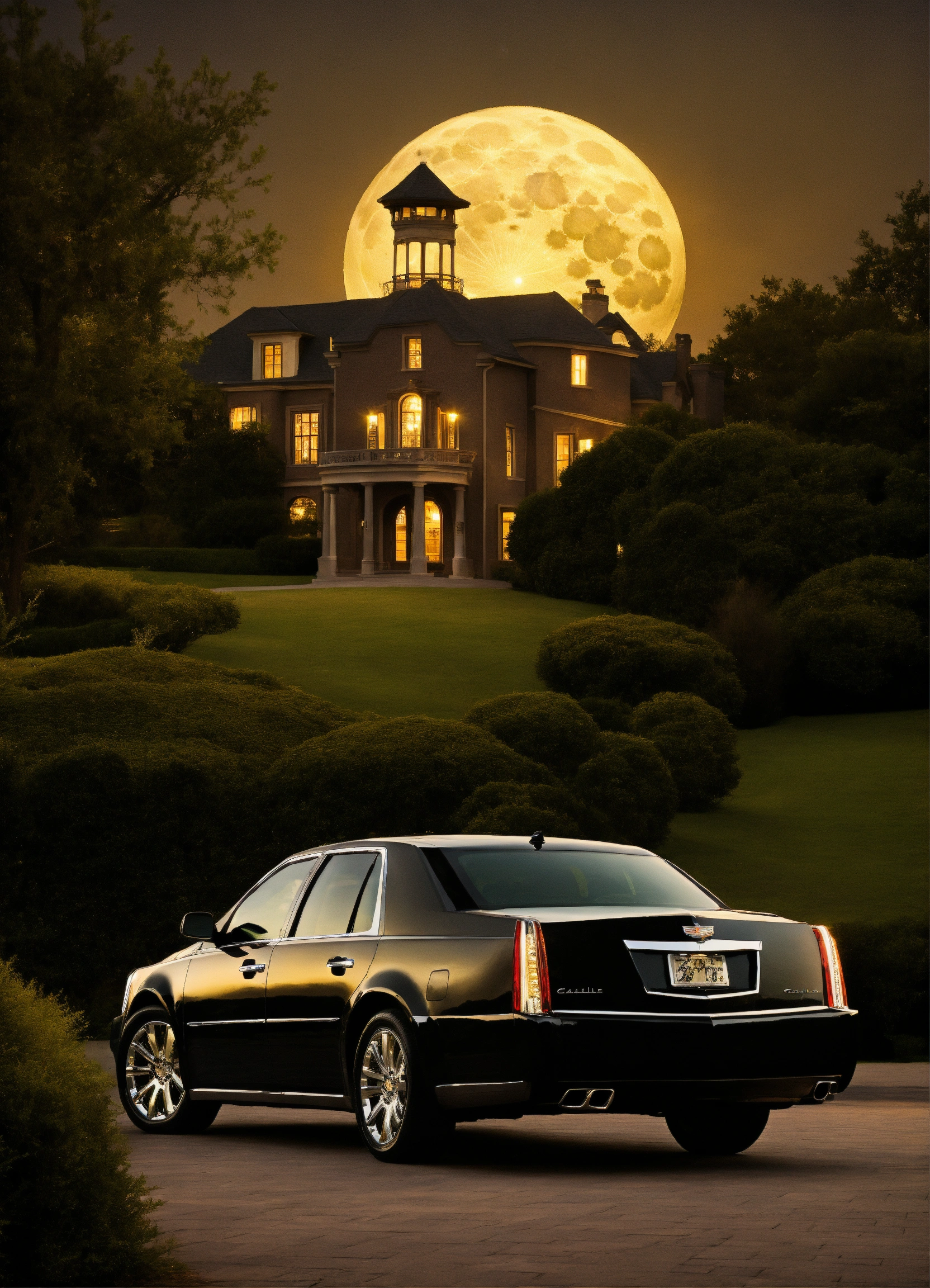 2010 cadillac dts black and gold with mansion background and moonlight landscape