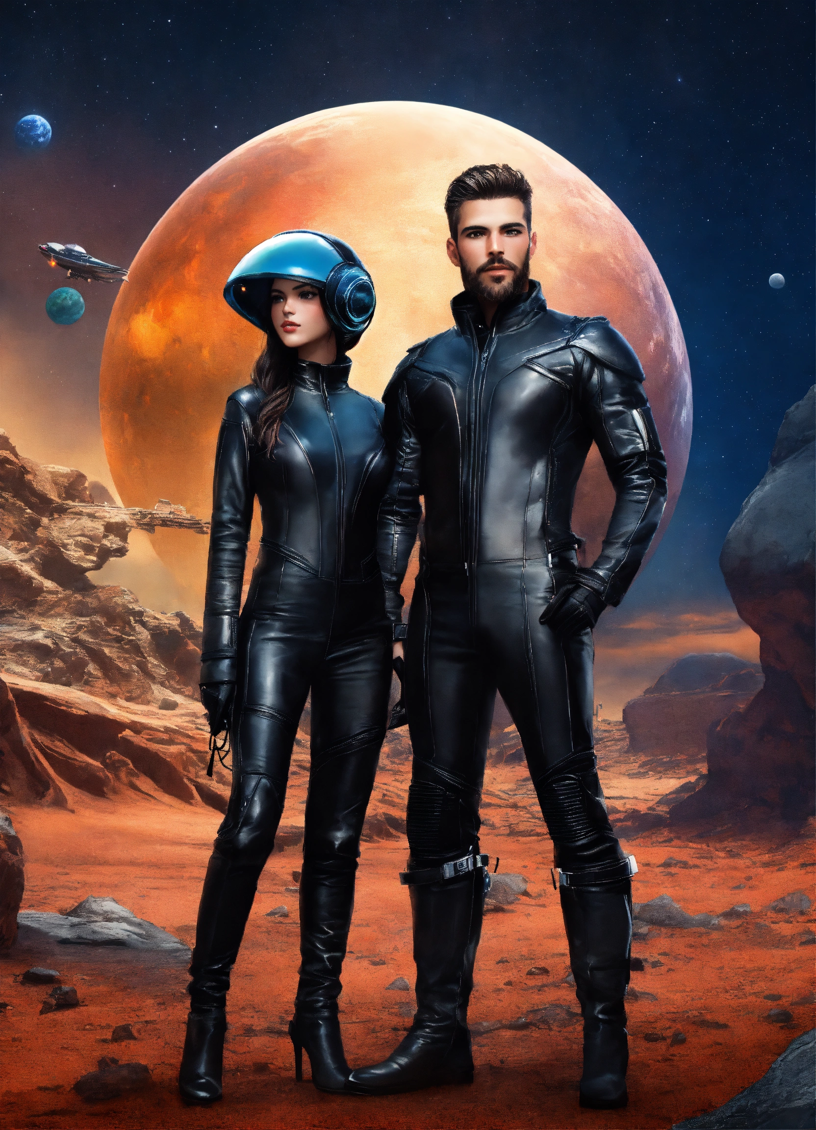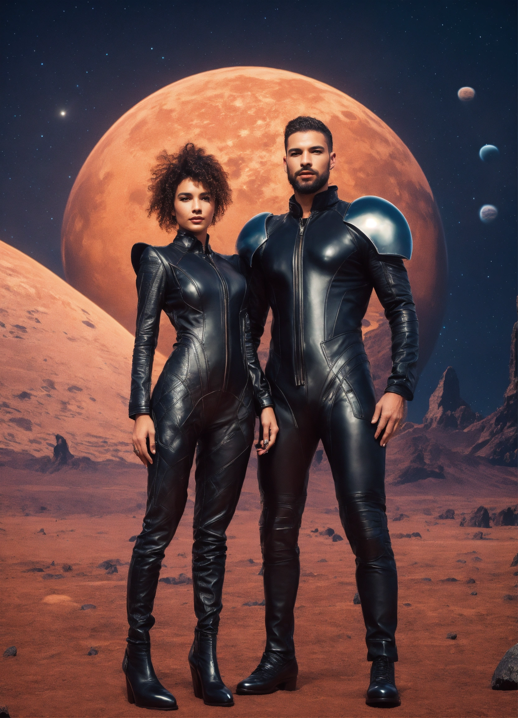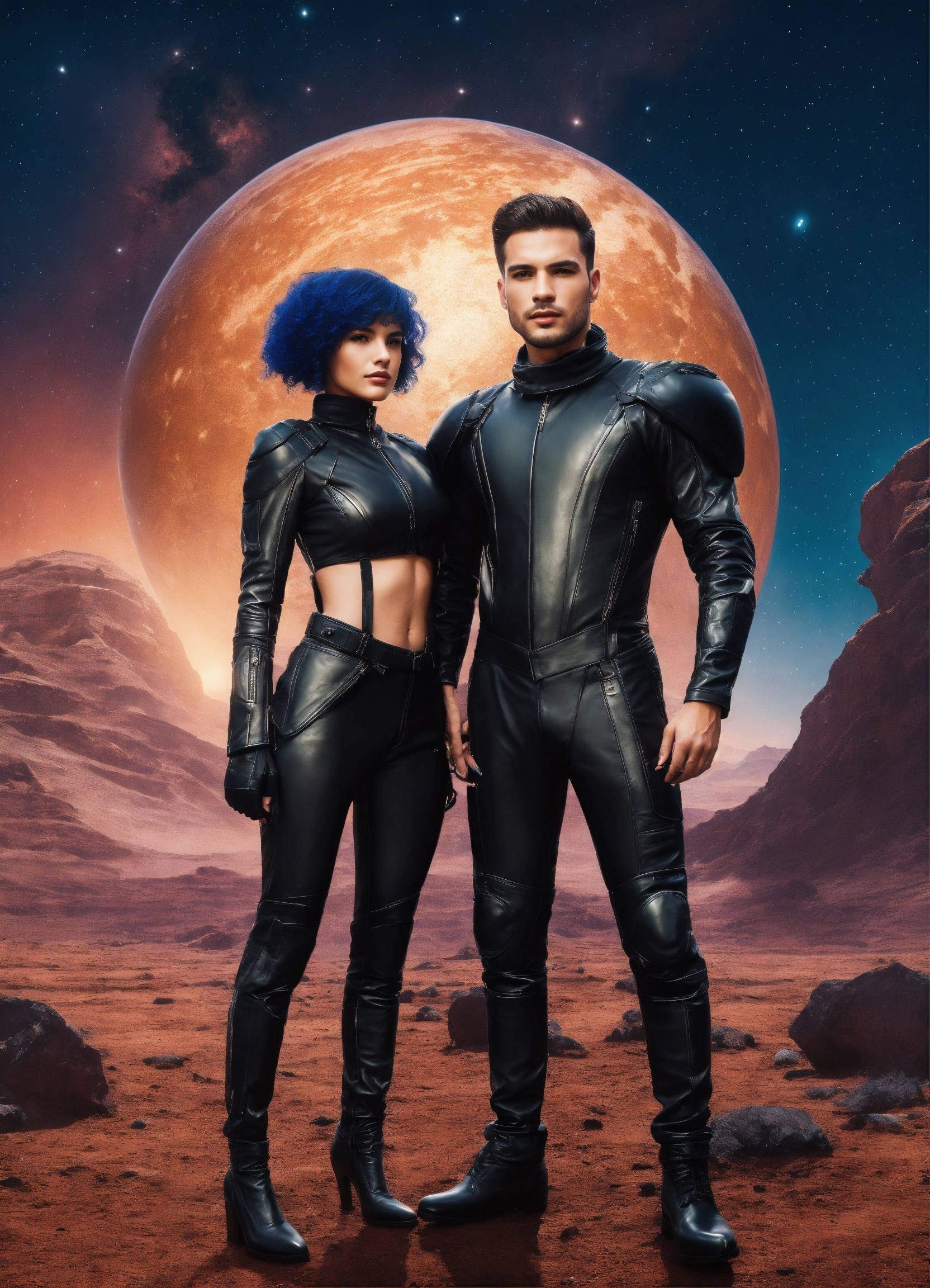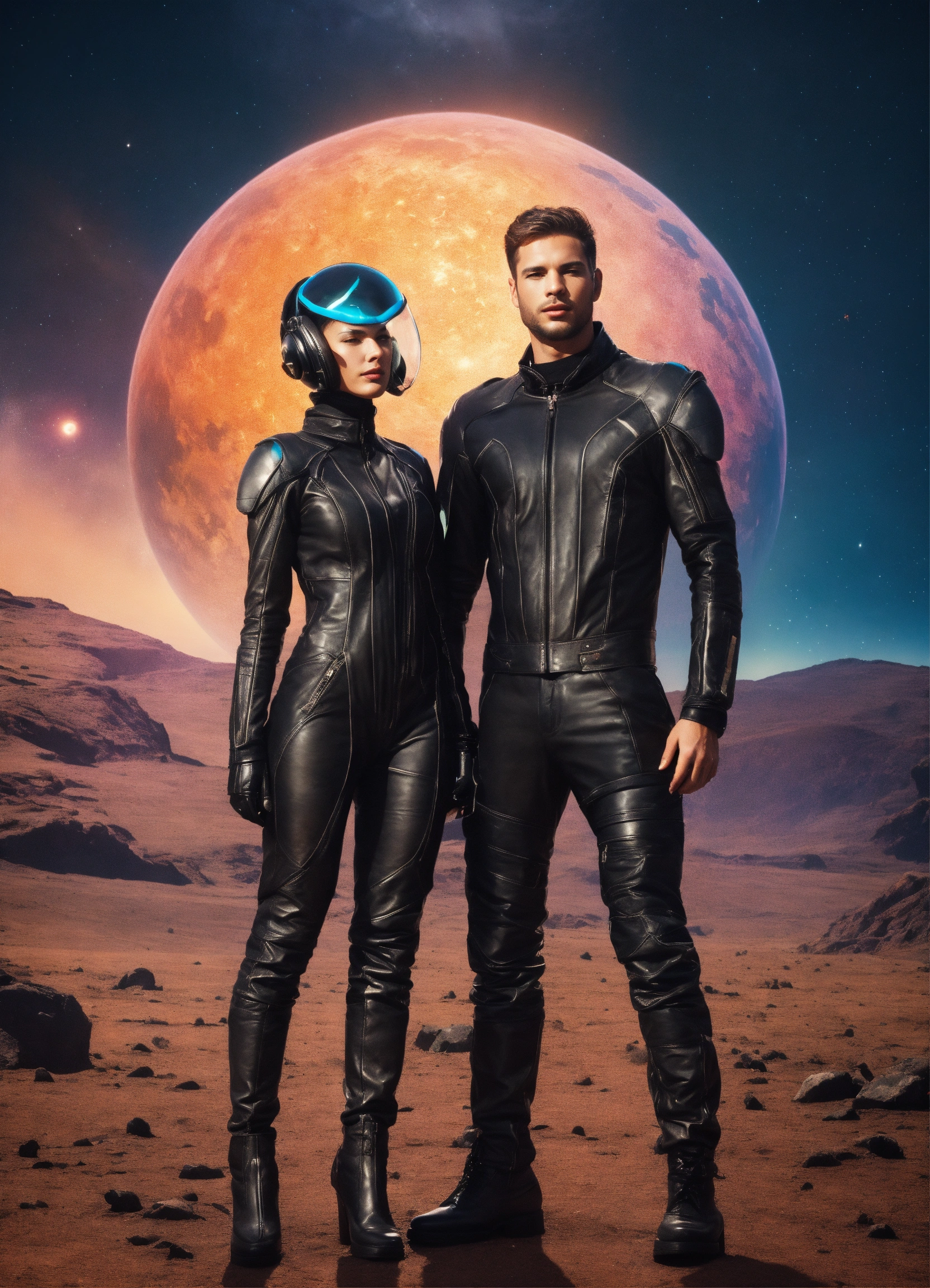 A very beautiful couple, a man and a woman, in leather suits of the future, in full growth, on an alien beautiful planet