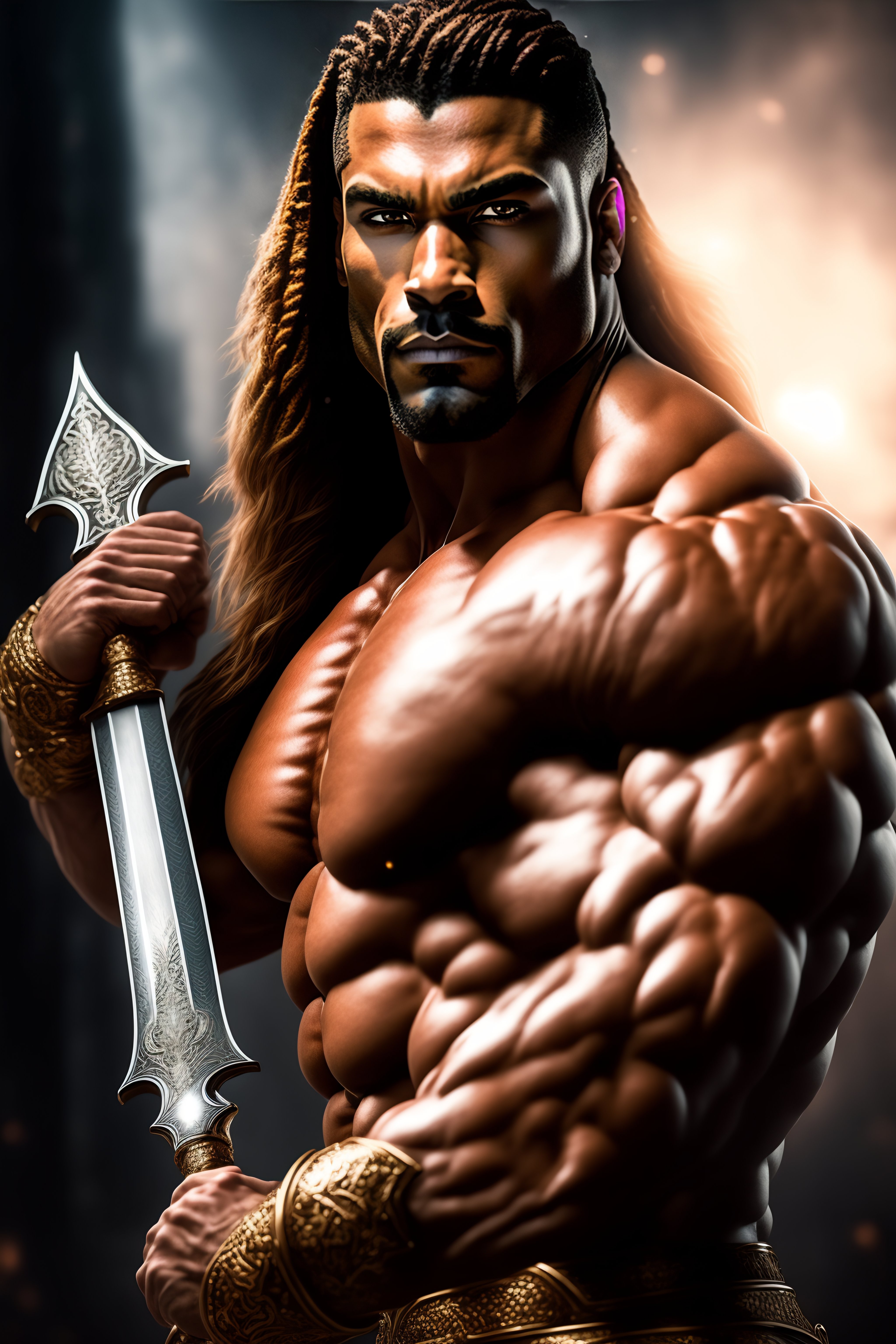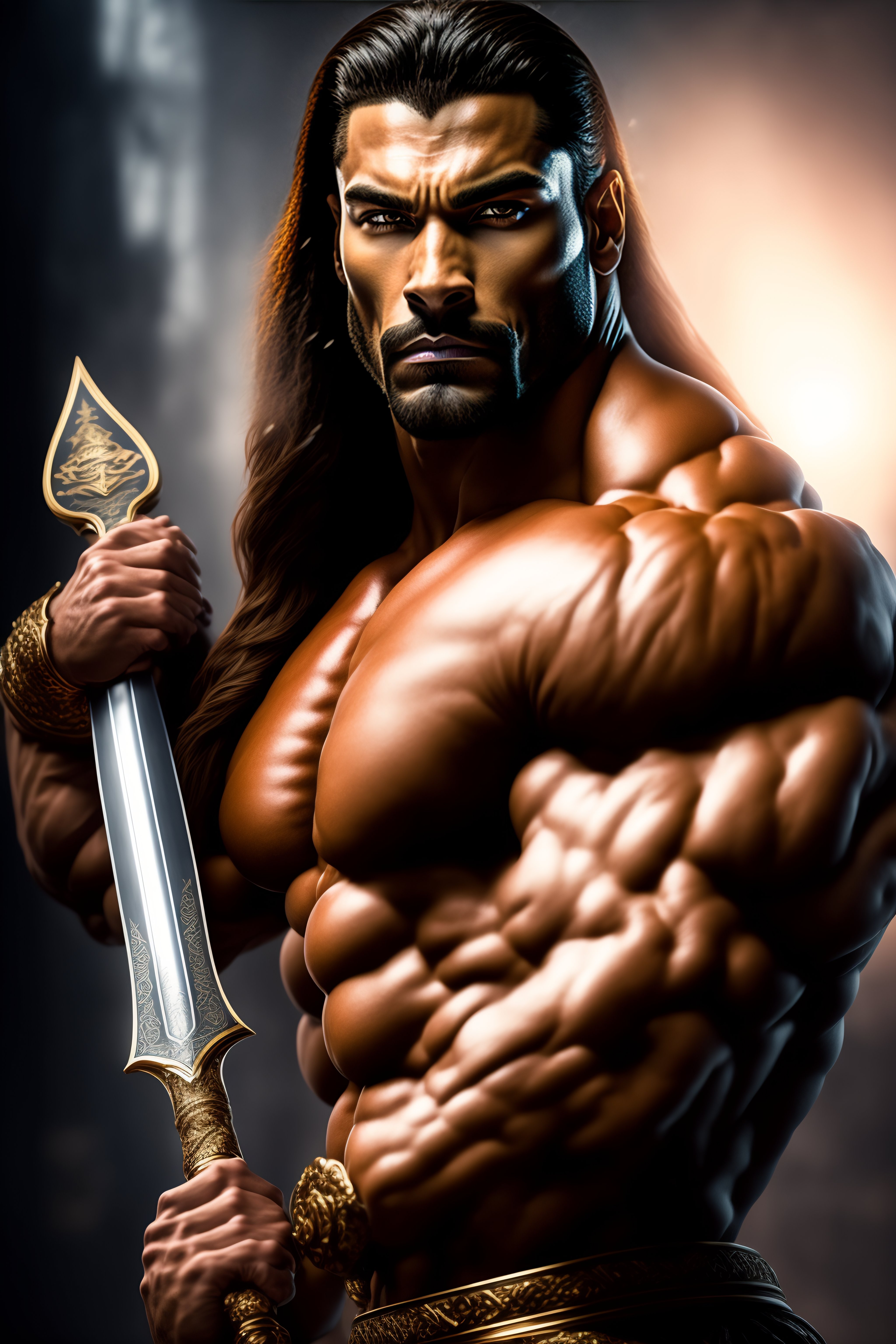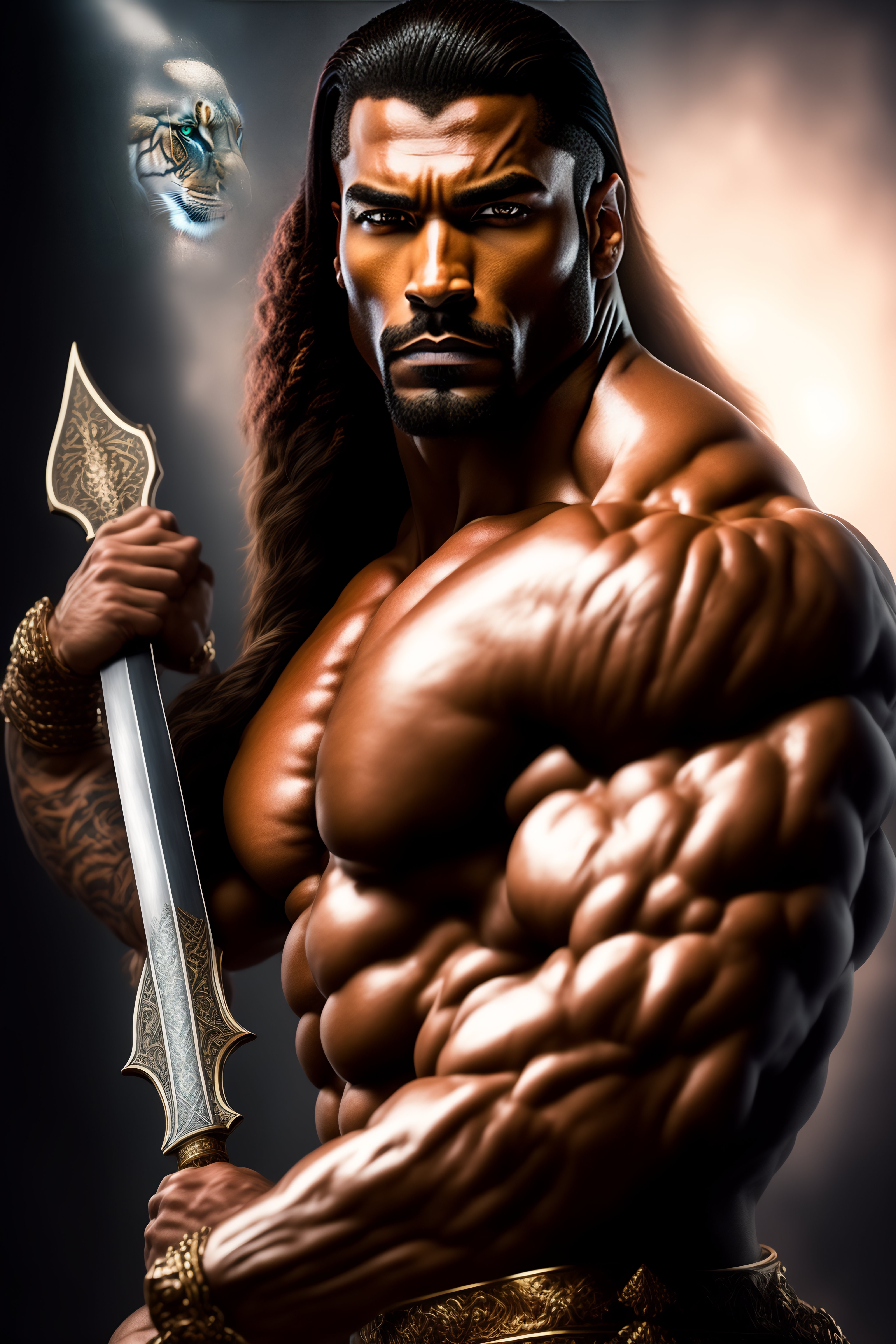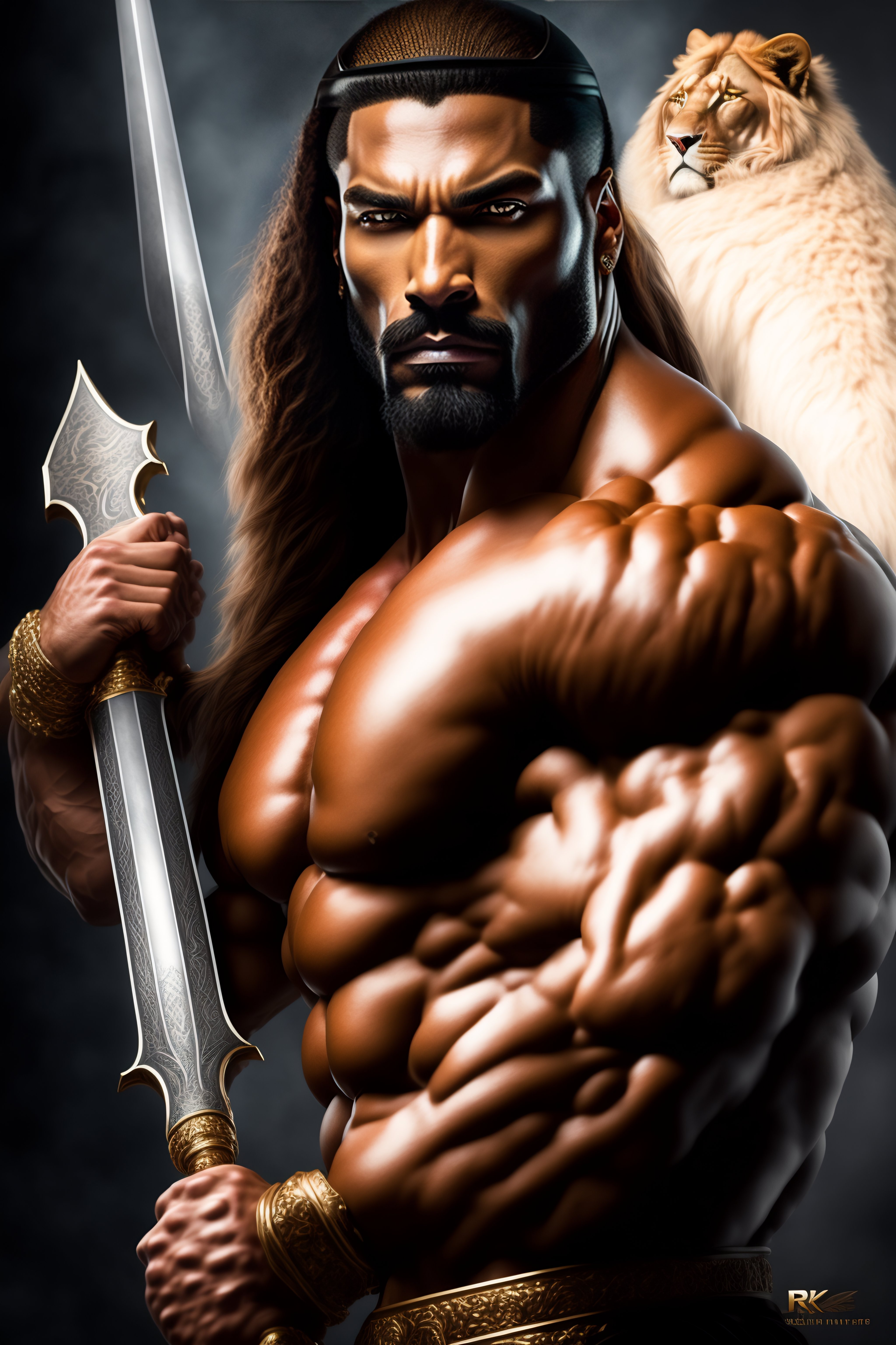 Art of a highly detailed muscular man with a lion's face holding a hyper realistic rpg game 8k sword