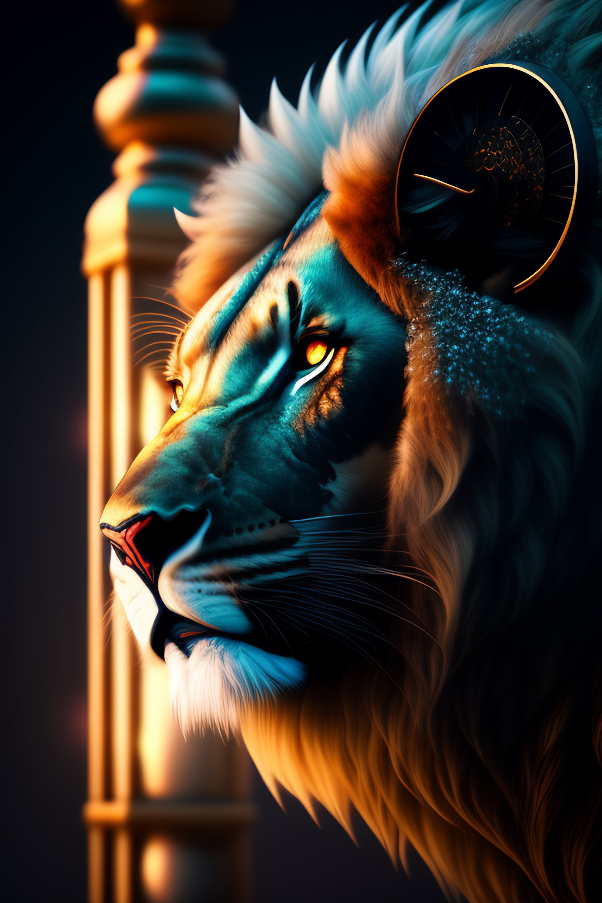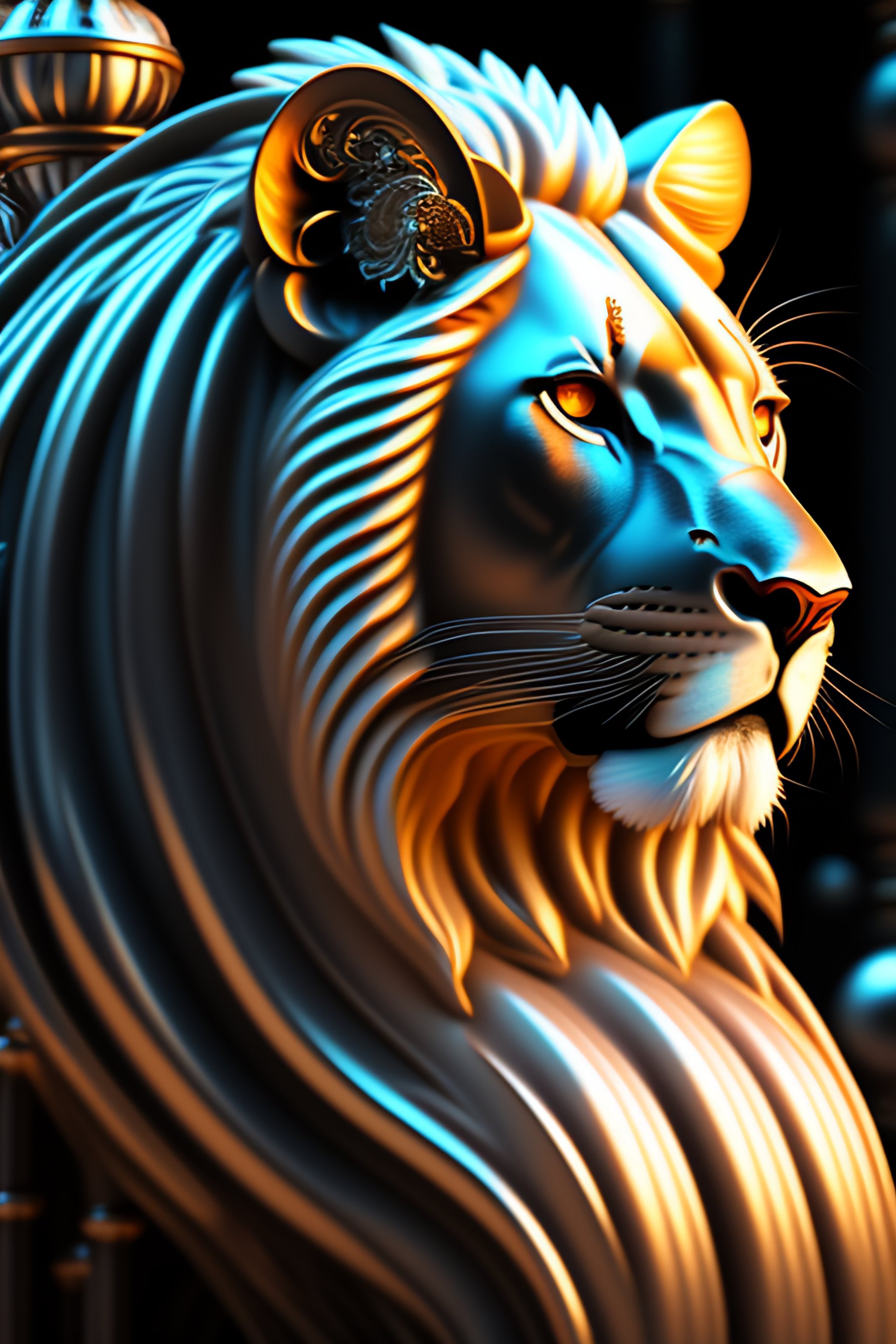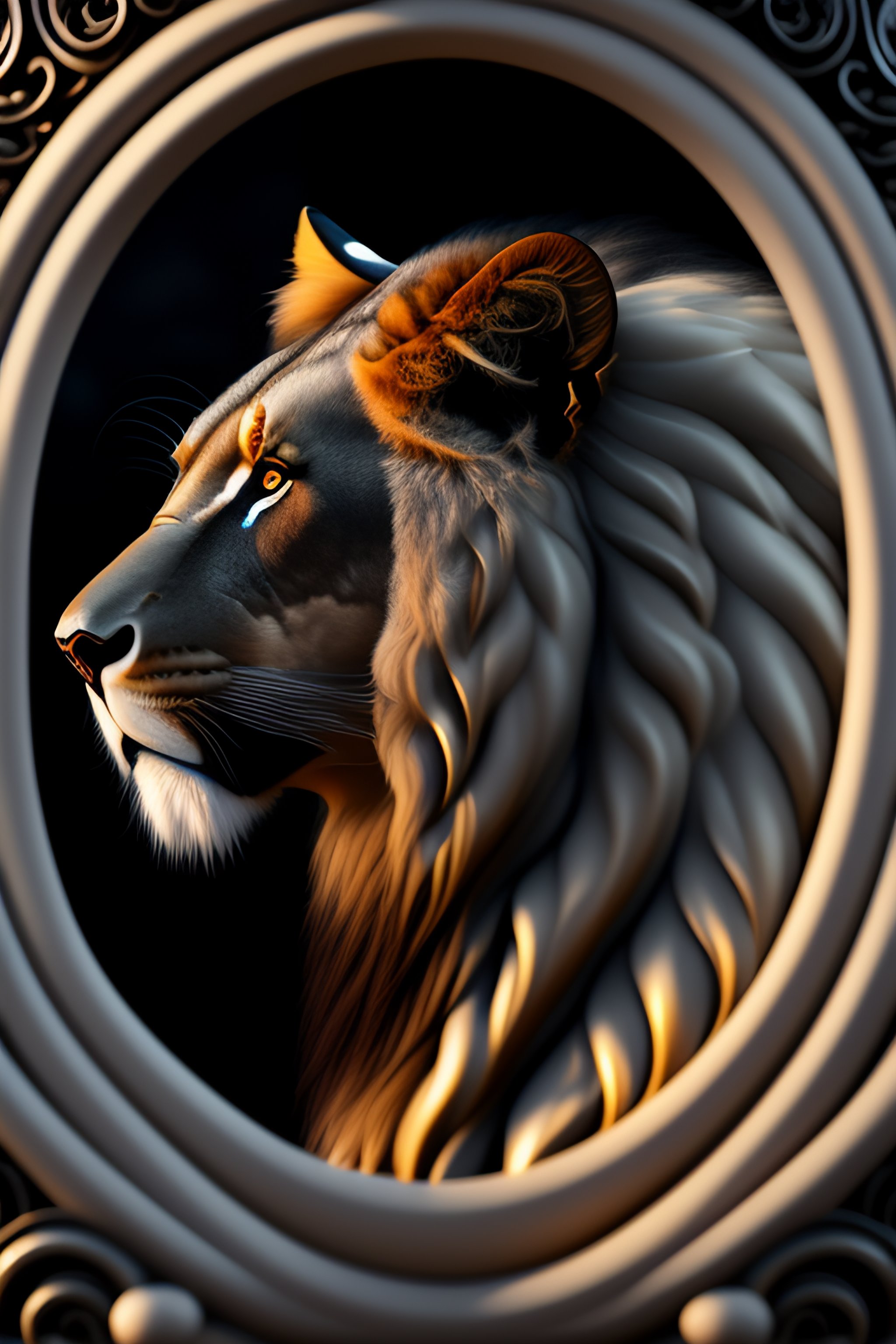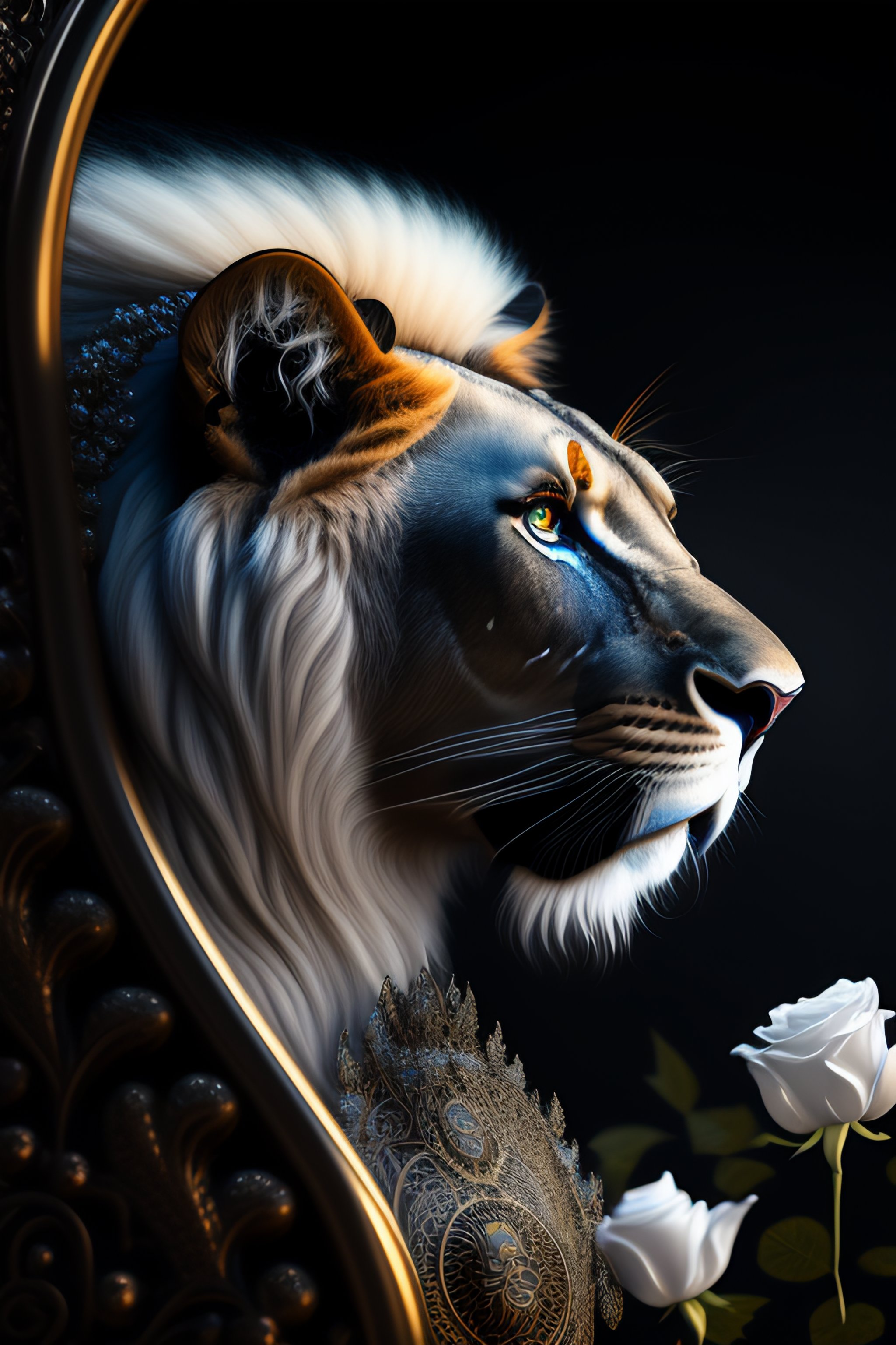 Mythical dreamy black and white organic bio - mechanical spinal ribbed profile whole shot portrait of angry lion, detail of translucent steampunk beautiful intricate monochrome angelic - roaring - vegetal - roses - gothic - cyborg, highly detailed, intricate translucent ivy jelly ornate, poetic, translucent microchip ornate, 3d render, digital art, octane render, 8k artistic lithography, cirlcle, gateway, whole shot wide angle