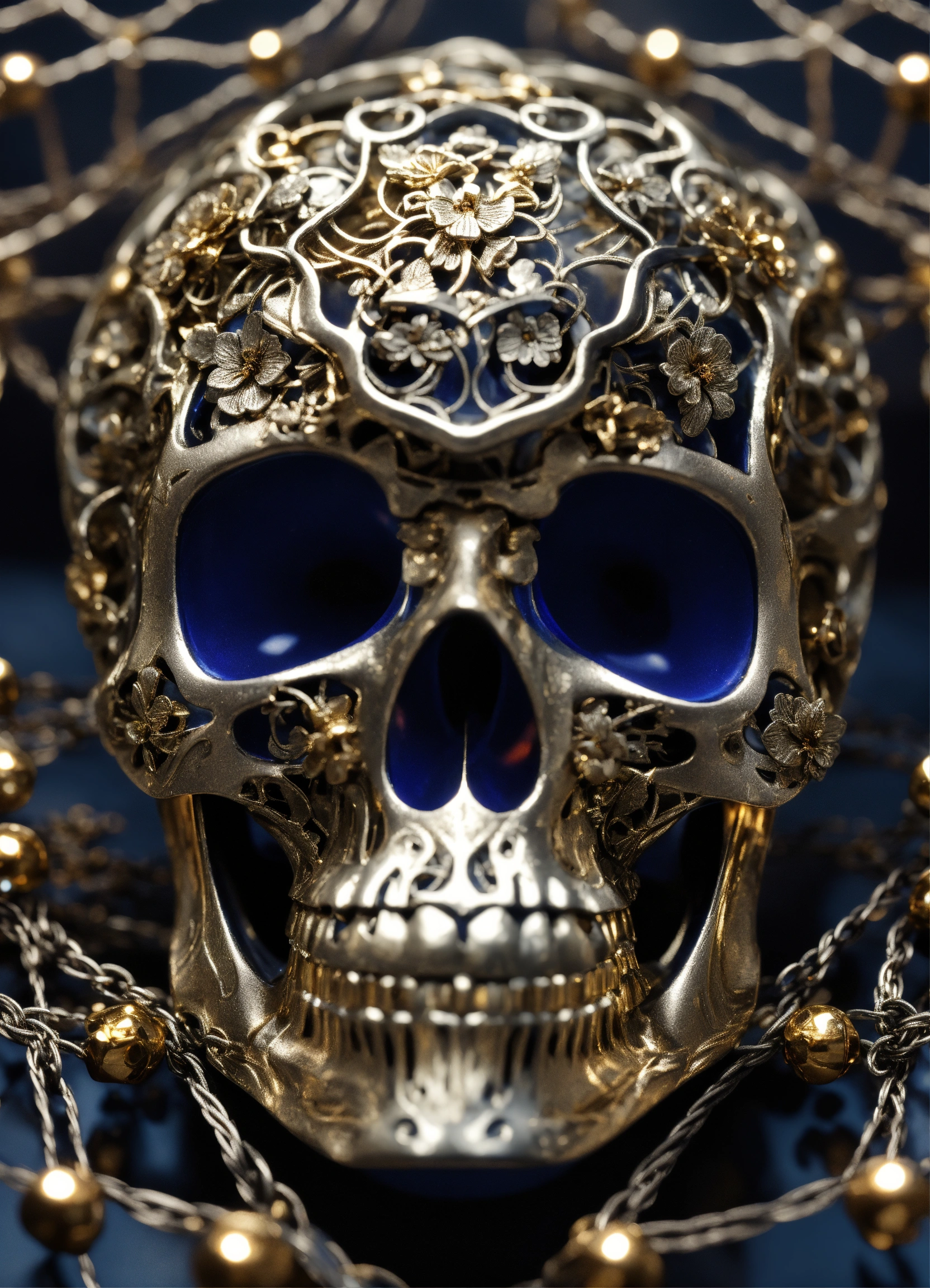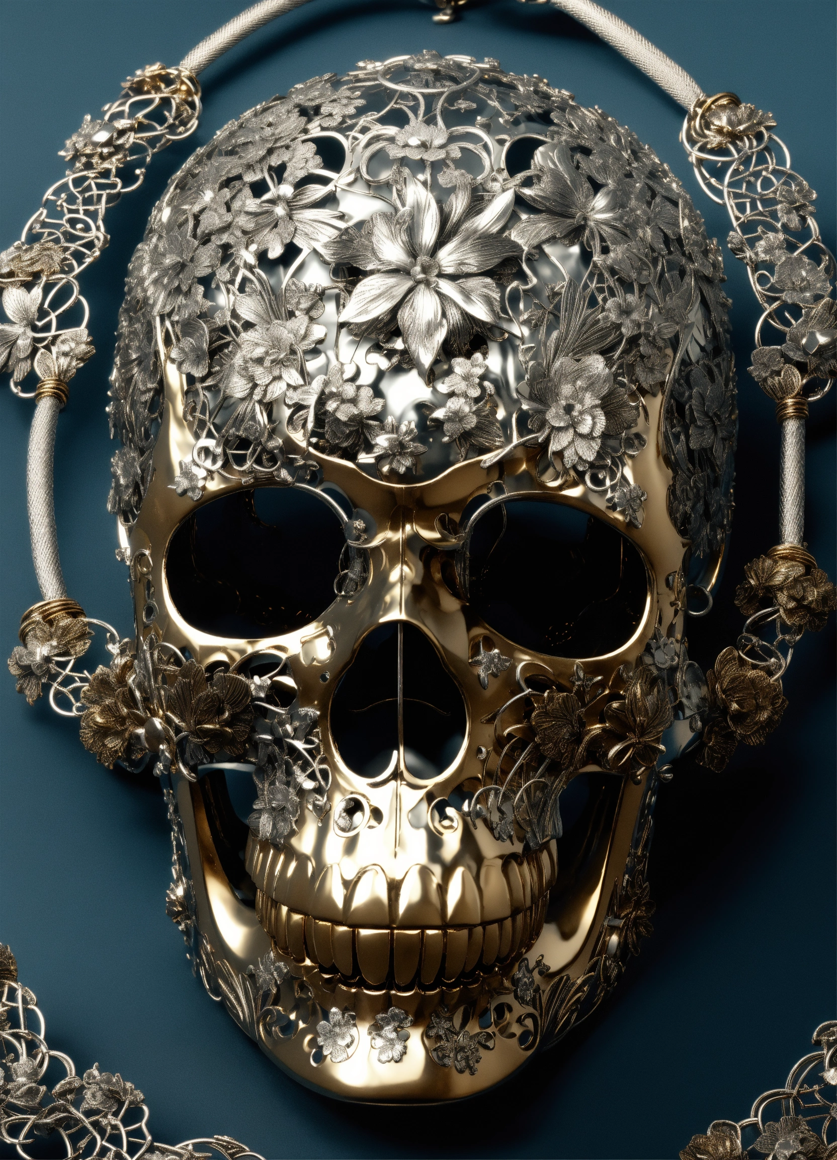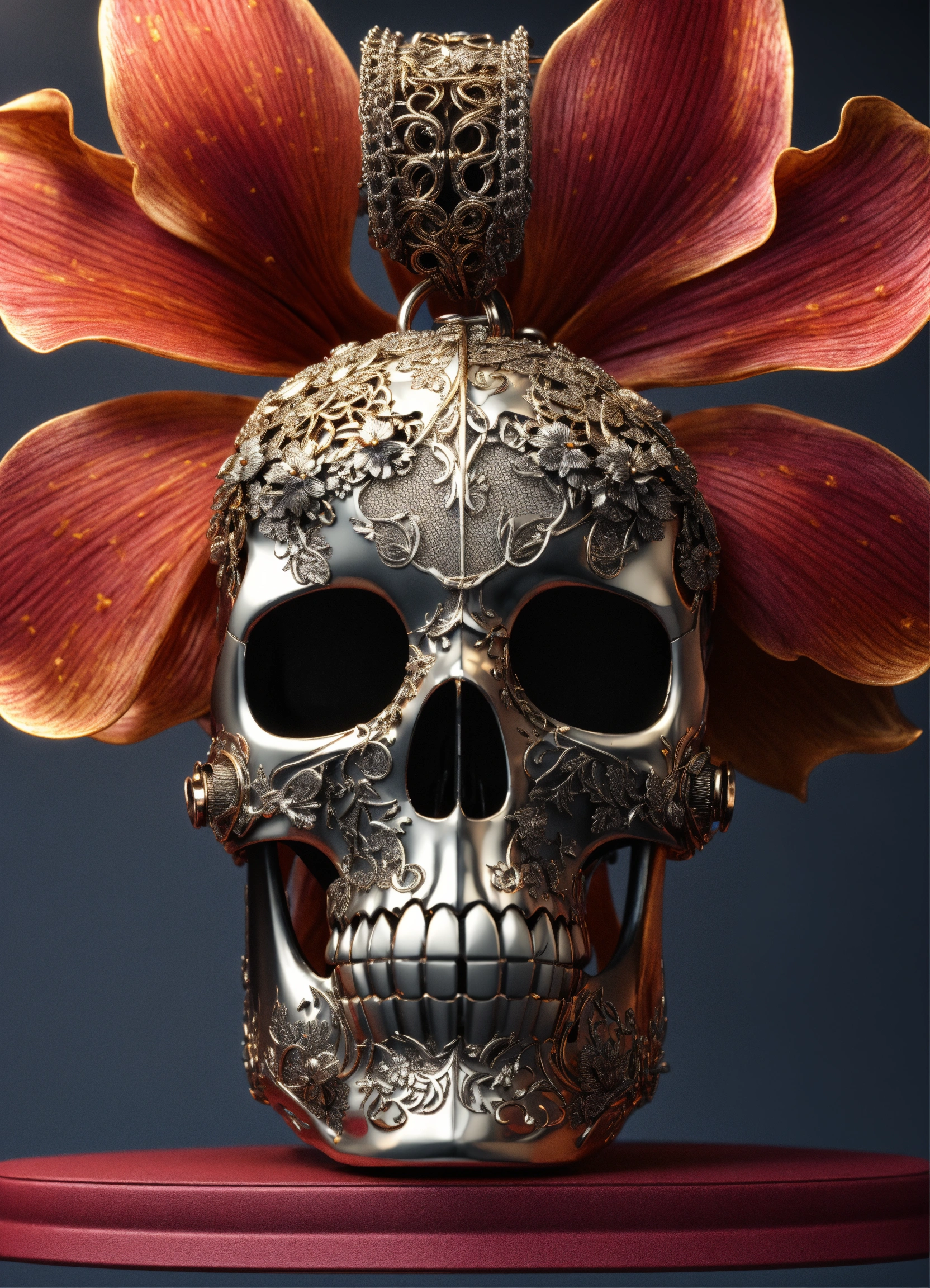 Complex 3d render ultra detailed of a meiji period orchid skull necklace, shibiuchi metal texture, ford hallam style, tsuba, iron, silver, silver material, intricate details, mesh wire, mandelbrot fractal, cable wires, microchip, elegant, hyper realistic, ultra detailed, octane render, volumetric lighting, 8k post-production