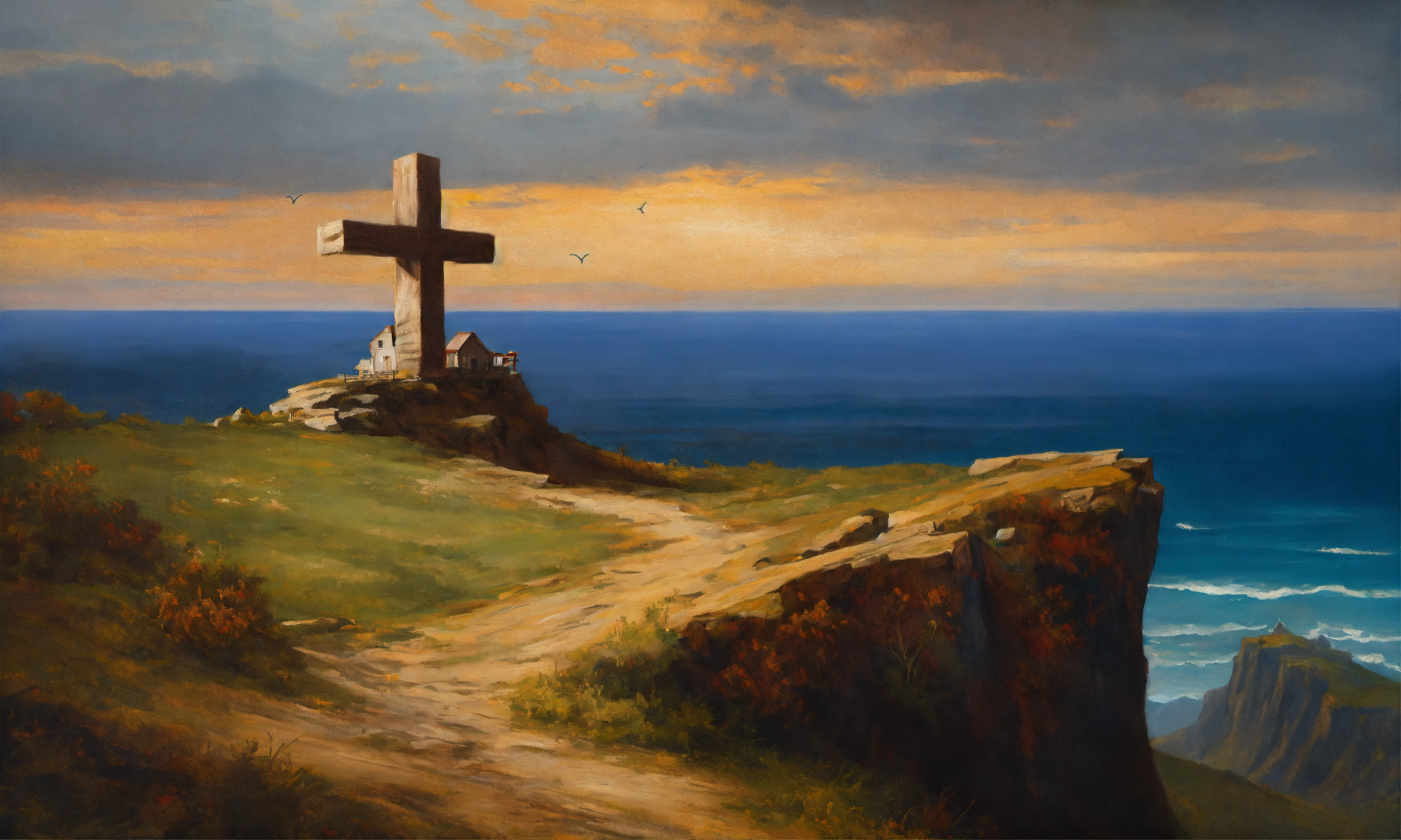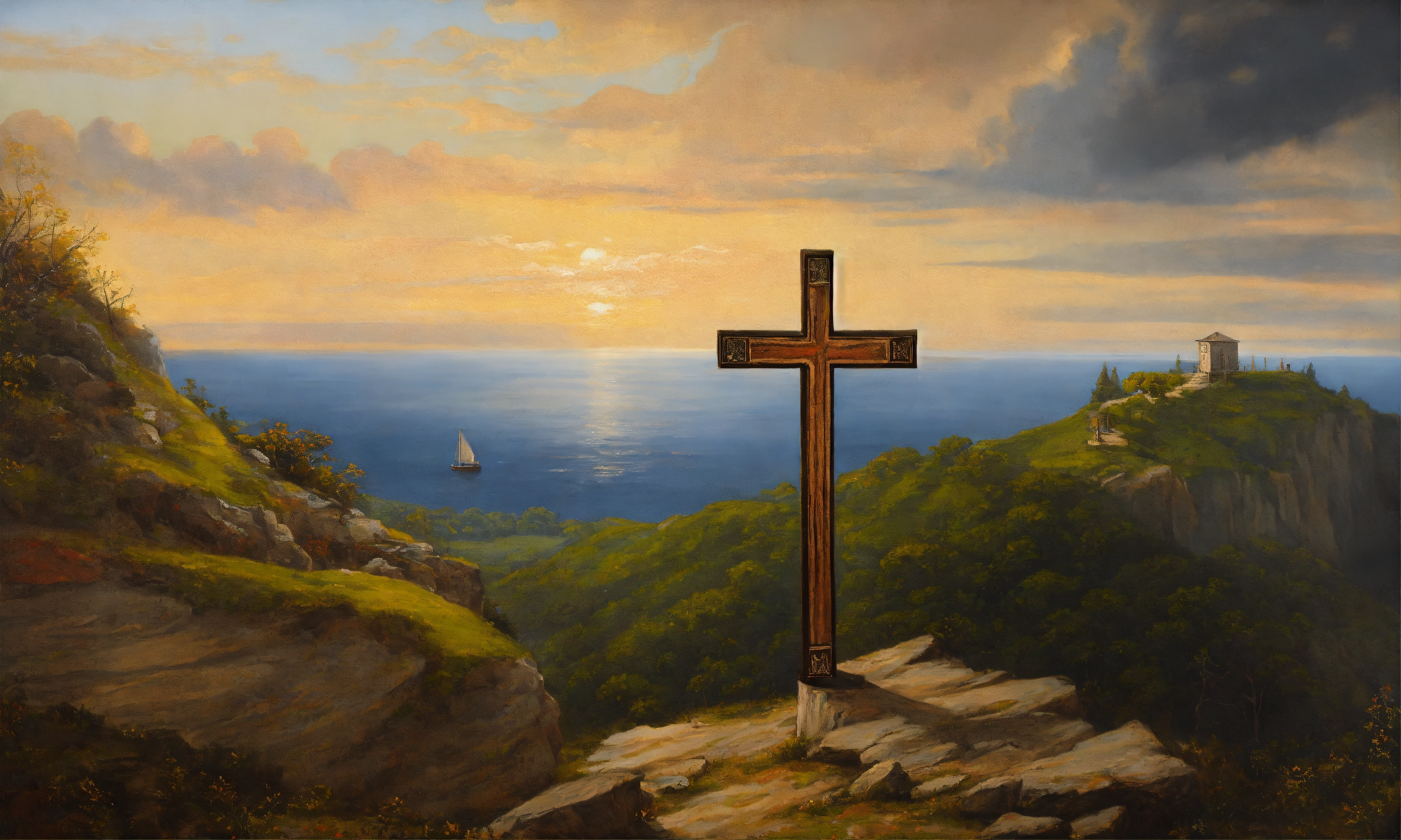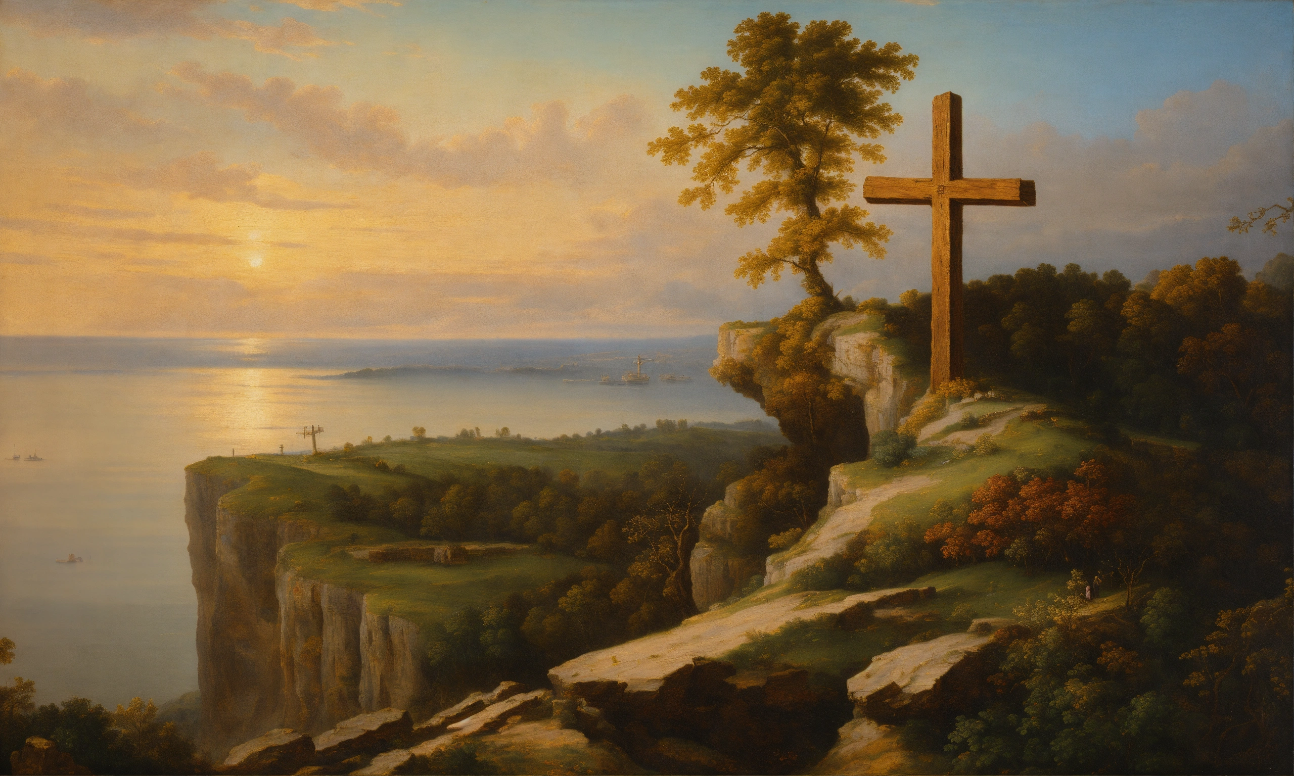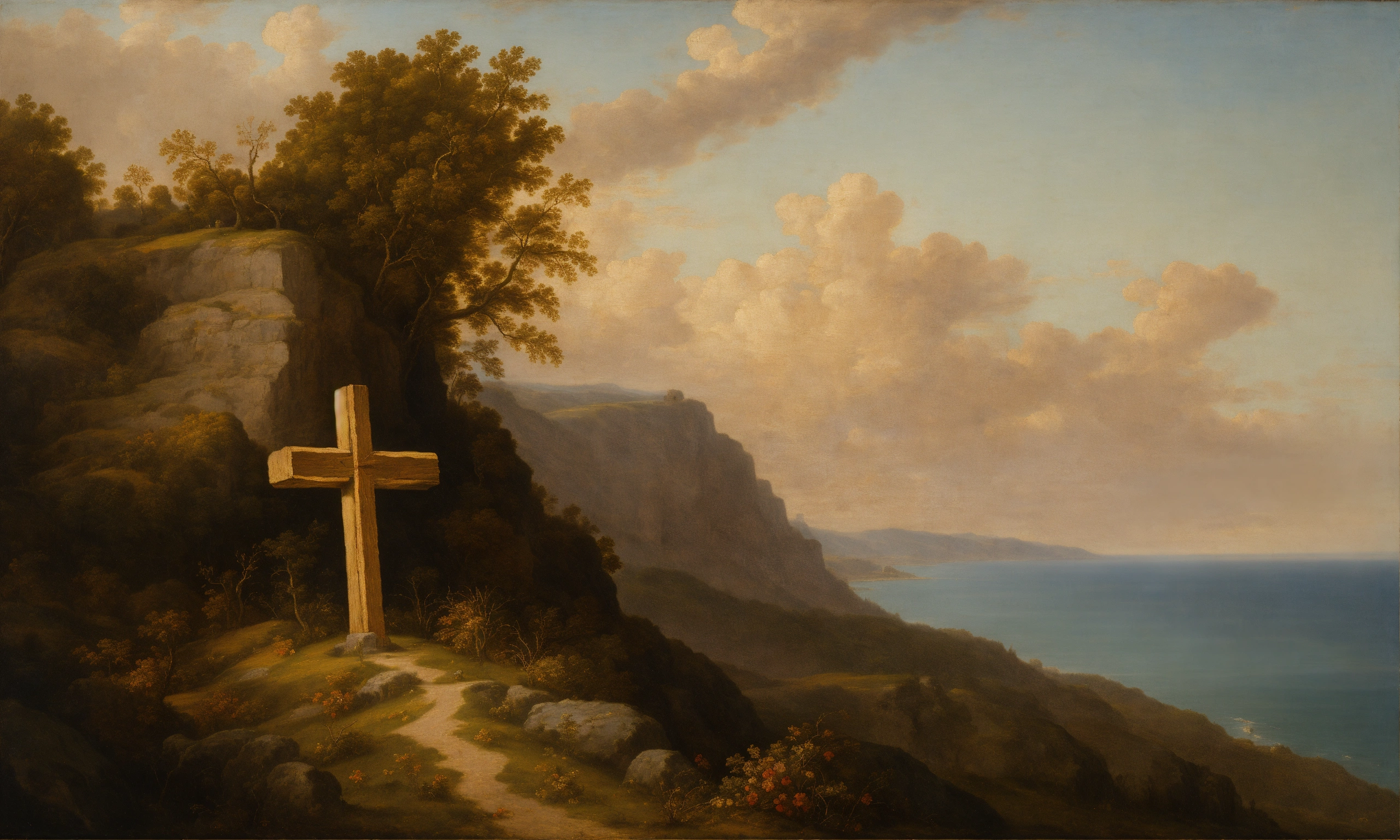 Renaissance oil painting of a wooden cross on a cliff