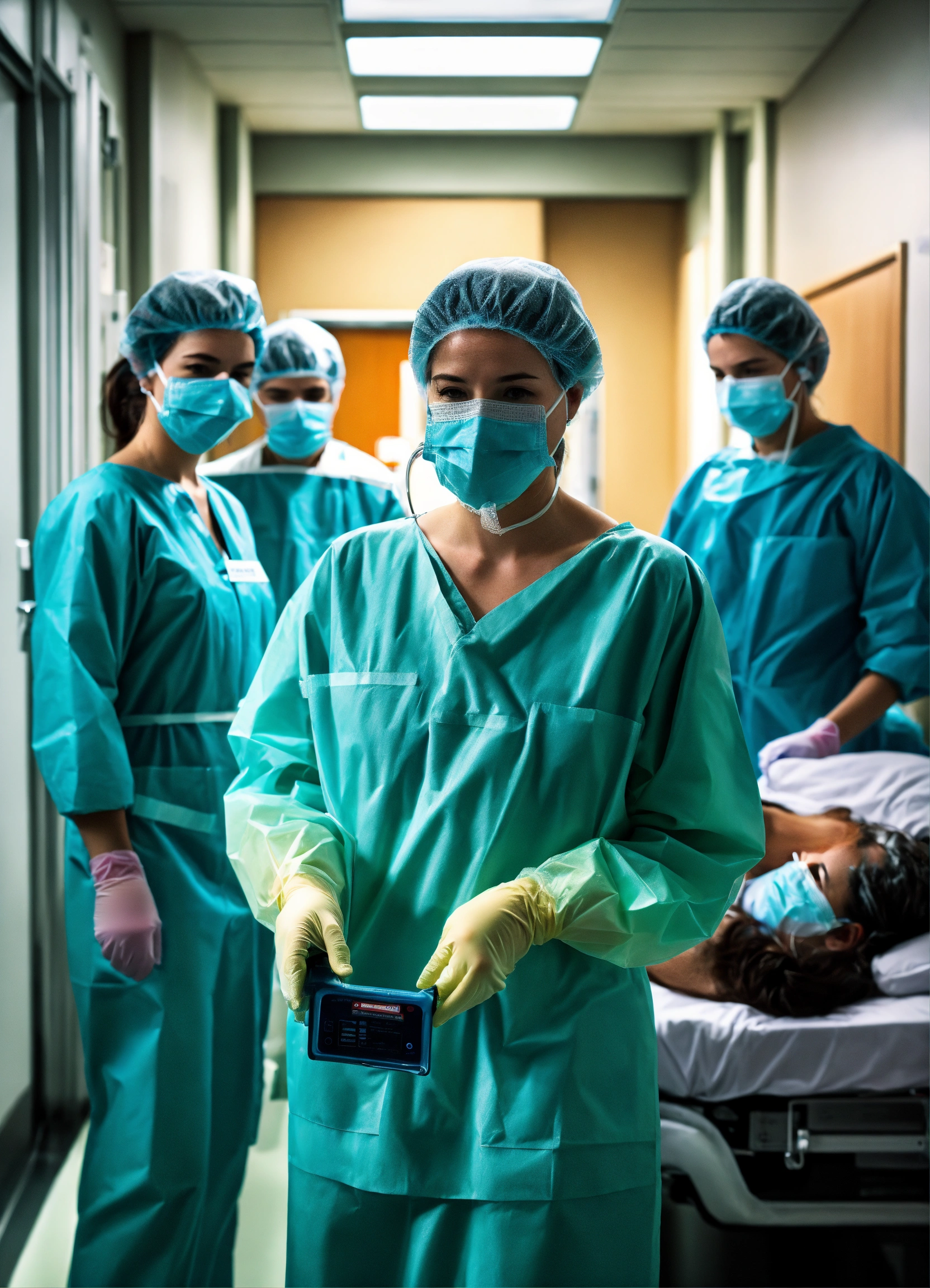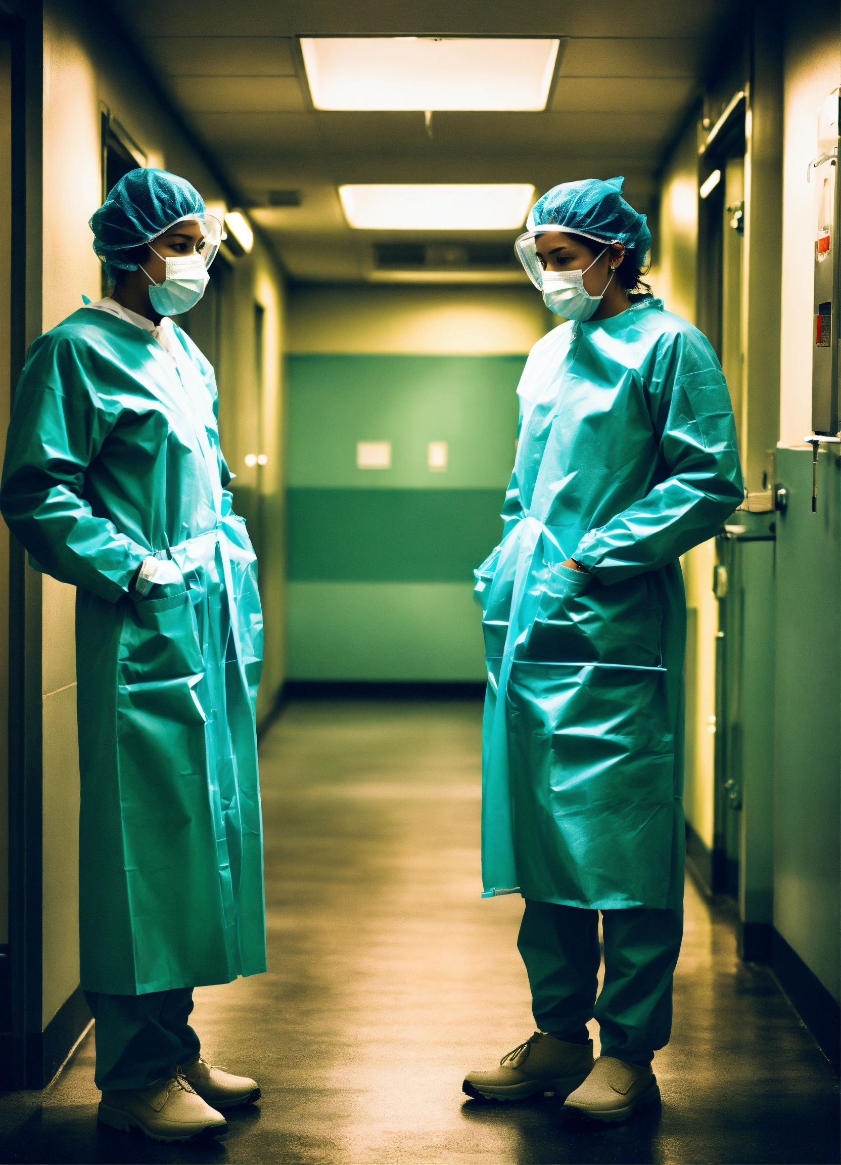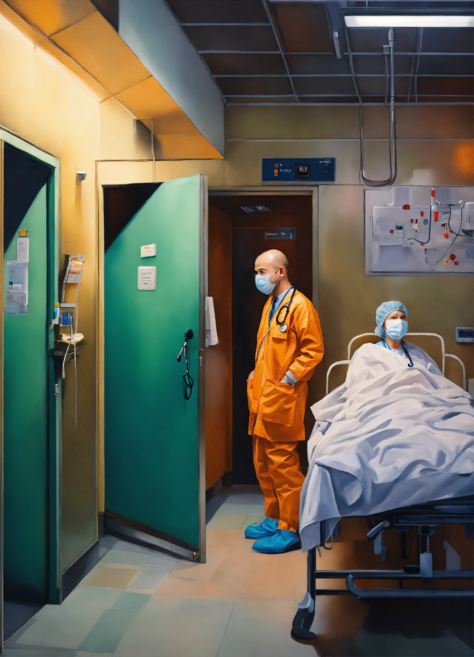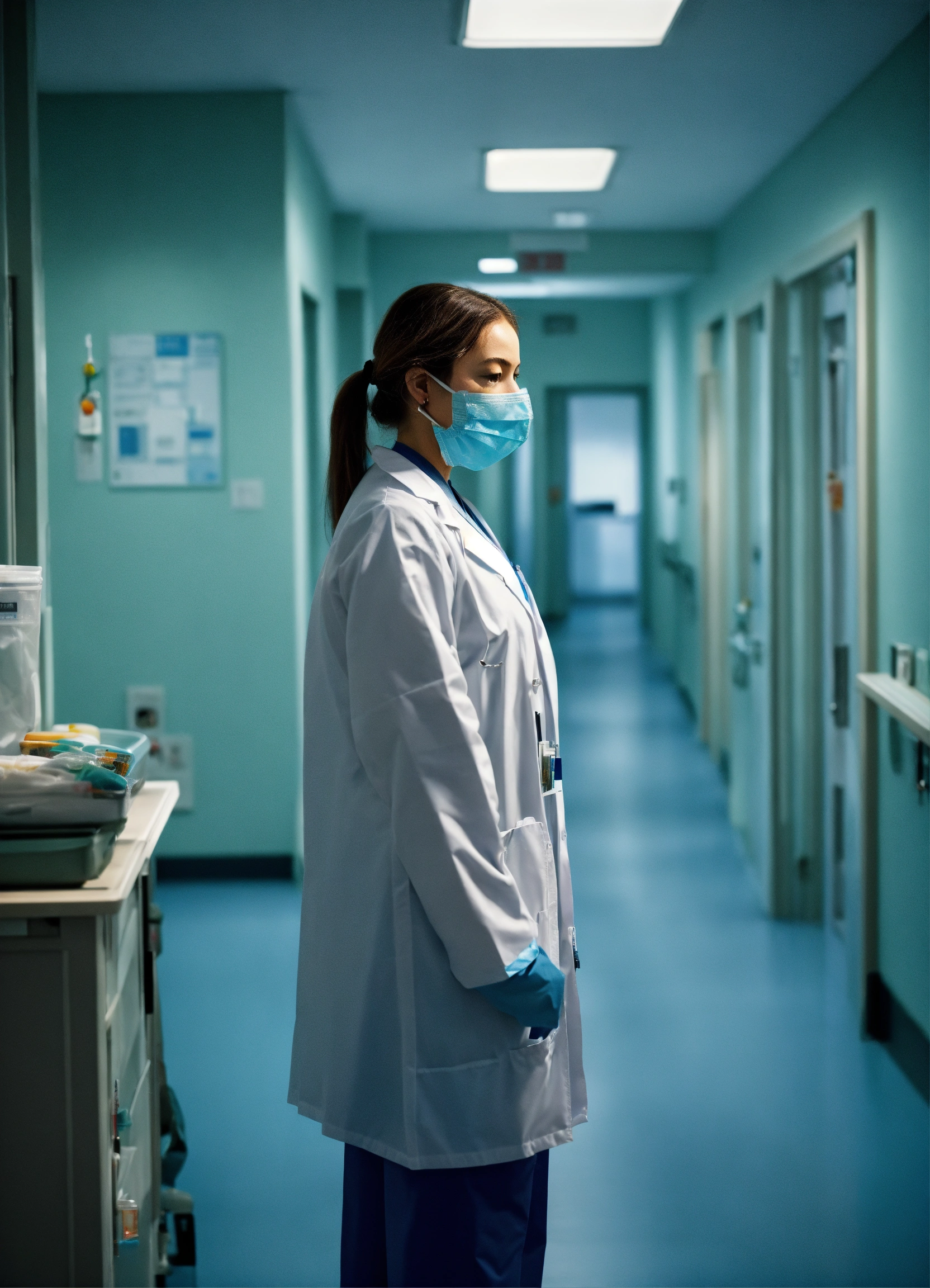 Superrealist style, urban style, many doctors with n95 masks, biohazard, hospital, day, indoors, cold hues