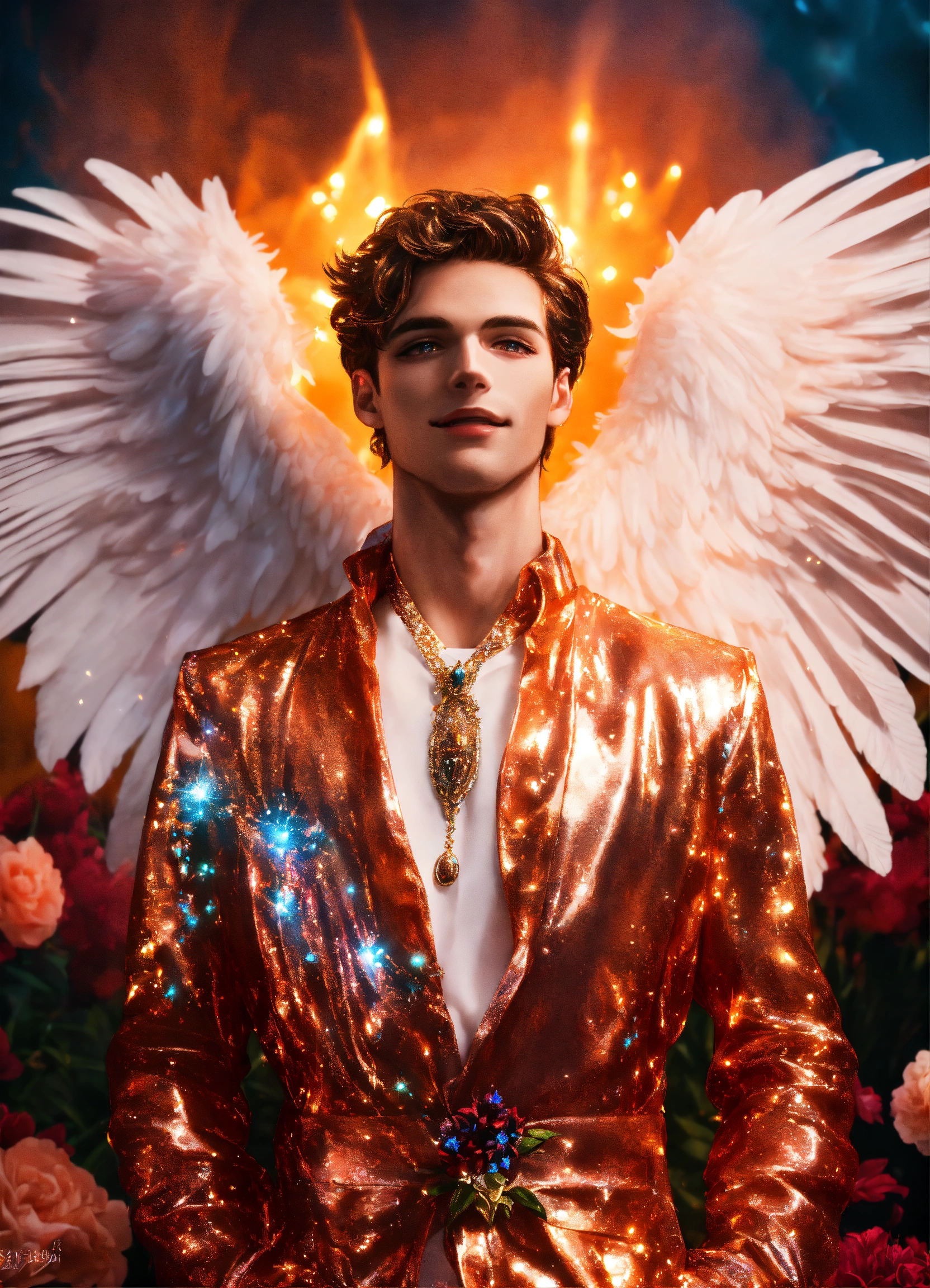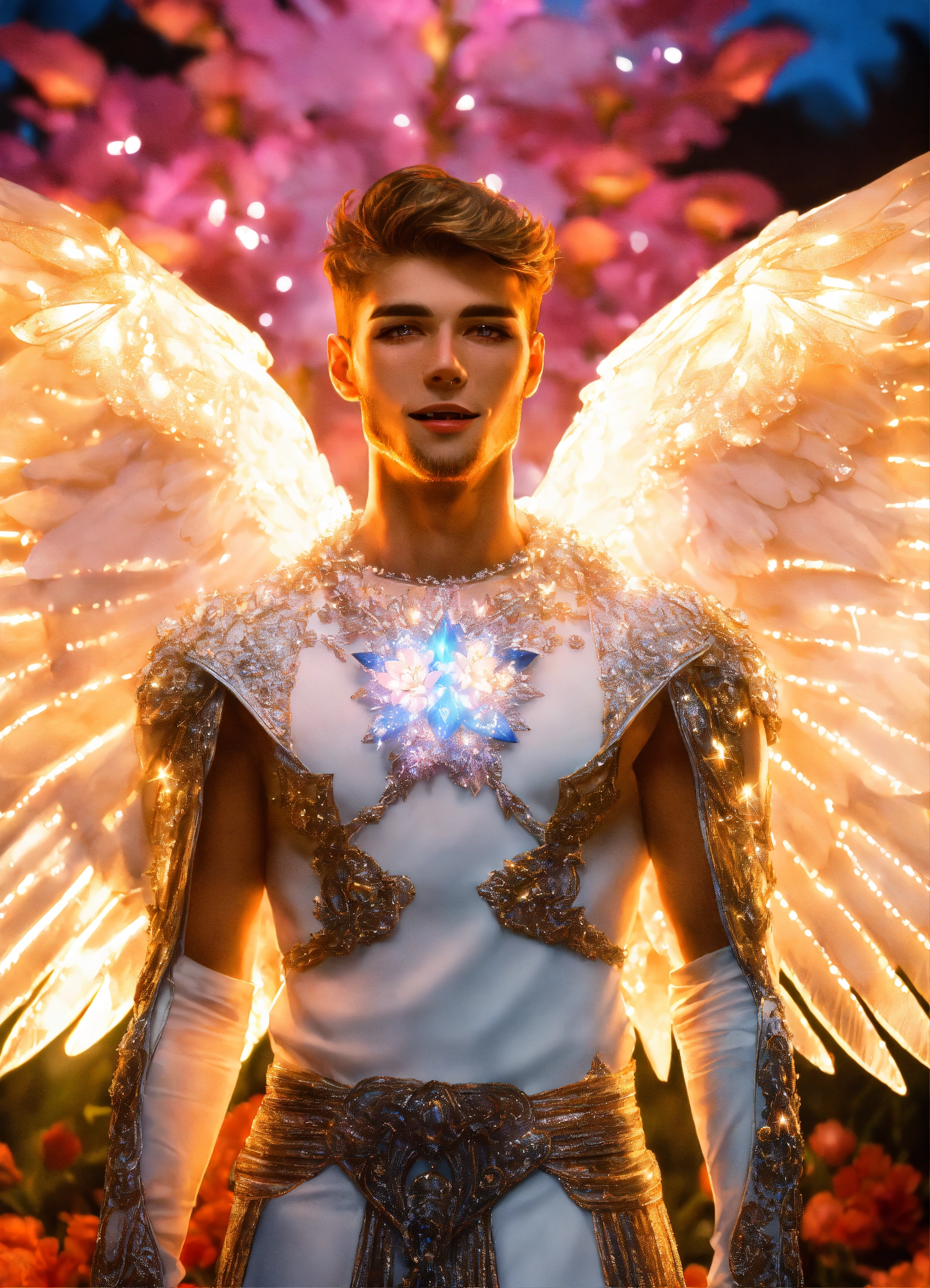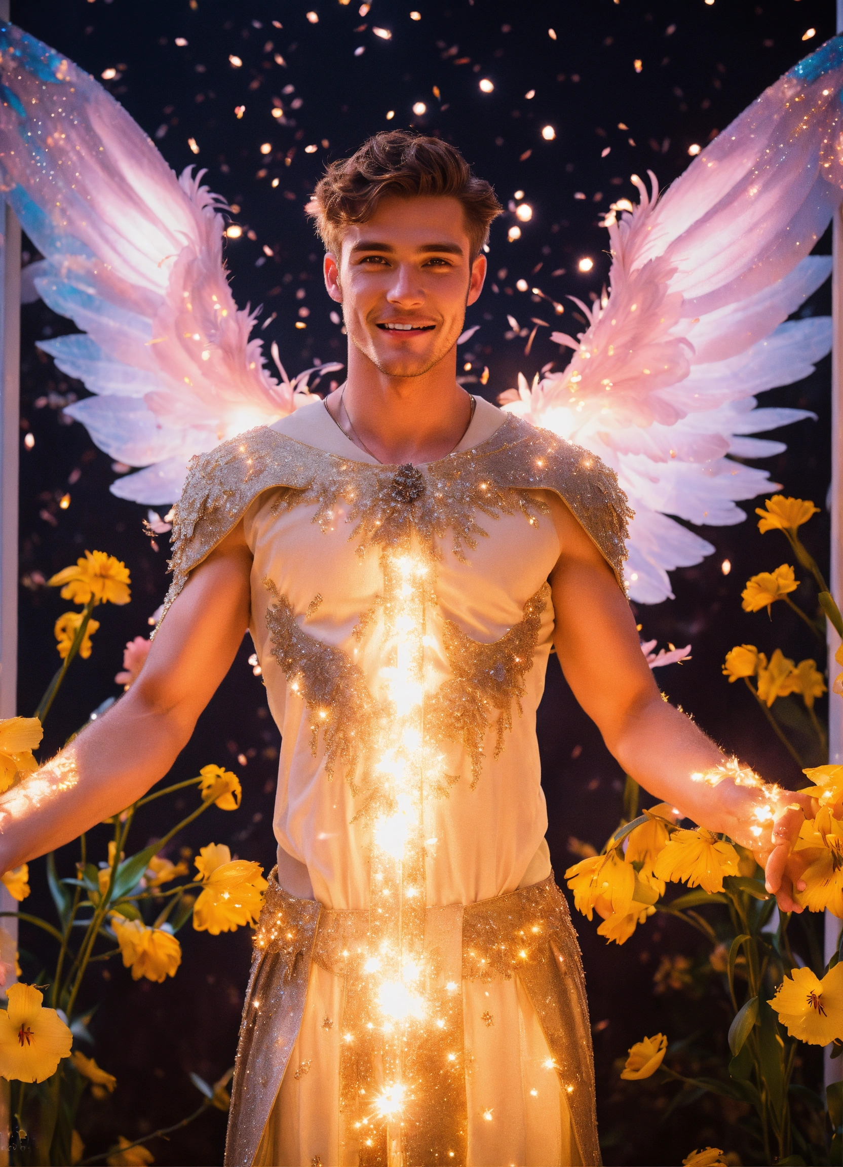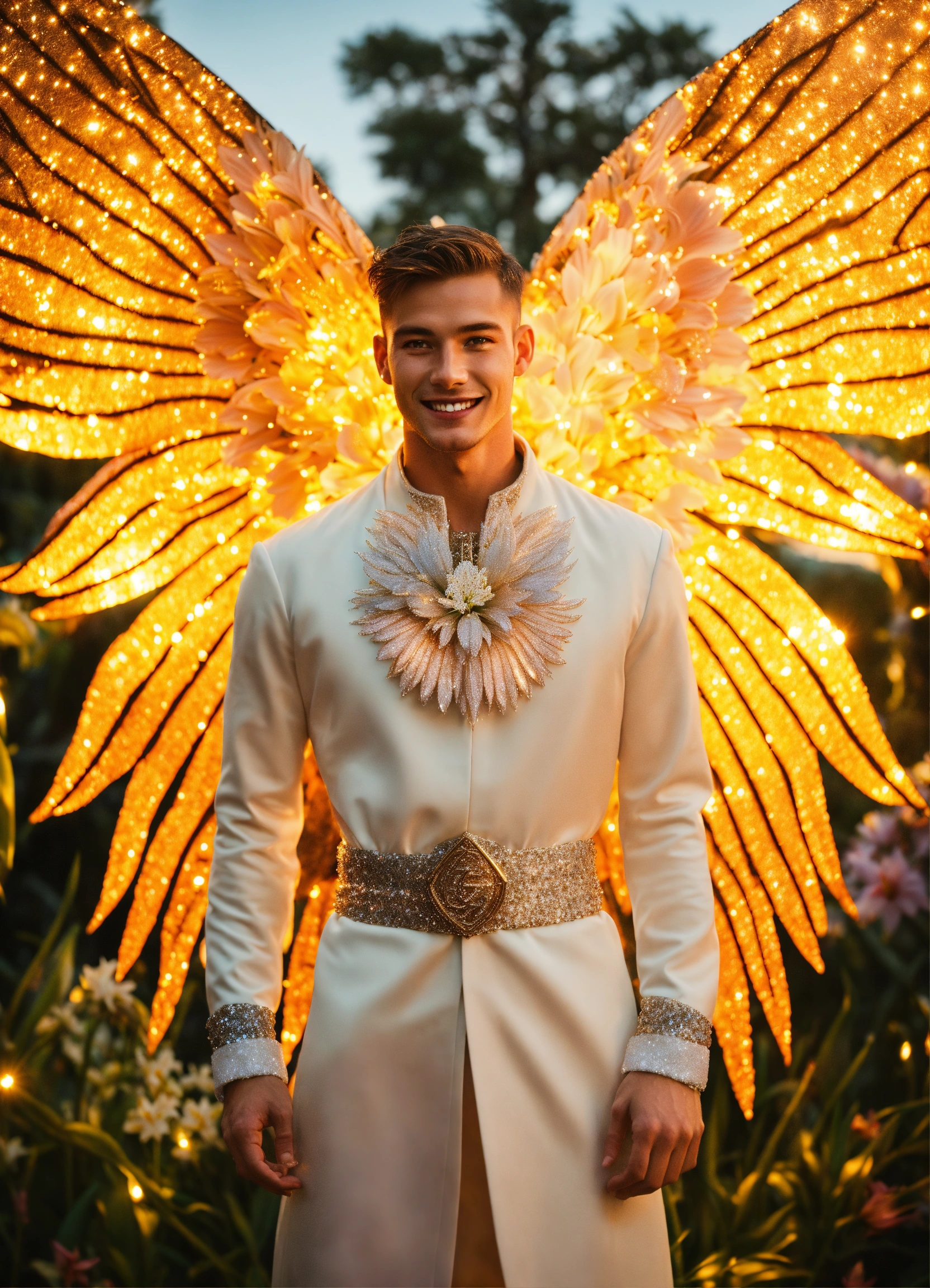 Photograph 8k photo kodak 400 happy modern supernatural surreal photographic portrait of shockingly edgy male archangel with massive wings, edgy modern style with evocative environmental elements, staring directly into camera lens intently with glowing hazel eyes as if speaking with me, holding a glittering glowing lily, background is explosion of sparkling flower petals and diamonds in a morning flower garden, masculine supermodel ruggedly handsome 23-year-old white male, glowing with holy spirit magic sparkles, beaming with joyful smile with perfect white teeth that lights up his face, messenger, annunciation, short brown hair, wearing sparkling futuristic fantastical edgy and regal themed glittering peach robes designed by gucci.