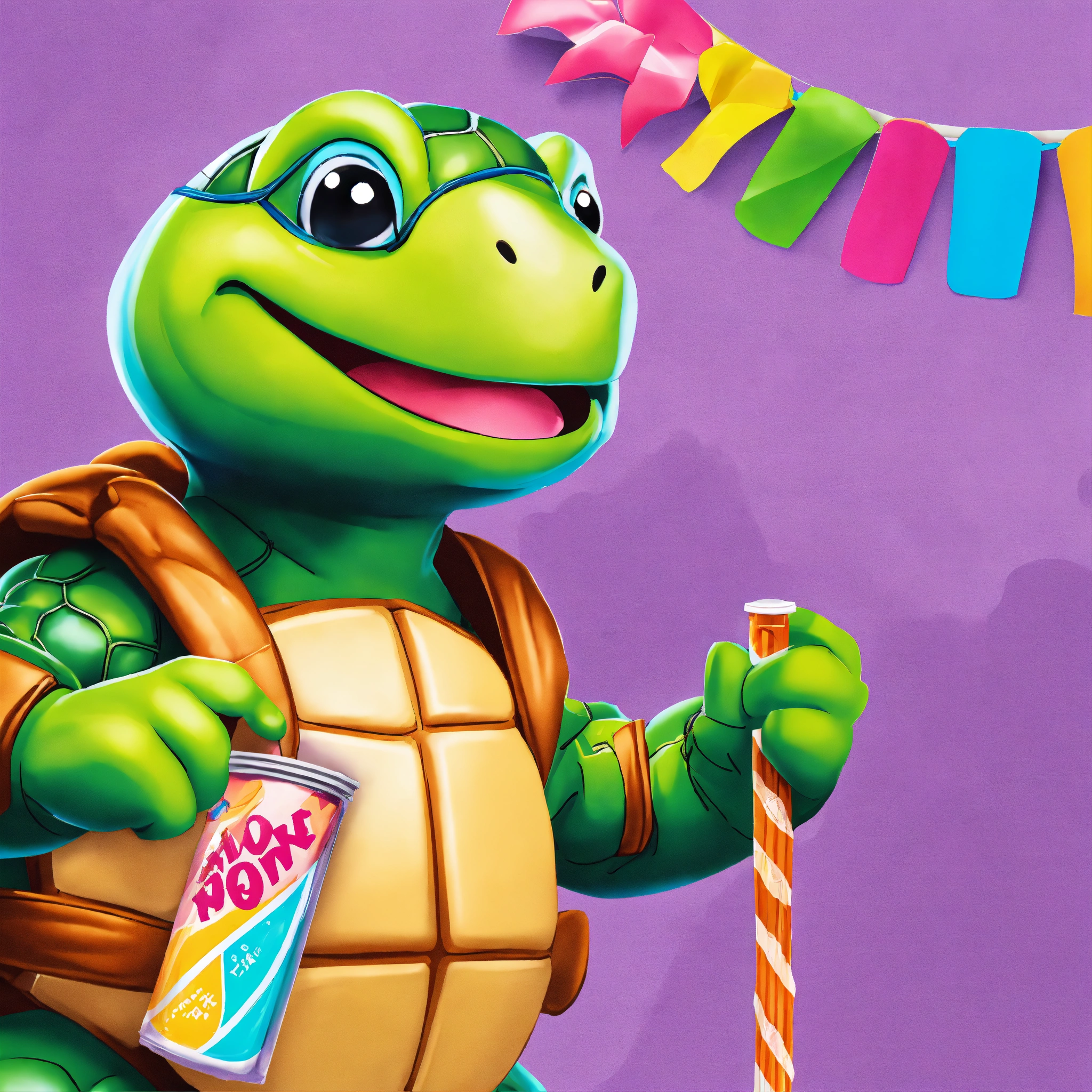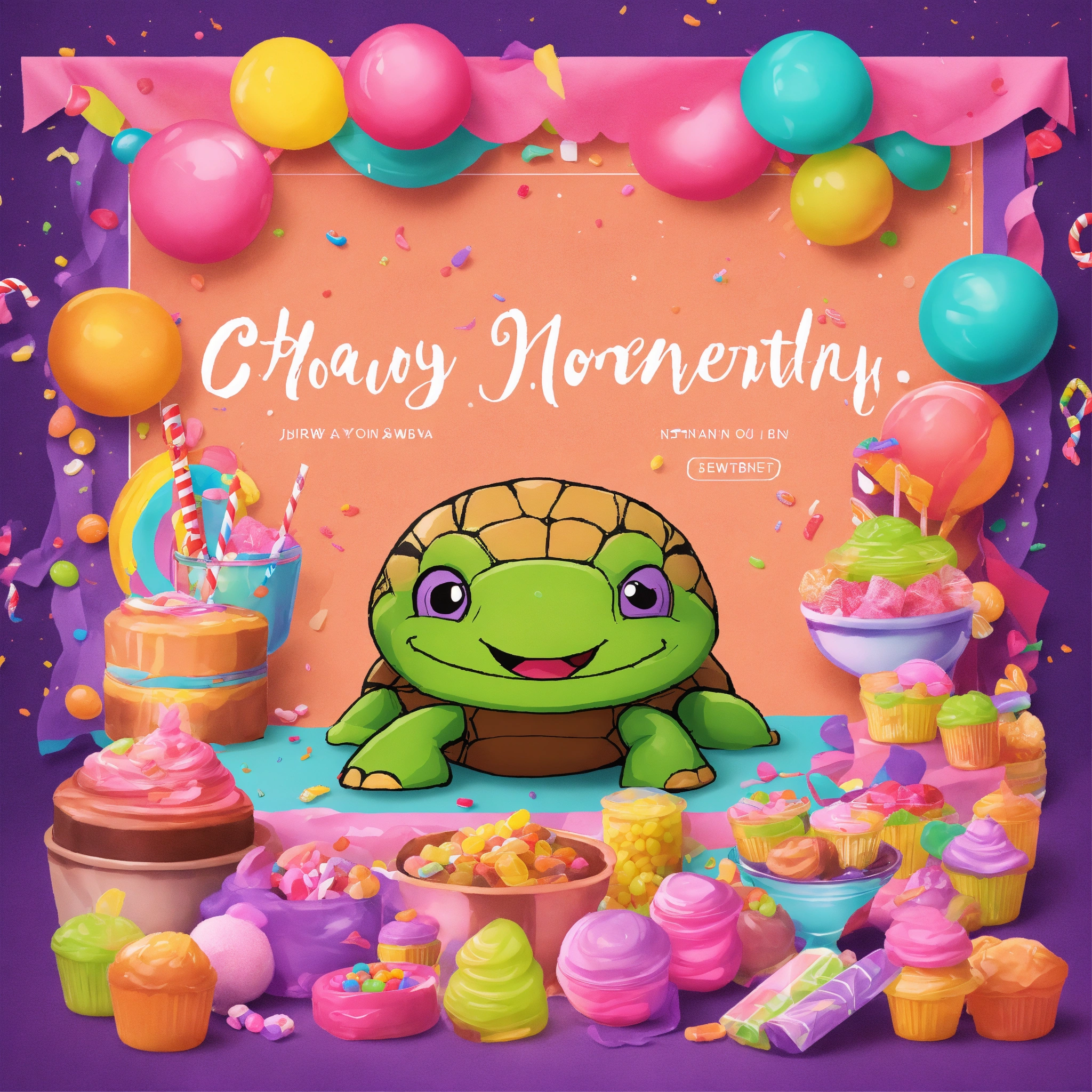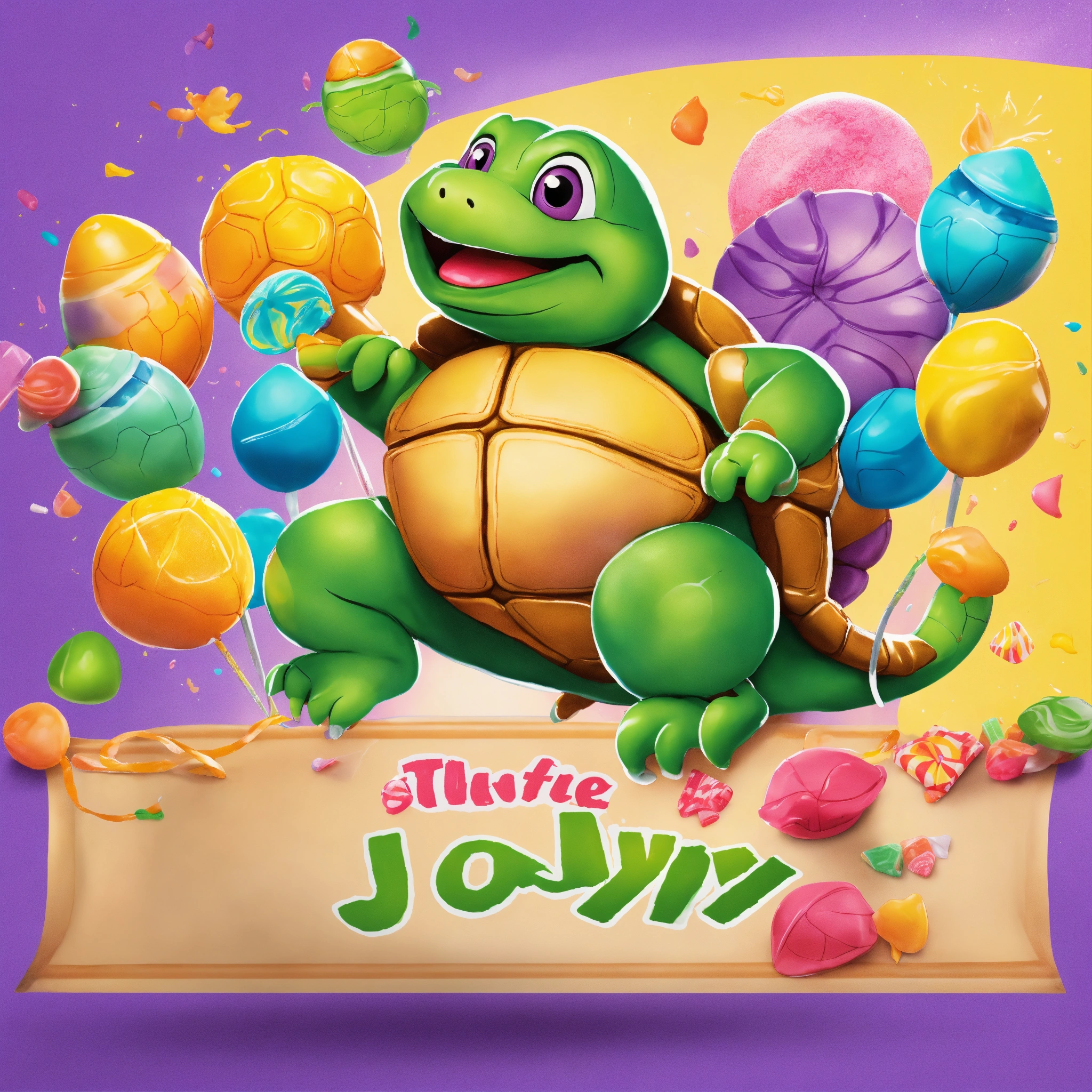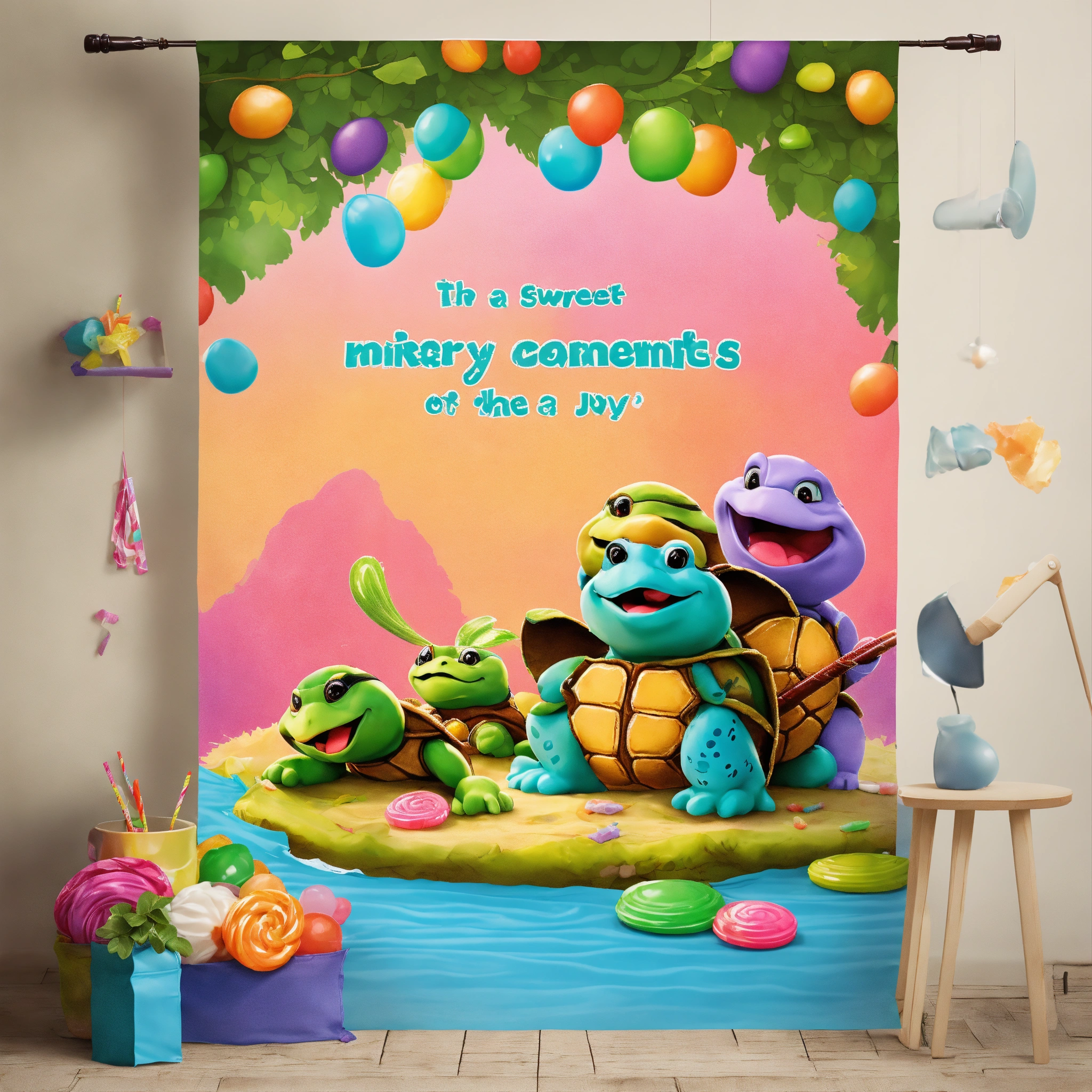 Create a vibrant banner with bright and pastel colors featuring large, on the banner, draw kids playing with ninja turtle figures and eating candy, write sweet moments of joy on the banner
