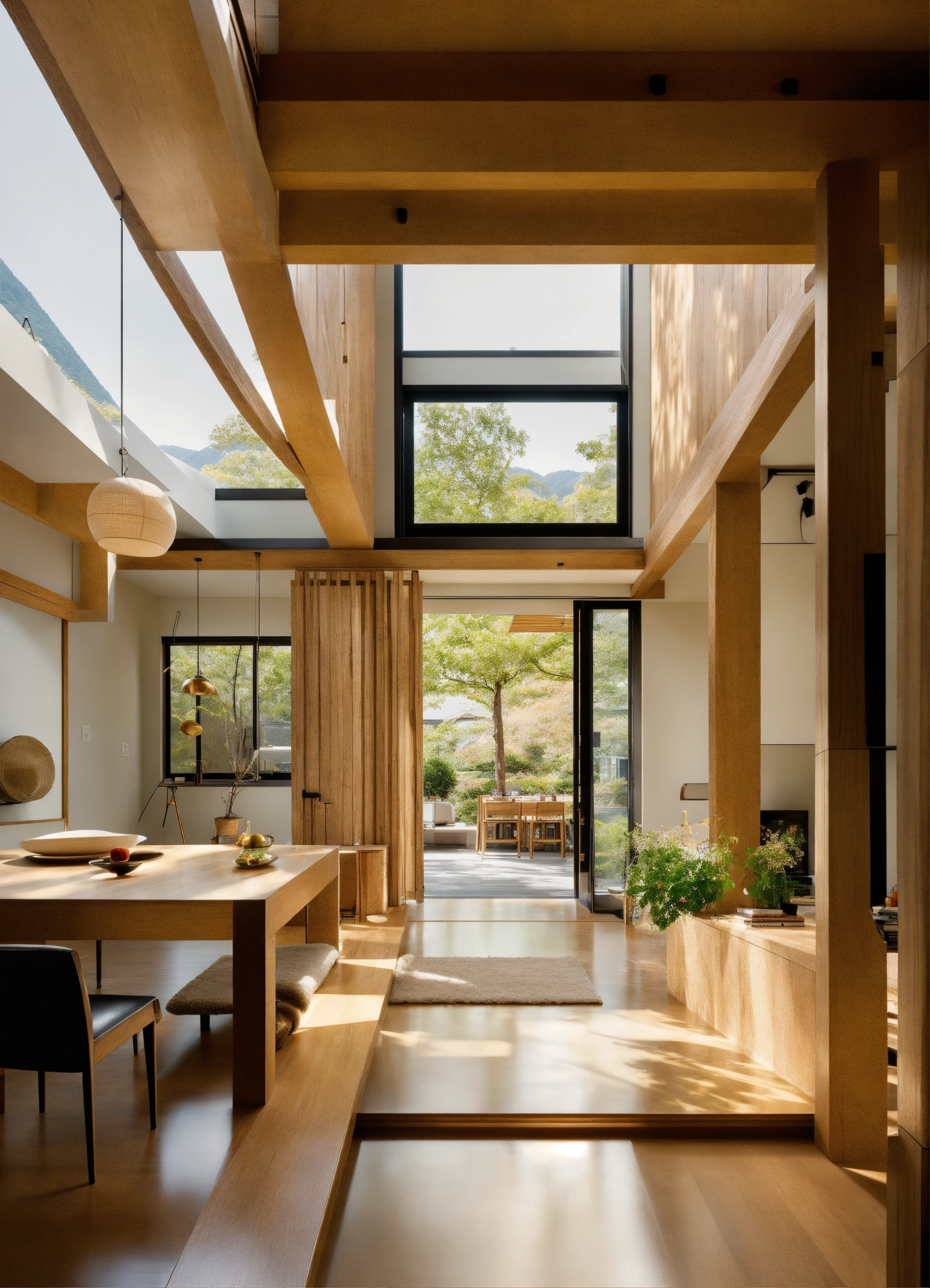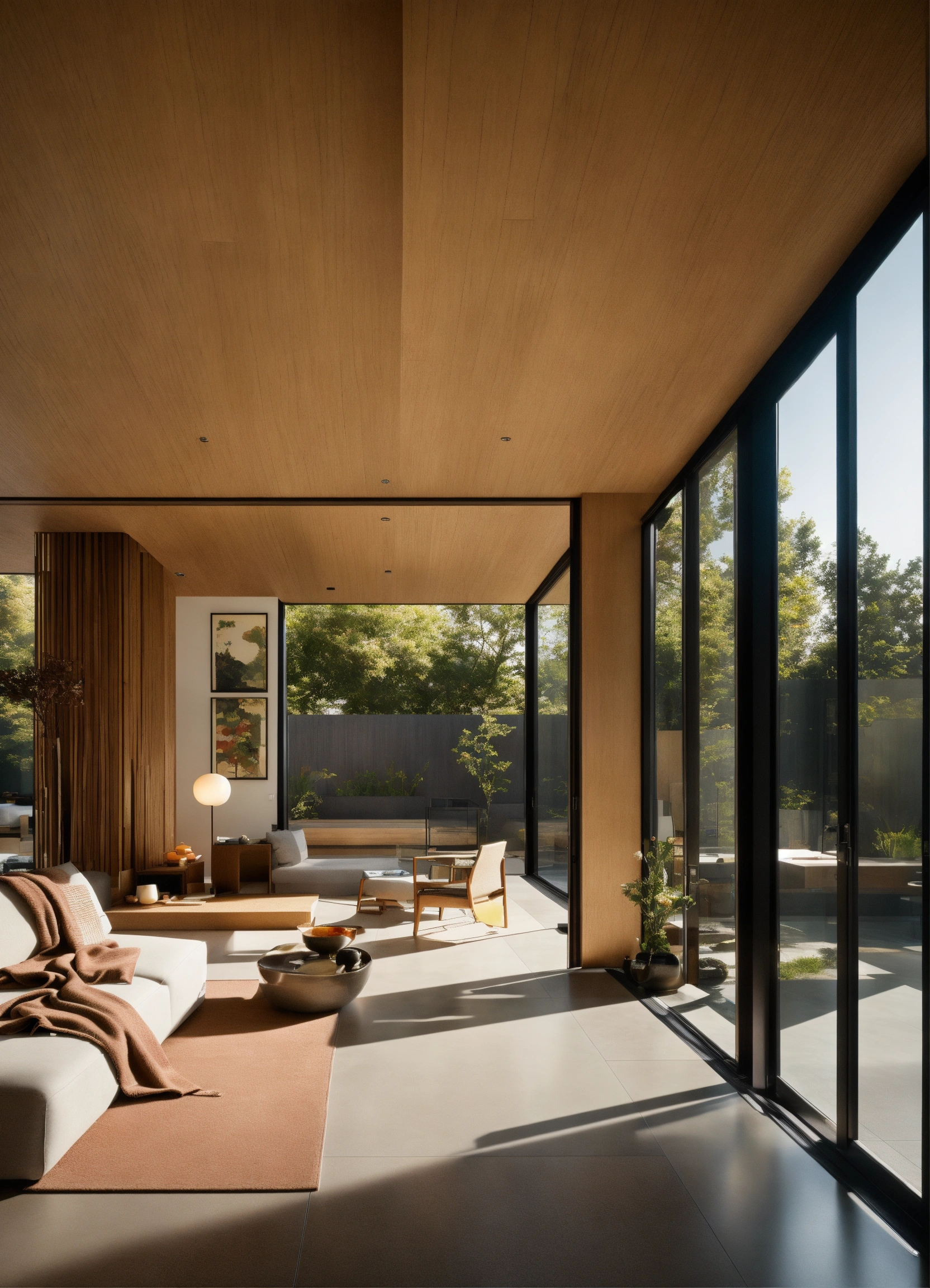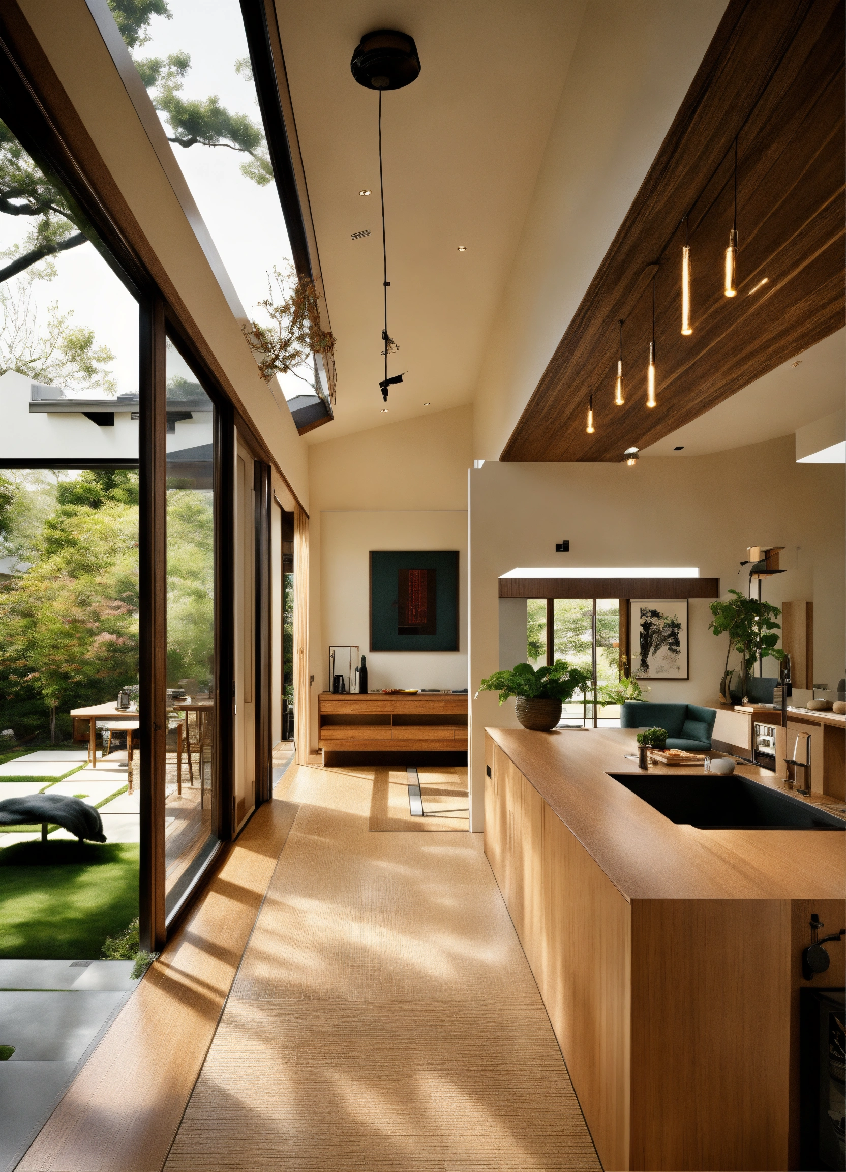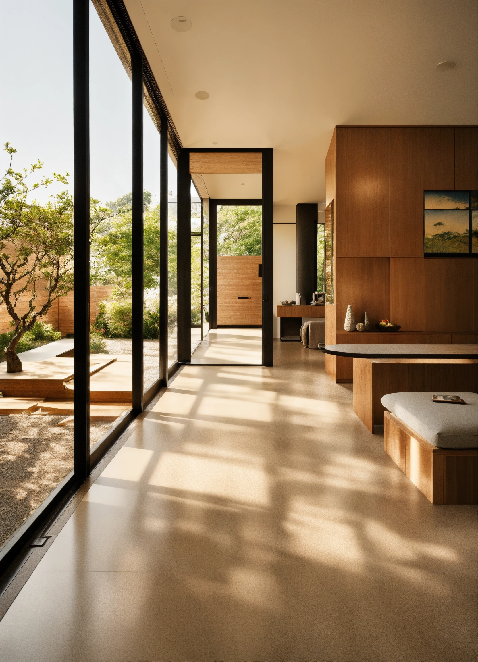 Japanese american modern minimalist style house combine into one level medium size house interior design, ceramic floor, photorealistic