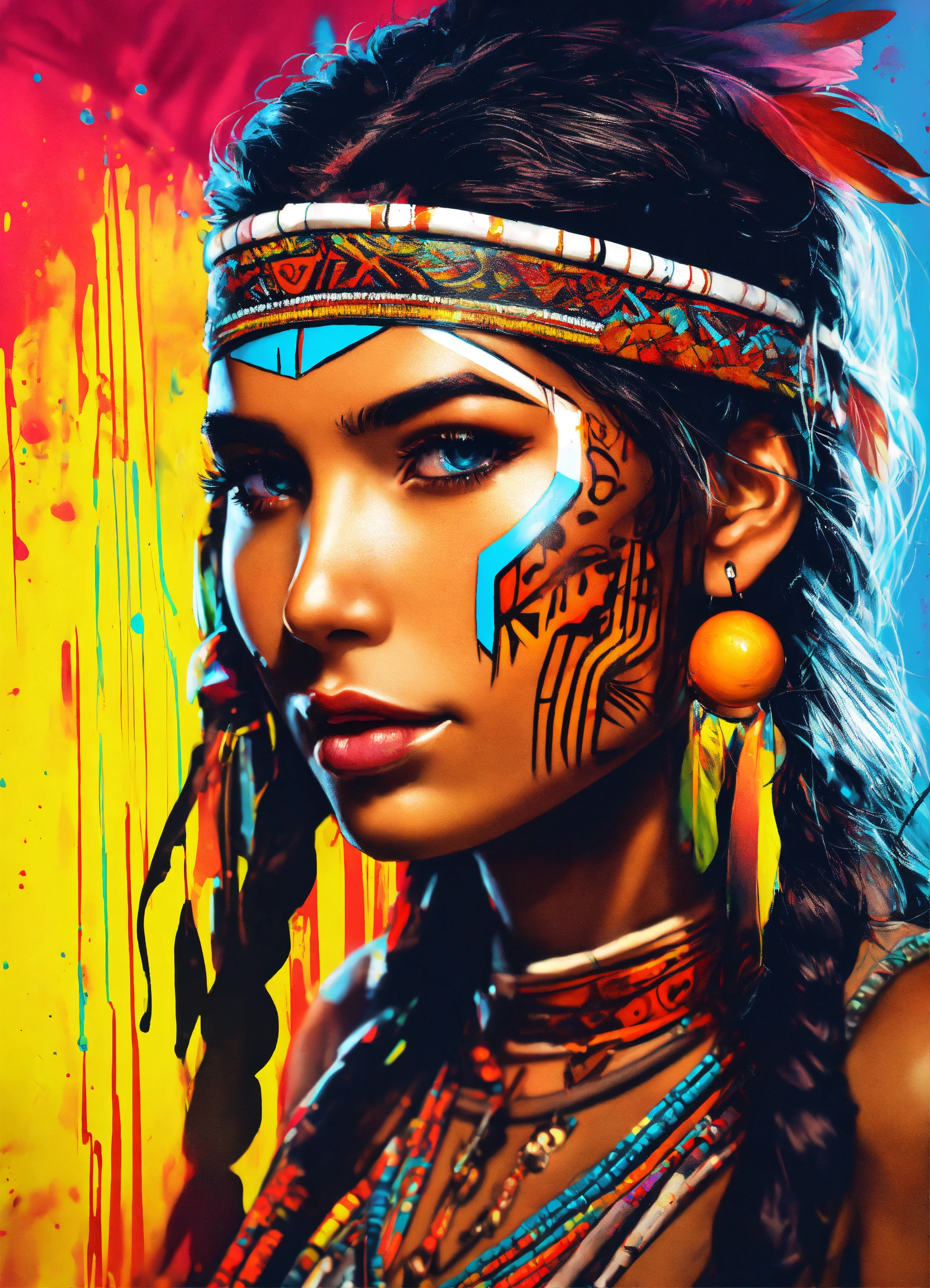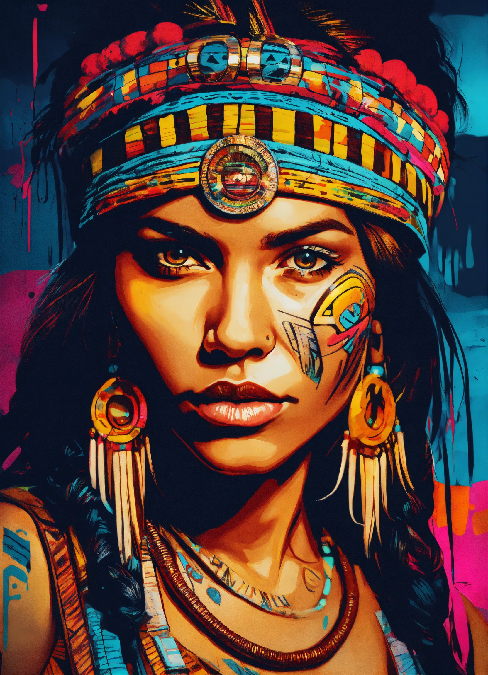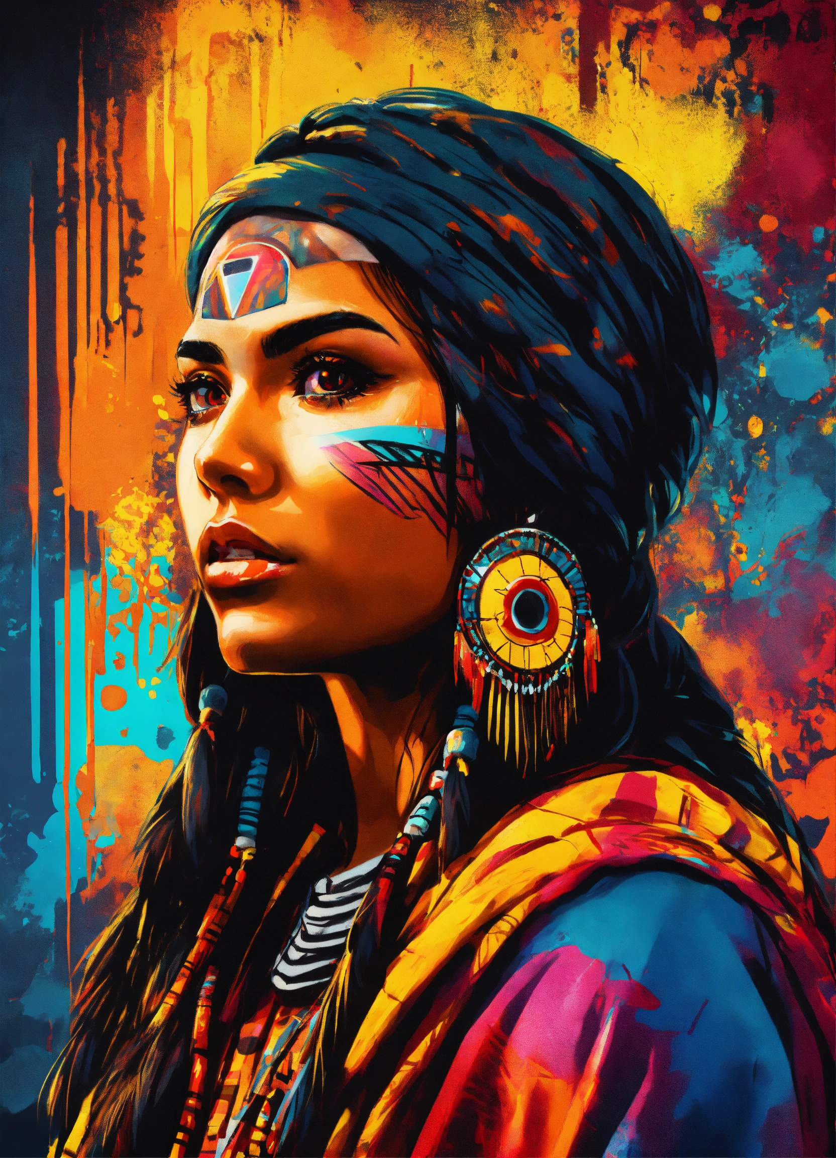 Beautiful indigenous woman pop art style 8k graffiti with spray paint and glowing eyes