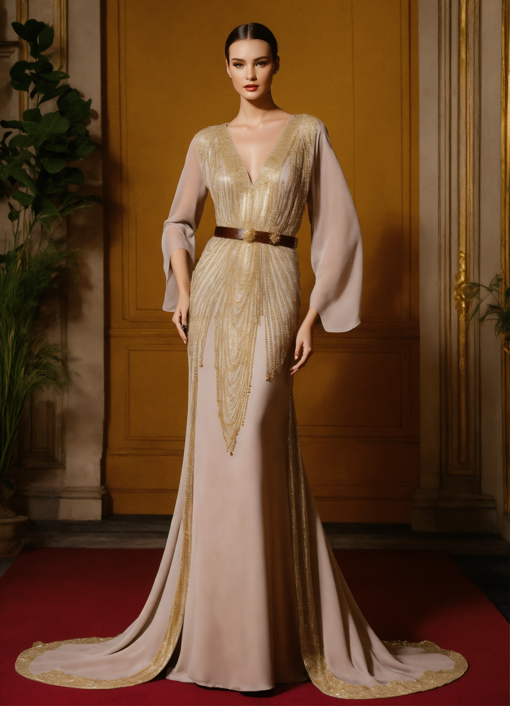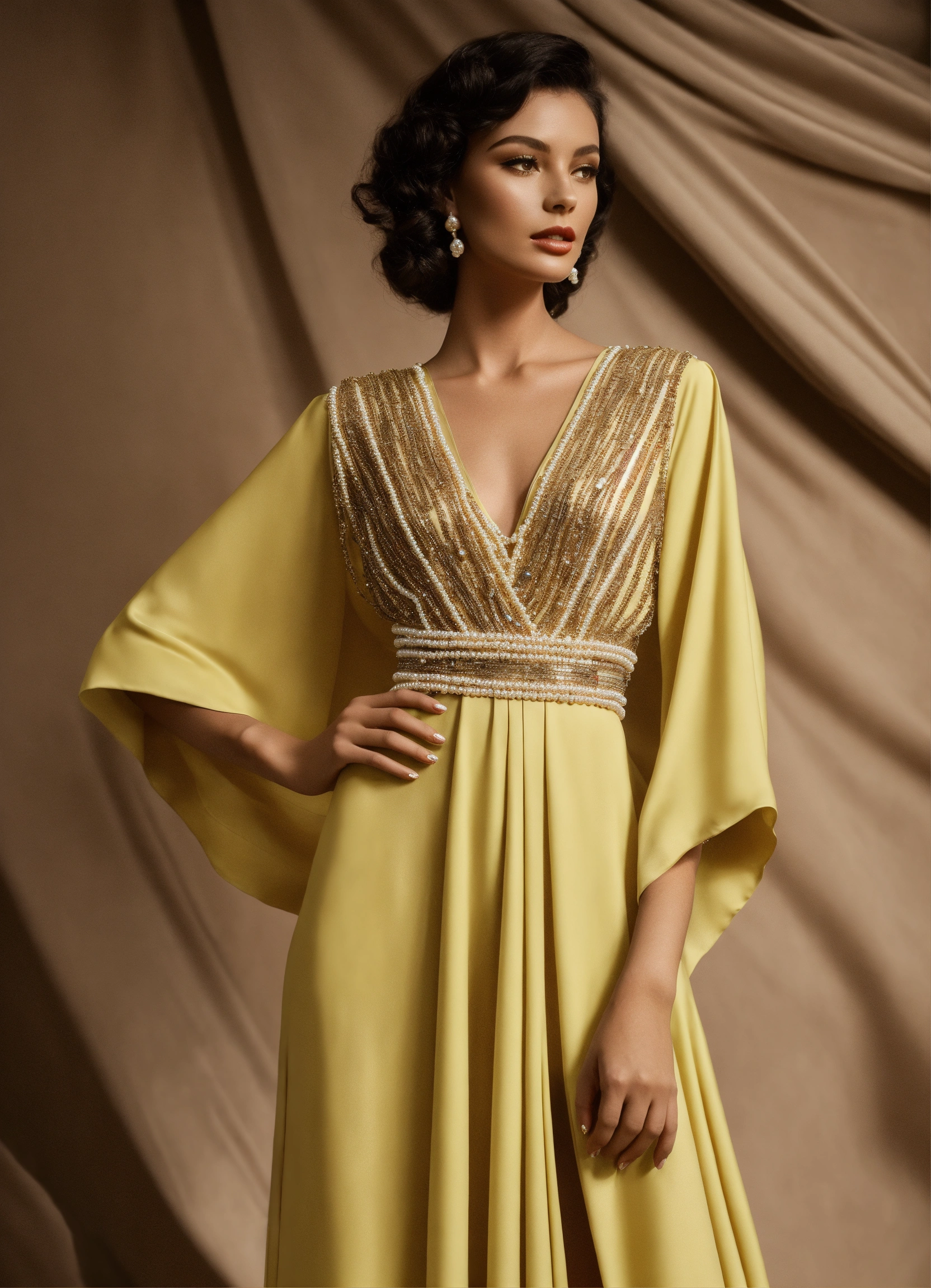 A model representing a new brand in the highest class of 1930s fashion modern design. the kaftan should be long, adorned with glittering pearls of the same colour, the details will be black, we have seen the perfect combination of the model. the dress from the top of the waist should also be dominated by handwork with two-tone white beads and decorated with fine gold beads, the lower part of the dress should be a deep pleat on the right side of the silhouette, with belt, perfect lines of the mannequin to give a perfect representation of the dress on the catwalks of paris for the autumn - winter season.