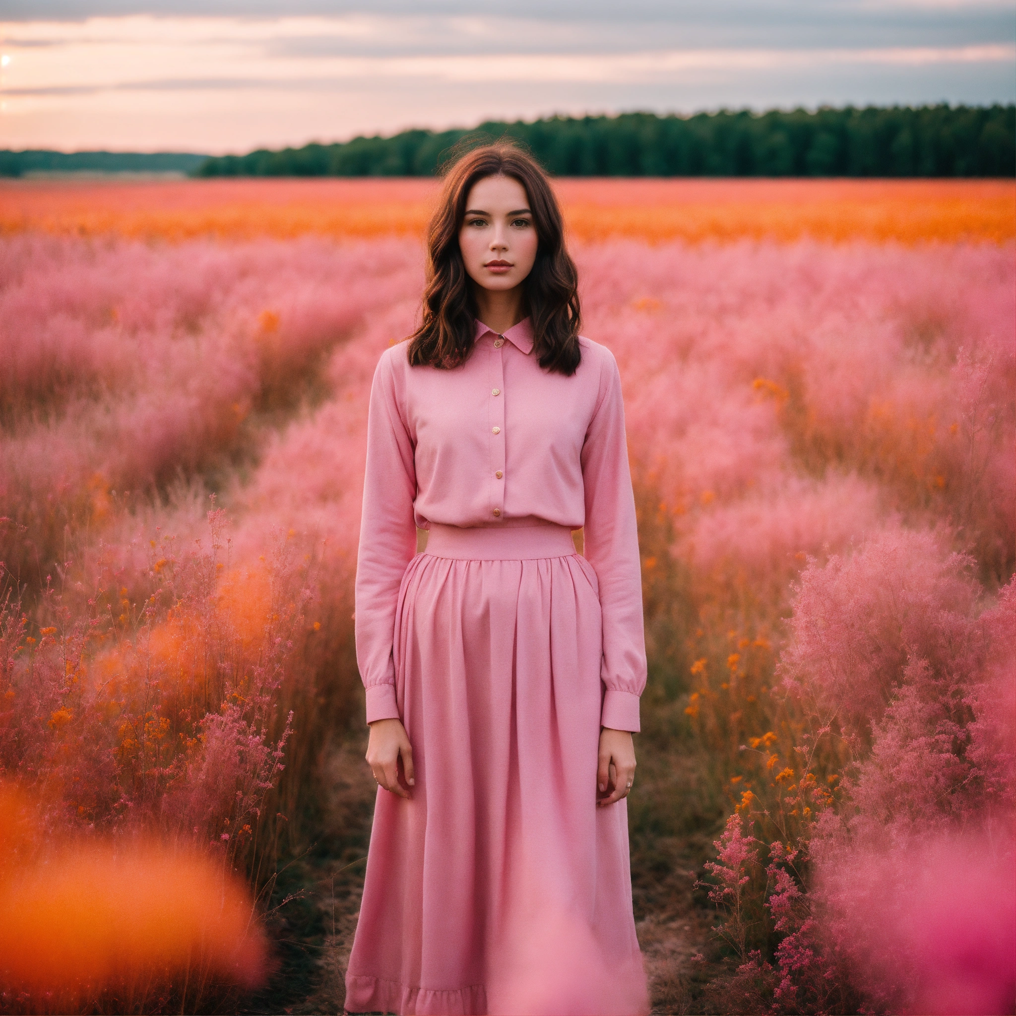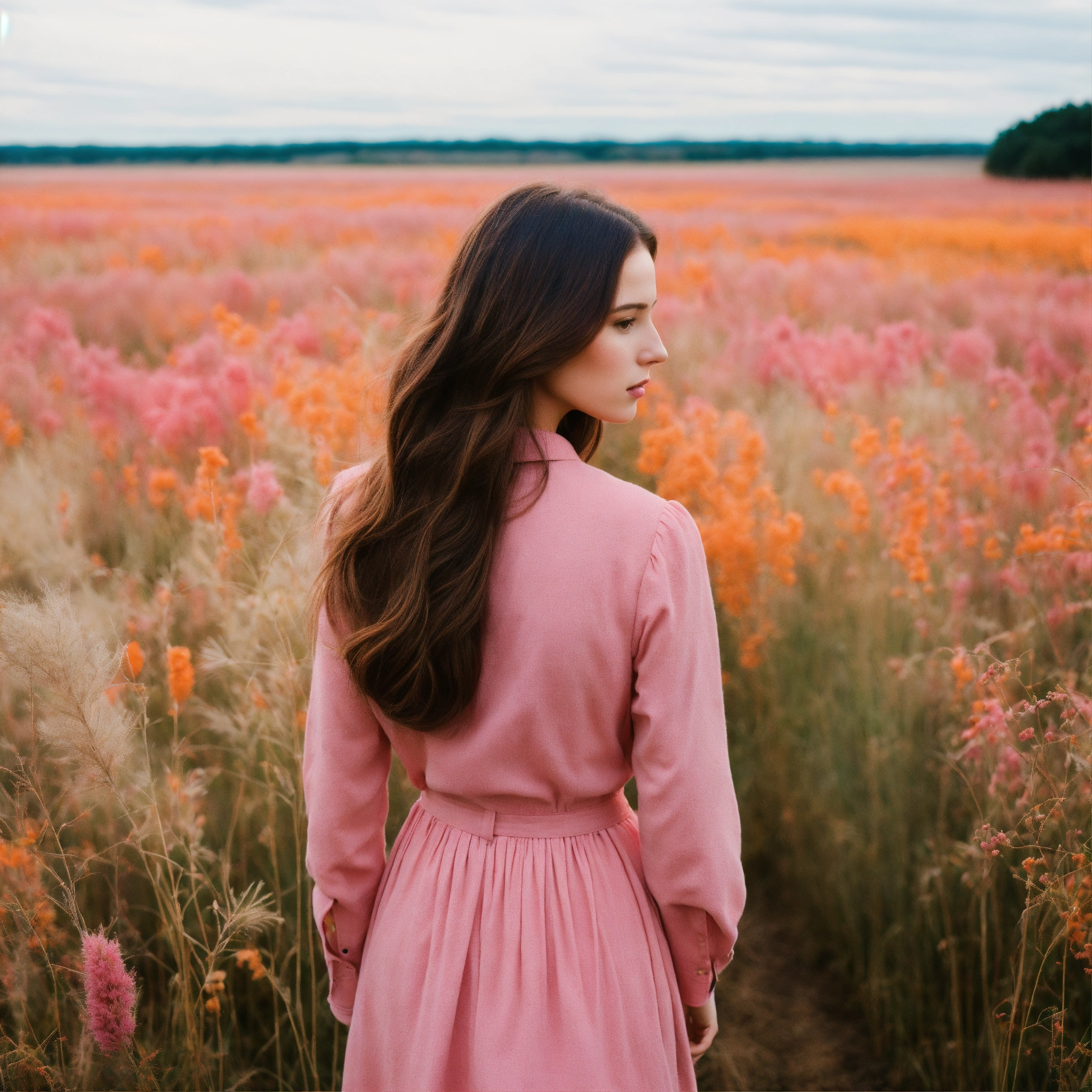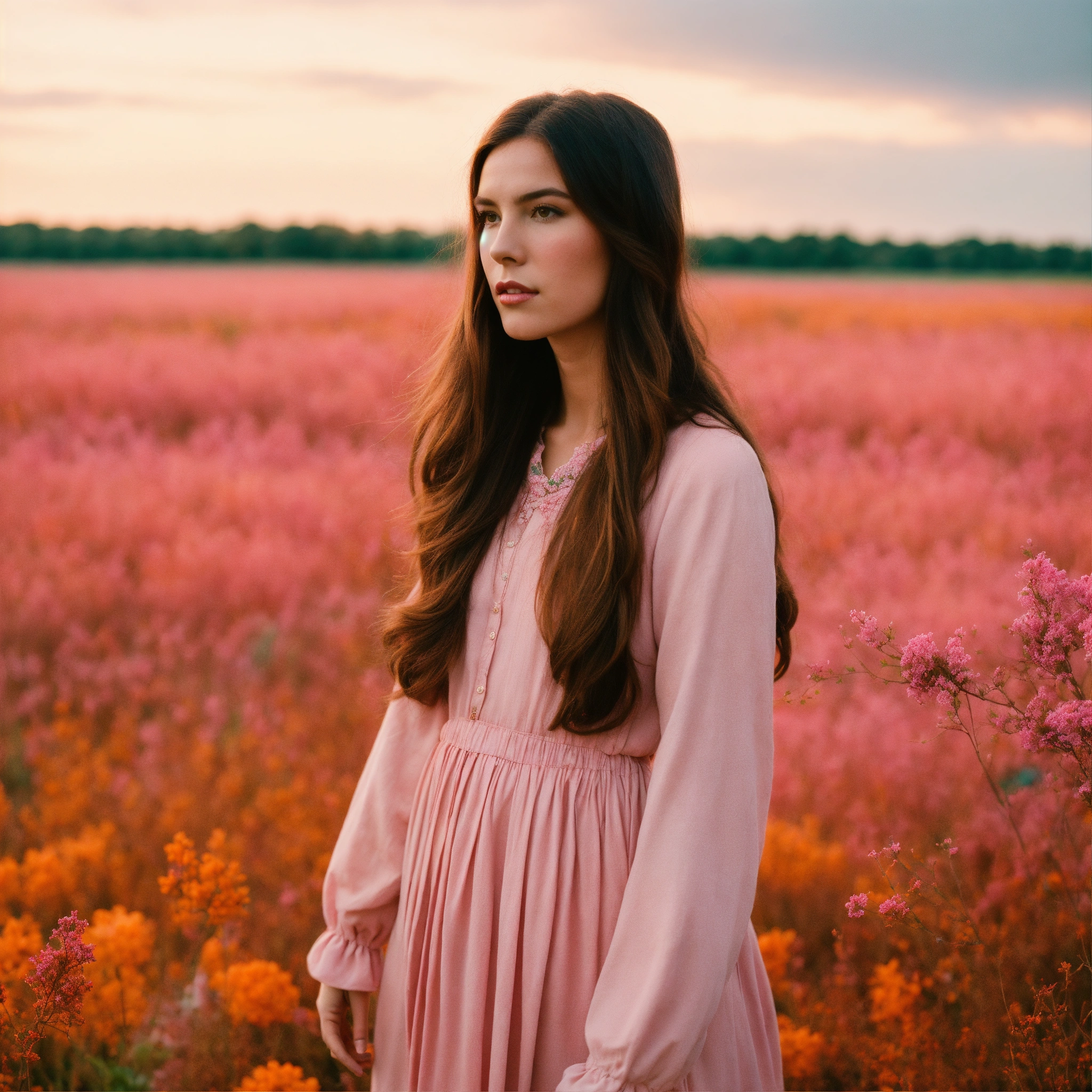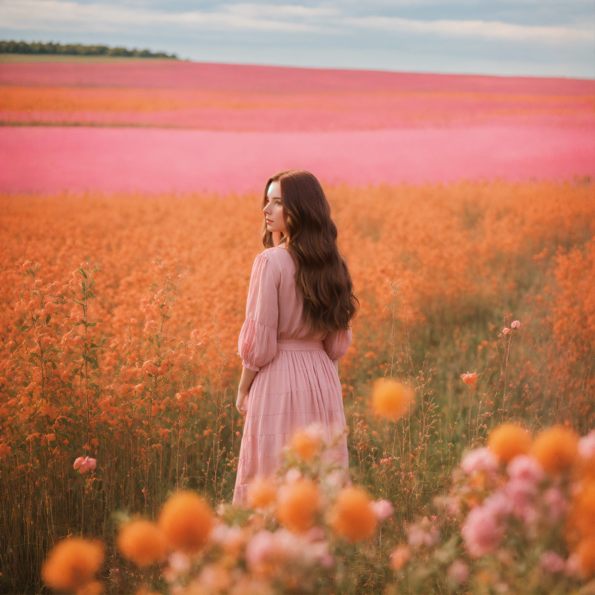 A photograph of woman with long brown hair standing in a vast field, wes anderson colour palette of pinks and oranges mixed with organic colours of nature