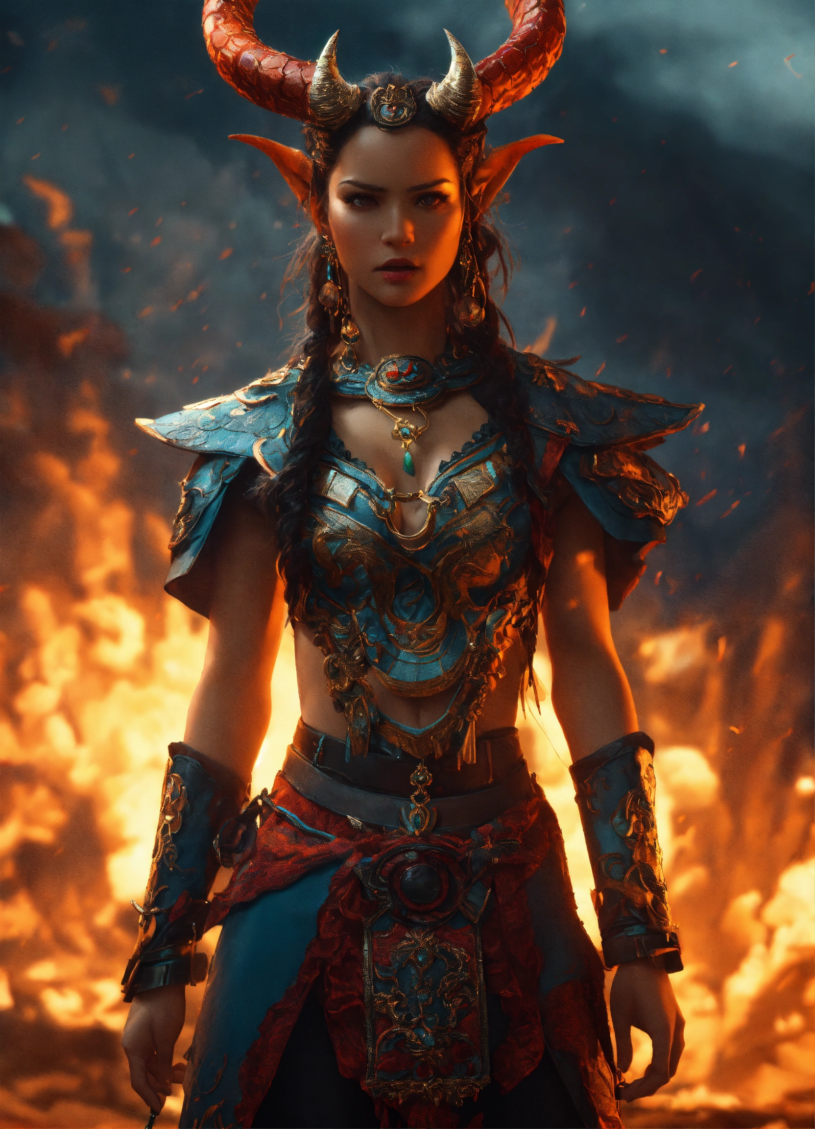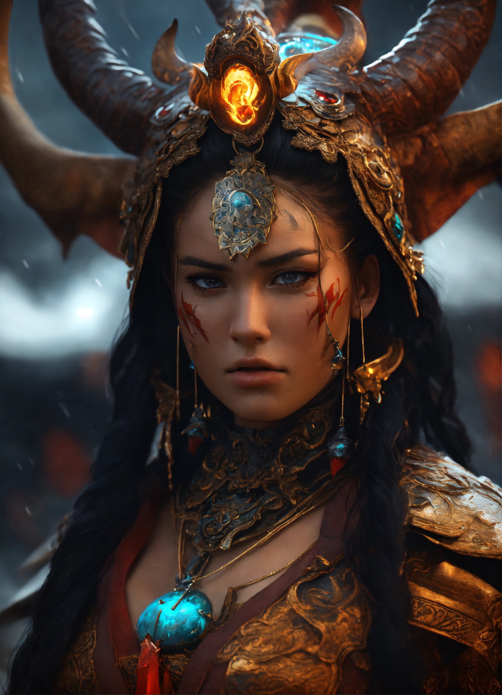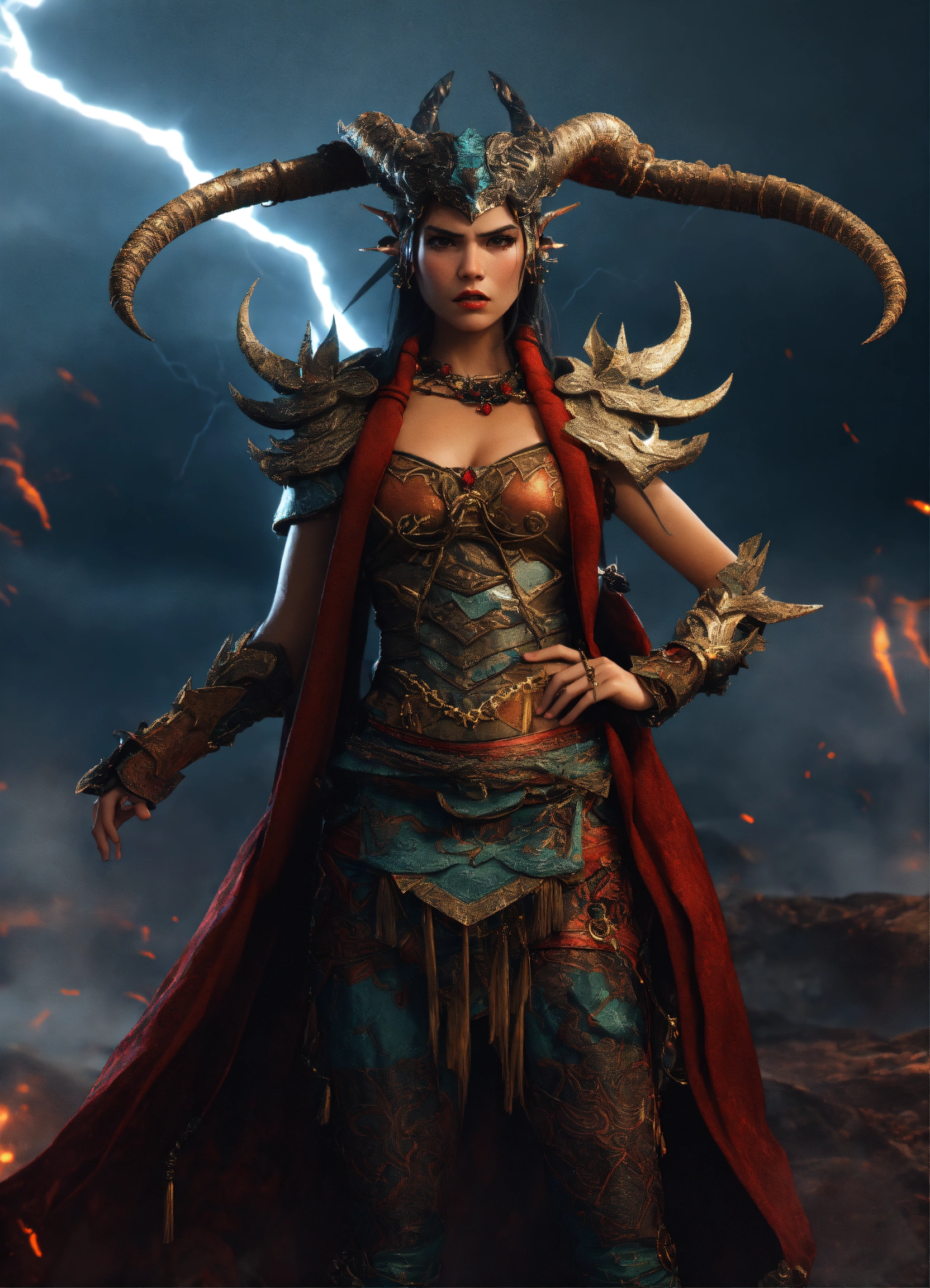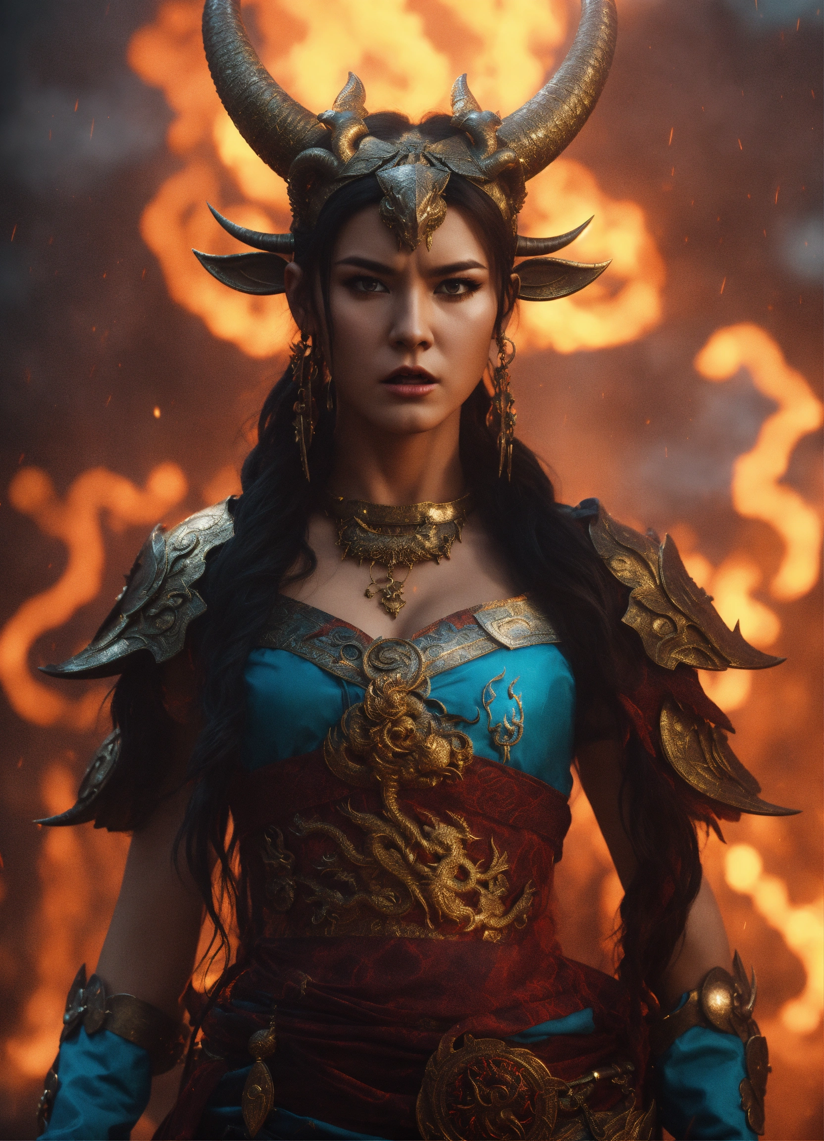 Antagonist young shamanic woman with short horns and elaborate costume, backgrounds like hell, dragon effects, angry, 3d, 32k, photorealistic and details, storm effective