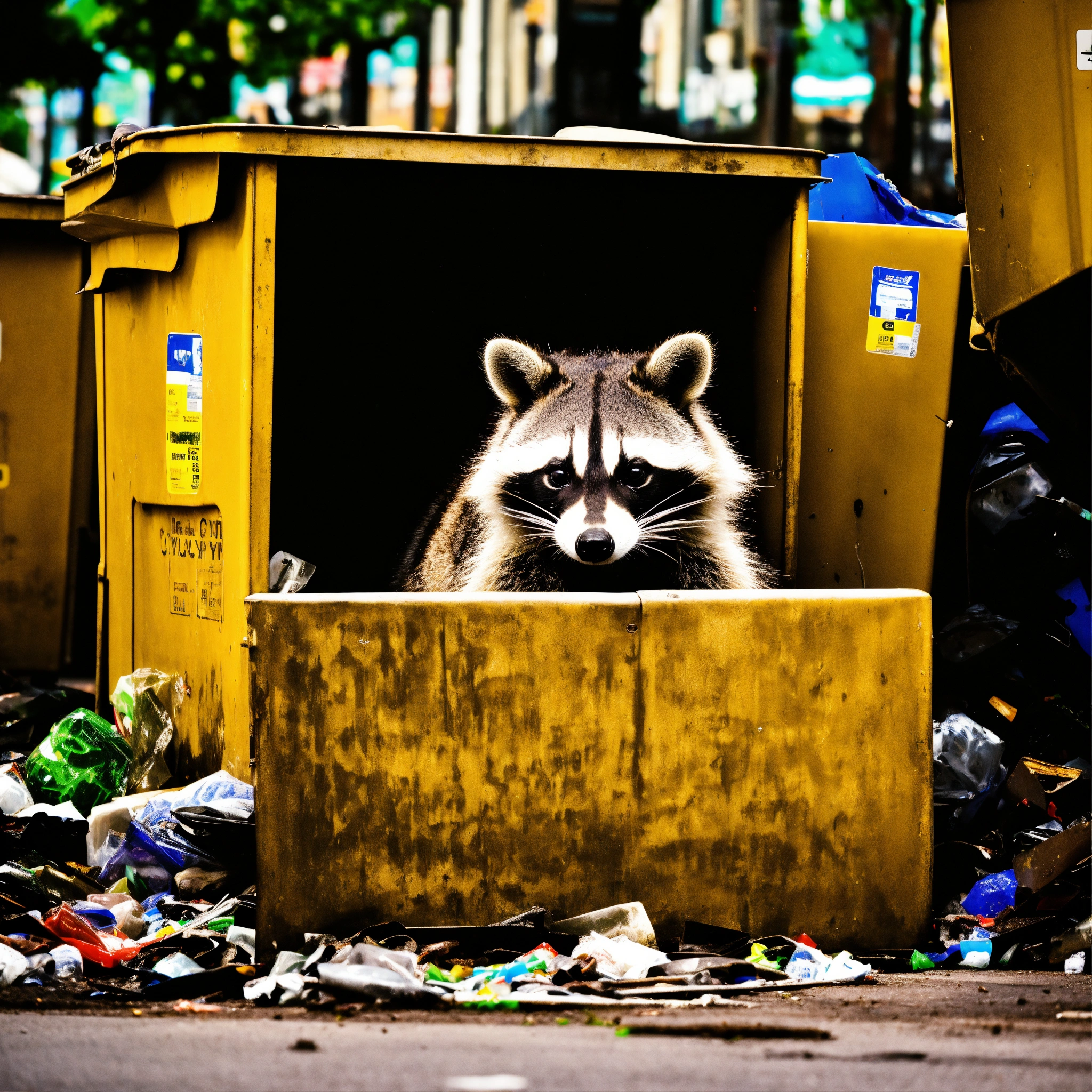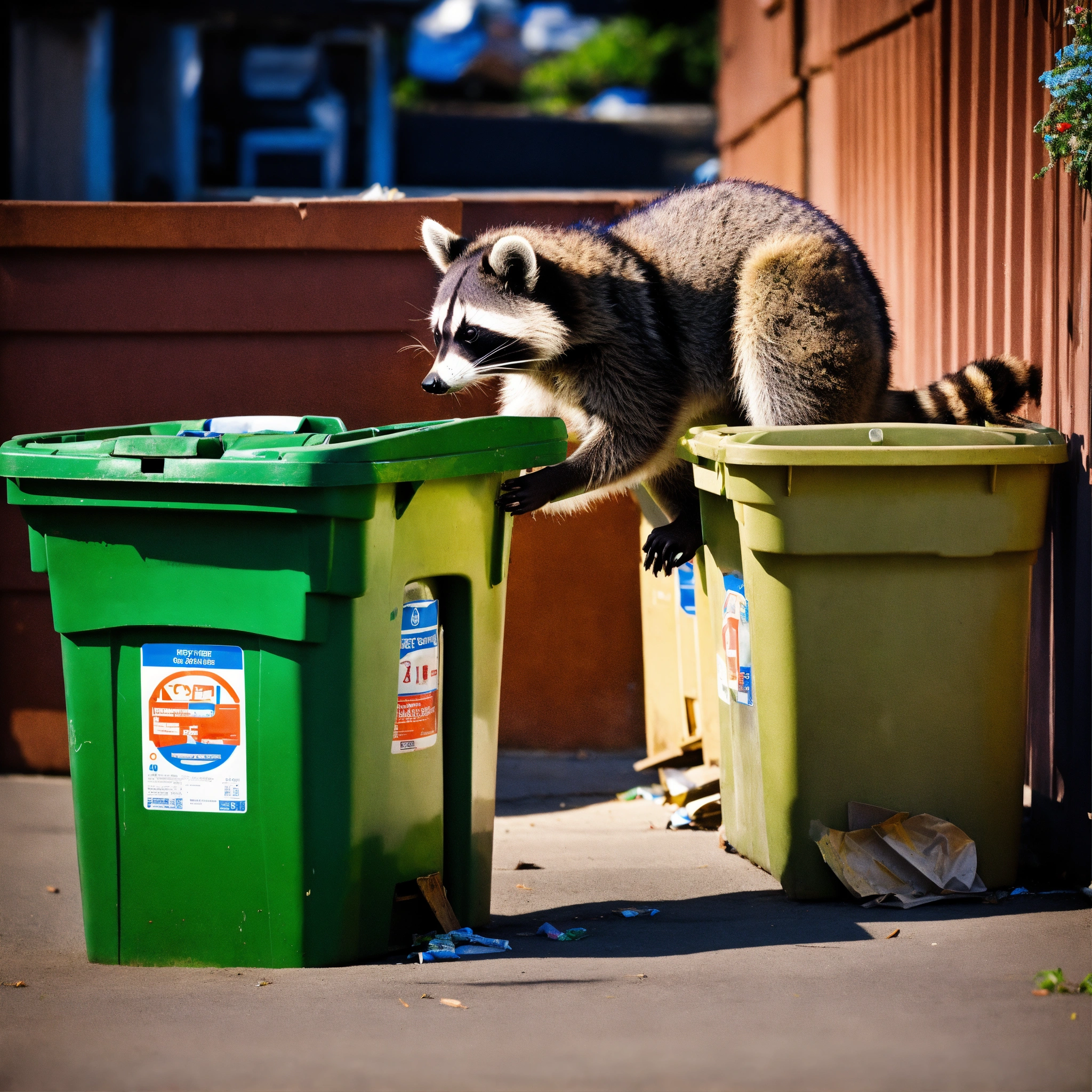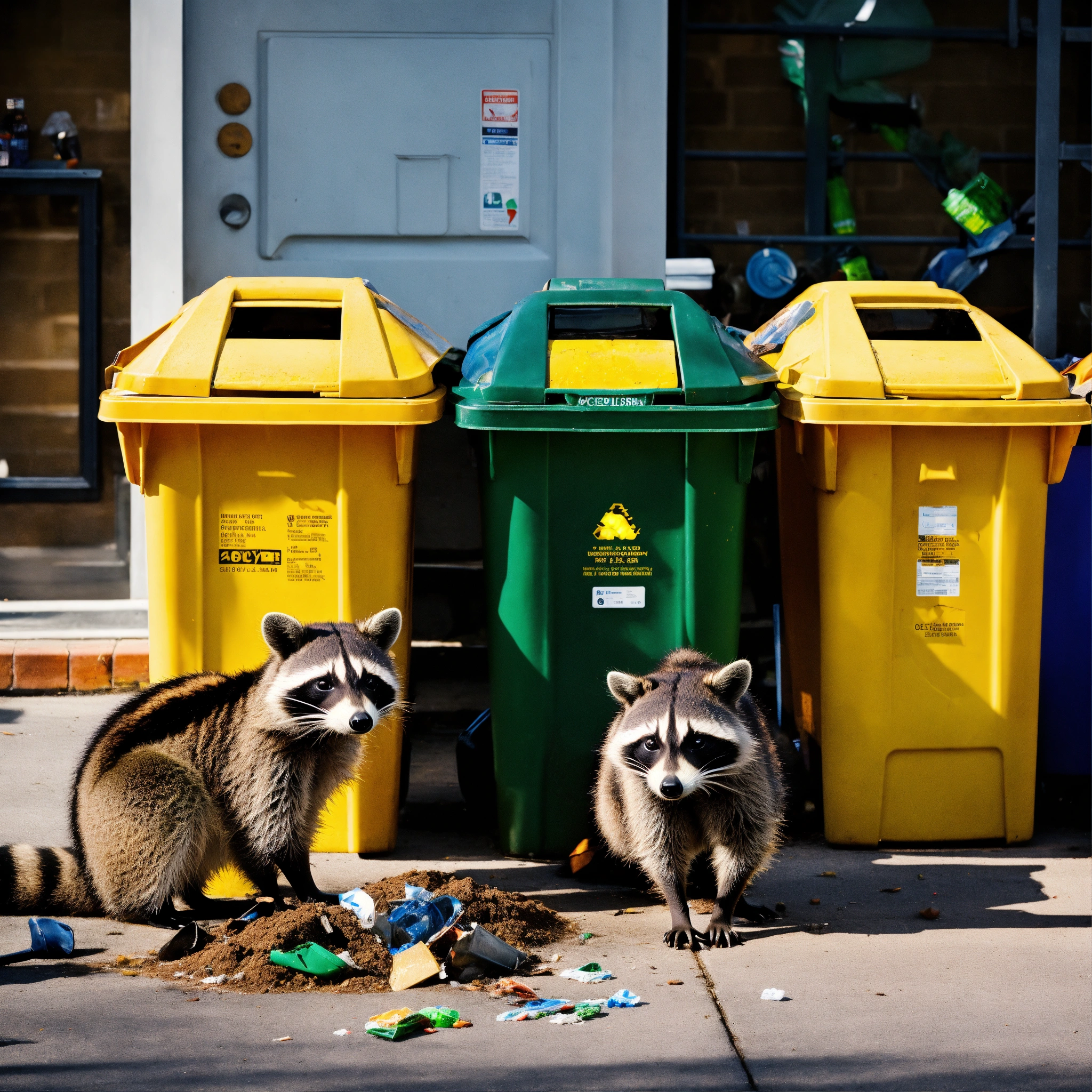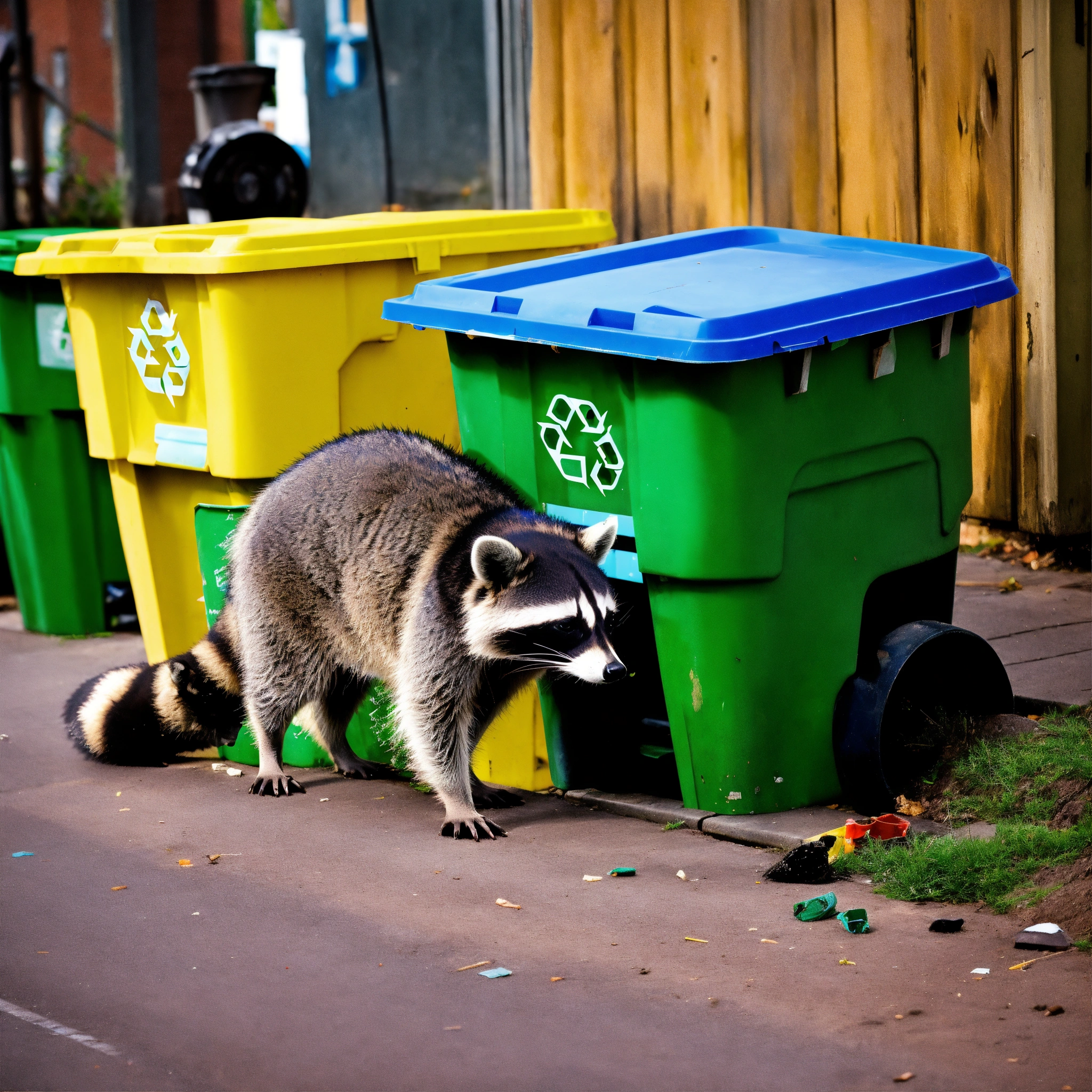 A photograph of a raccoon digging through recycling bins