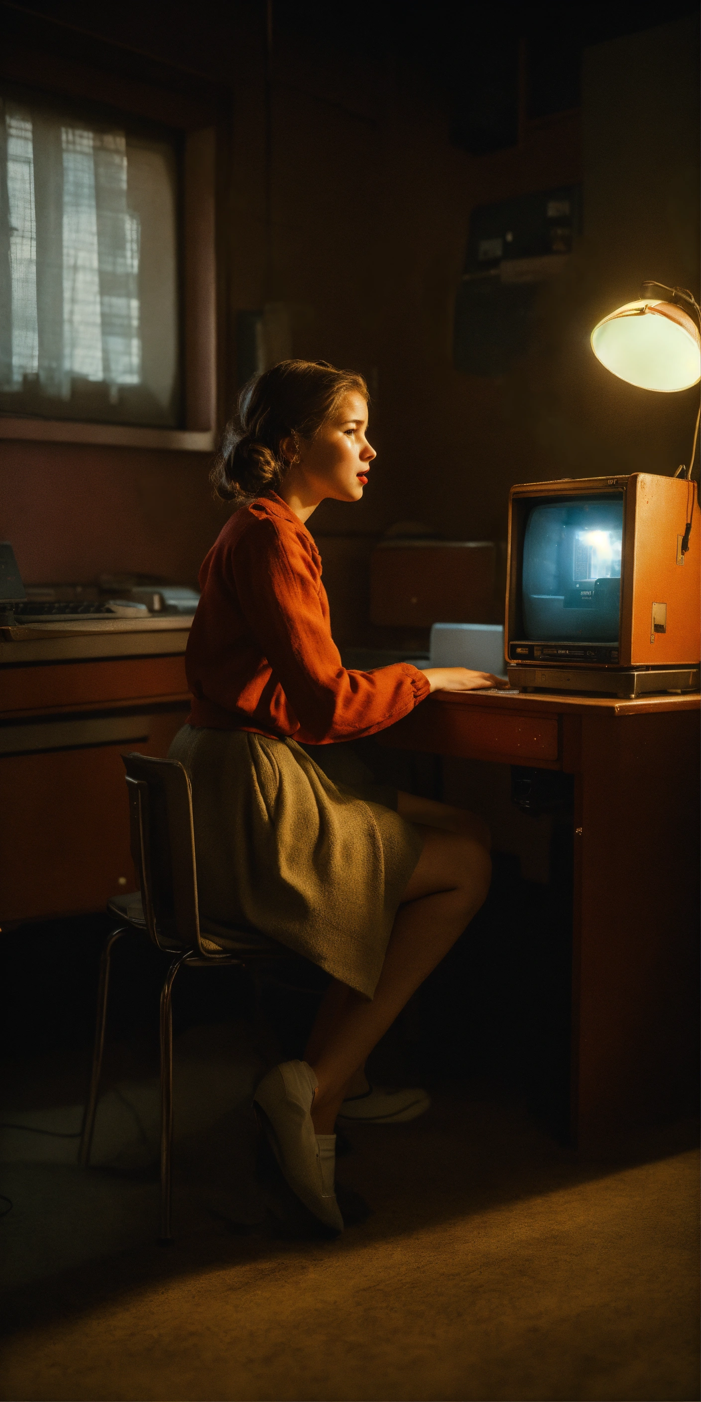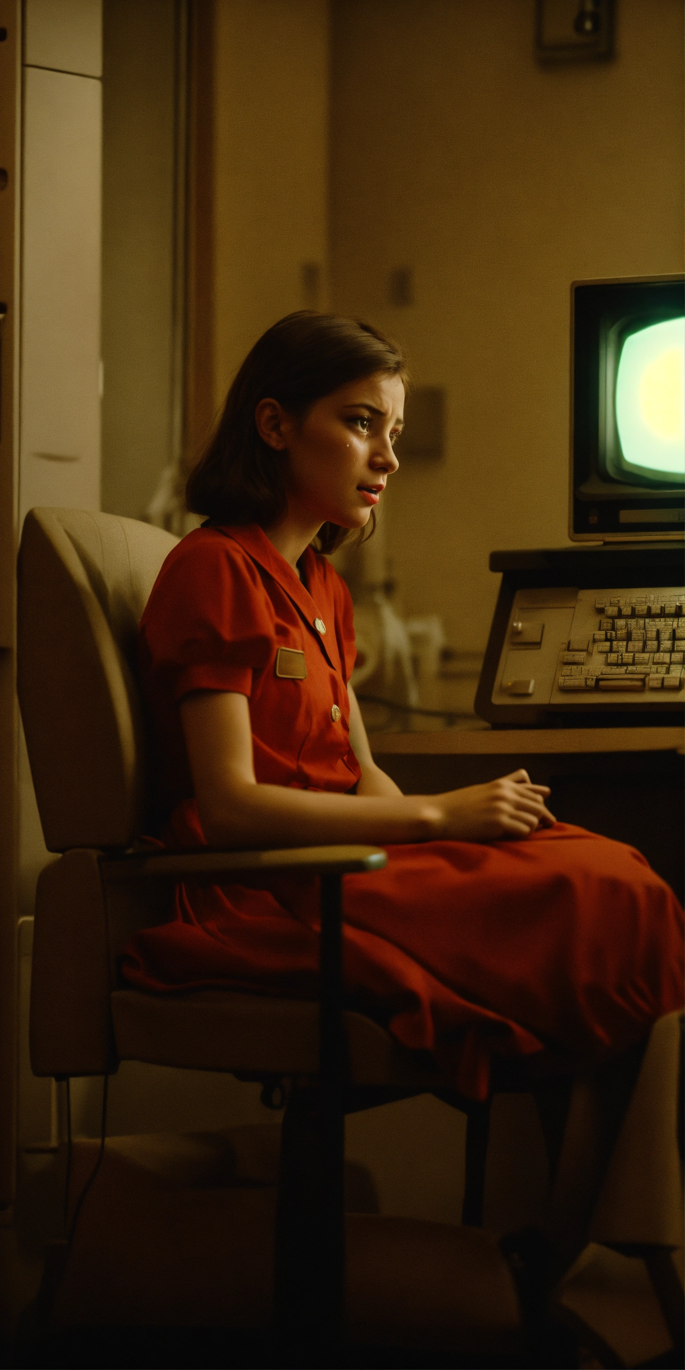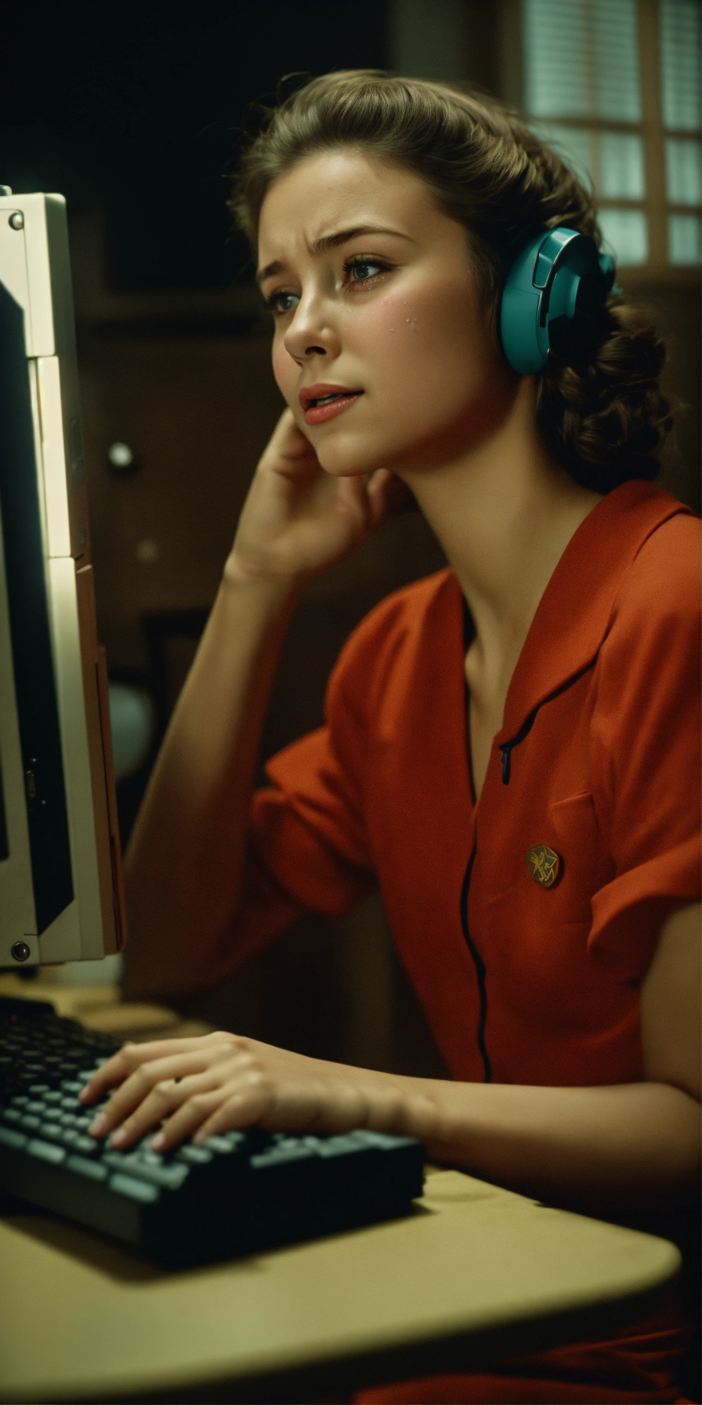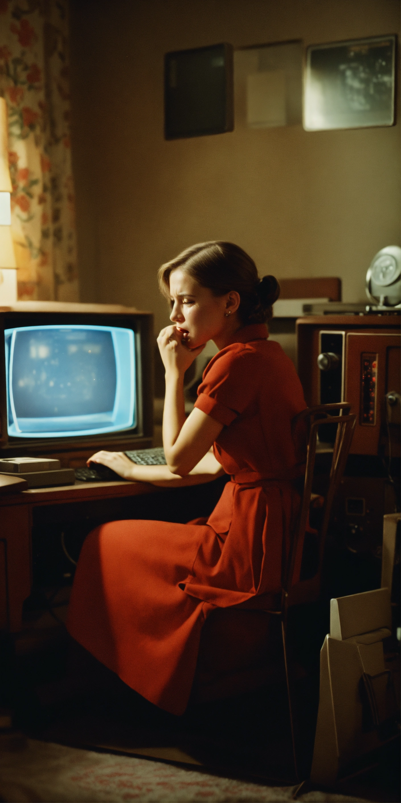 A soviet girl sitting in a chair in front of a soviet computer in the communal apartment, crying, 8k, ultra realistic, details anatomy, cinematic lighting, photographic, eastman kodak color negative film 5251 50t shot on panavision super ps . no arms
