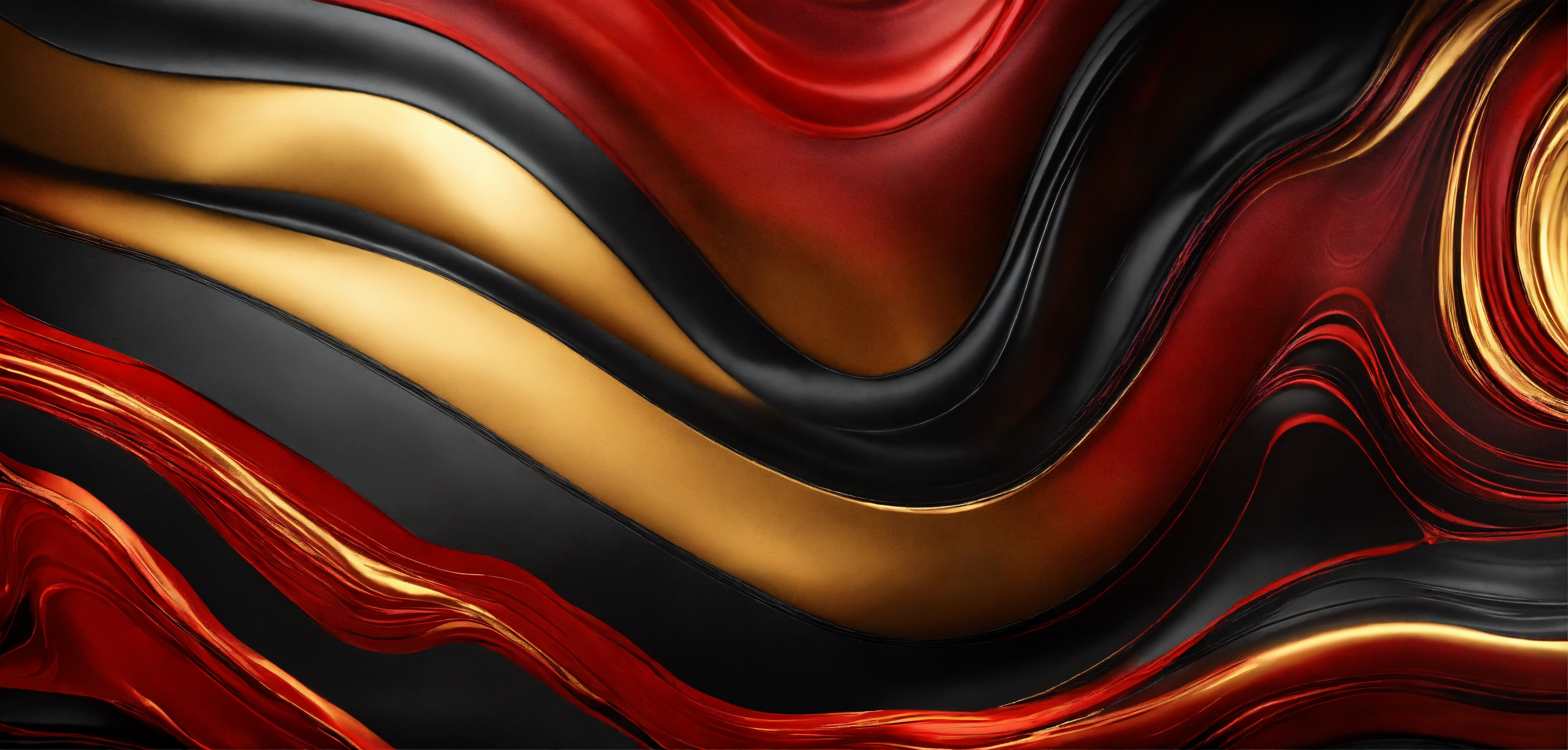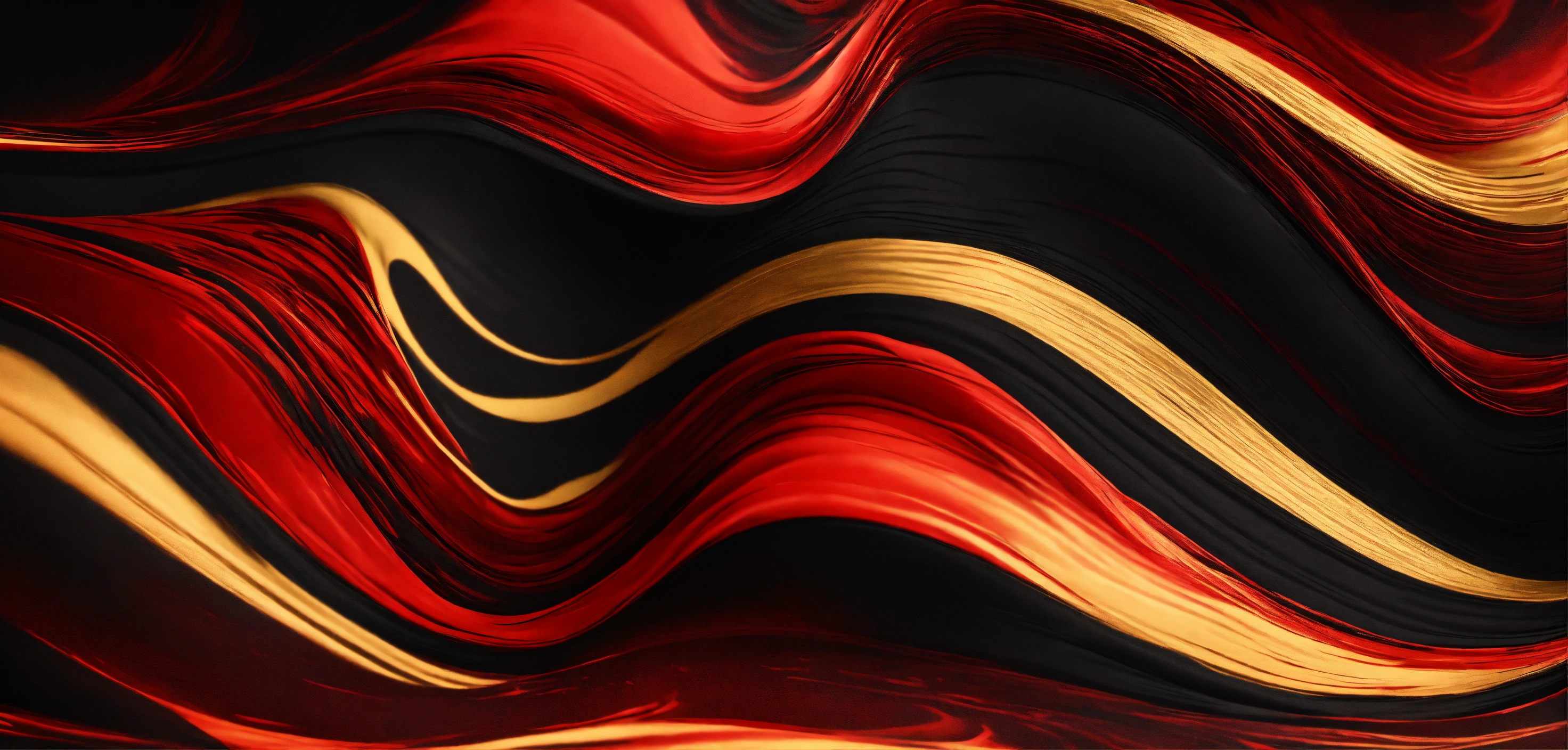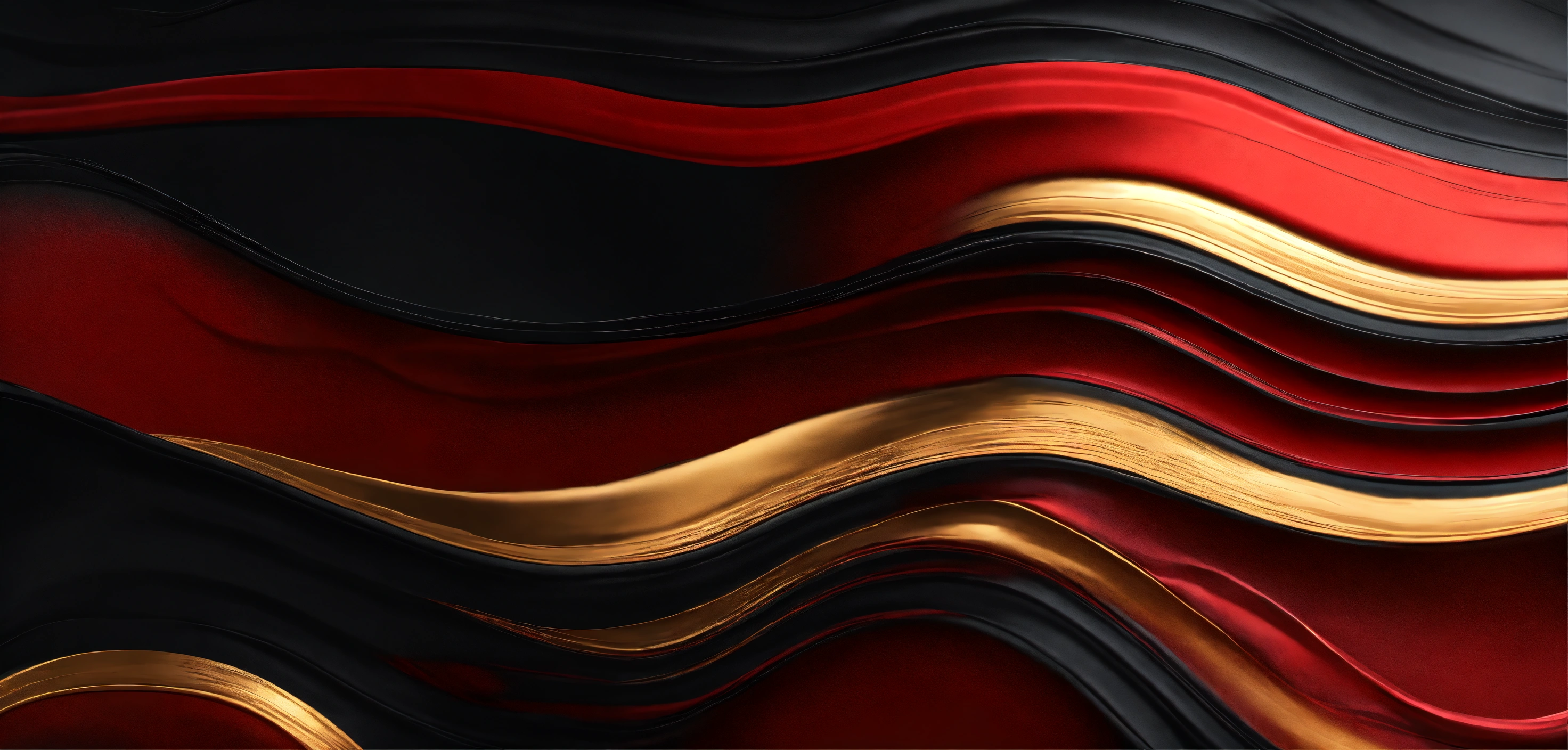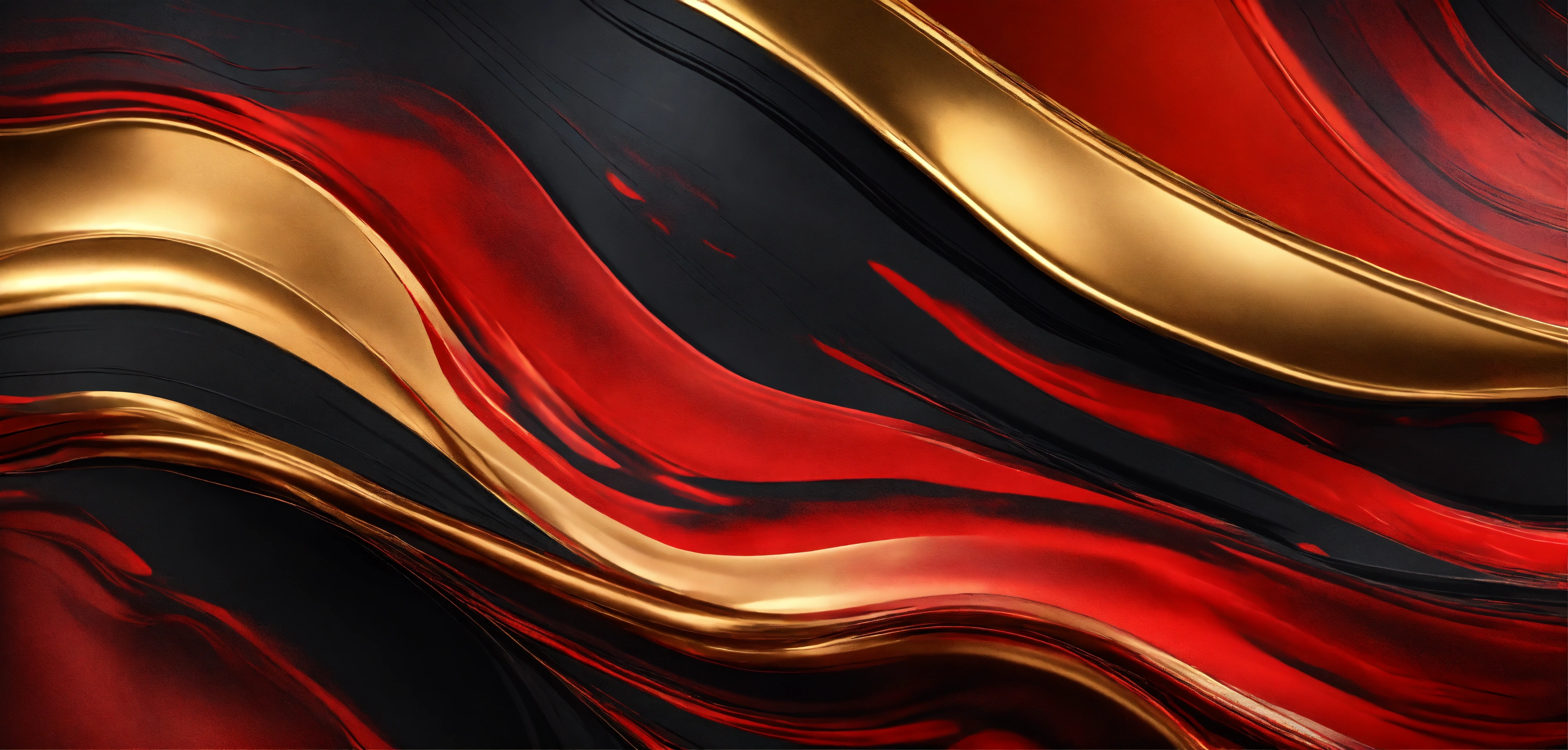 Abstract liquid background in red and black colors with golden strokes, illustration of wavy curves of black and red paint with golden overflows, luxury background