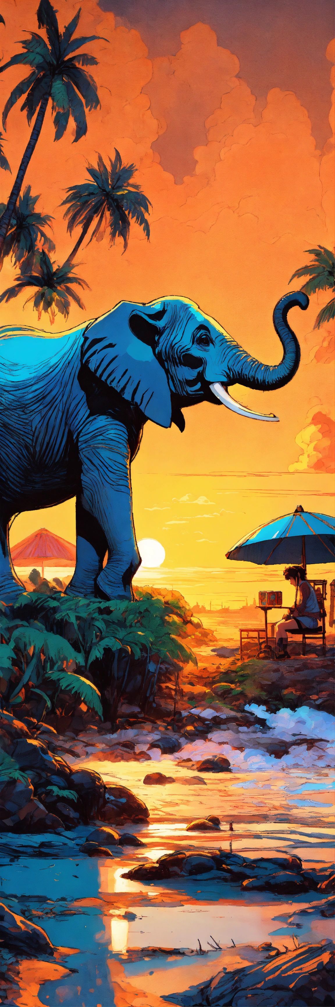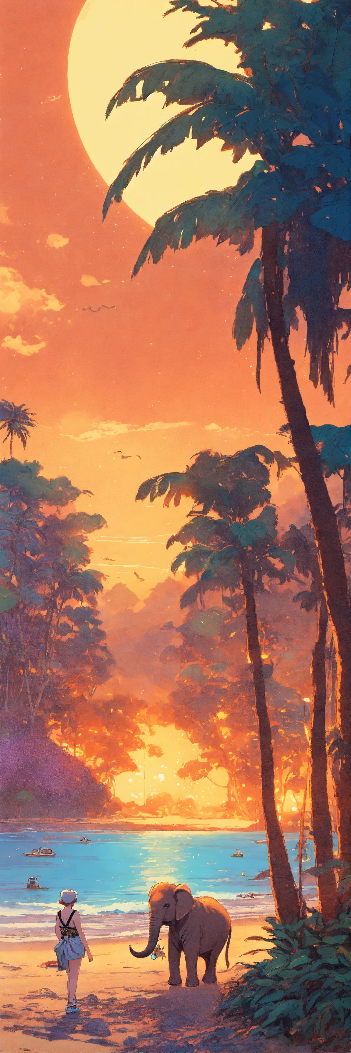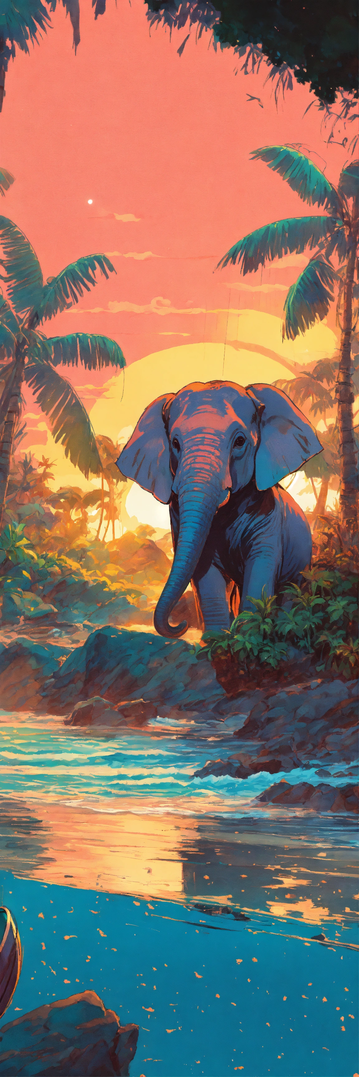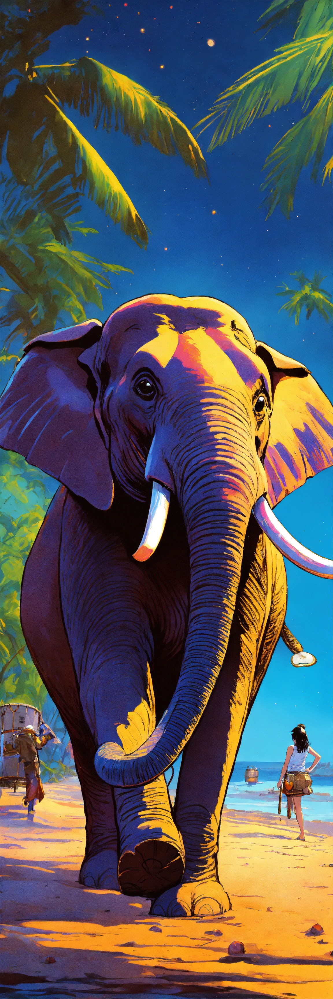 There is a baby elephant playing a drum, vintage 90's anime style environmental wide shot of a chaotic tropical beach at night; cashew fruit, coconut trees, a lass wearing streetwear; by hajime sorayama, greg tocchini, virgil finlay, sci-fi. line art. environmental arcade art.