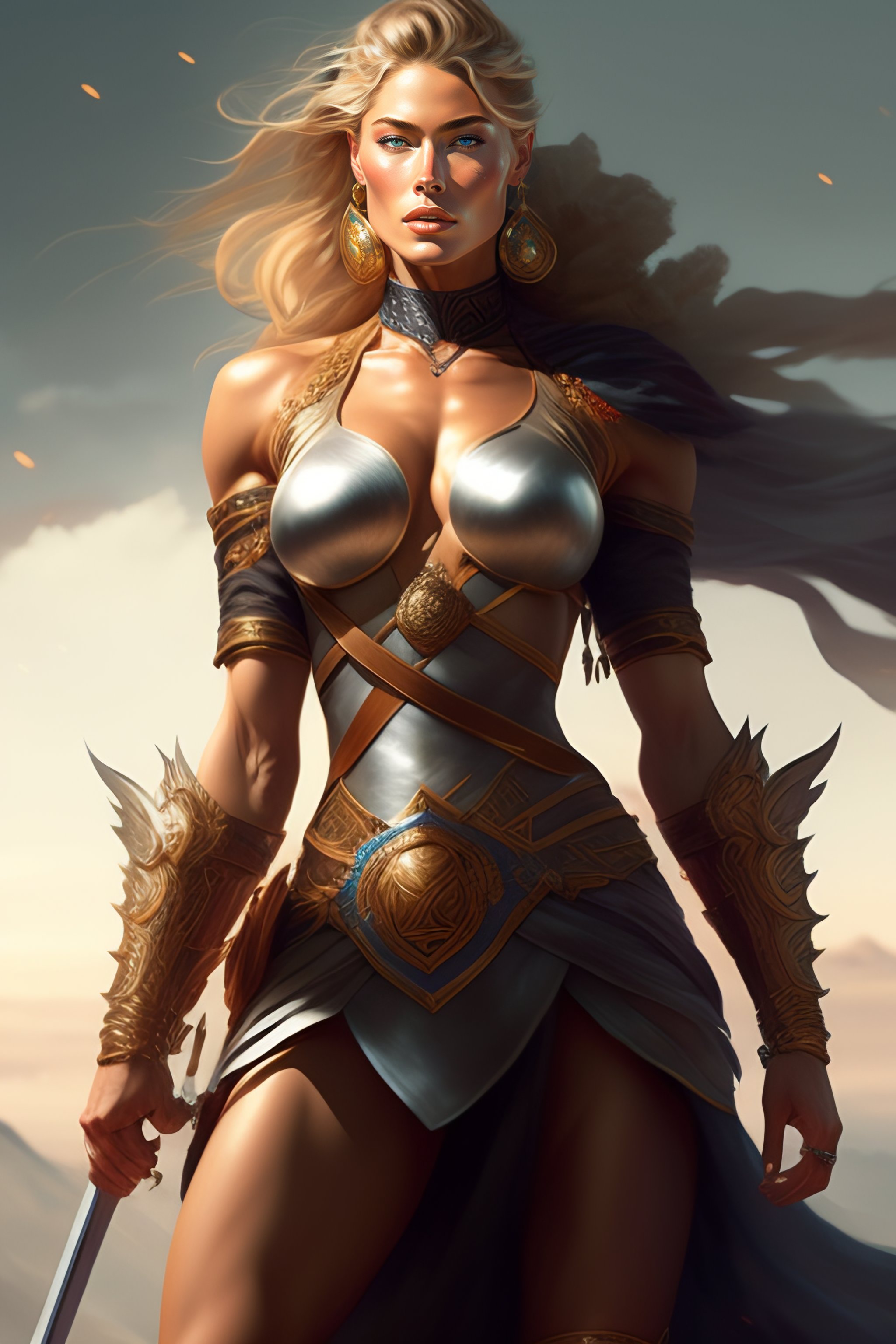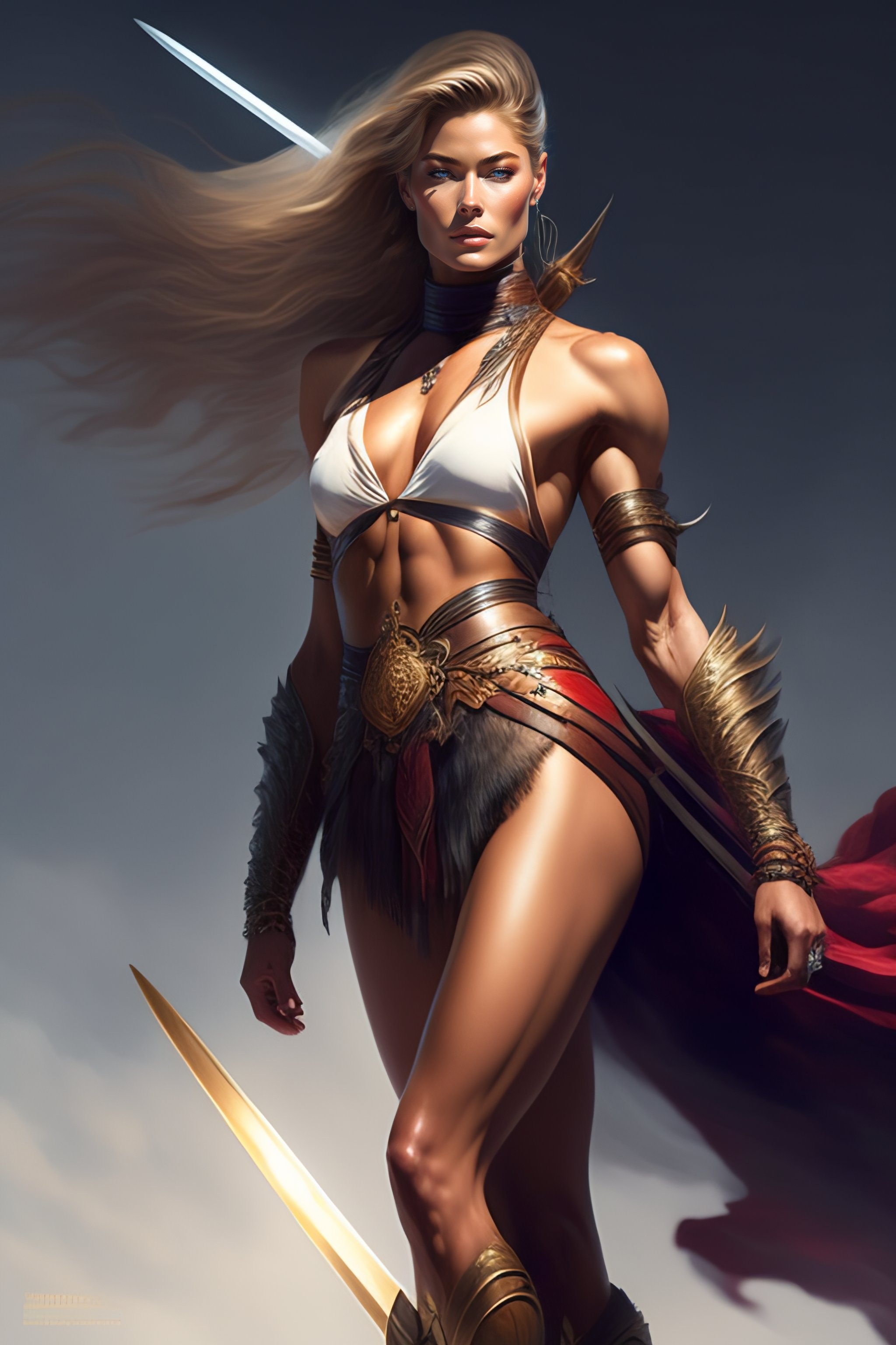 Full body potrait of muscular doutzen kroes as rugged warrior sparying sword in air, muscular legs and six abs, highly detailed, digital painting, artstation, concept art, smooth, sharp focus, illustration, art by tian zi and wlop and alphonse mucha