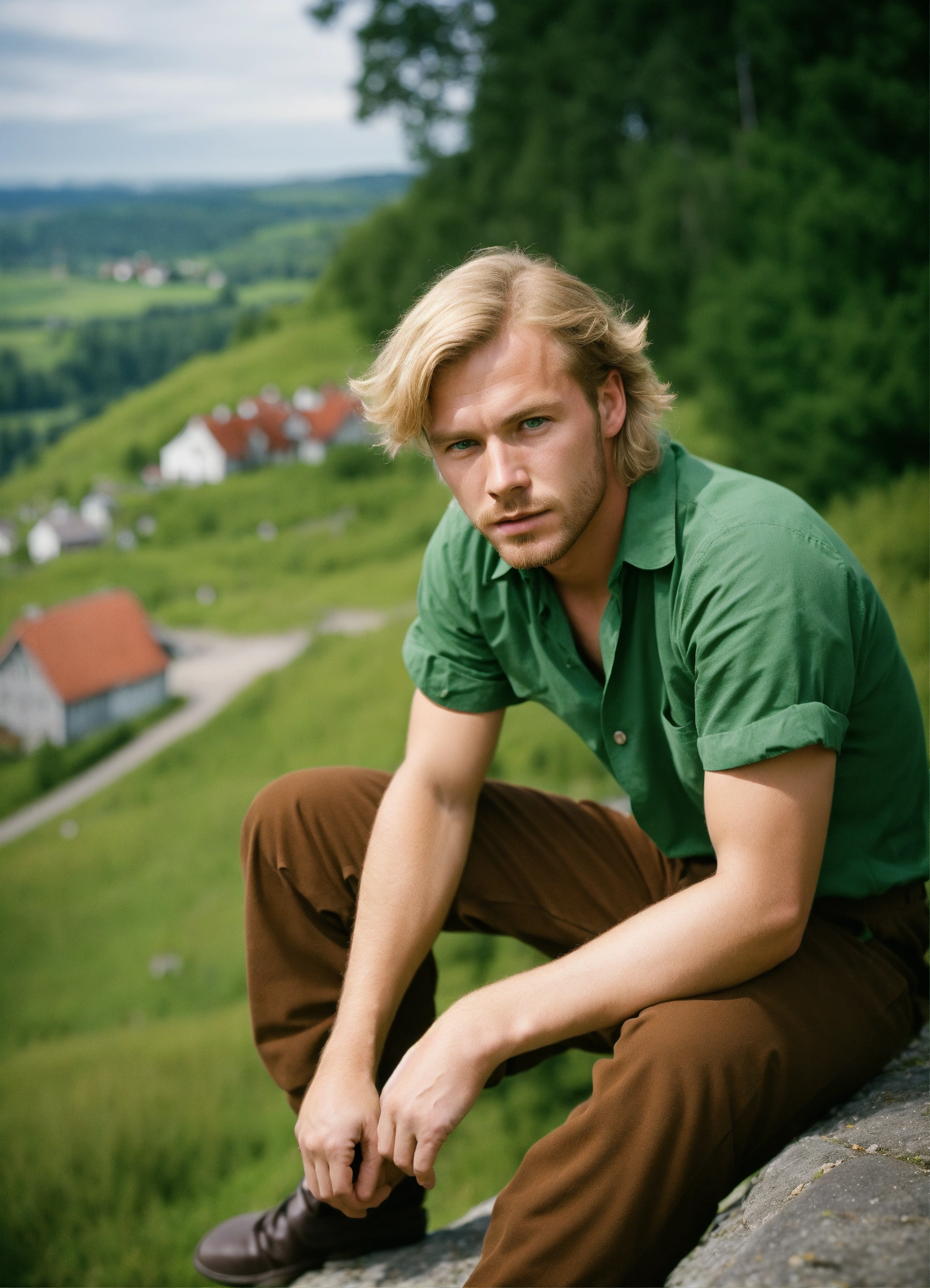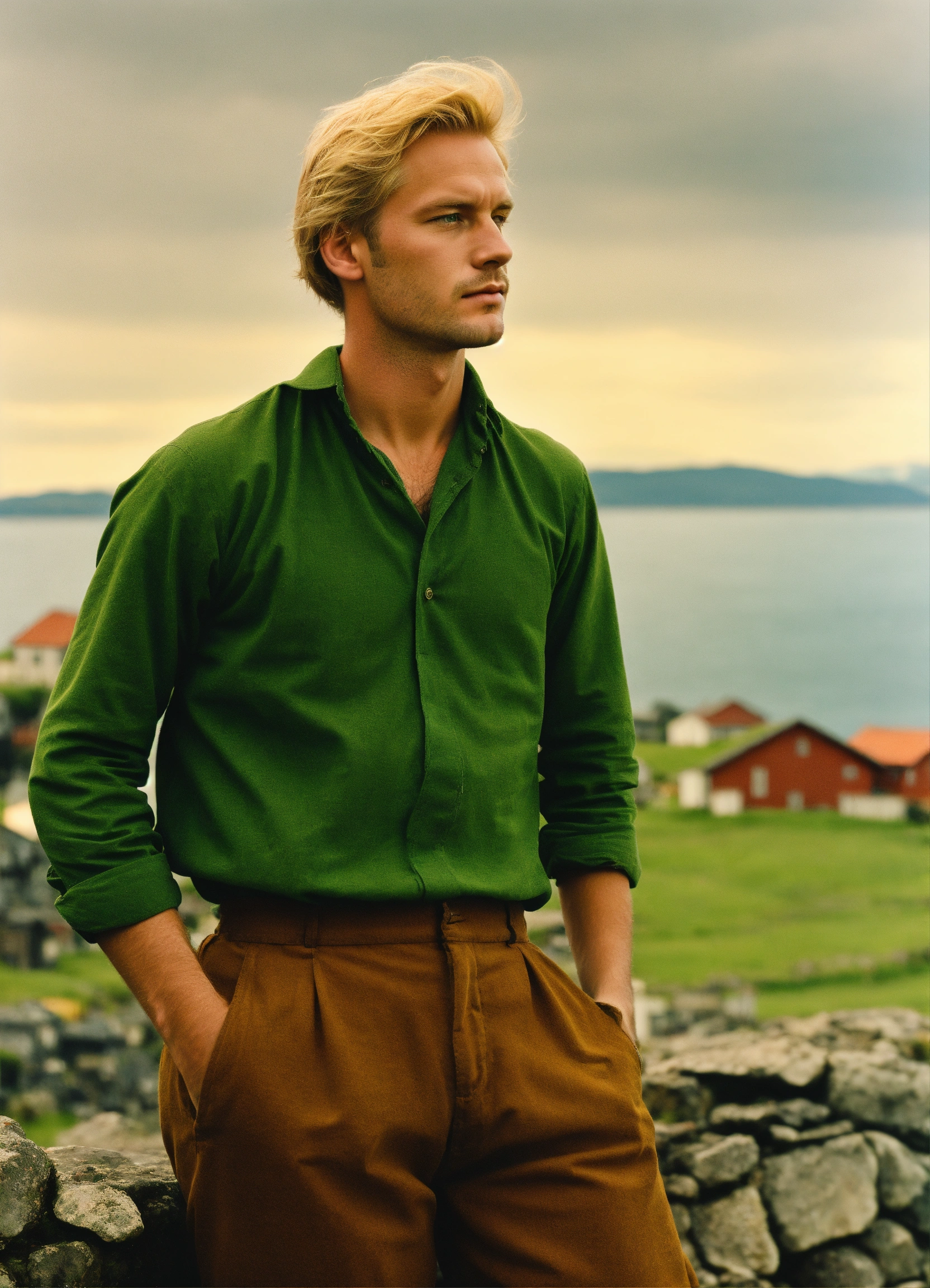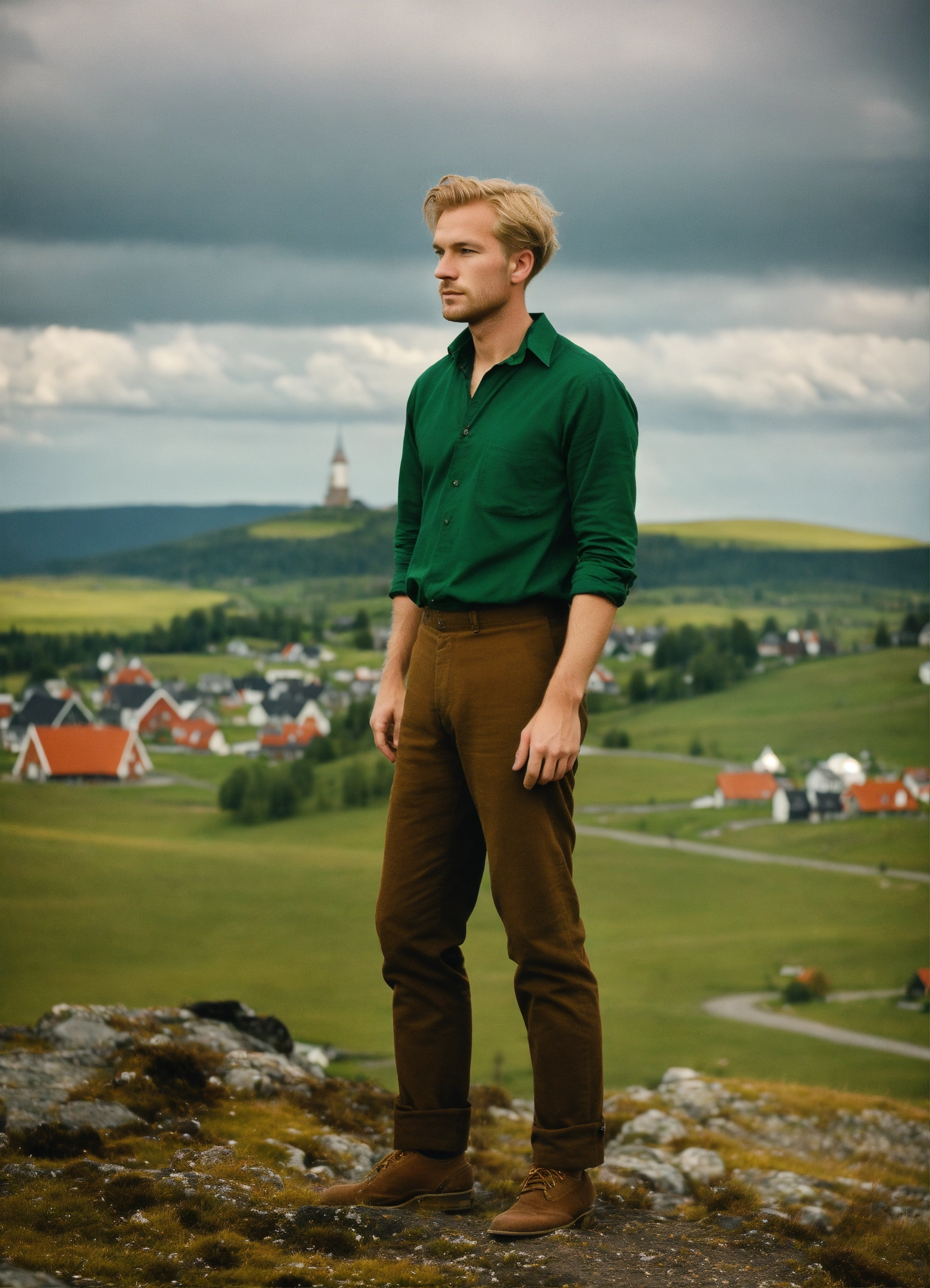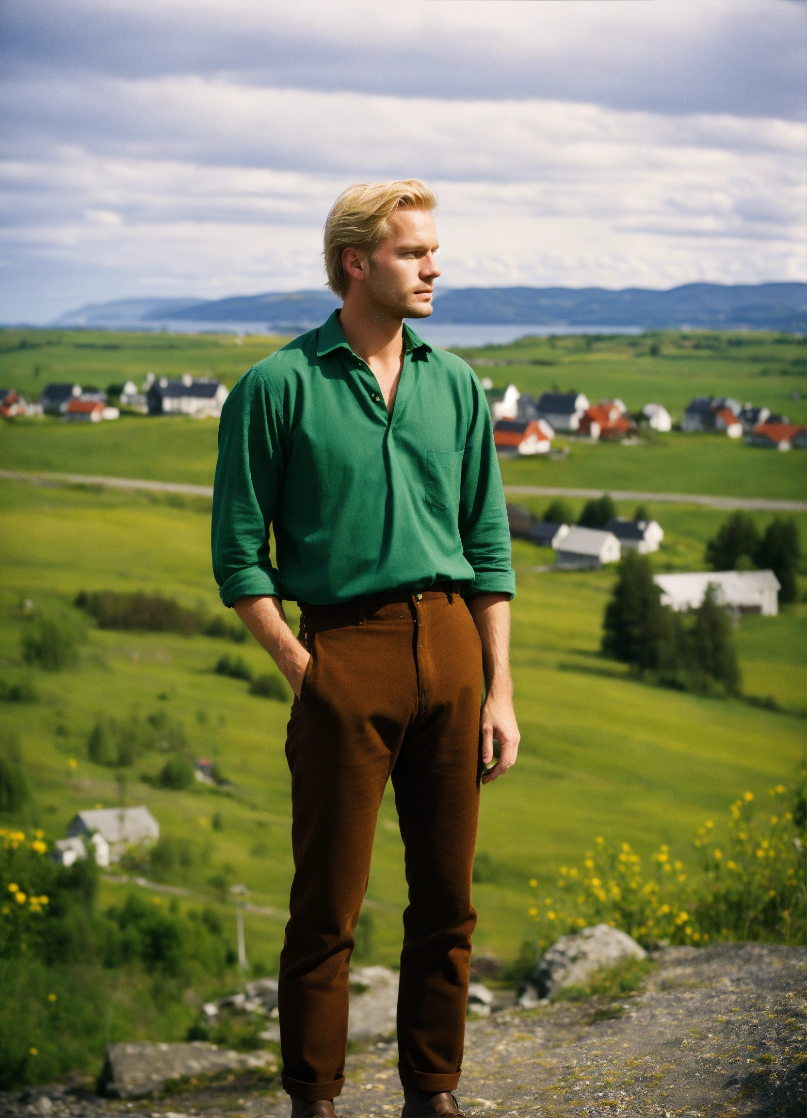 A norwegian, wearing a green shirt and brown trousers. he has blond hair and is 30 years old. he is looking at the horizon in his small village in 1950. he is looking at the horizon.