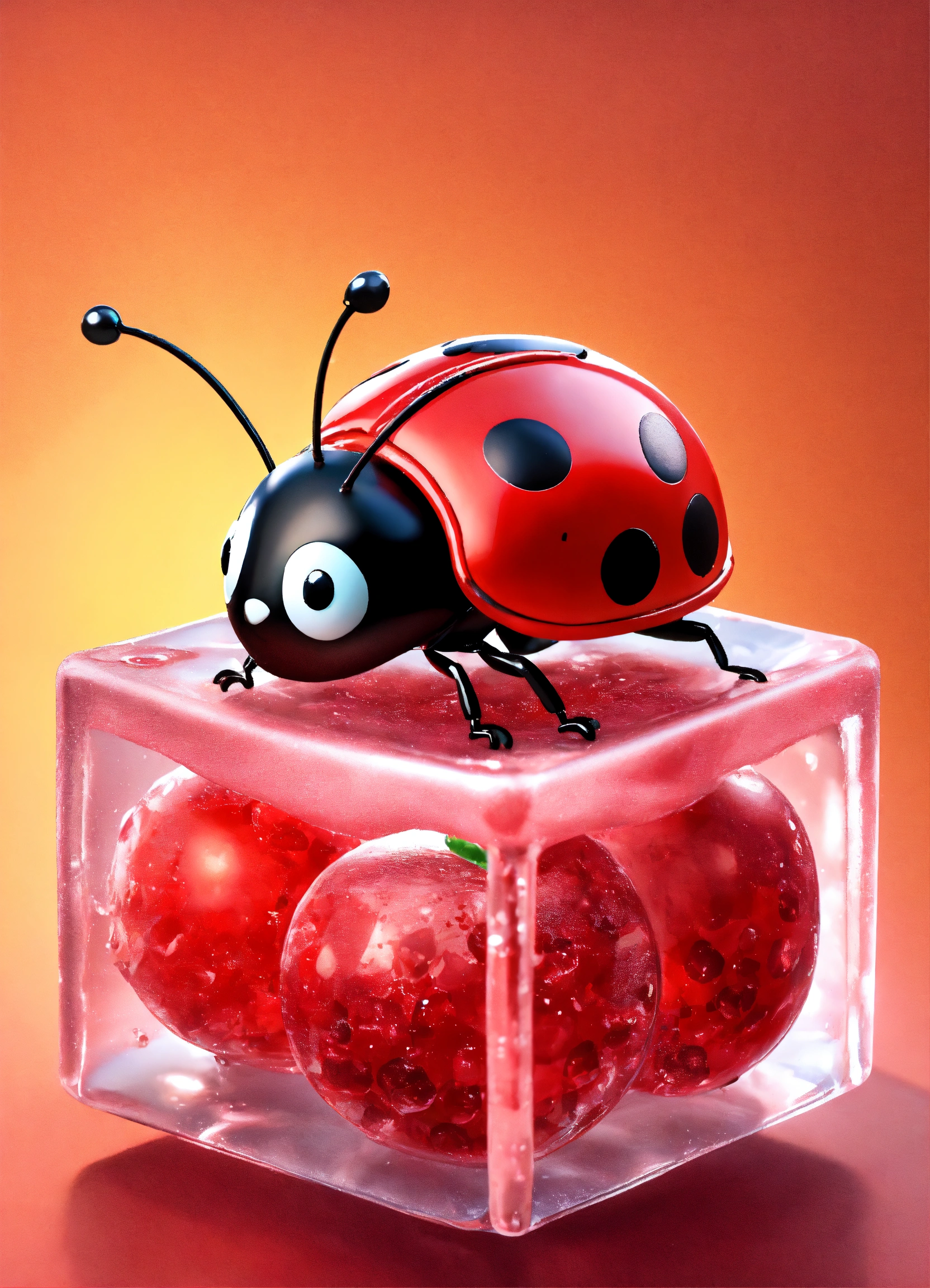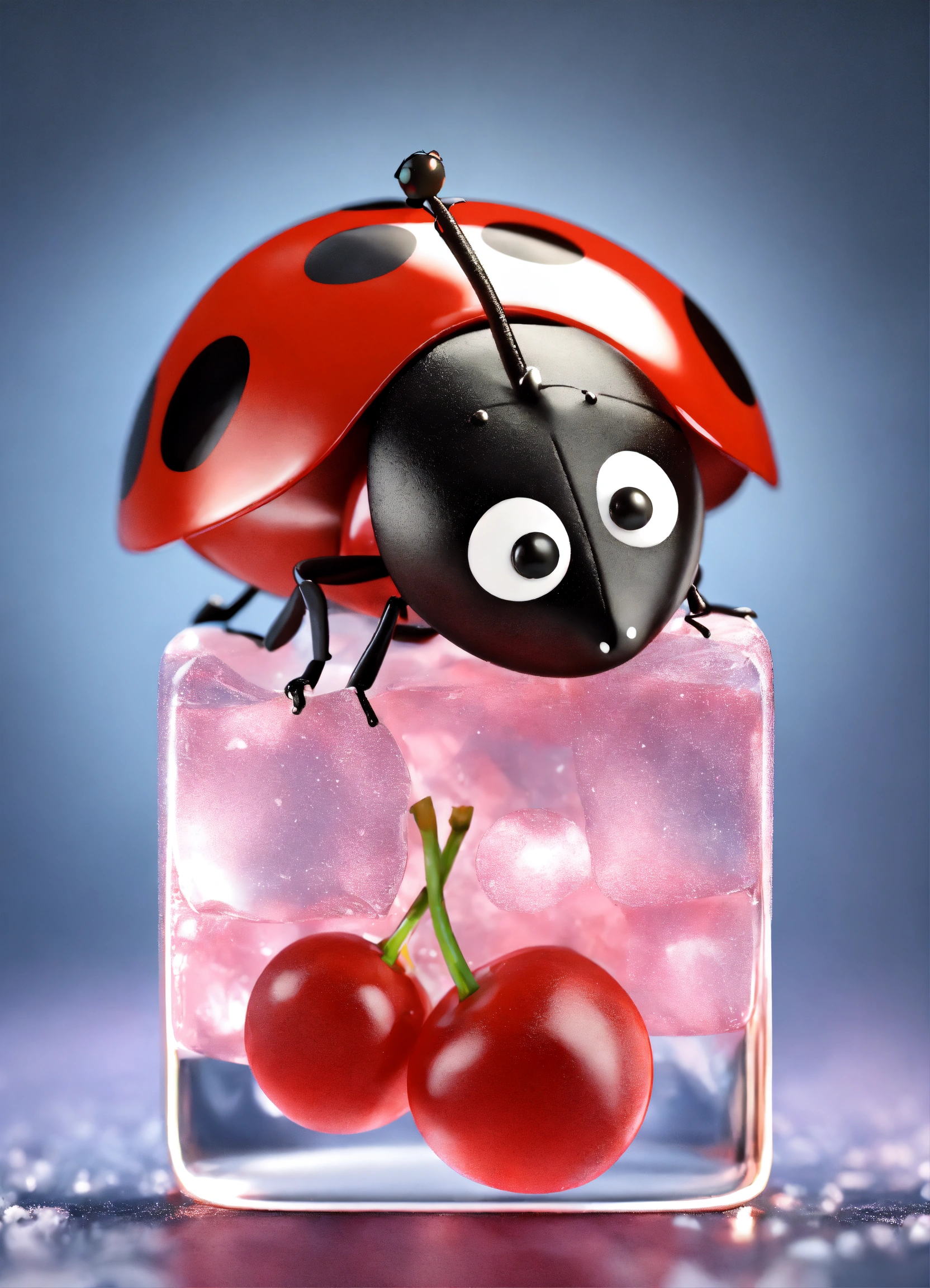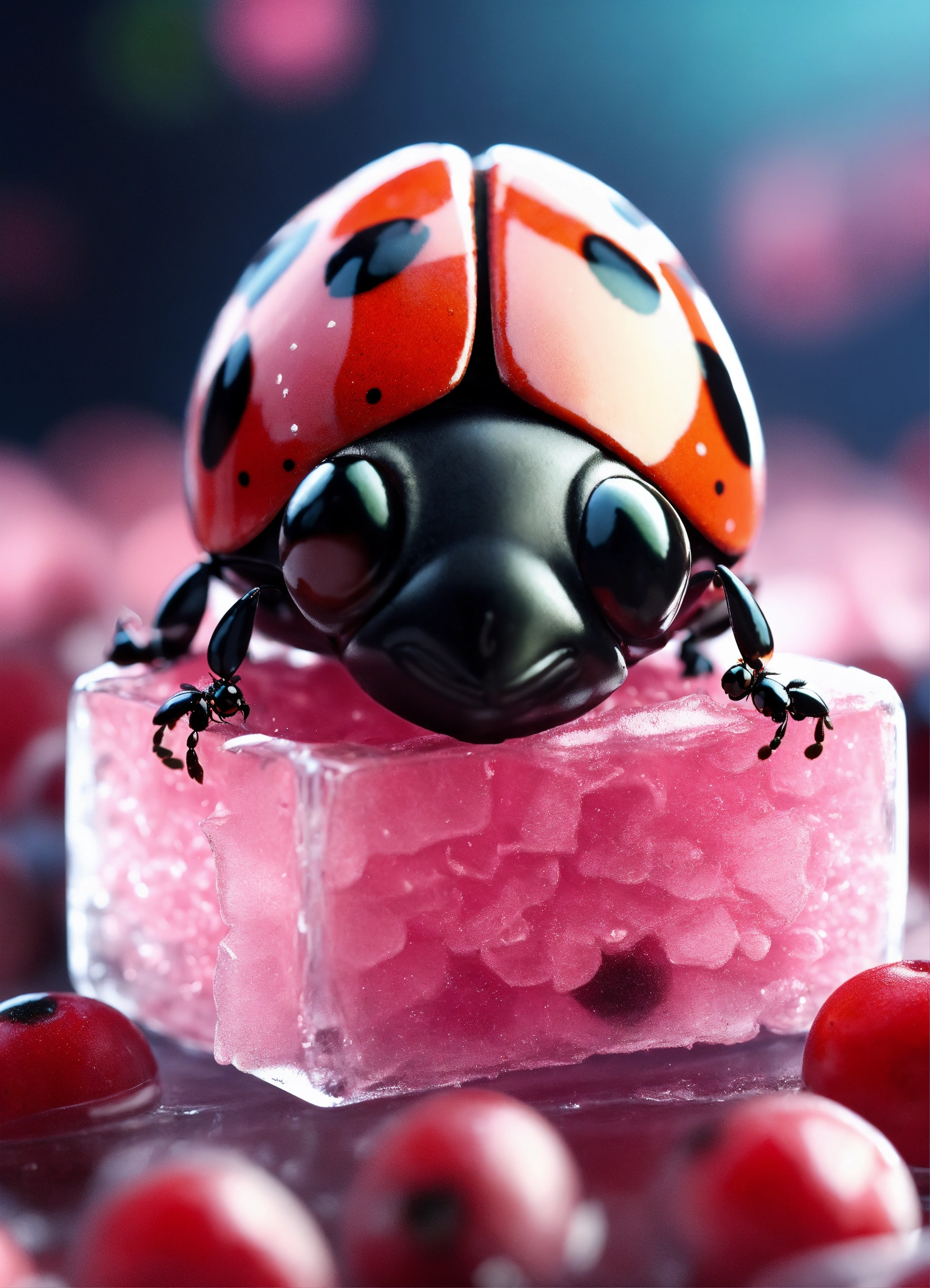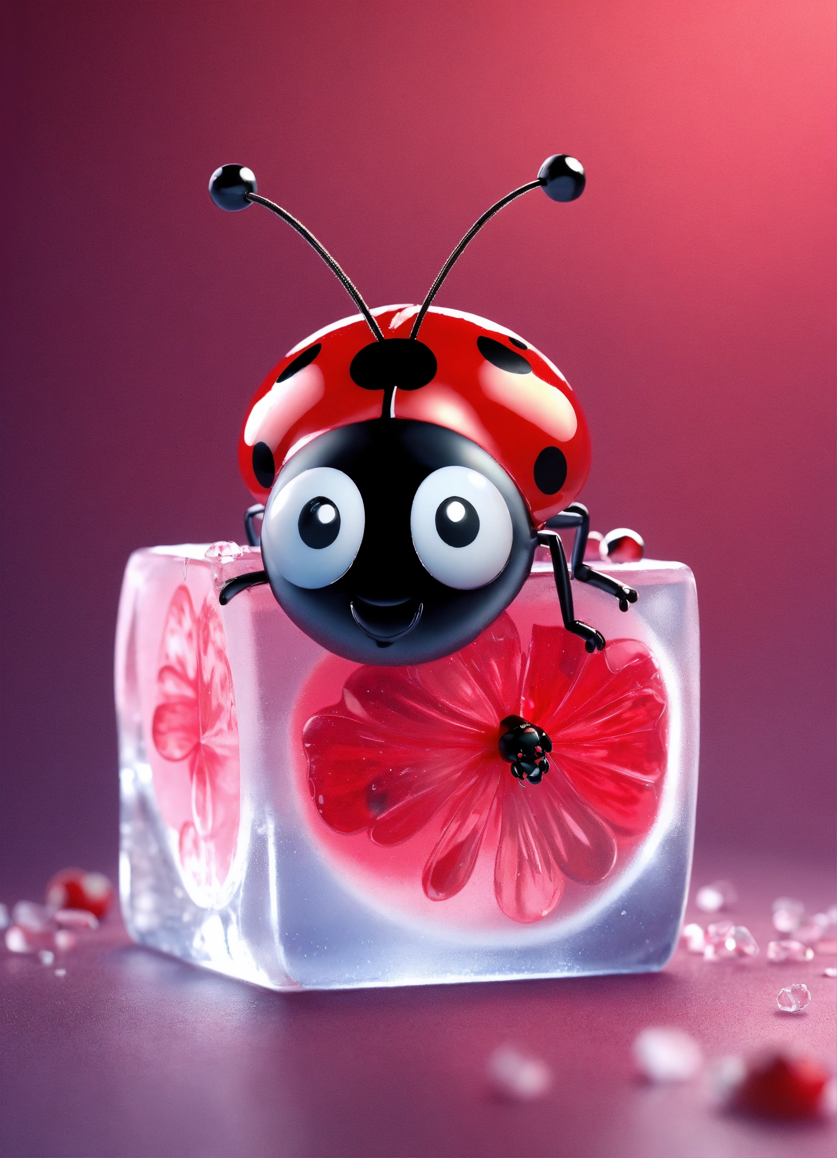 A cute 3d ladybug character sitting on an cherry ice-cube, charming, adorable, childlike, hyperrealistic, high resolution