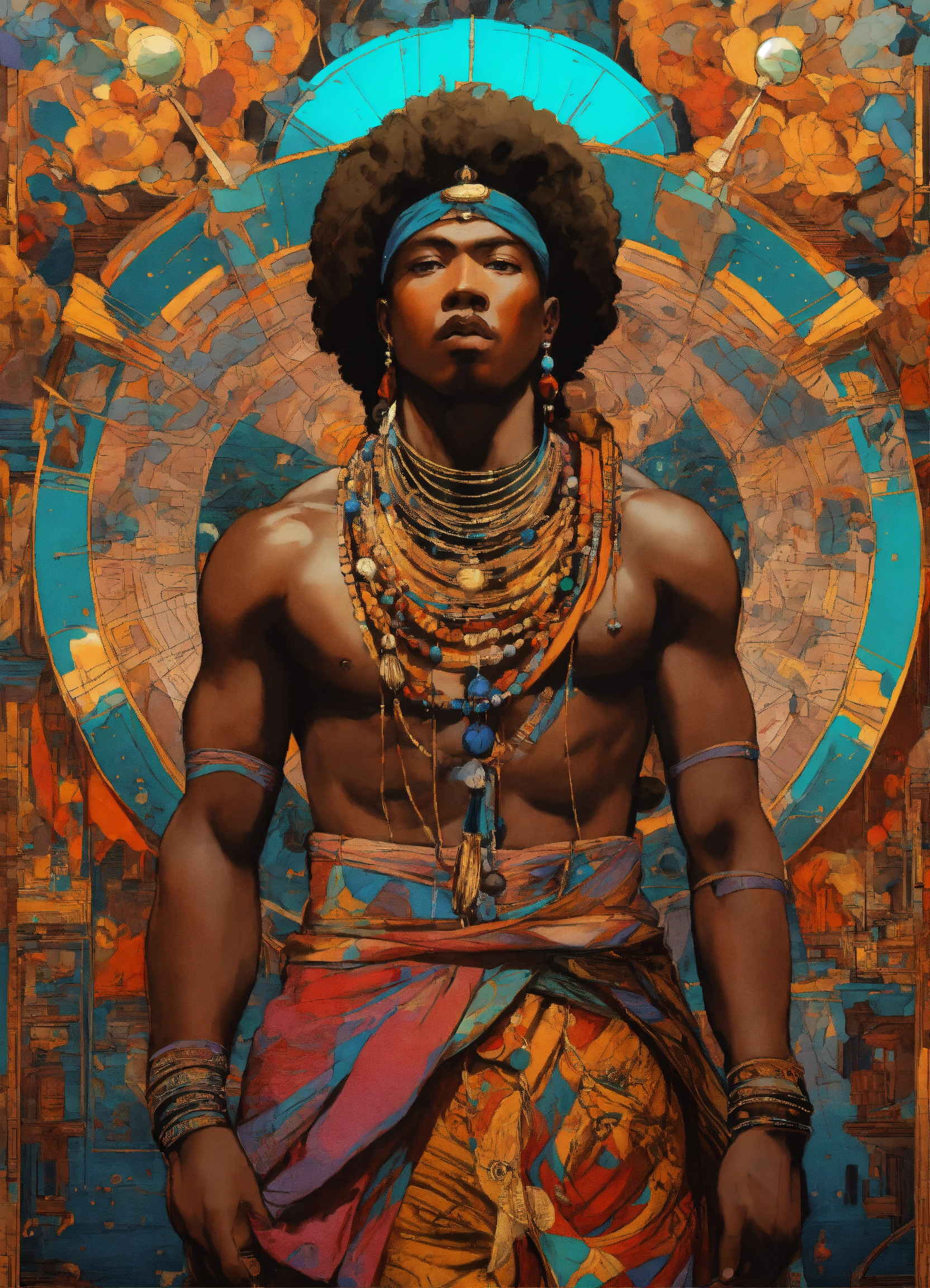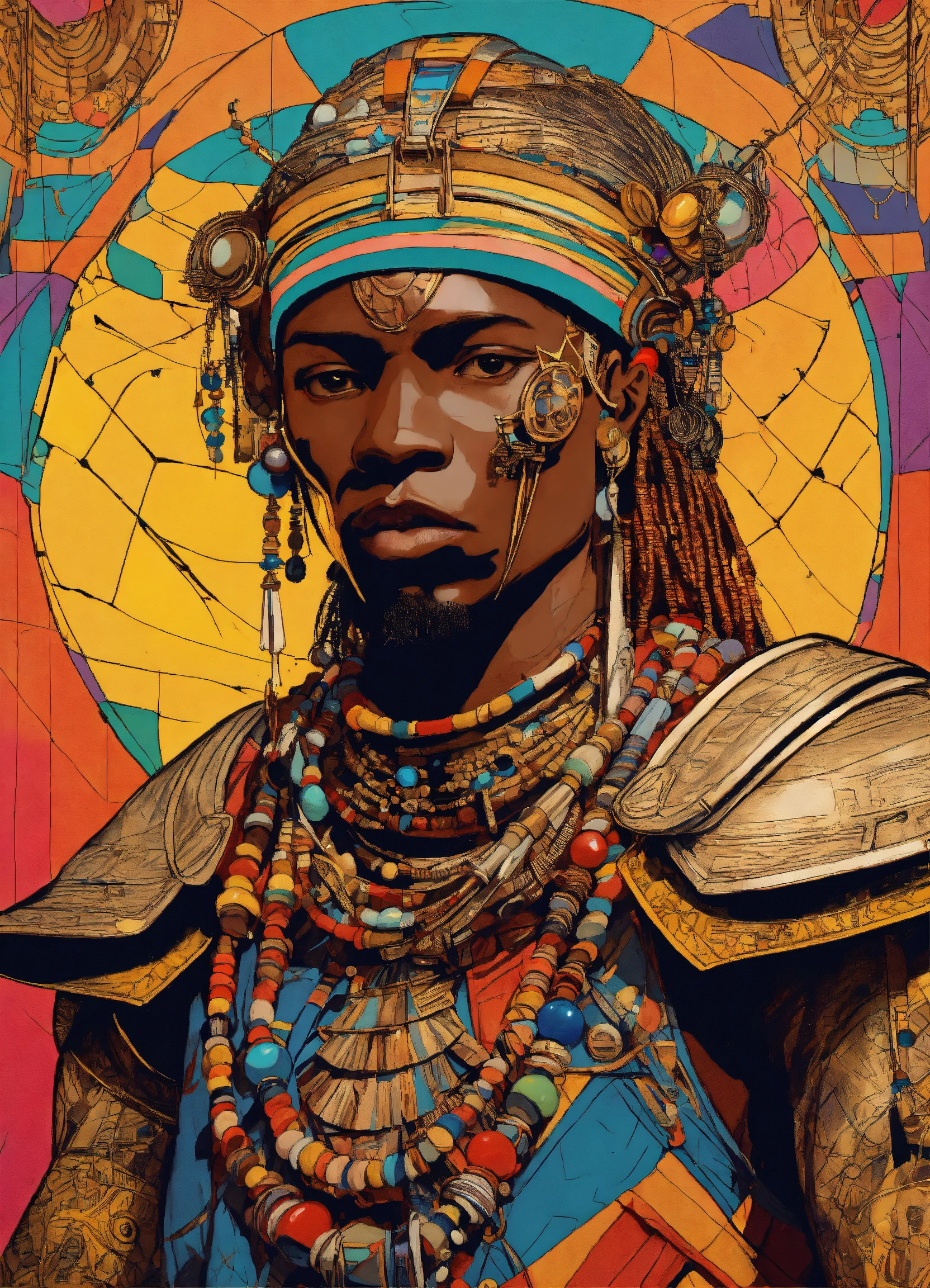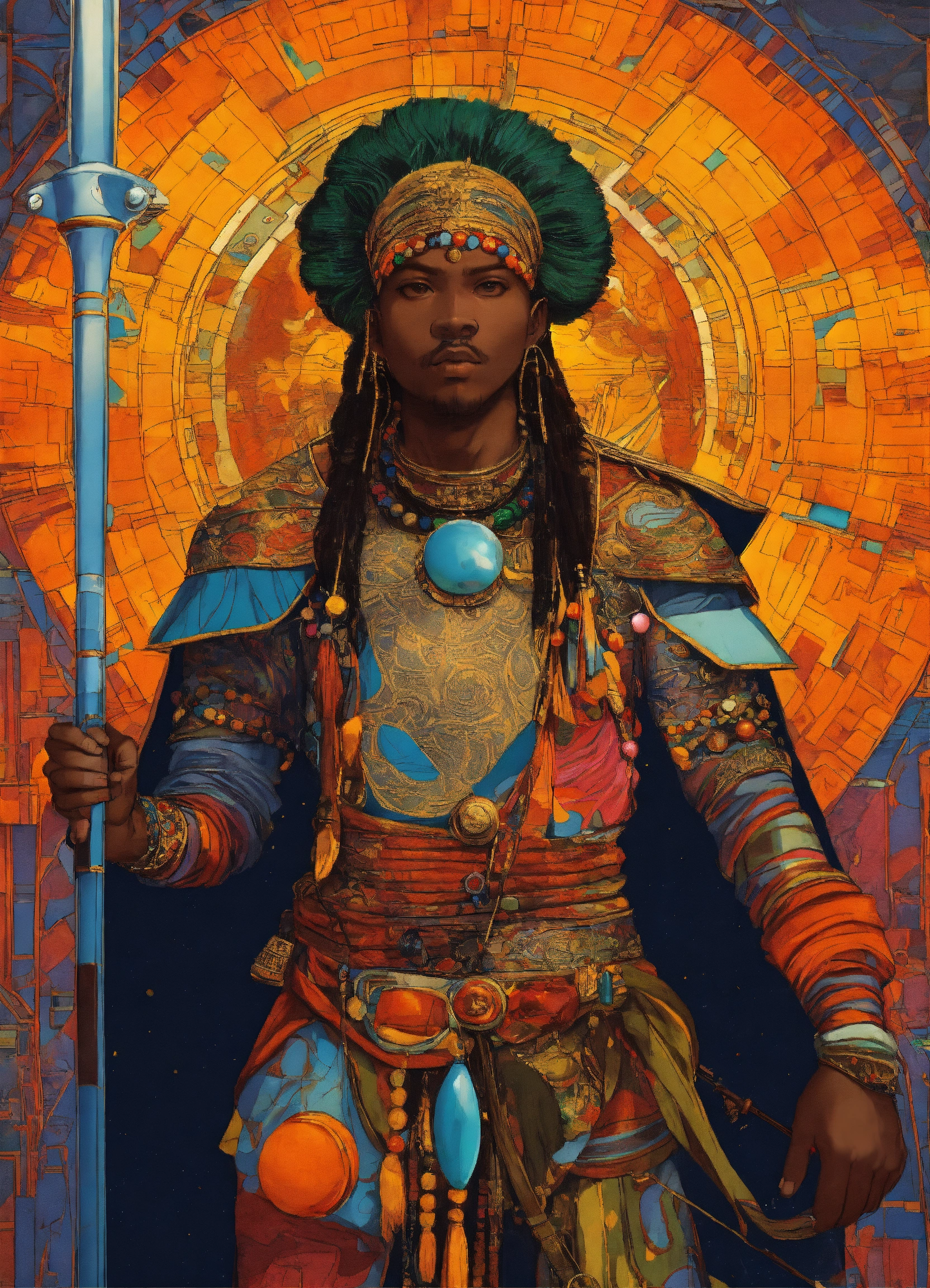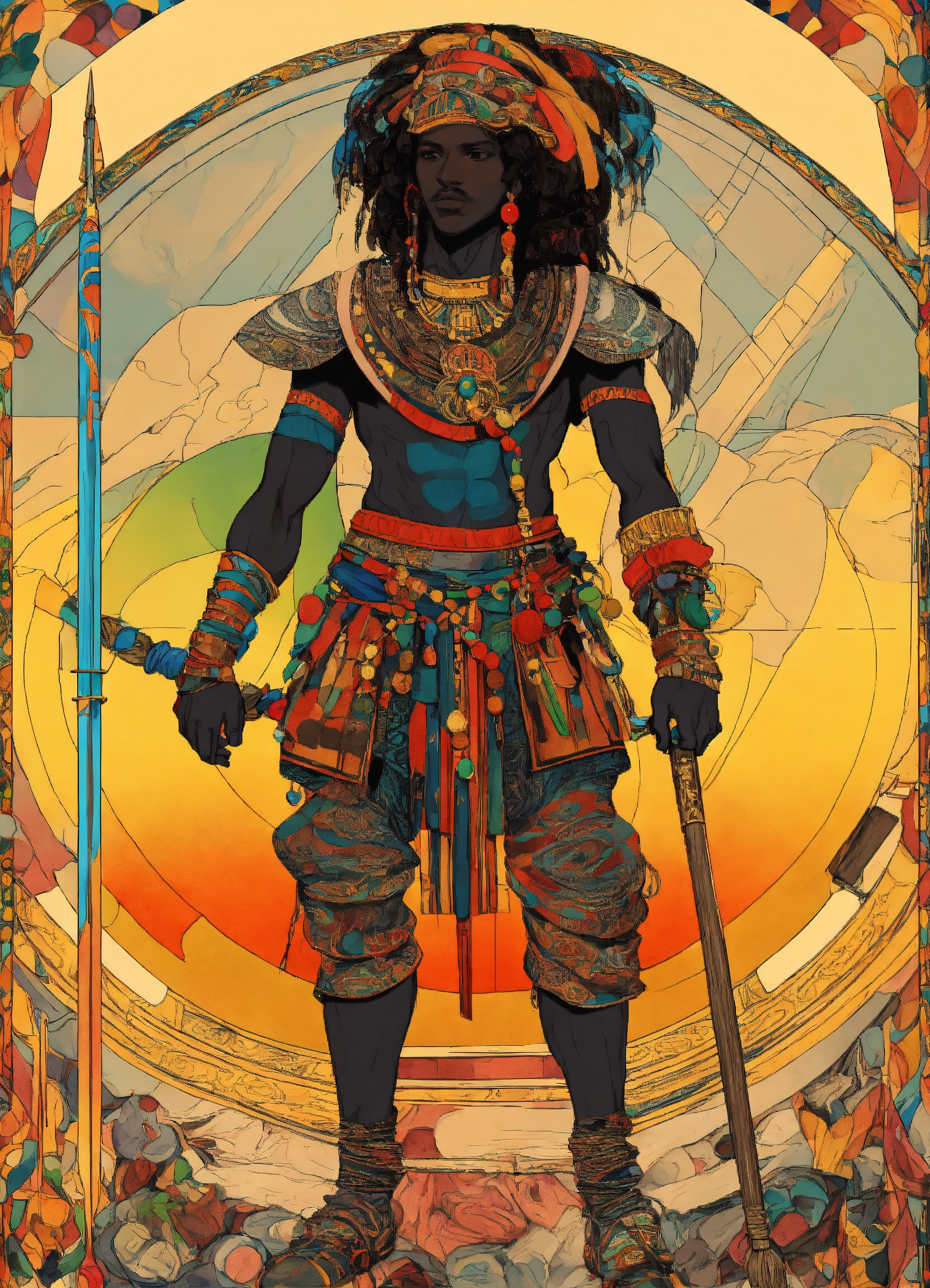 African baroque, leonardo da vinci, caravaggio design, style, i, masai warrior with spear and colorful beads in the style of 90's vintage anime, surrealism, akira style. detailed line art. fine details. inside a space ship.