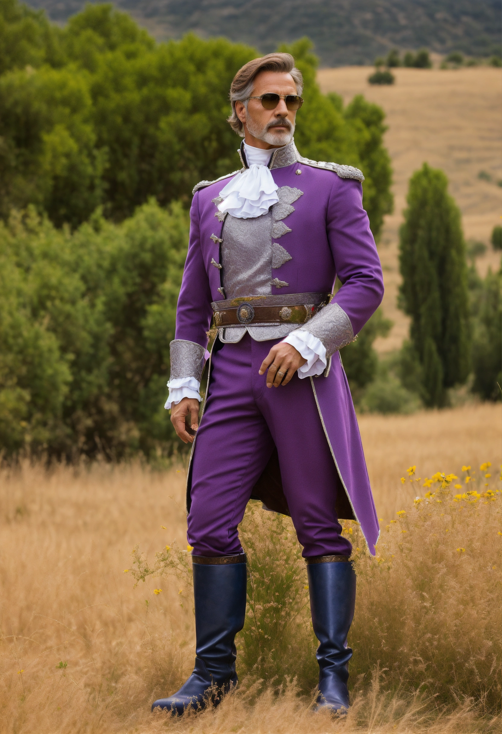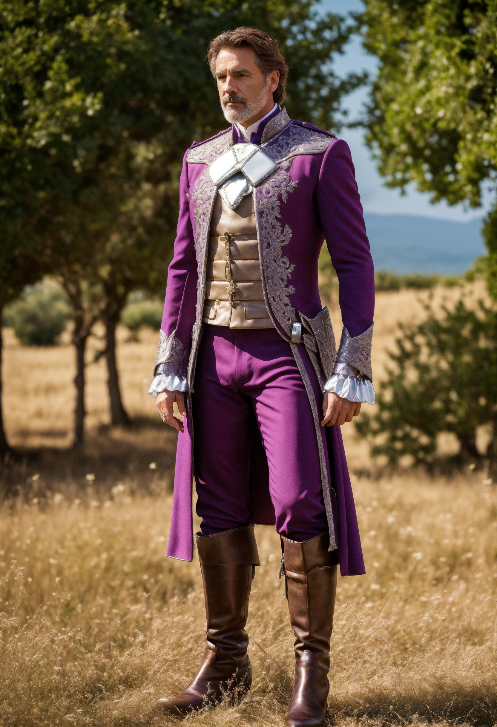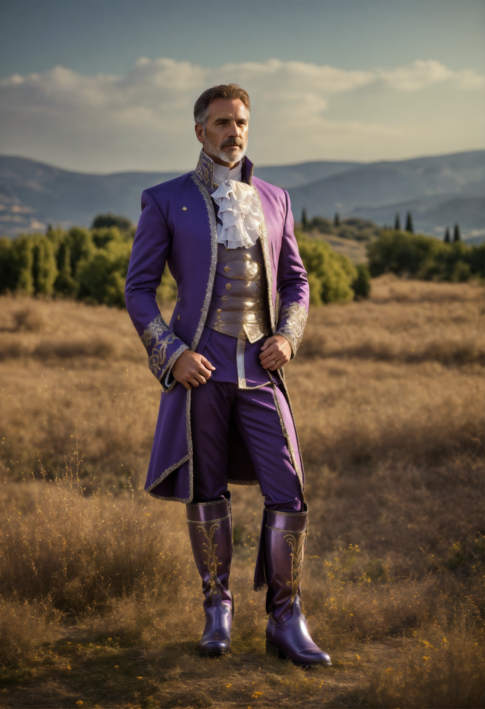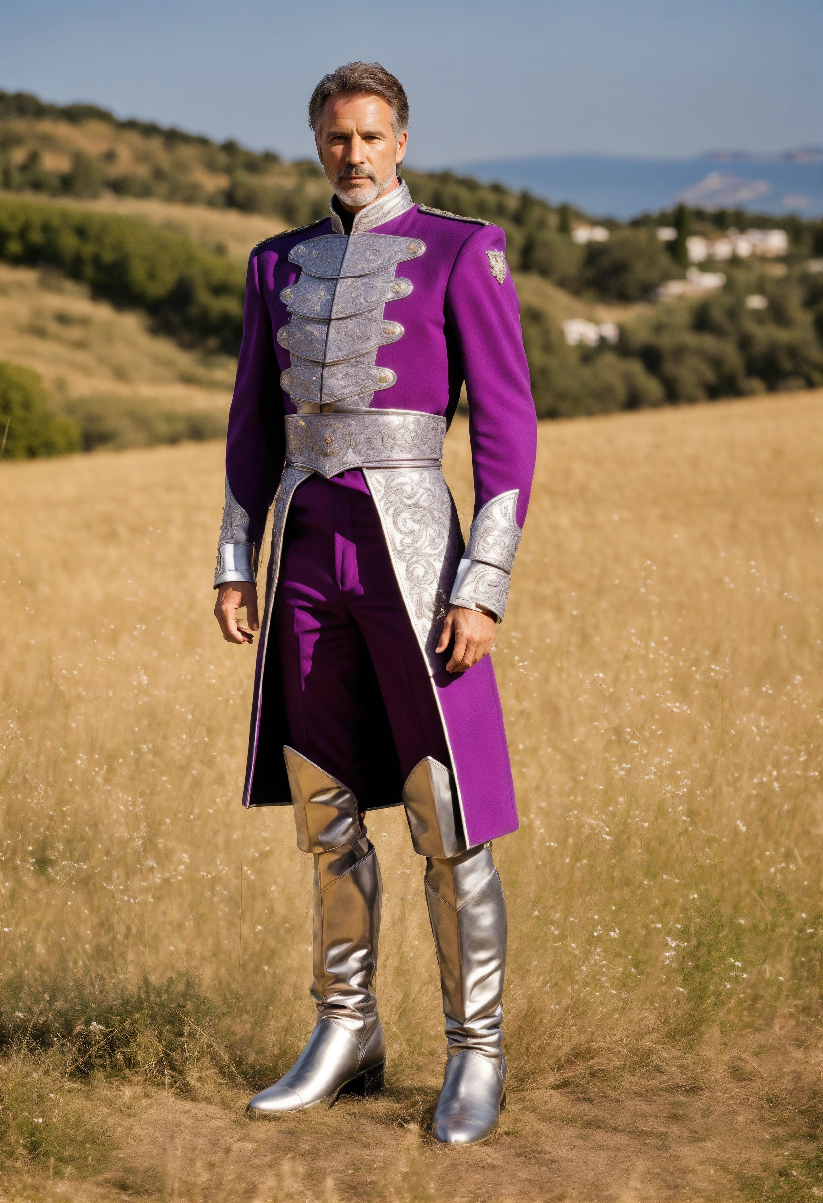 Highly detailed full body of a futuristic aristocrat, royalty, purple and silver outfit and boots, light brown hair, standing in a field on a summer day in greece, male, handsome, 48 years old, highly detailed