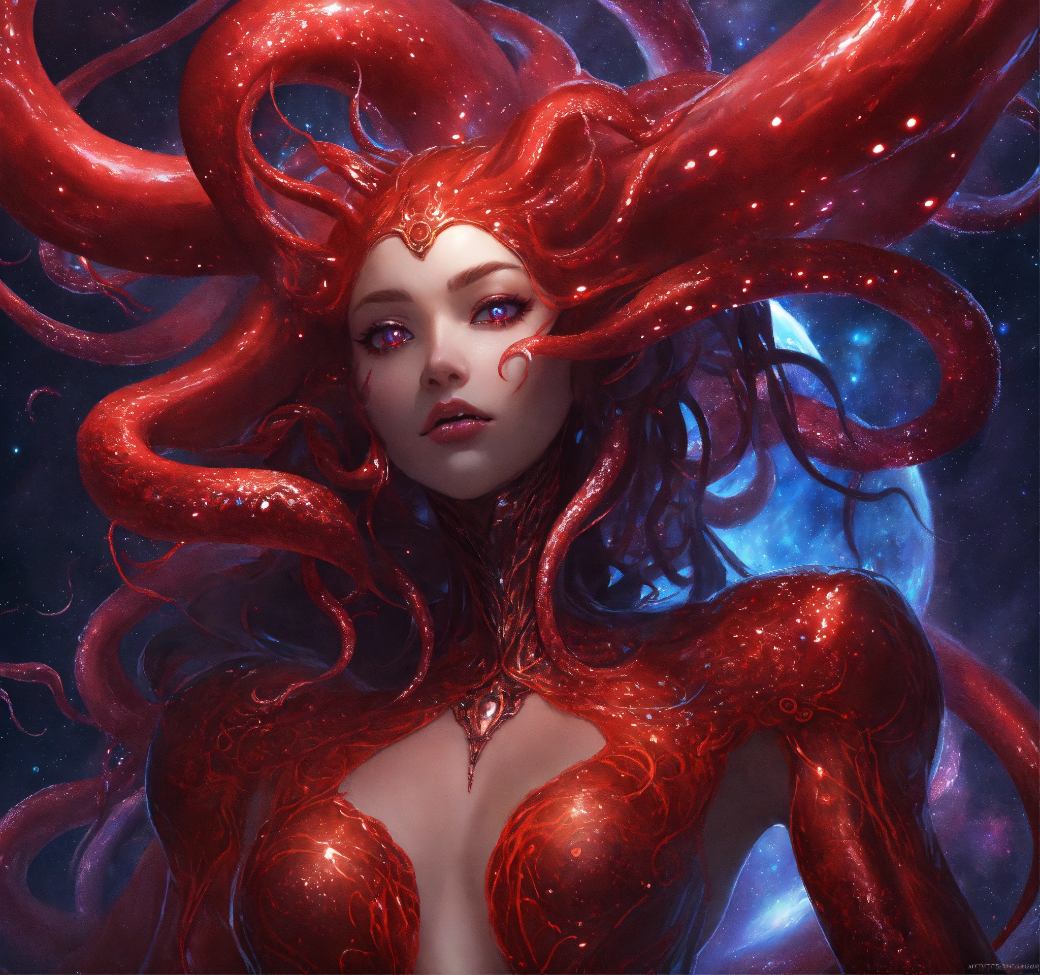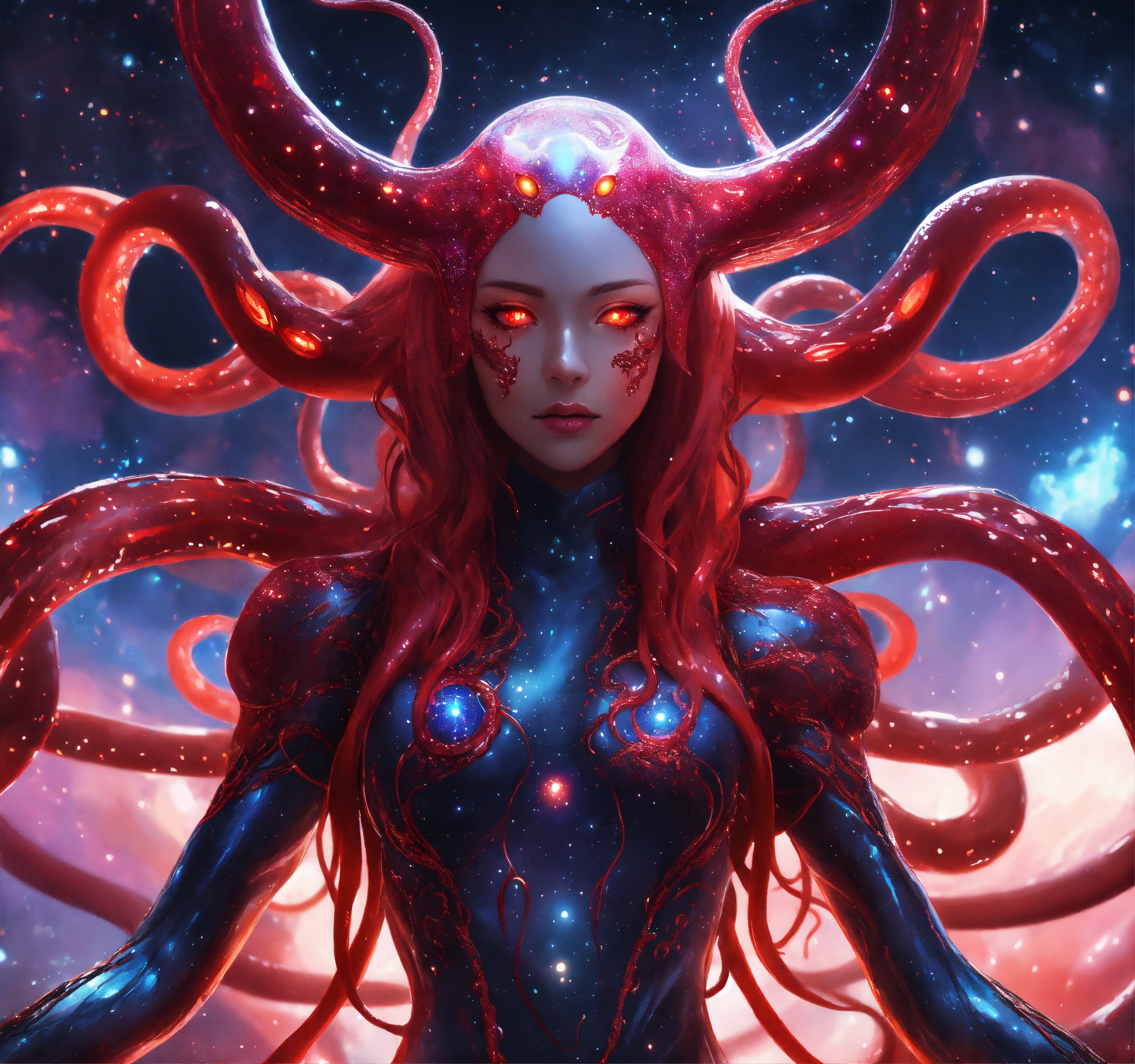 Anime, wide shot, tentacle hair, extra eyes, demonic evil venom squid alien, venom intricate, tentacle hair, red intricate glowing eyes, venom, cosmic goddess, suit made out of stars and galaxies and cosmic energy, highly detailed, digital painting, artstation, concept art, smooth, sharp focus, illustration, artgerm, 8 k