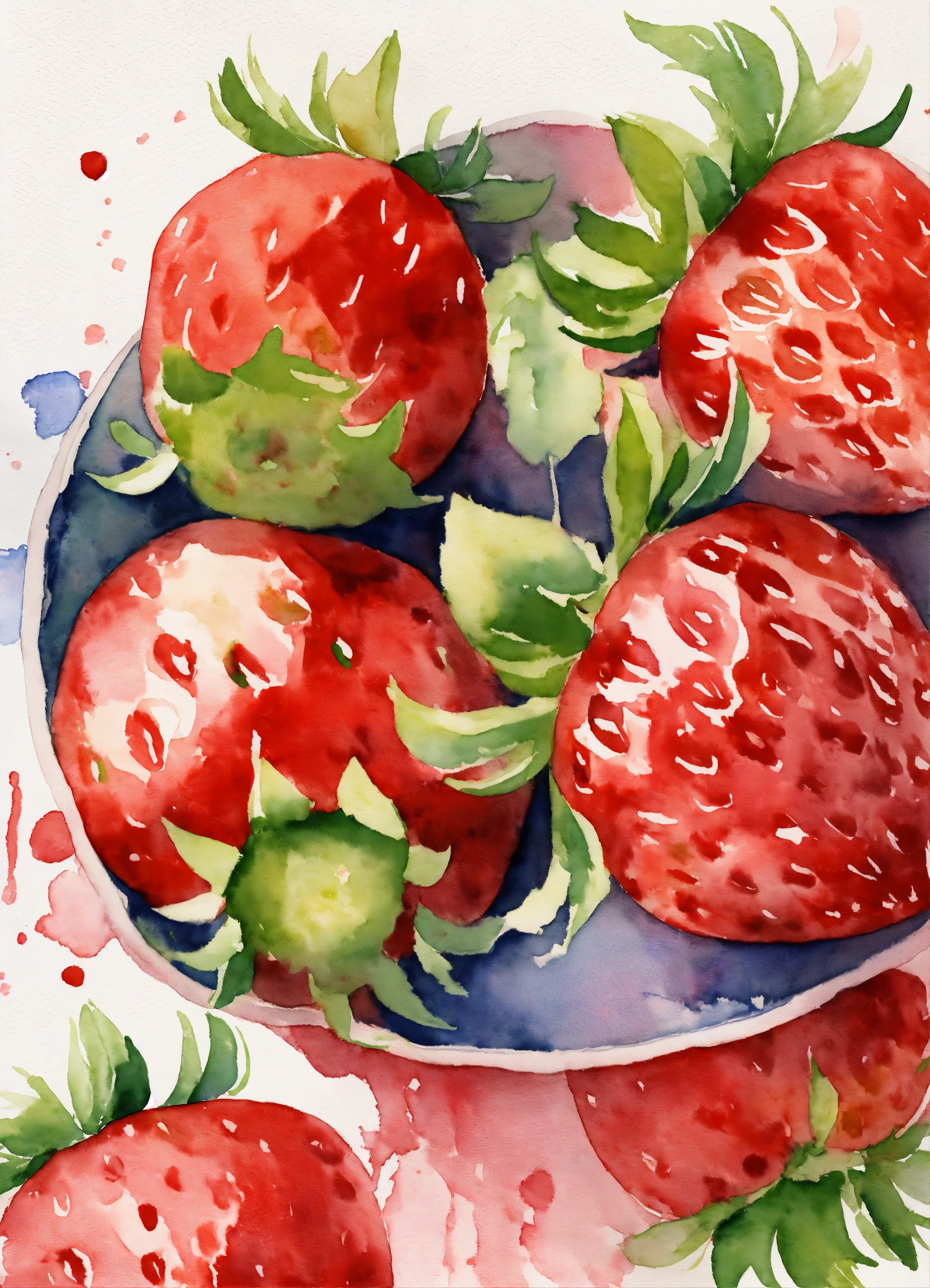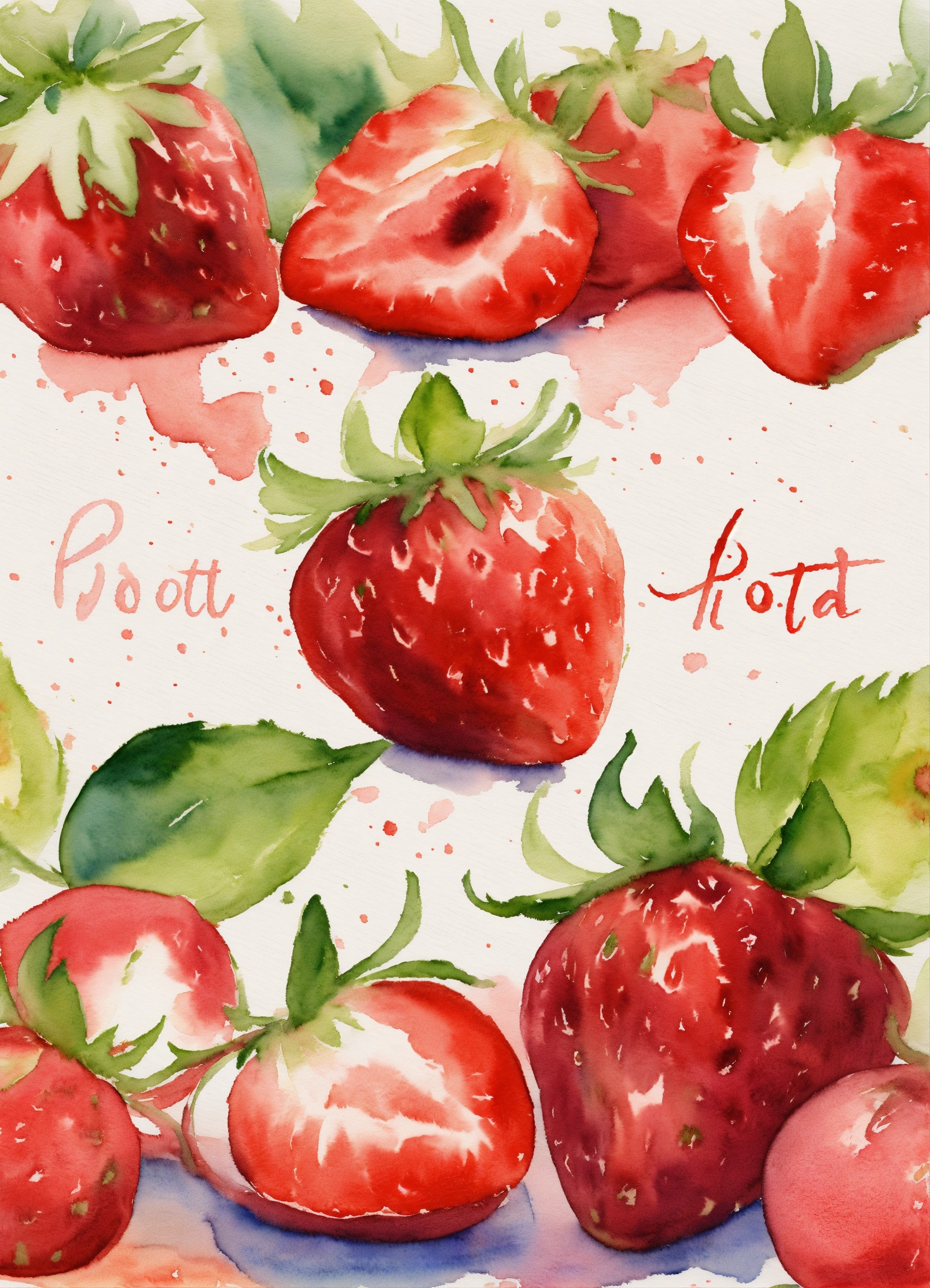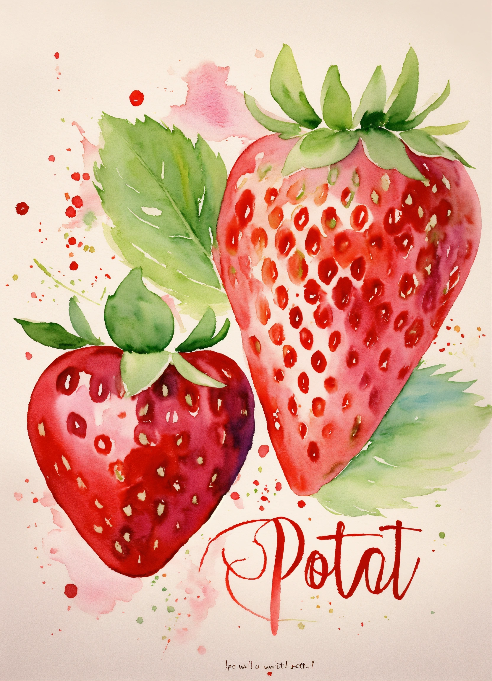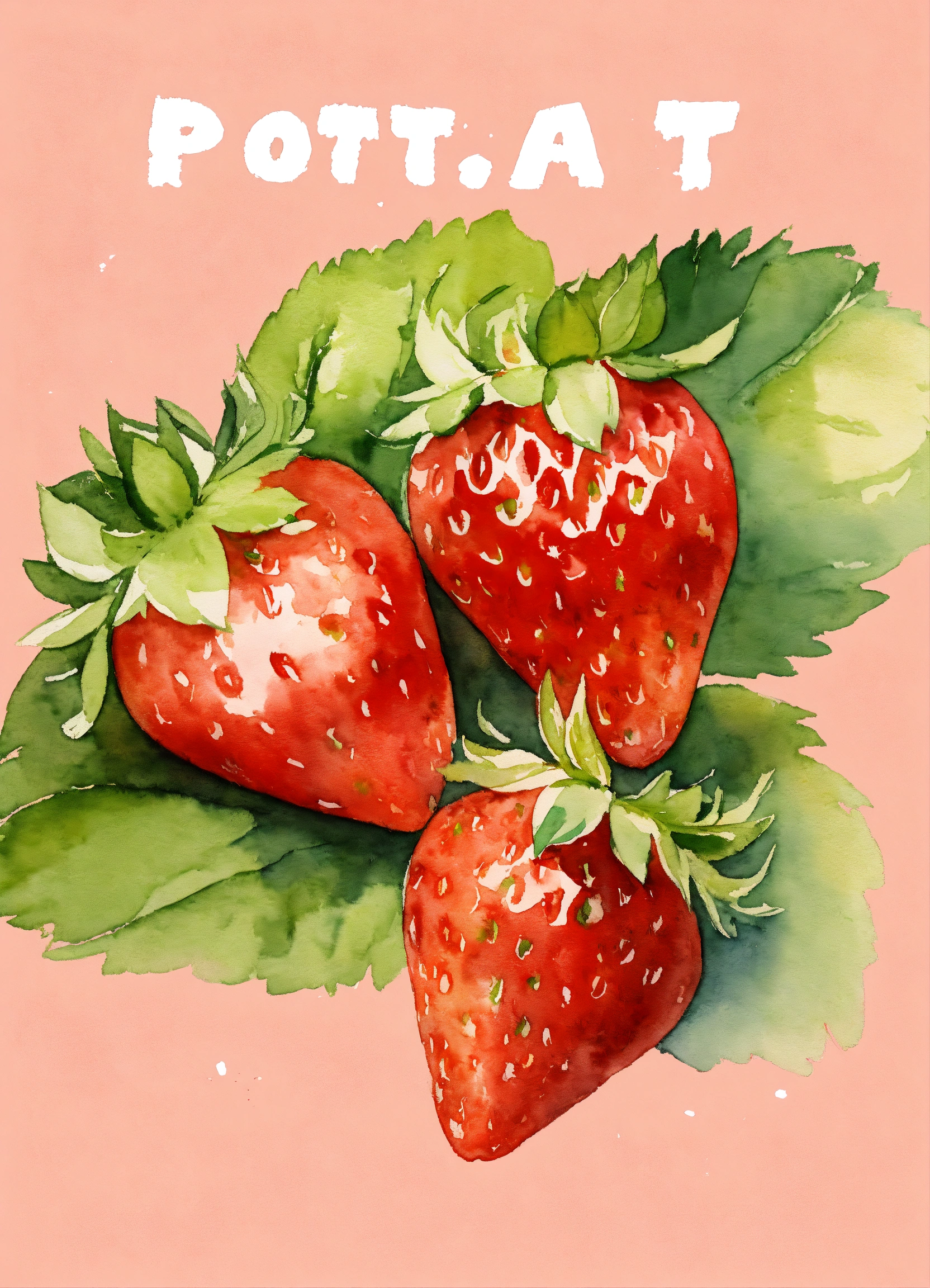 A simple watercolor cute baby fraises on its side with text above that says potat with white background