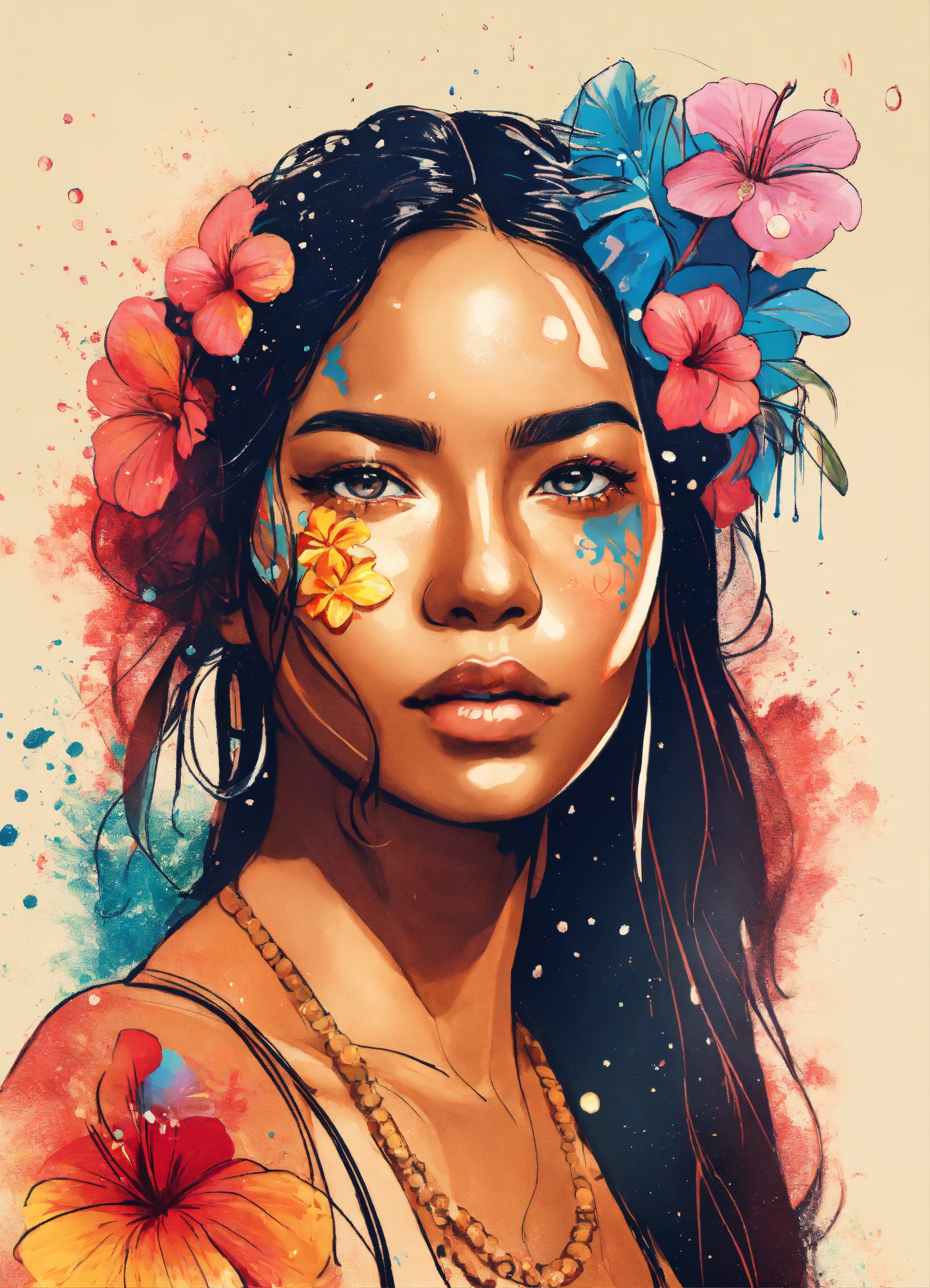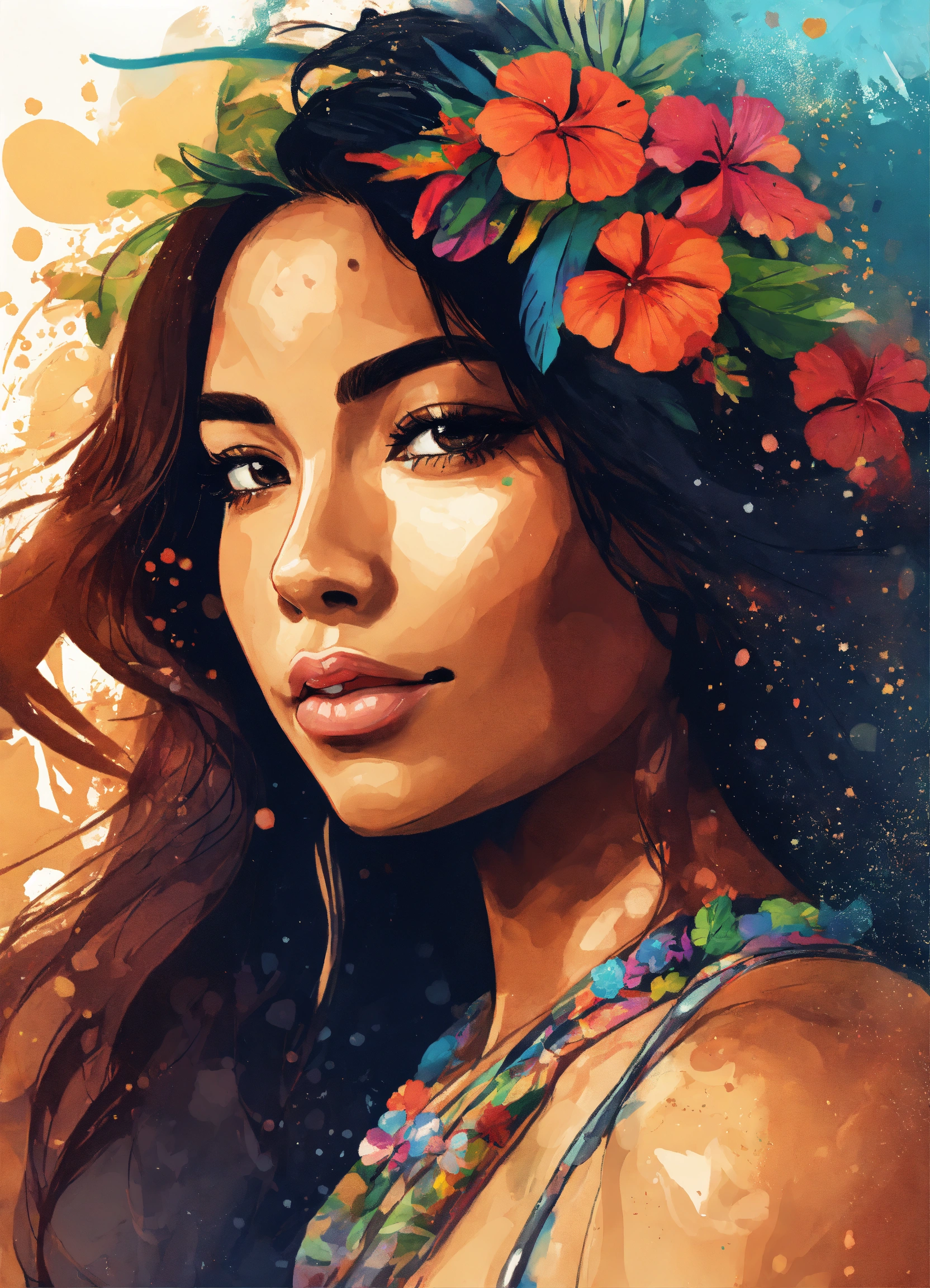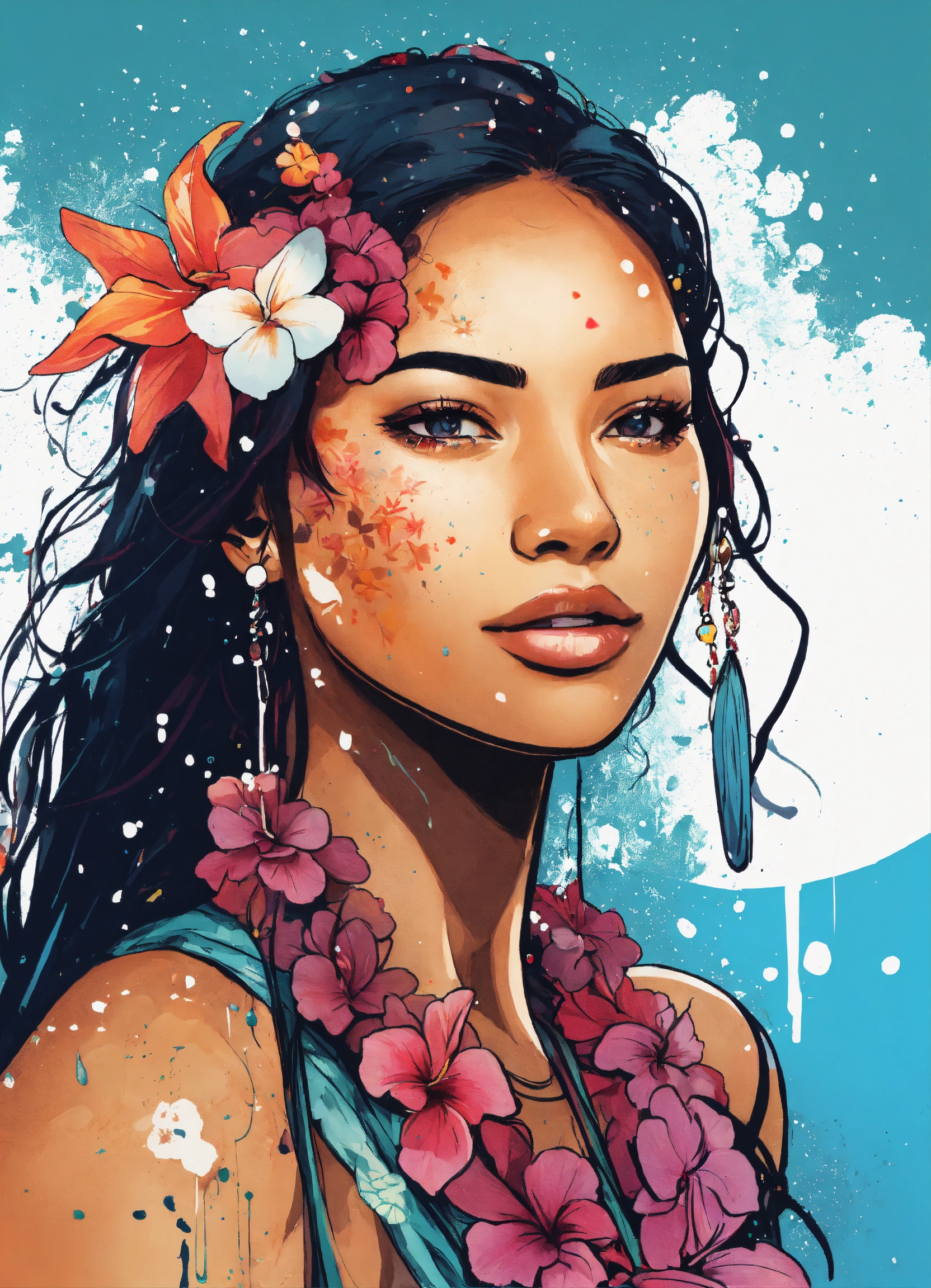 Beautiful hawaiian woman vector style 8k graffiti with pencil and droplets on face