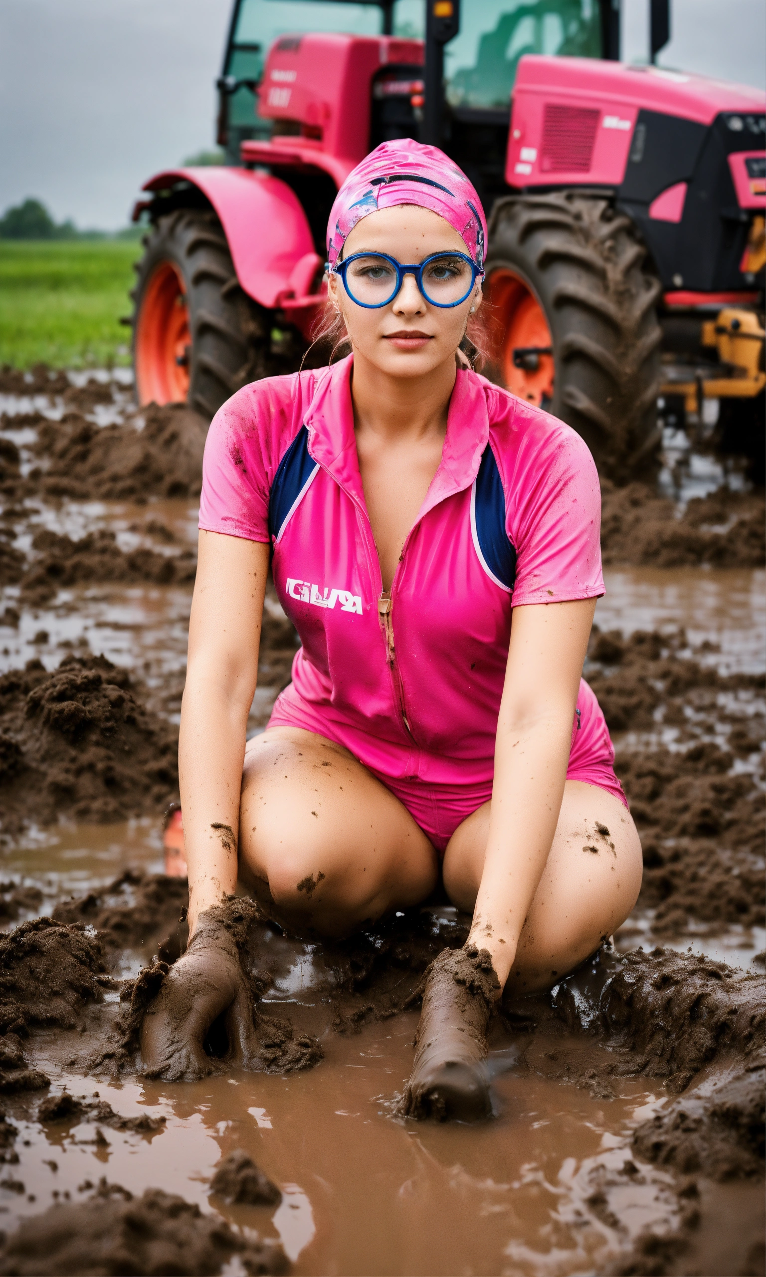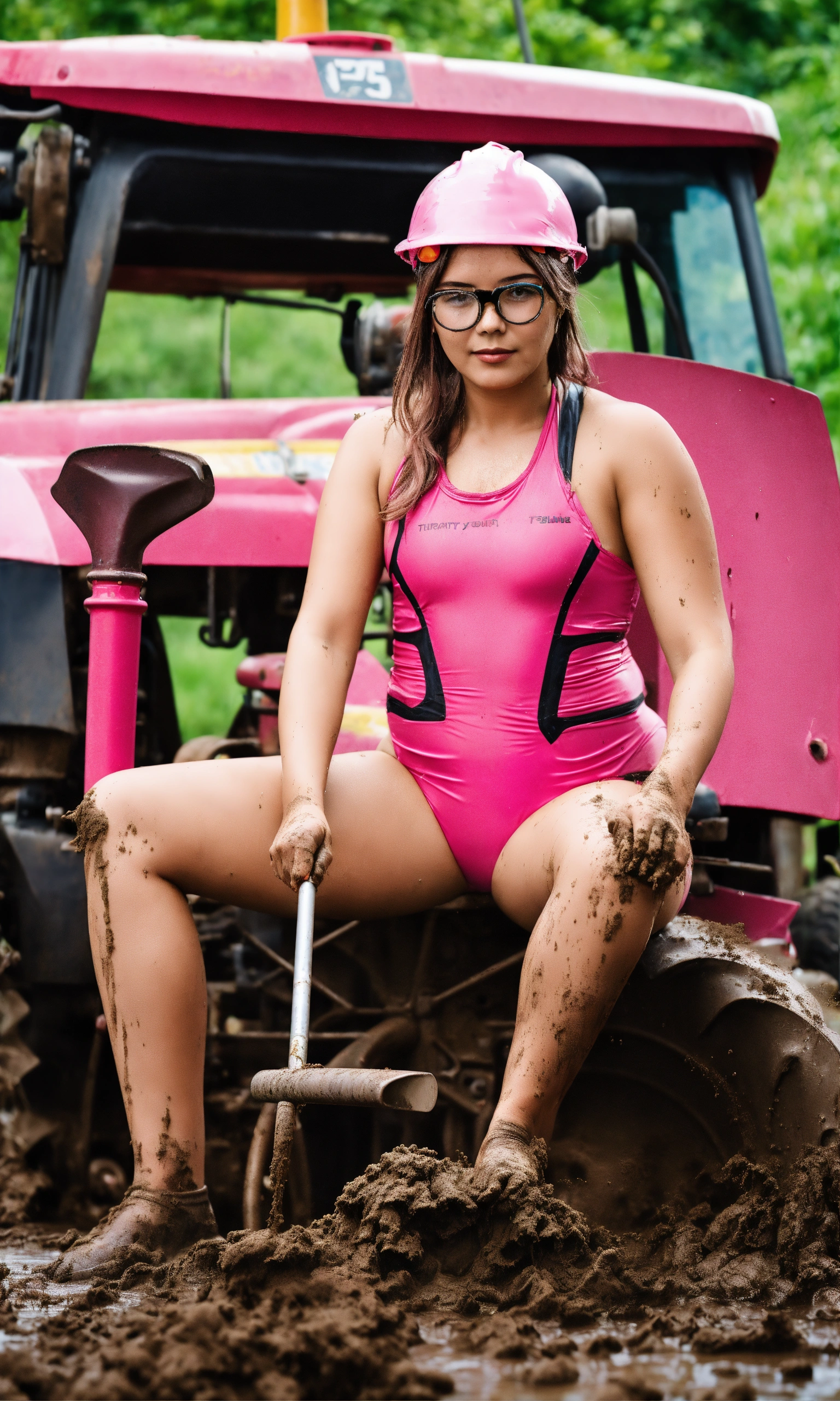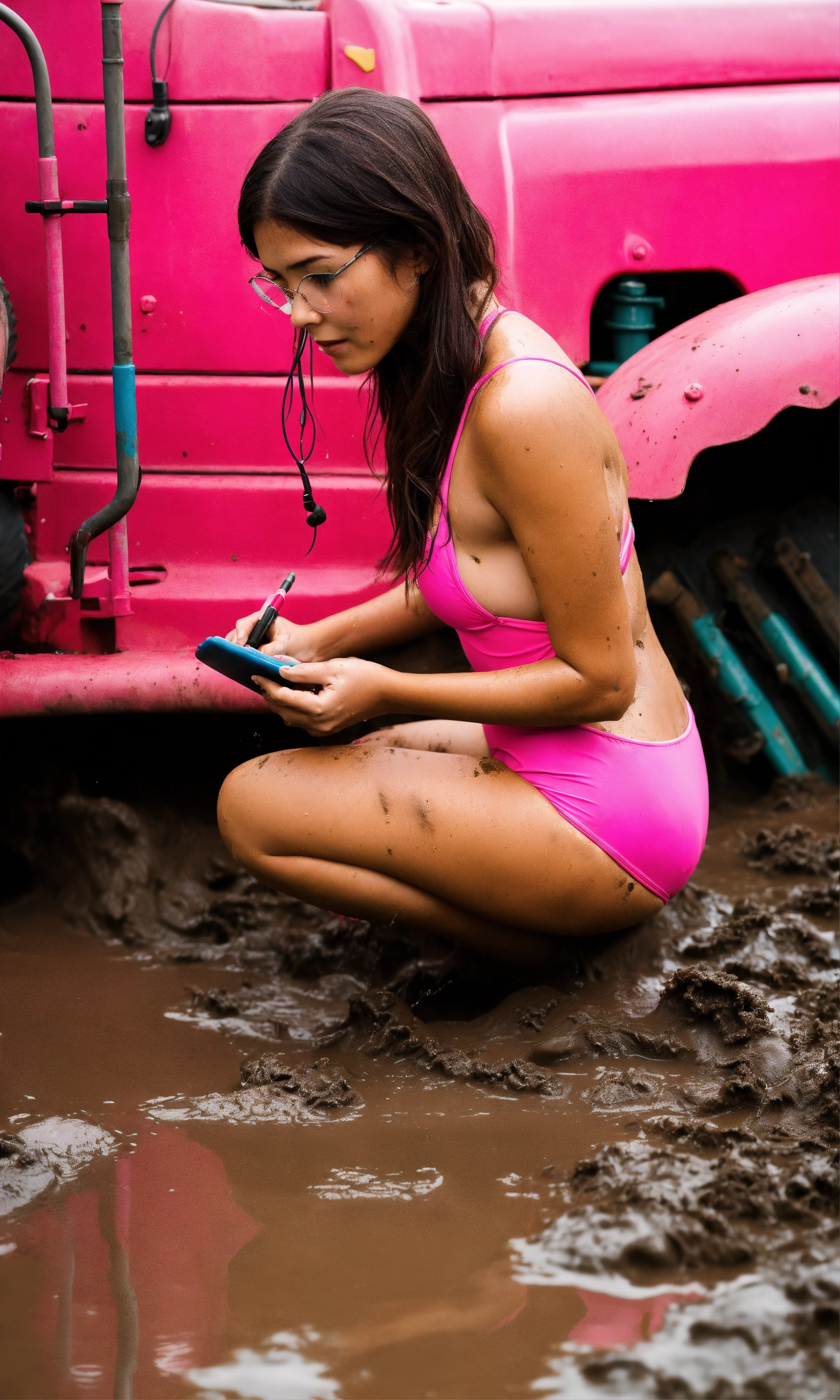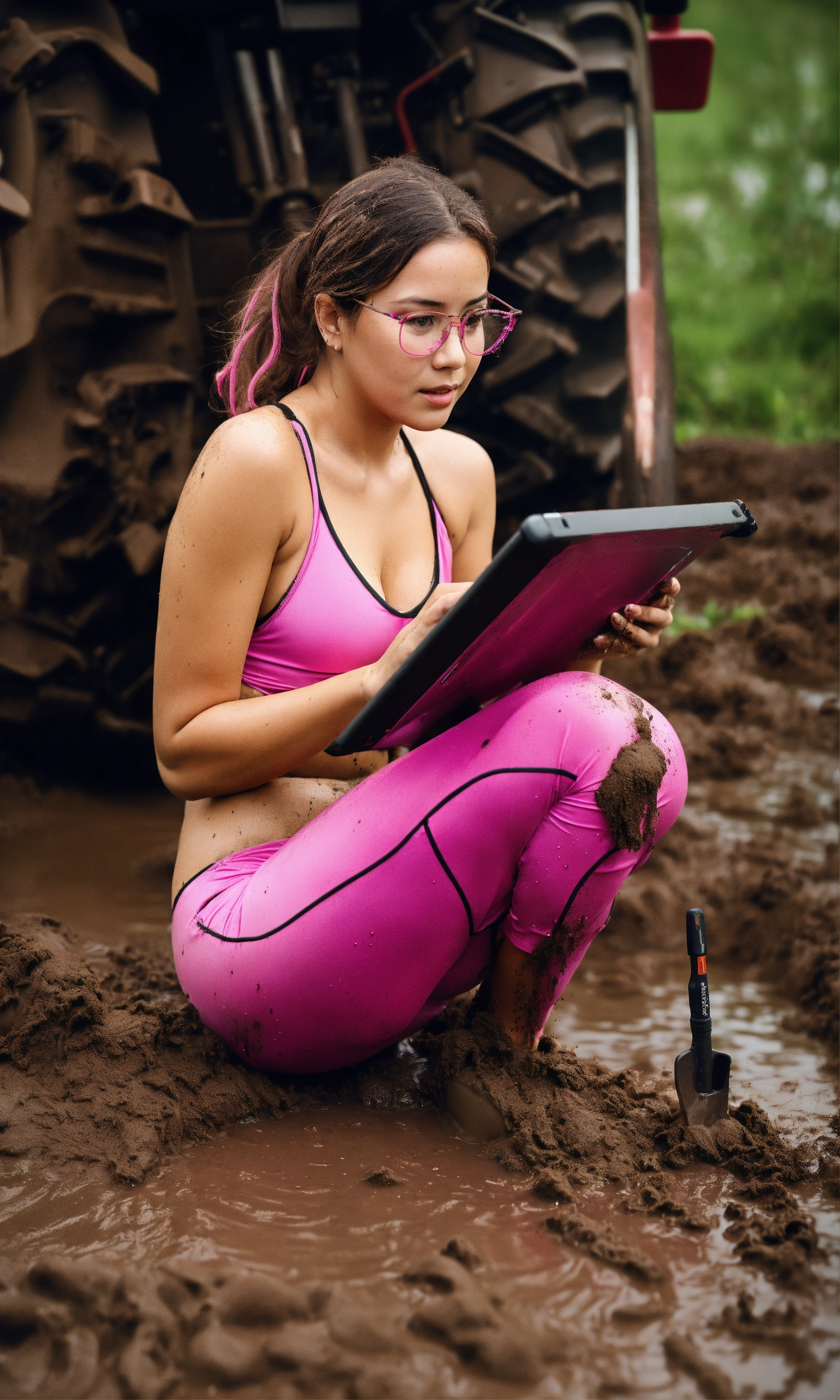 25 years old lady in a pink swimming suit and round glasses dirty in mud fixing with a set of tool broken tractor and making record into tablet pc