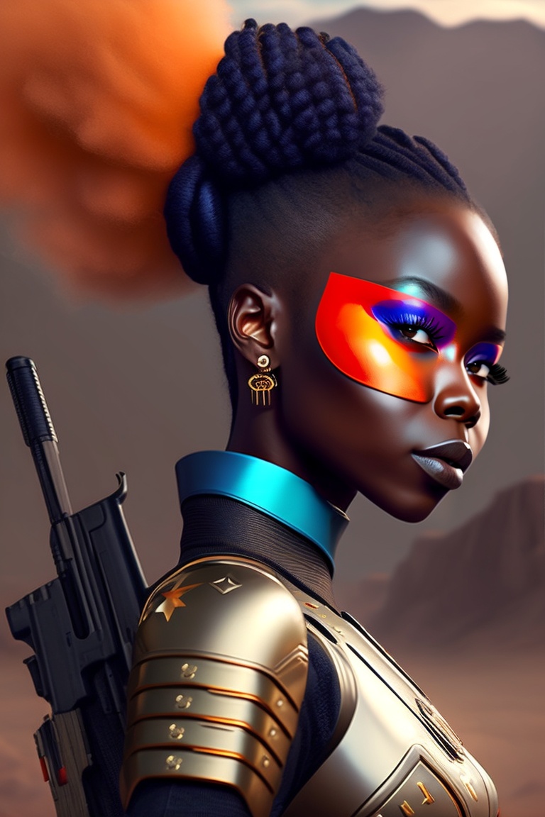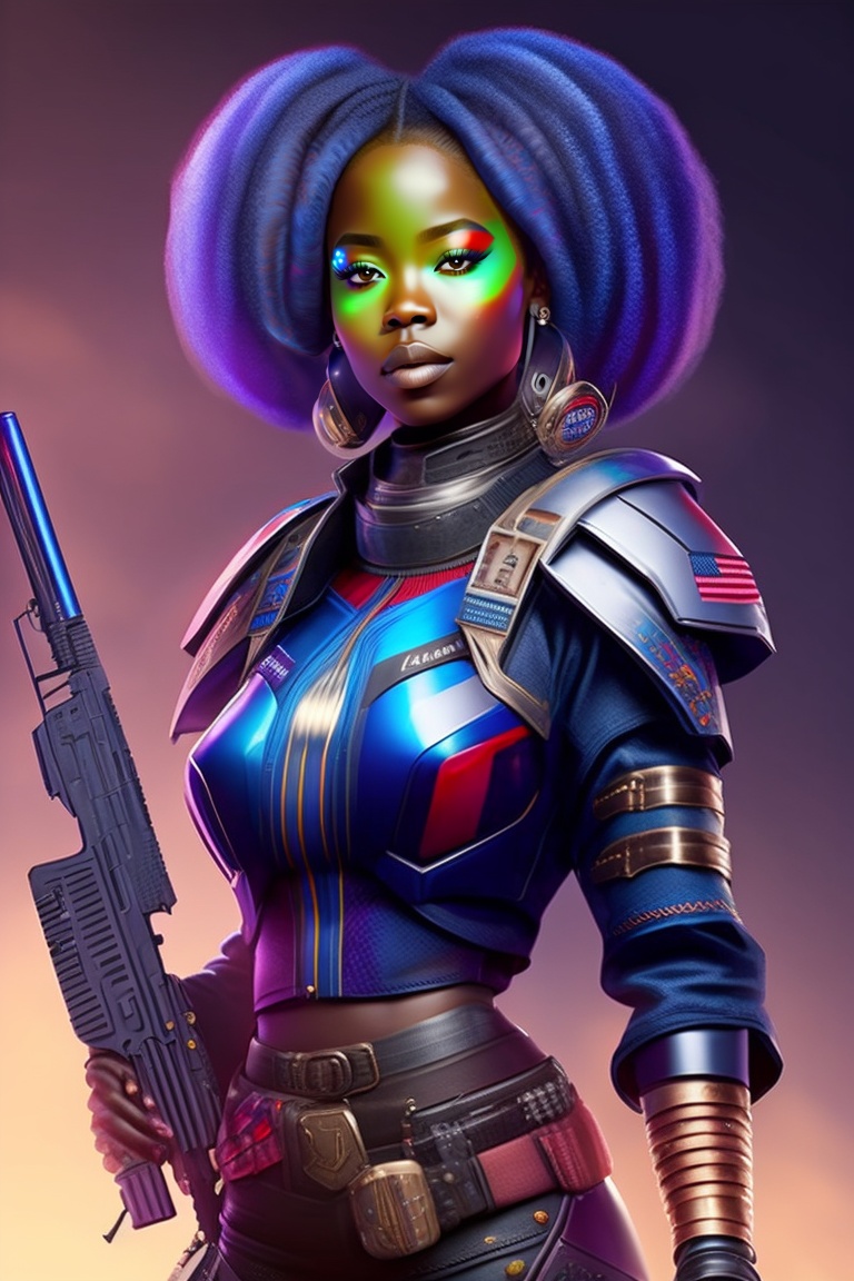 African android looking girl, covered in war paint, holding two western pistols, fighting of america looking bots