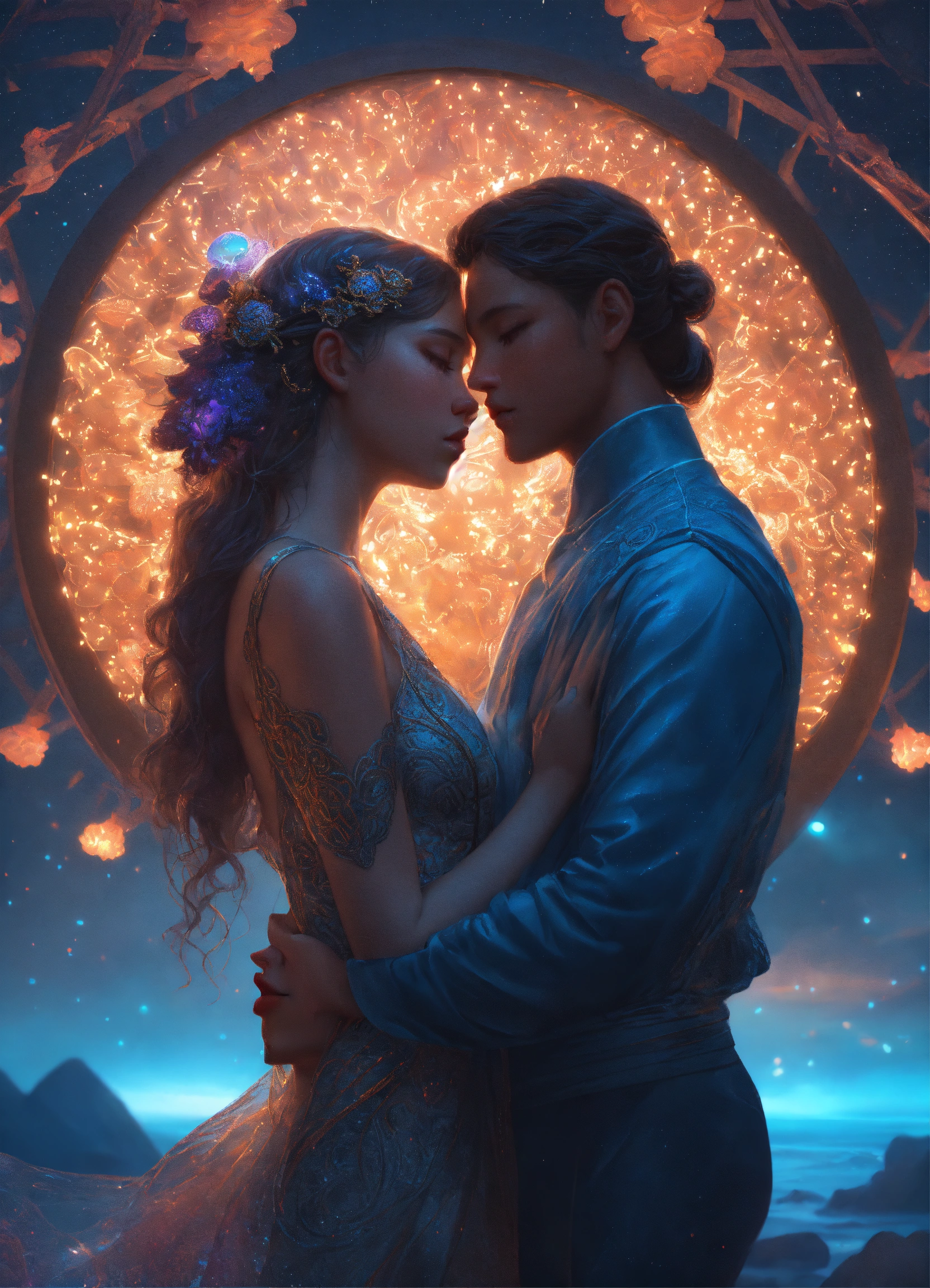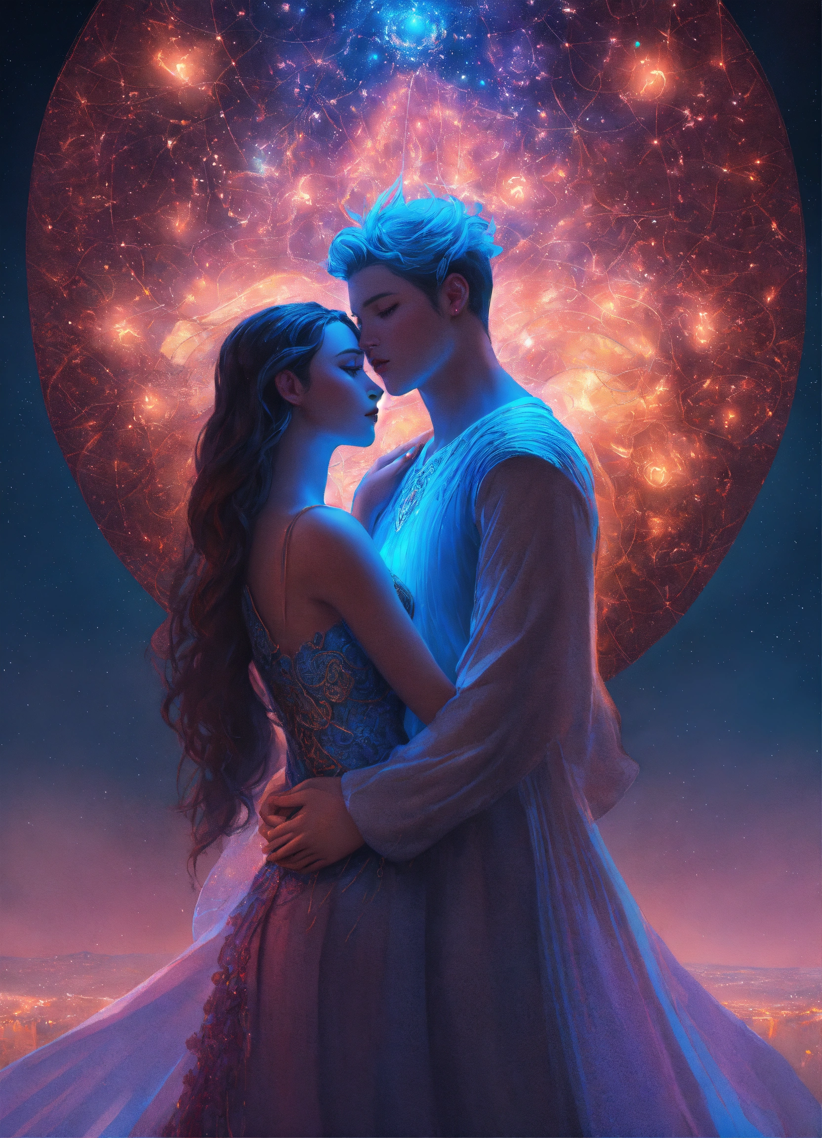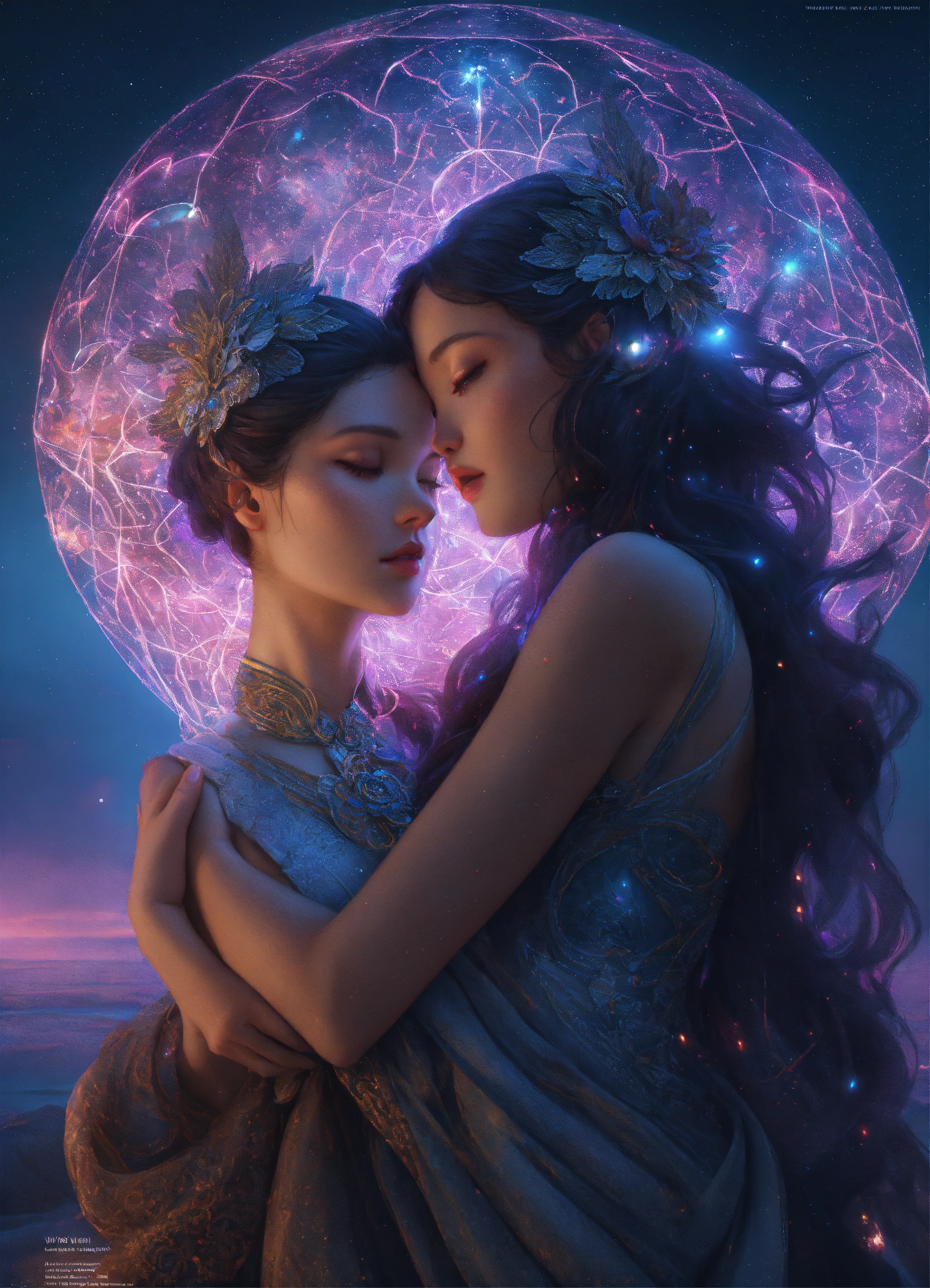 Passionate embrace, tower goddess, two, intricate fashion, primordial, by wlop and mandy jurgens, surrounded by the night sky, universe, intricate, elegant, scenic, hyper-realistic, 8k resolution, maximalist intricate, sci-fi, 3d render, ethereal, divine starry jellyfish, starlight, mythical, gorgeous fantasy, intricate and ornate details, full body, realistic, digital painting, artrender, intricate dreamy artwork, hyperwave, concept art portrait by casey weldon, fantasy concept art, 8k resolution, bioluminiscent, intricate artwork by tooth wu and wlop and beeple. octane render, greg rutkowski, very coherent symmetrical artwork, cinematic, diversity, mythology, soft embrace