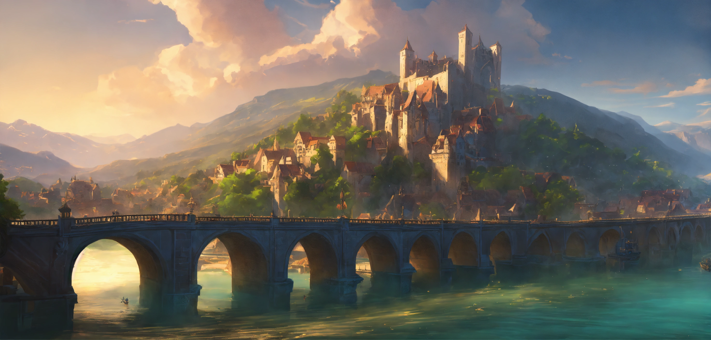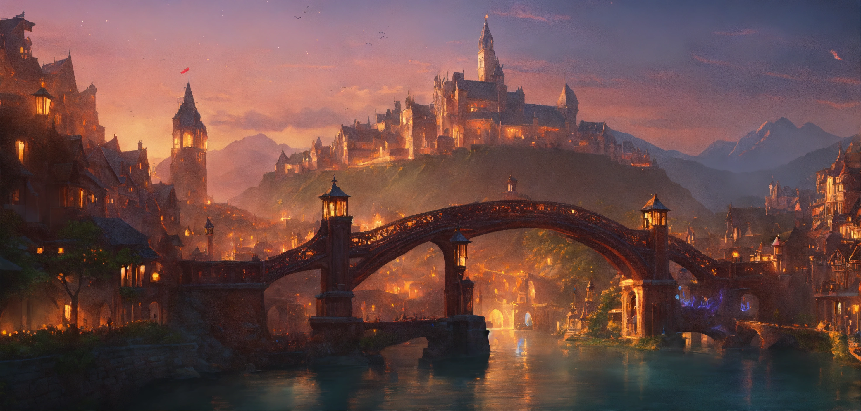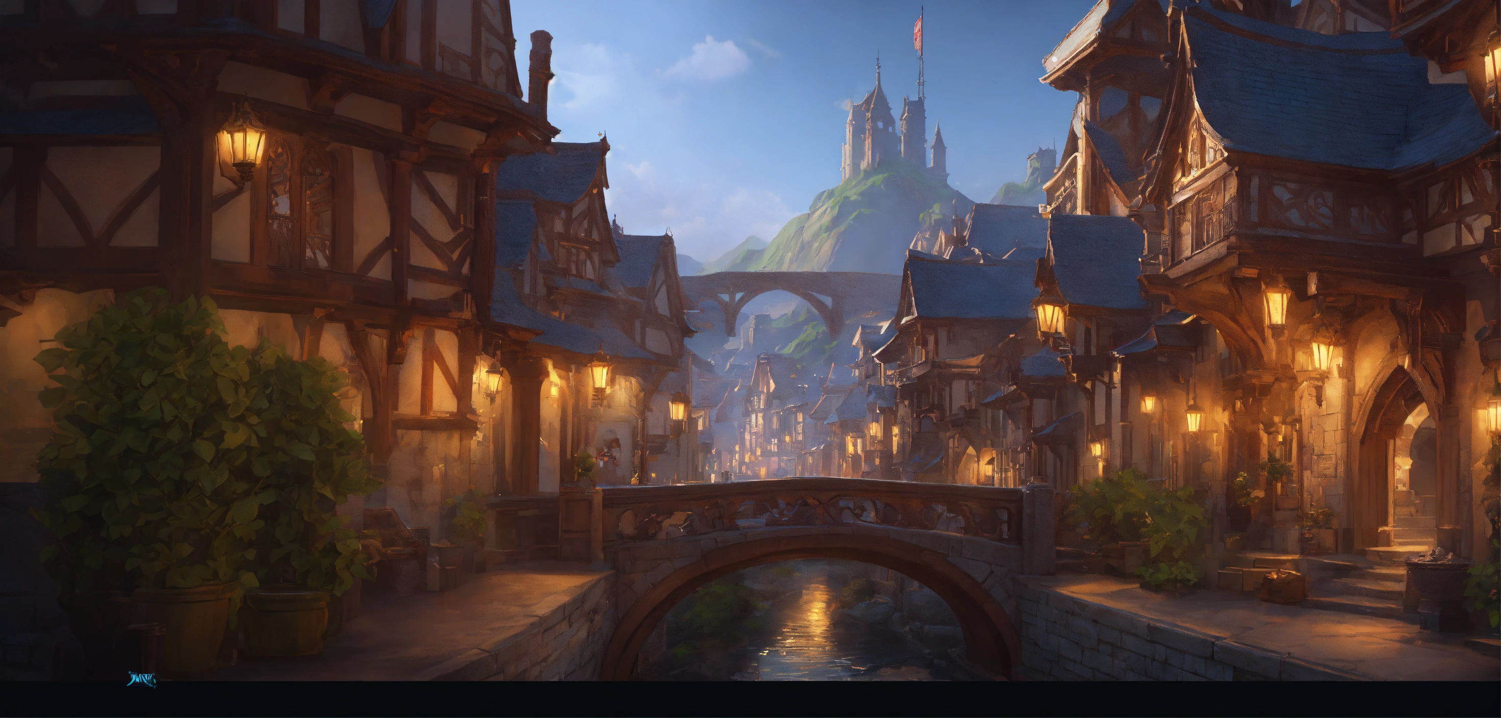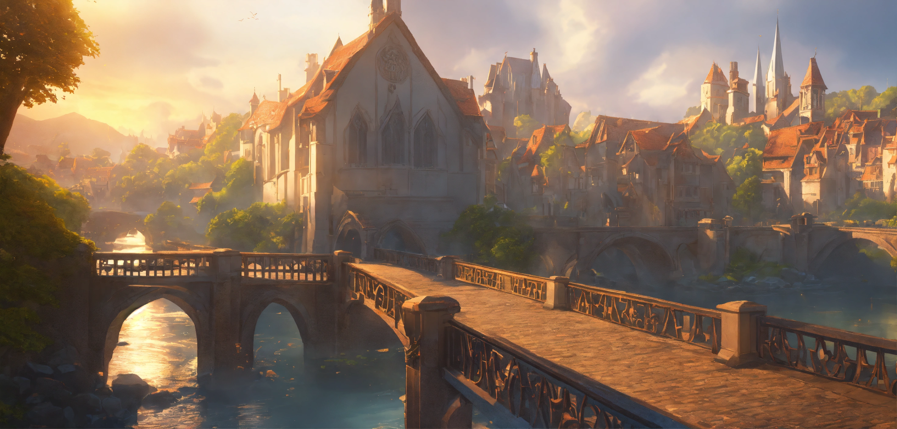 A highly detailed league of legend dynamic illustration of fantasy bridge with medieval city, by joshua raphael, by artgerm, by huyy nguyen, by cj xander, by jennifer wuestling, by diep duong van, by huyy nguyen, by grafit studio, volumetric lighting, 3d render, 4k resolution, trending on artstation, masterpiece, close up frame, cinematic shot