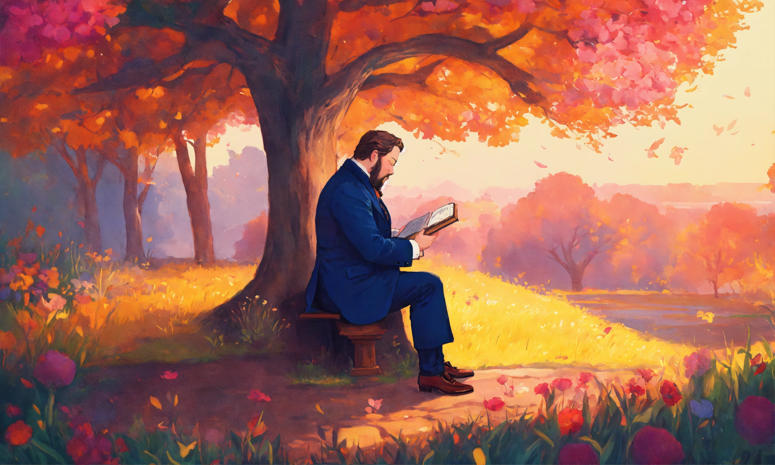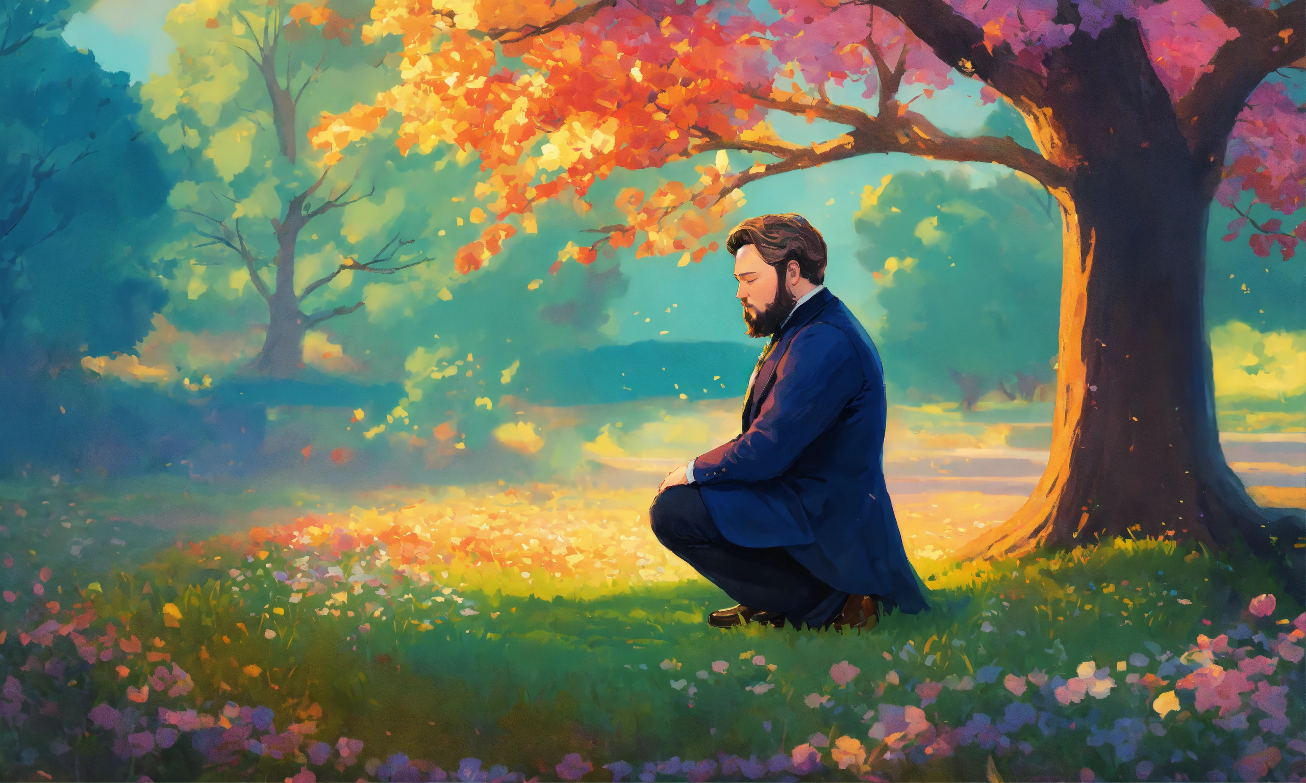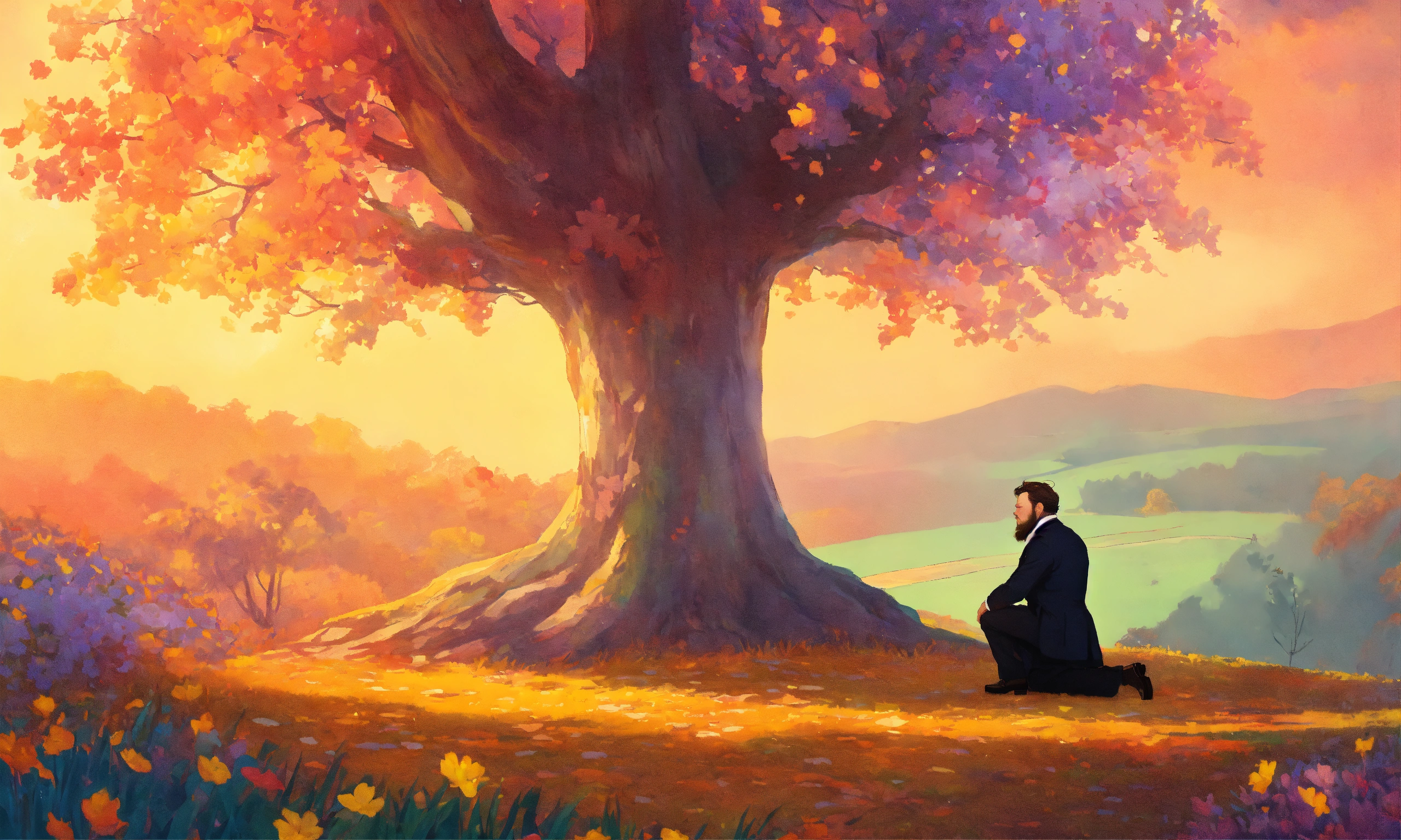 Charles spurgeon, illustration. he's depicted on his knees praying under a gorgeous colorful tree in a breathtaking garden.
