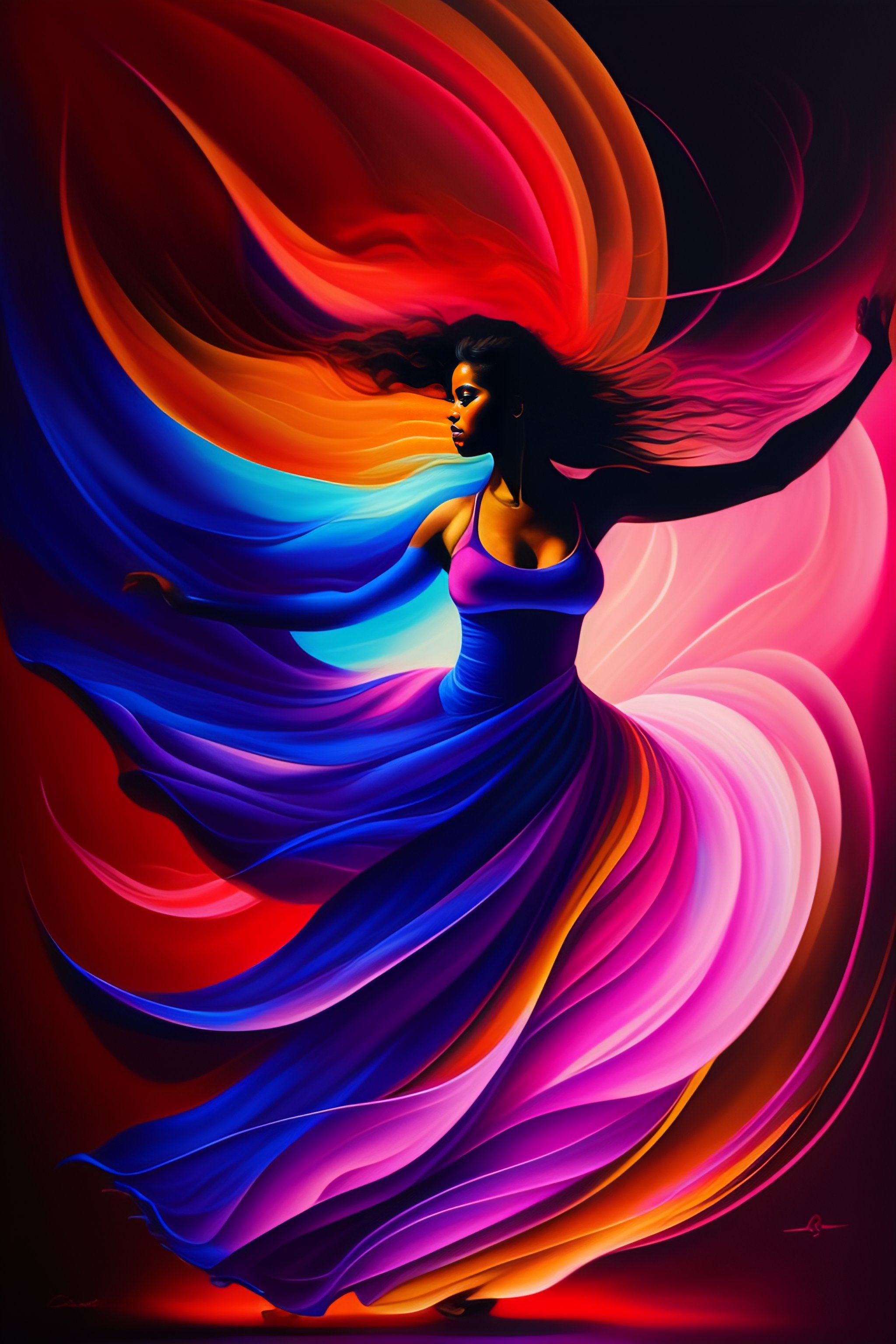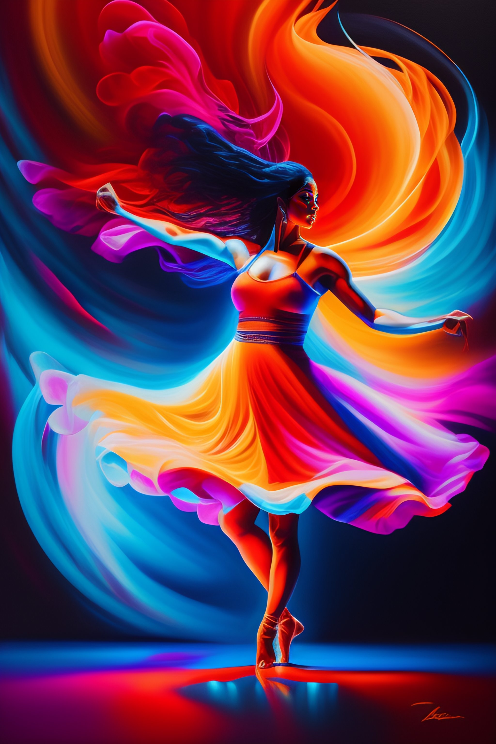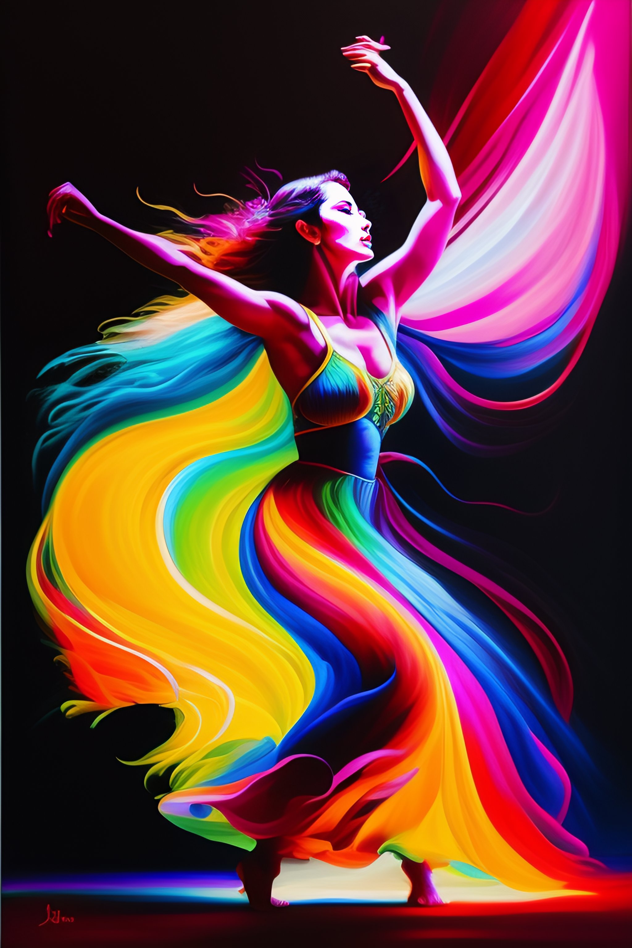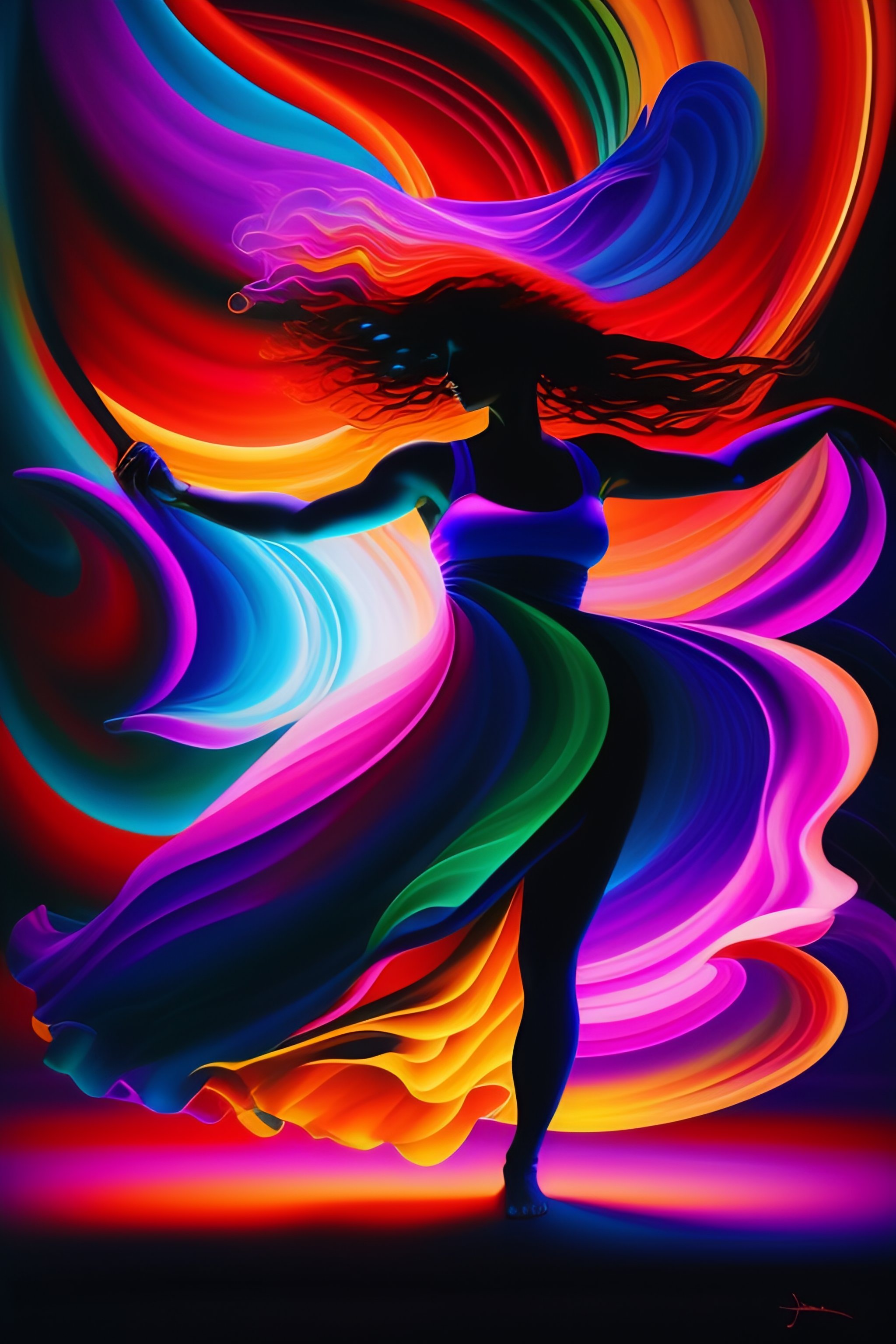 Female dancer in movement, latin dance, super abstract painting, dancing in the dark, glowing, no face