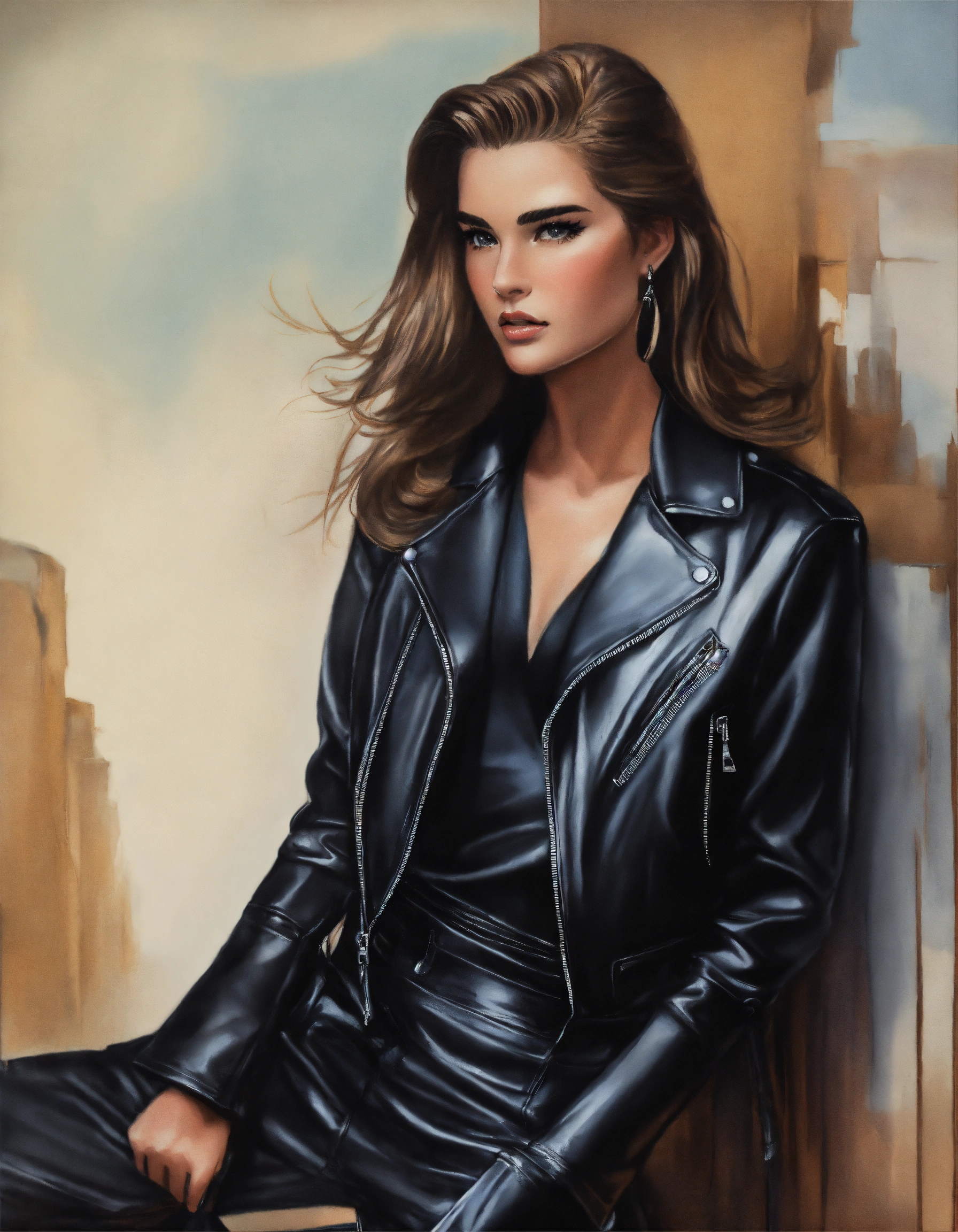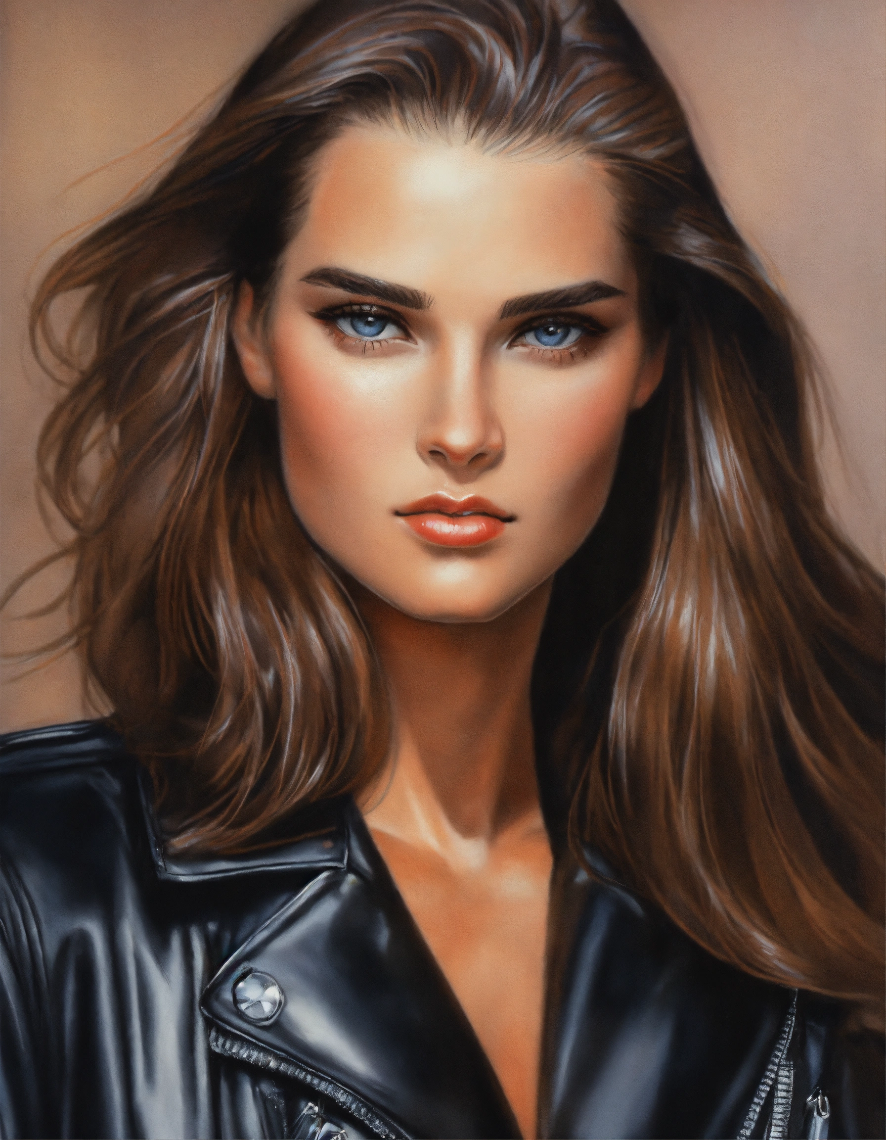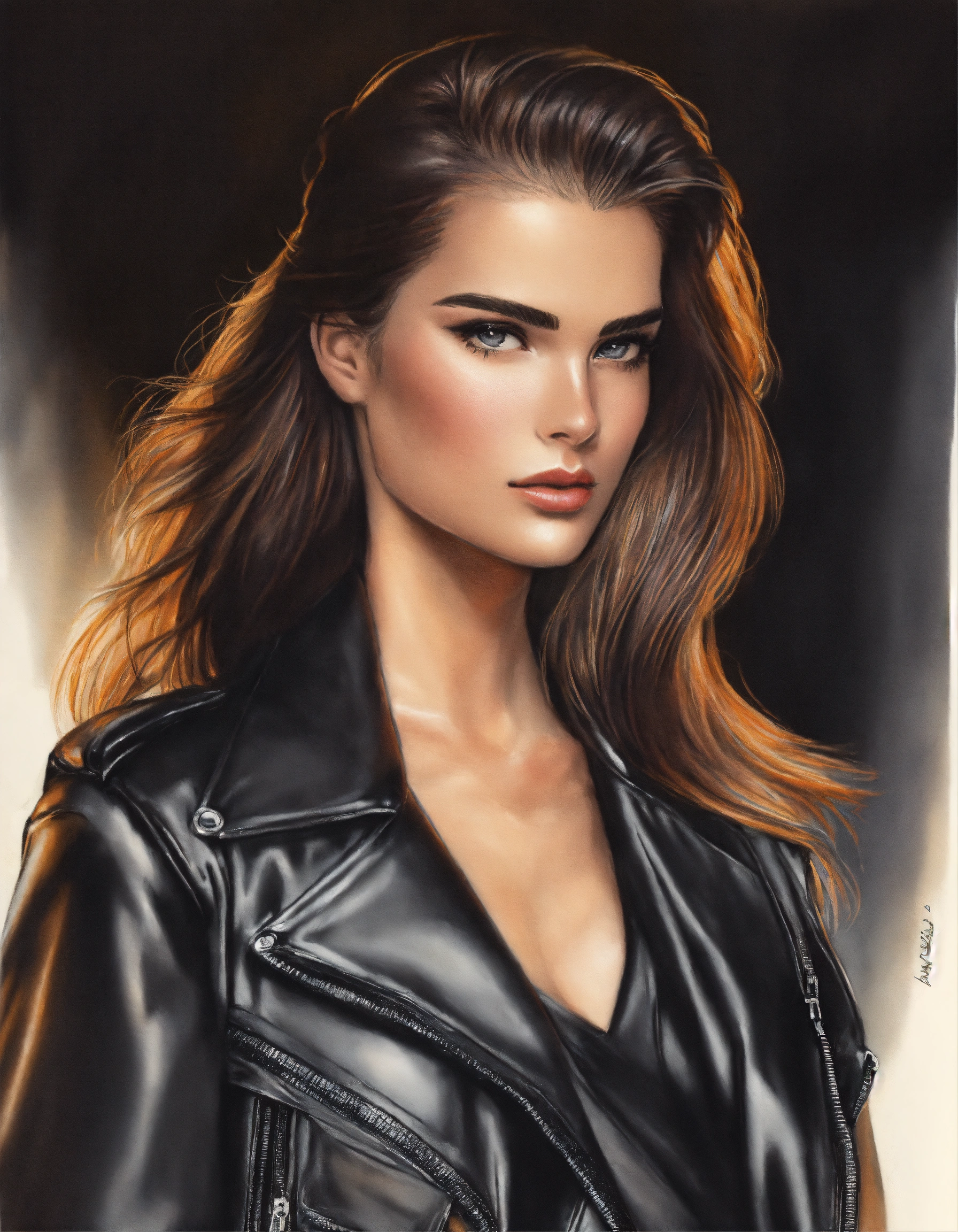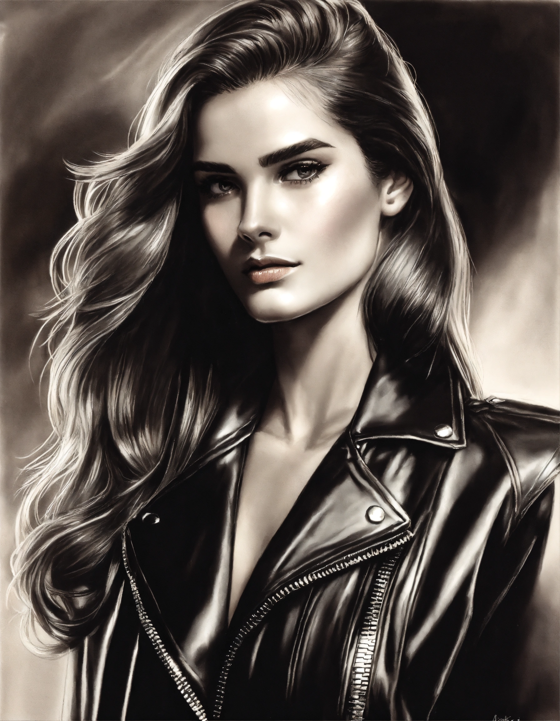 2d drawing, brooke shields, age 14. leather jacket. black moschino leather maxi dress with split. artgerm