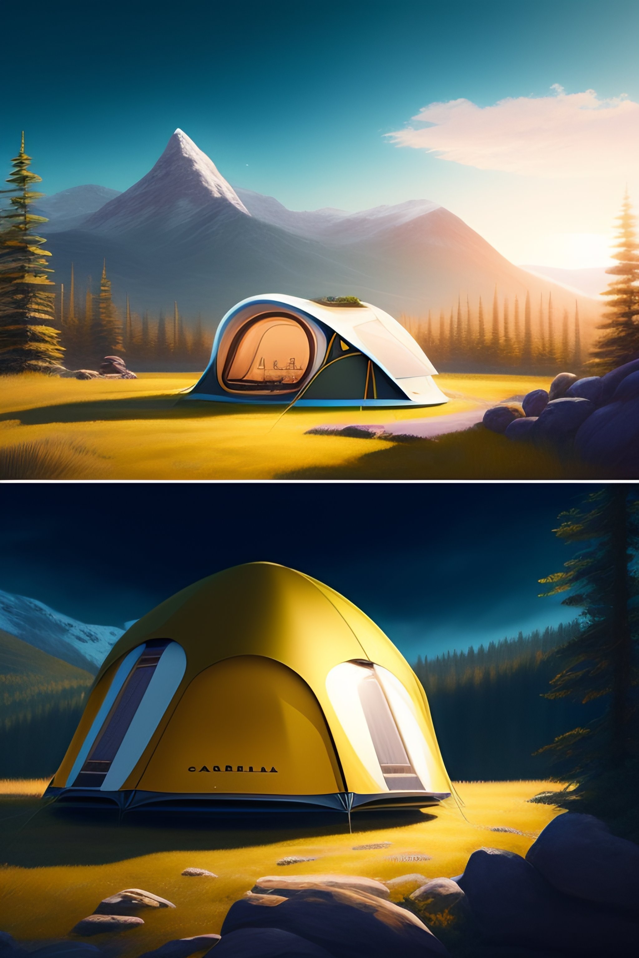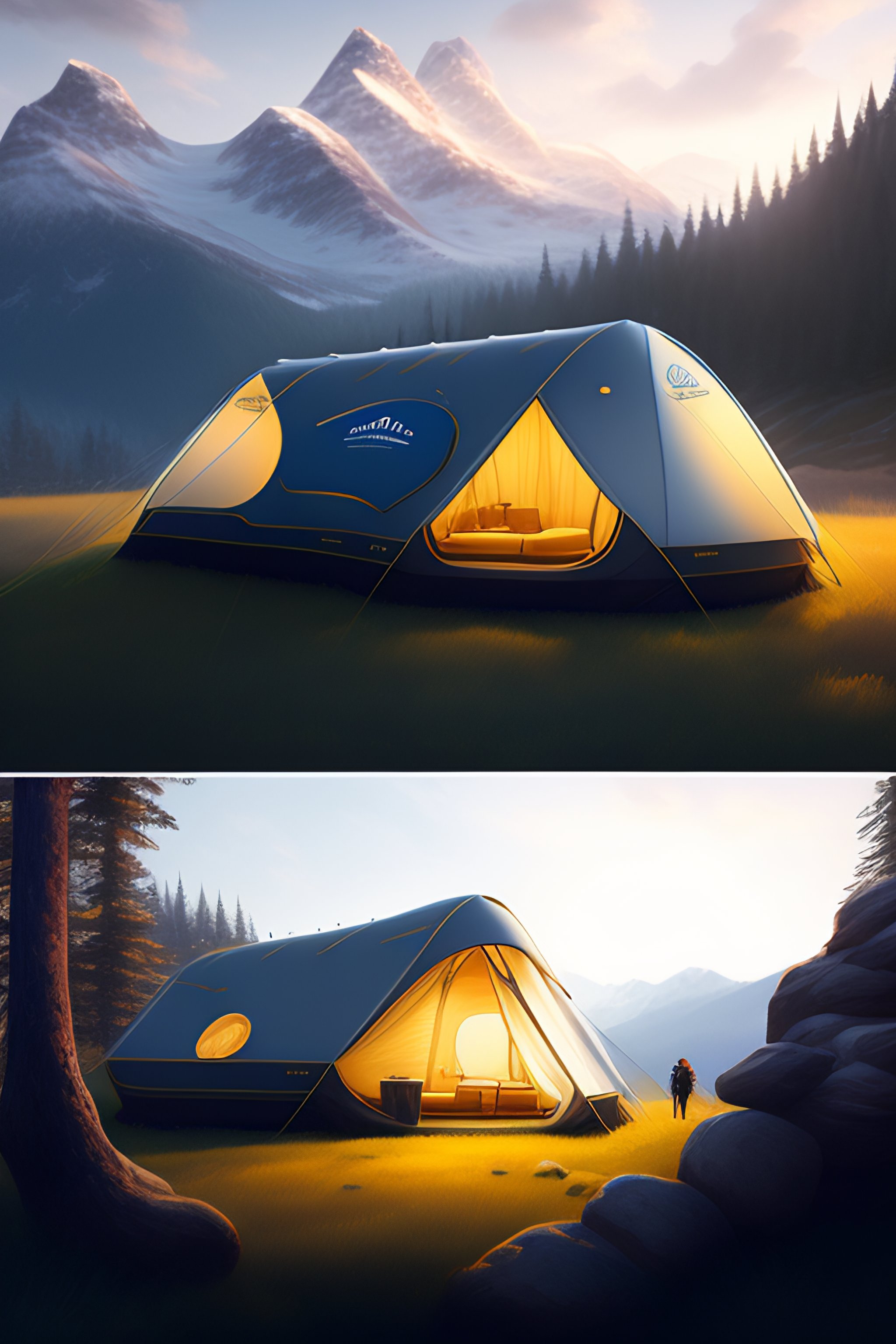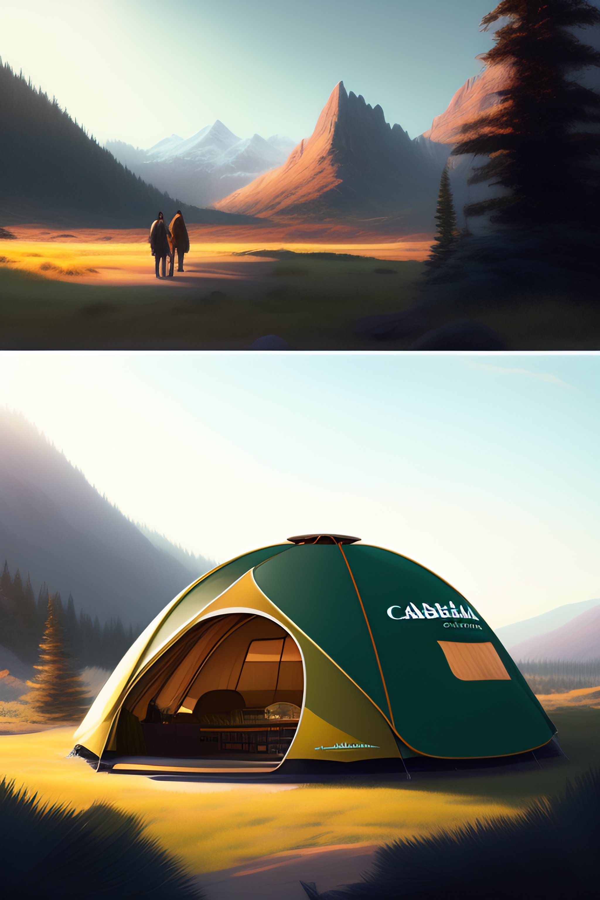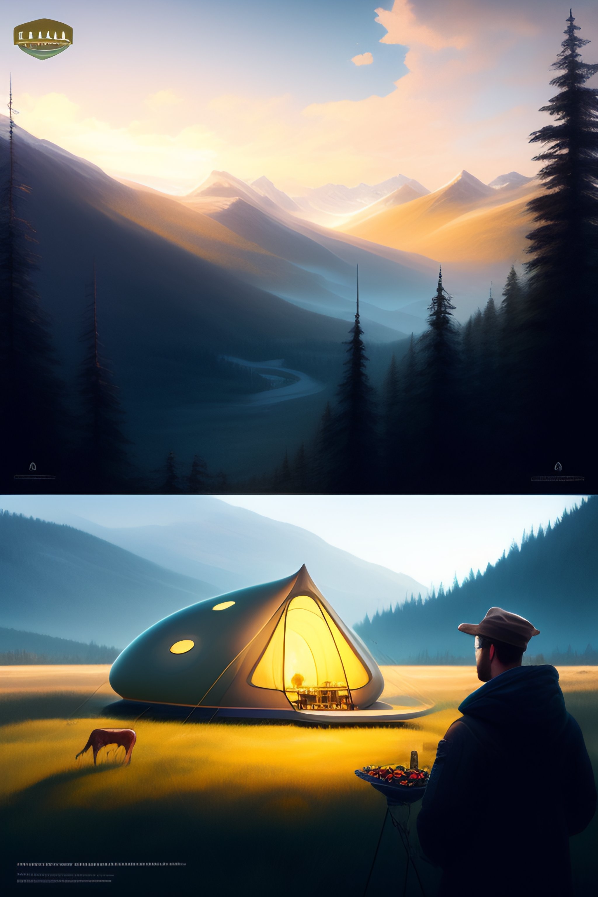 Cabela’s tent futuristic pop up family pod, cabin, modular, person in foreground, mountainous forested wilderness open fields, beautiful views, painterly concept art, joanna gaines, environmental concept art, farmhouse, magnolia, concept art illustration by ross tran, by james gurney, by craig mullins, by greg rutkowski trending on artstation