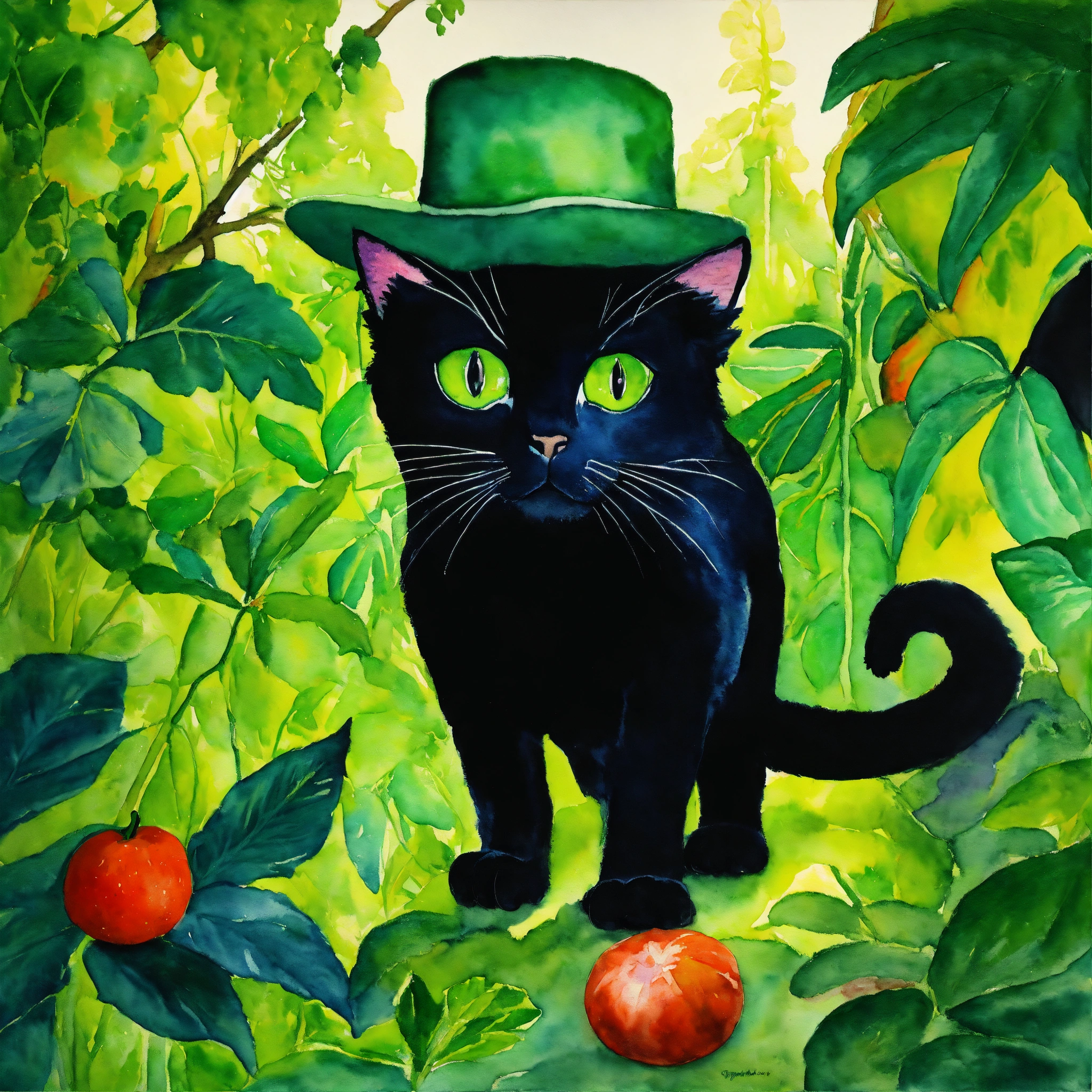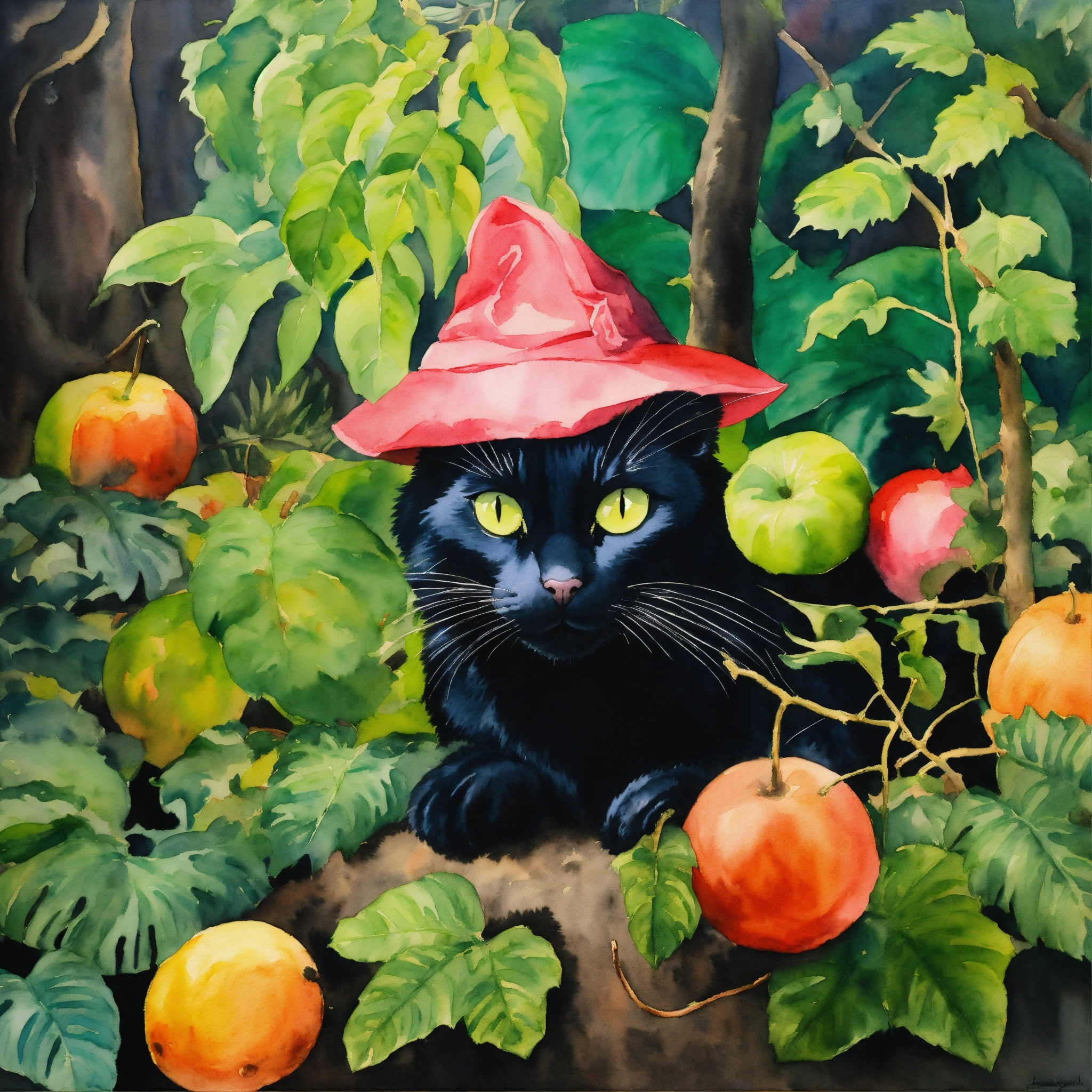 Watercolor painting, watercolor on canvas, renaissance painting, heironymous bosch the younger, frans hals, vivid colors, glowing, bright colors, fantasy, soft glow, acrylic painting, rainforest landscape, confused black cat, dumbfounded black cat, jungle, vines, rainforest, giant fruit, cat wearing a green leaf hat, black cat wearing a hat made of leaves