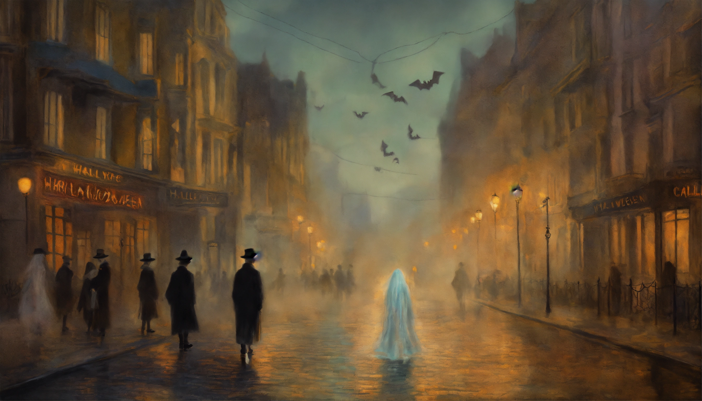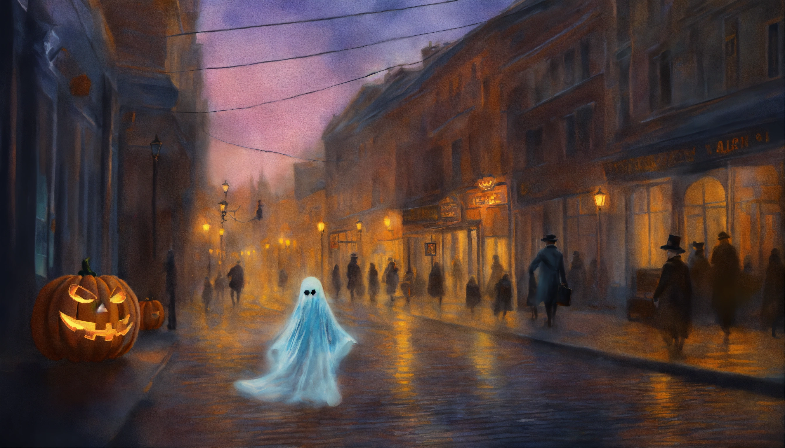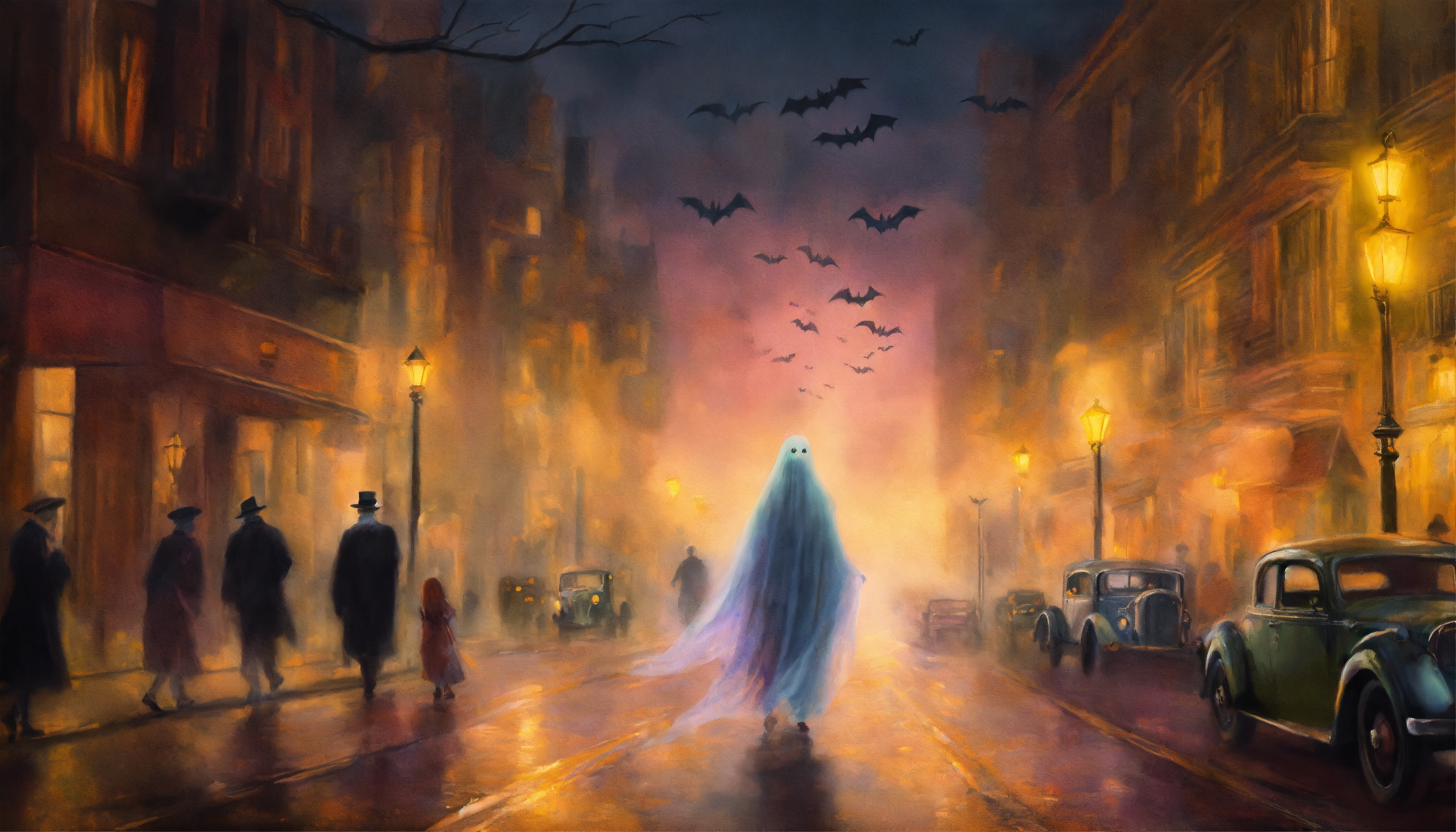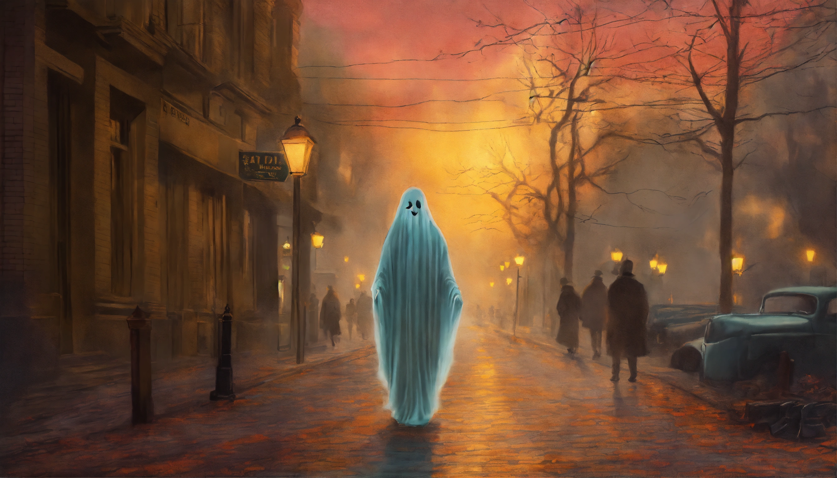 Halloween a small ghost walking crossing the city, the ghosts must be somewhat transparent and must not have feet, pastel drawing, 1920s. ensure very high resolution. 16k image, realistic.