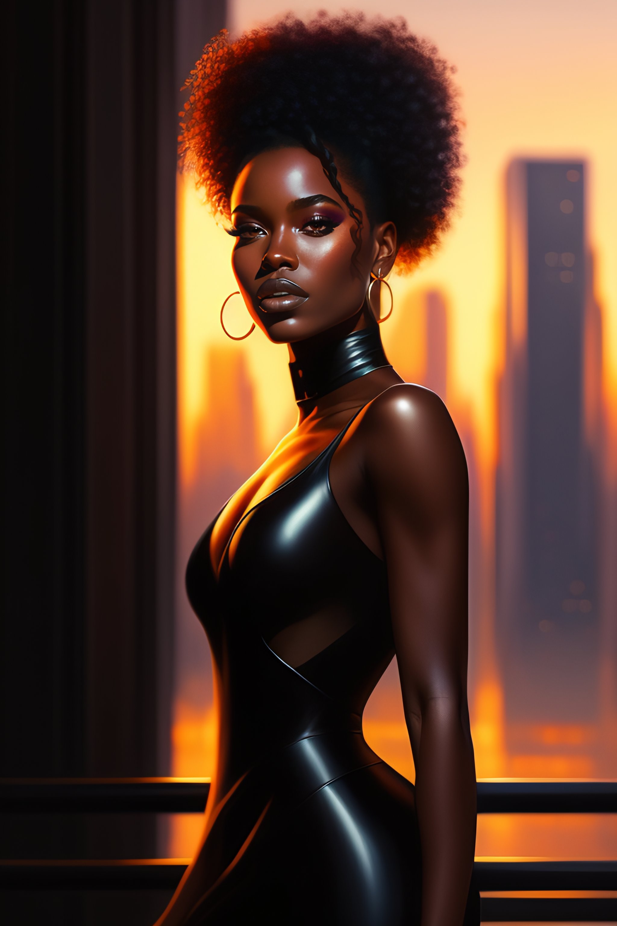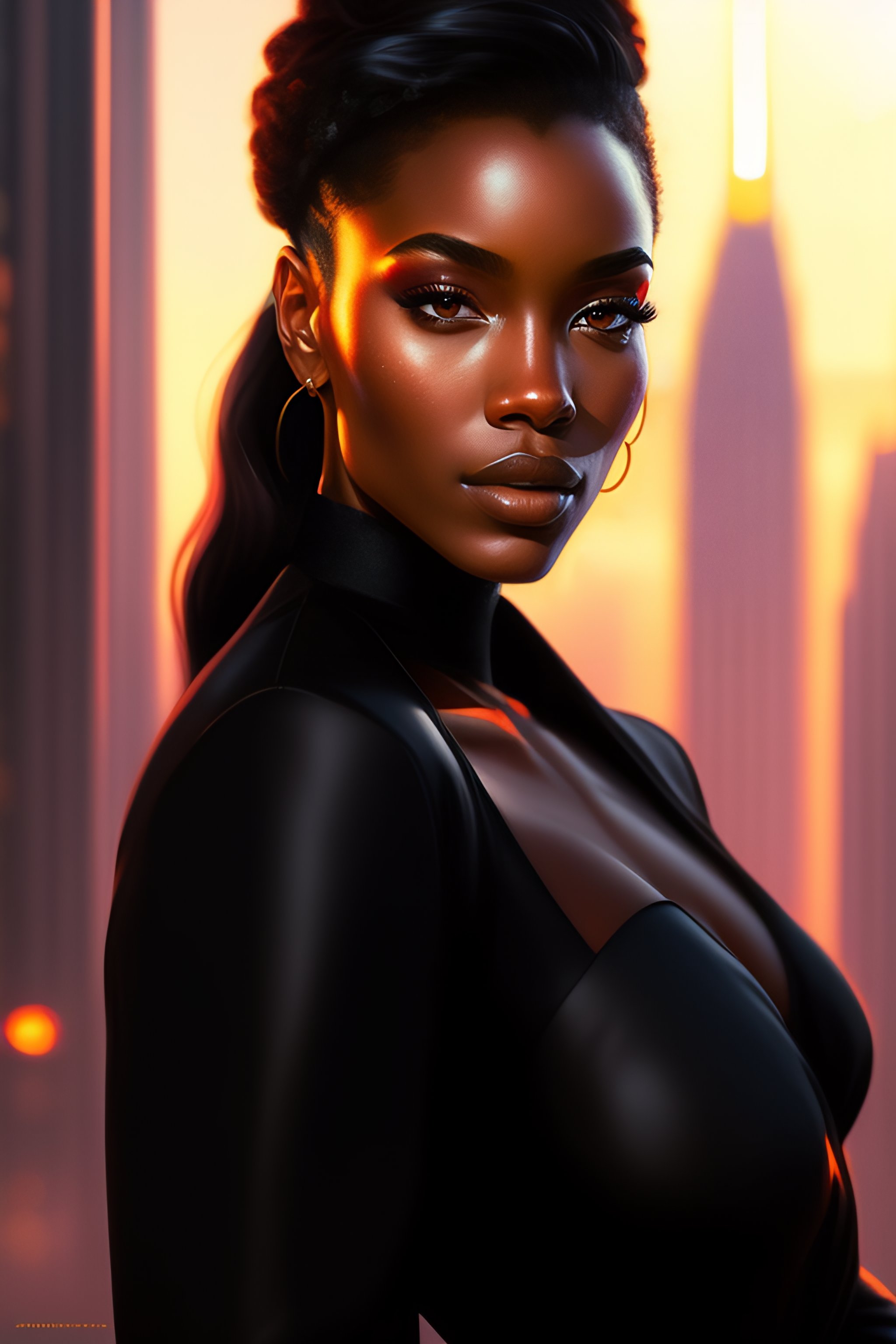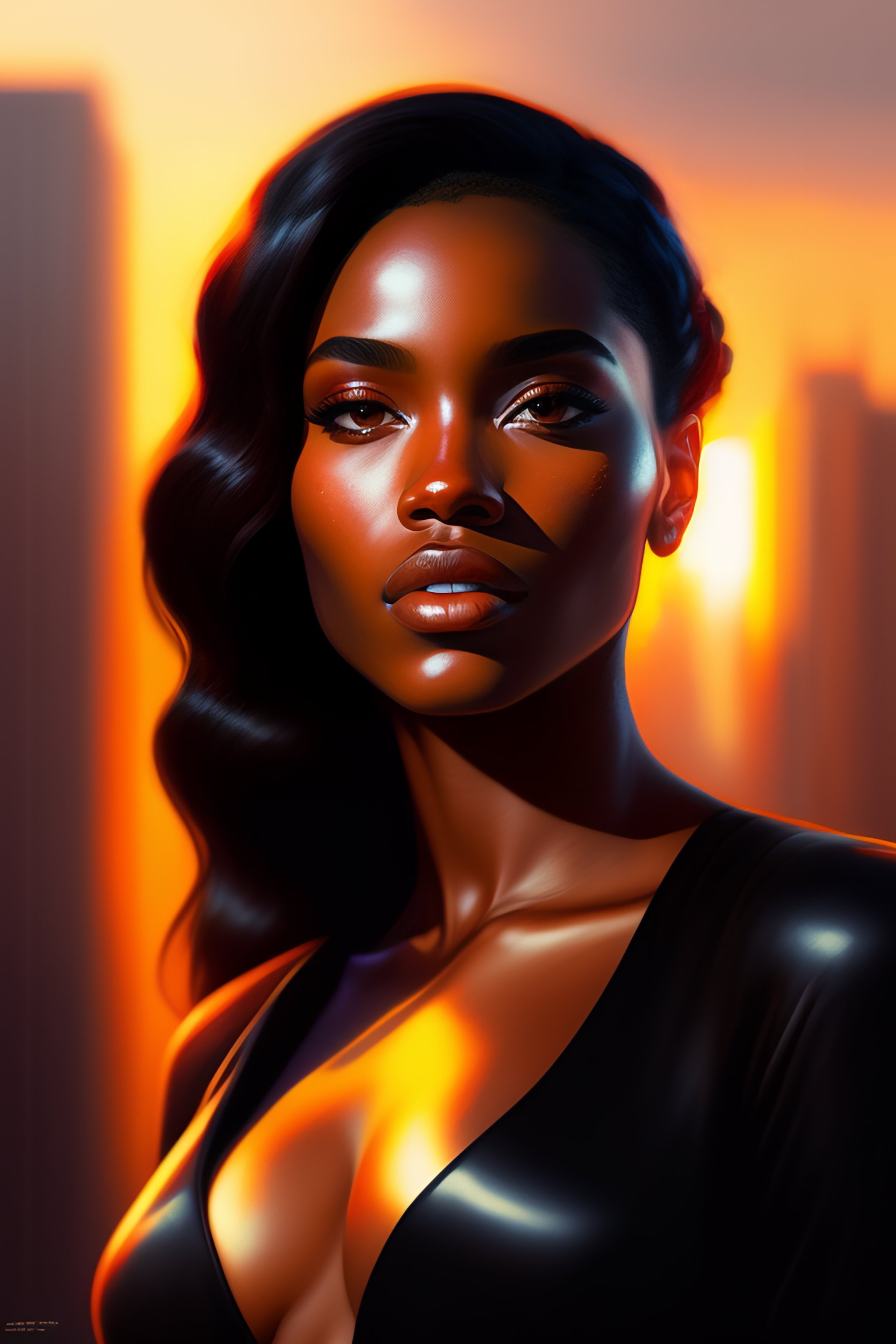 A closeup beautiful full body portrait of young black woman, dramatic light, city background, sunset, high contrast, sharp, painted by stanley lau, painted by greg rutkowski, painted by stanley artgerm, masterpiece, digital art, trending on artstation
