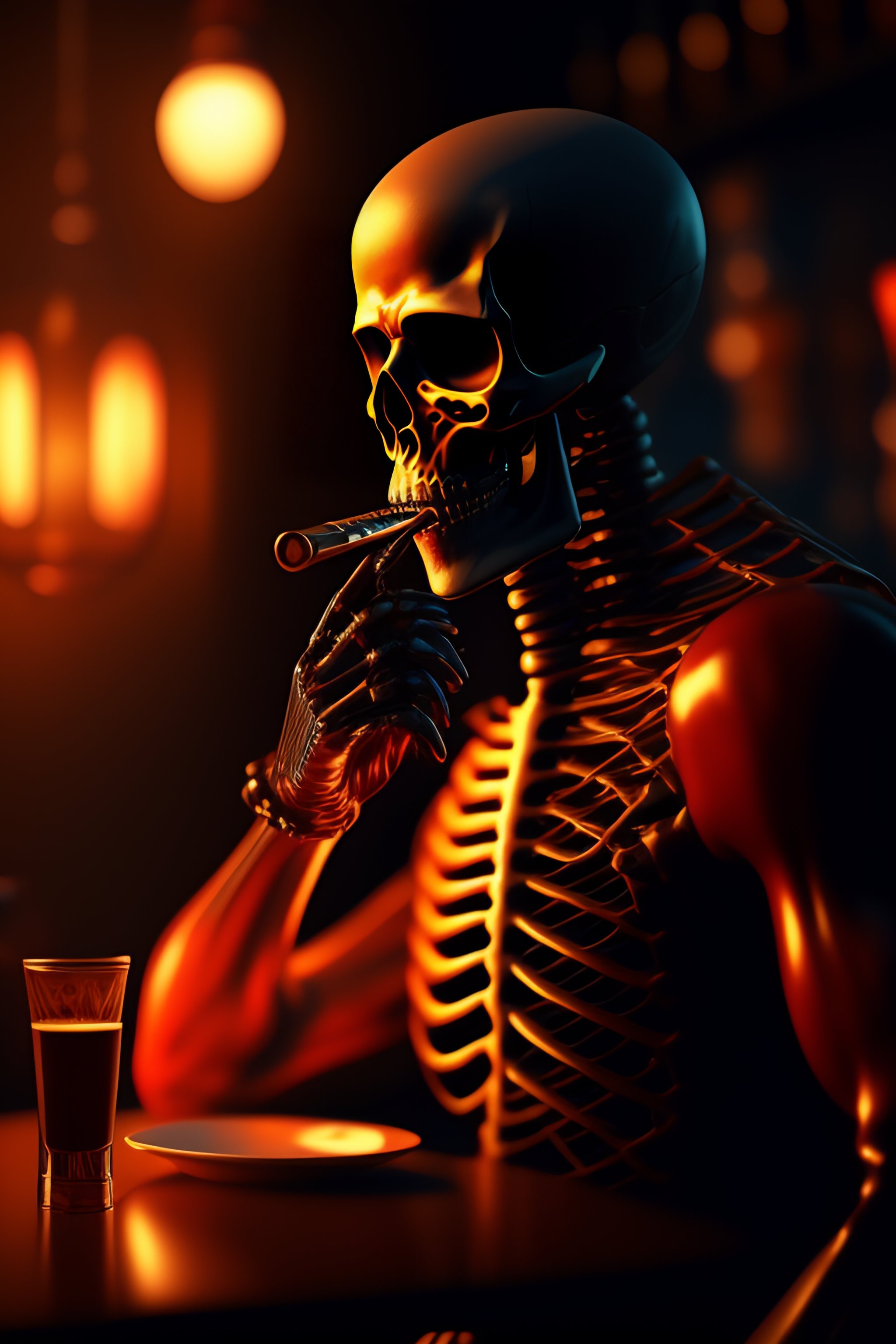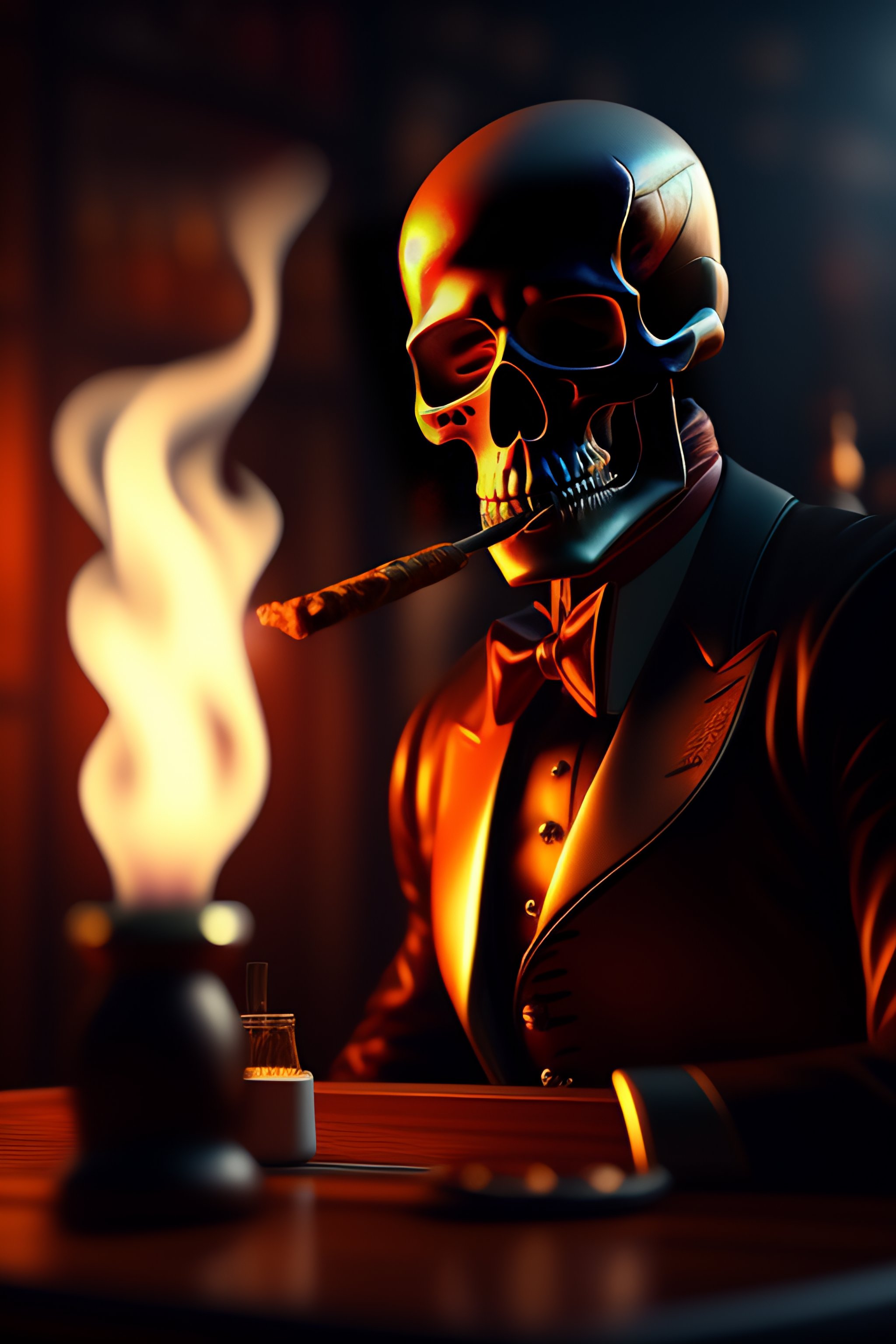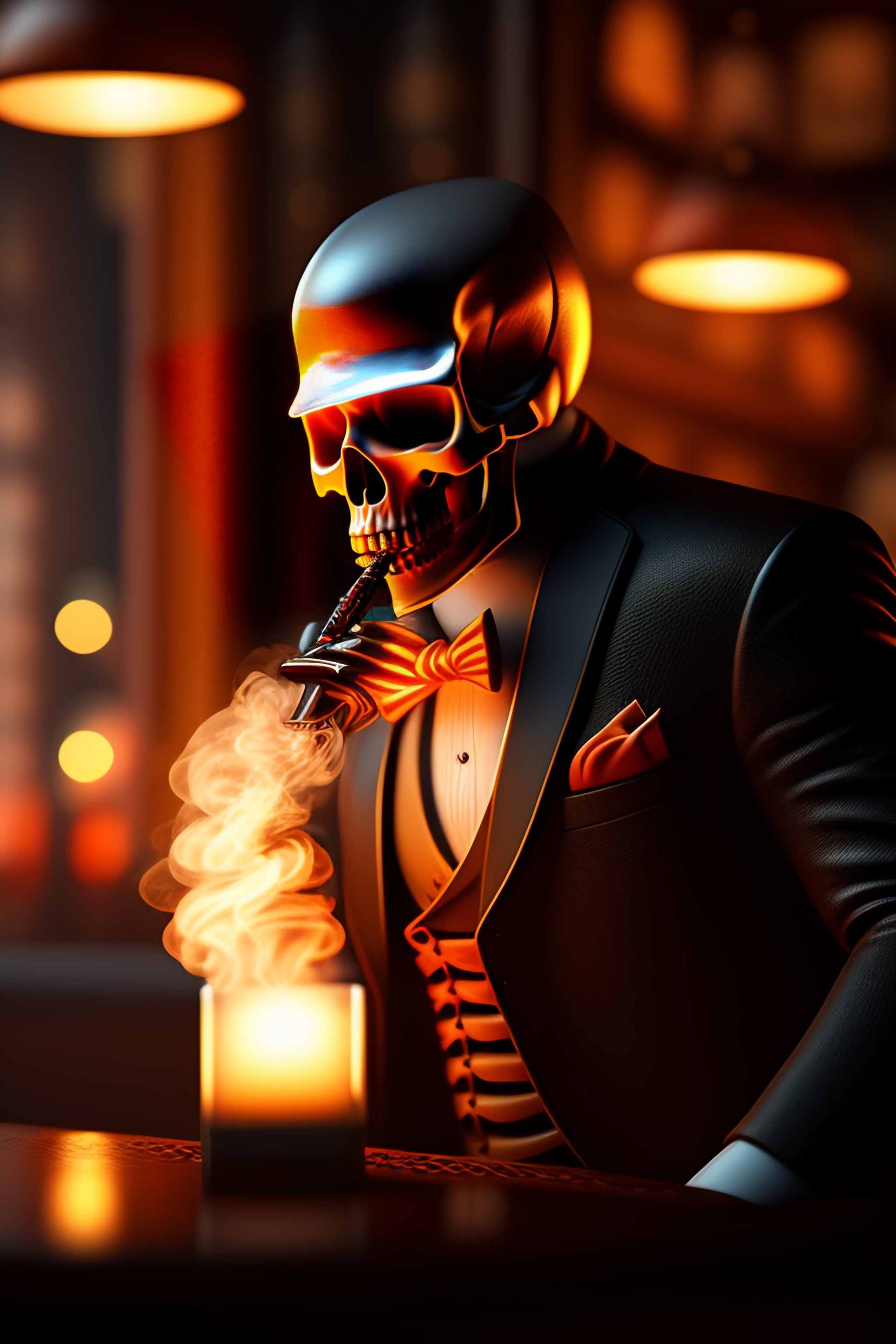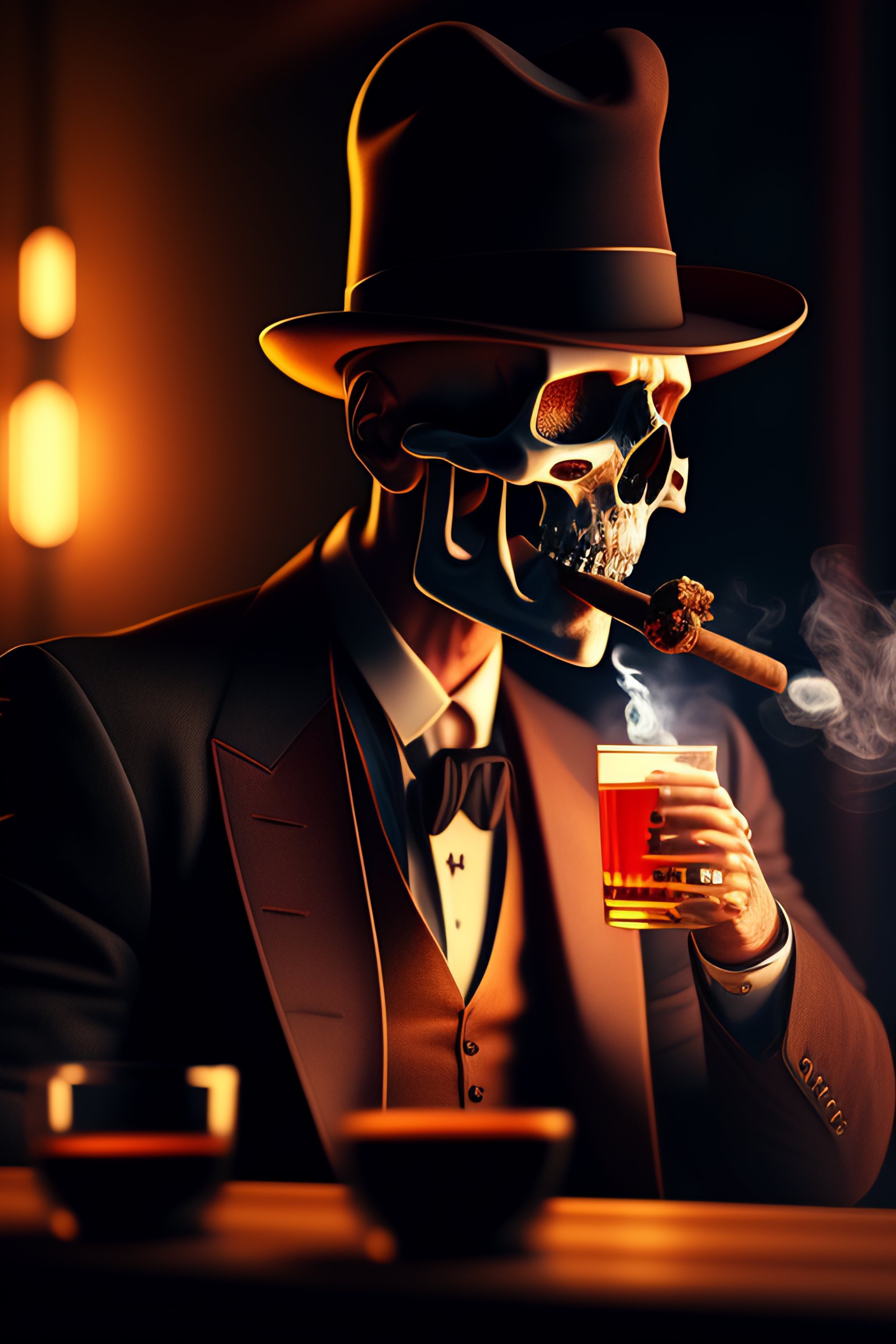 Gentleman skeleton smoking a cigar in a bar, cinematic lighting, dimly lit, hyper-detailed, hd, 4k, volumetric lighting
