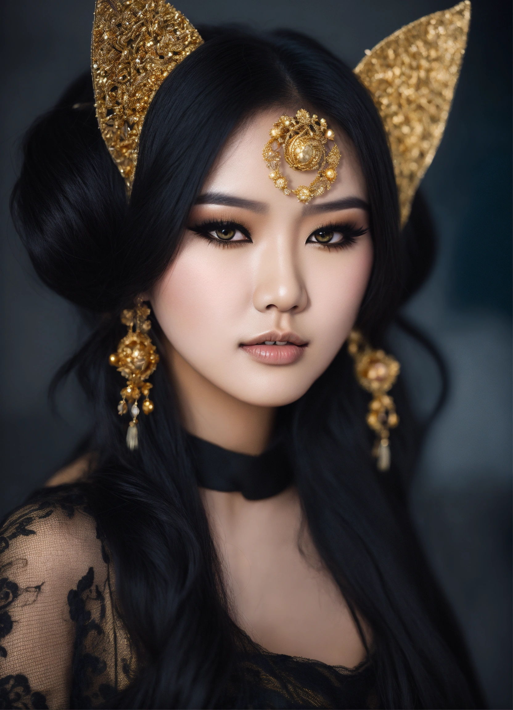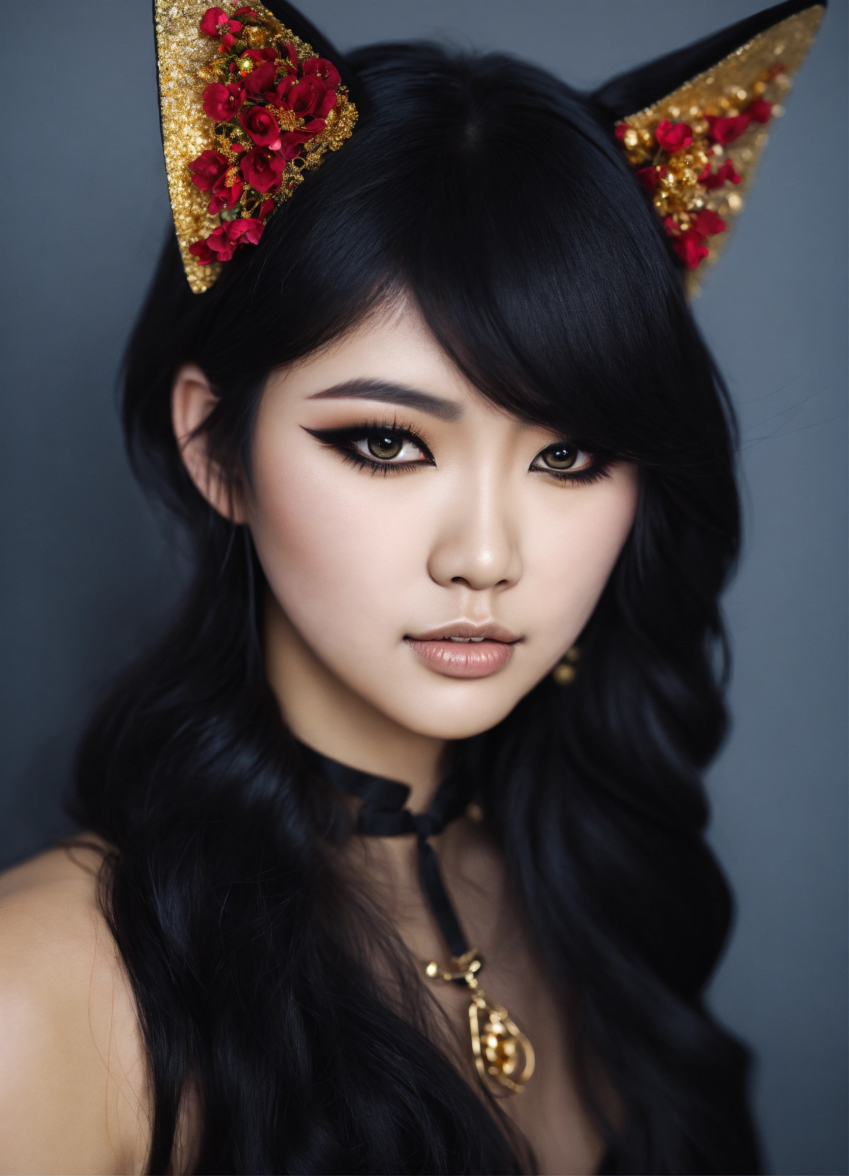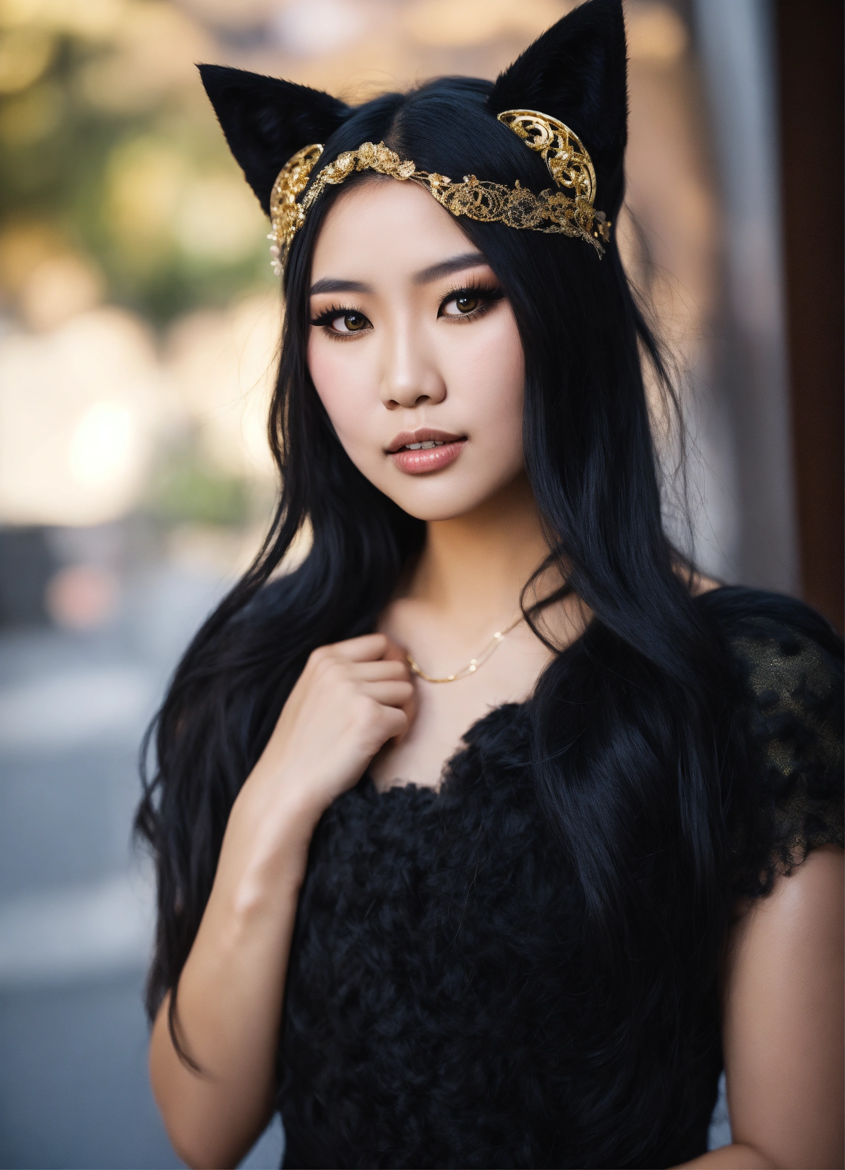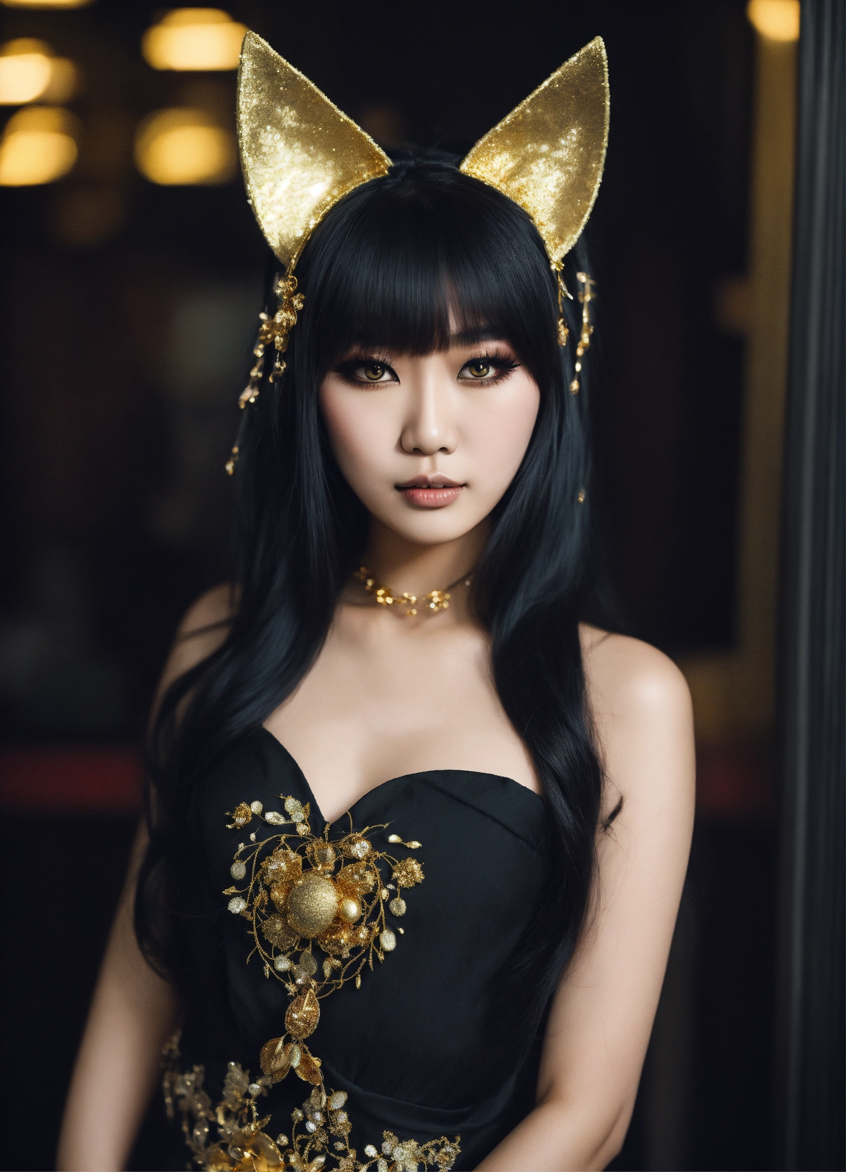 Beautiful asian woman with cat ears, long black hair, gold eyes, heavy black eyeshadow, wearing a black dress and a tail
