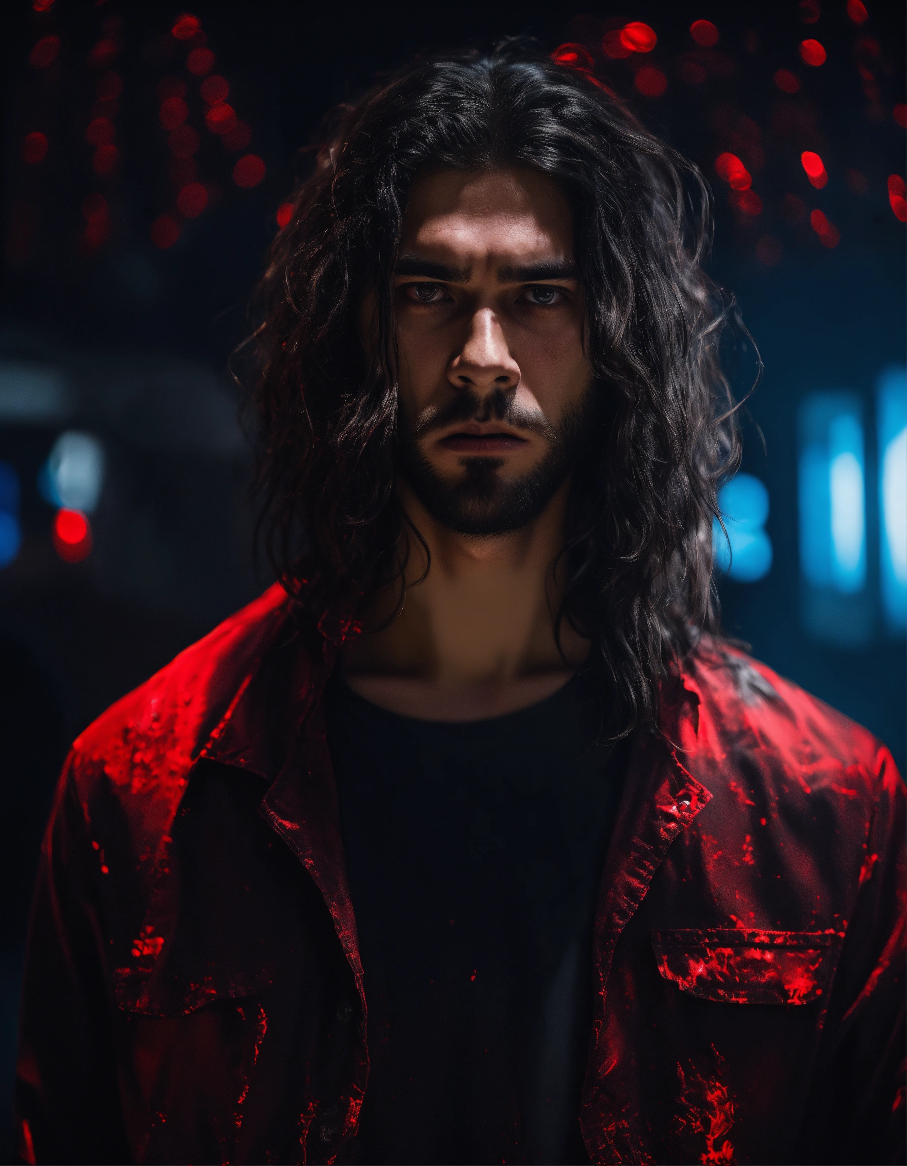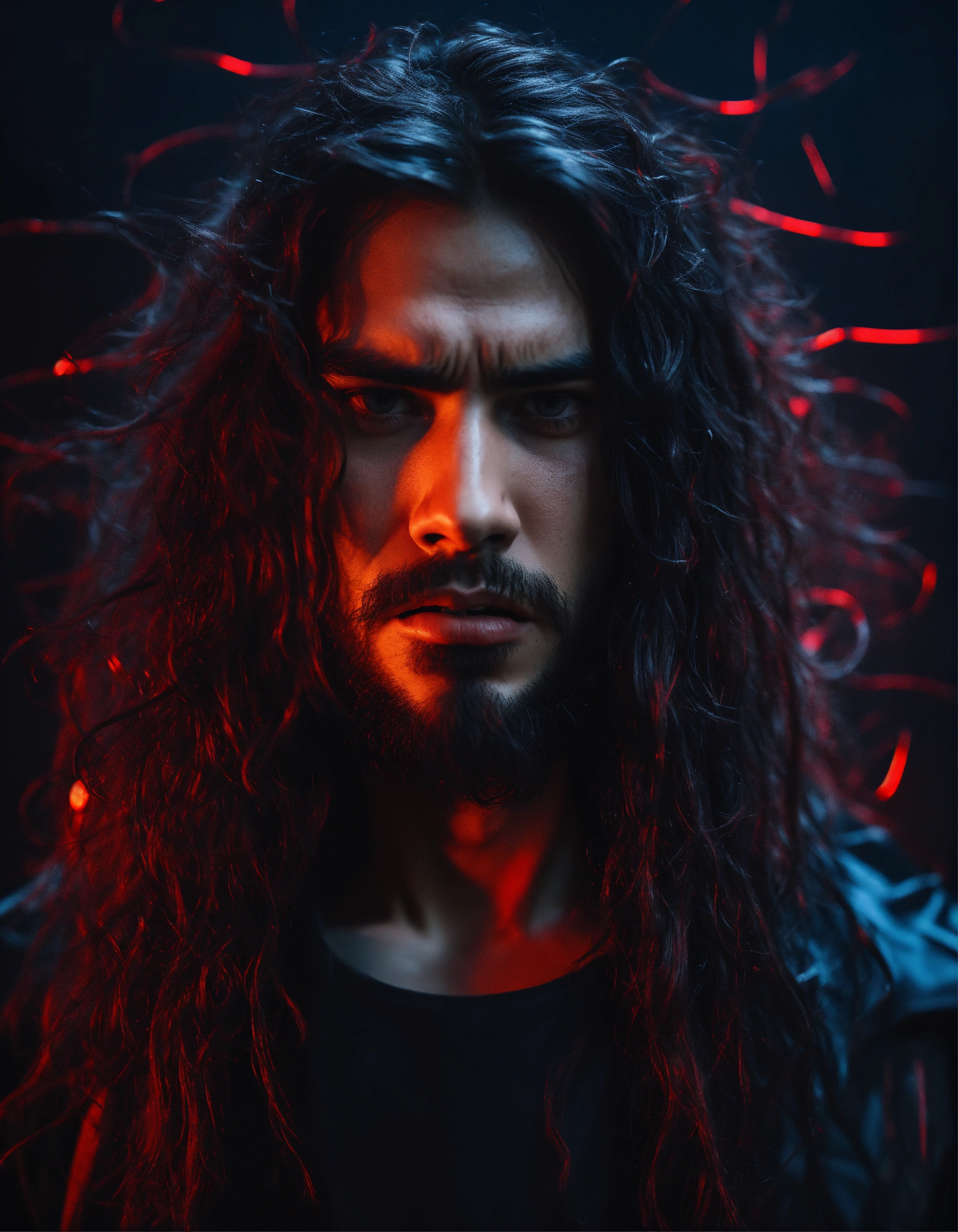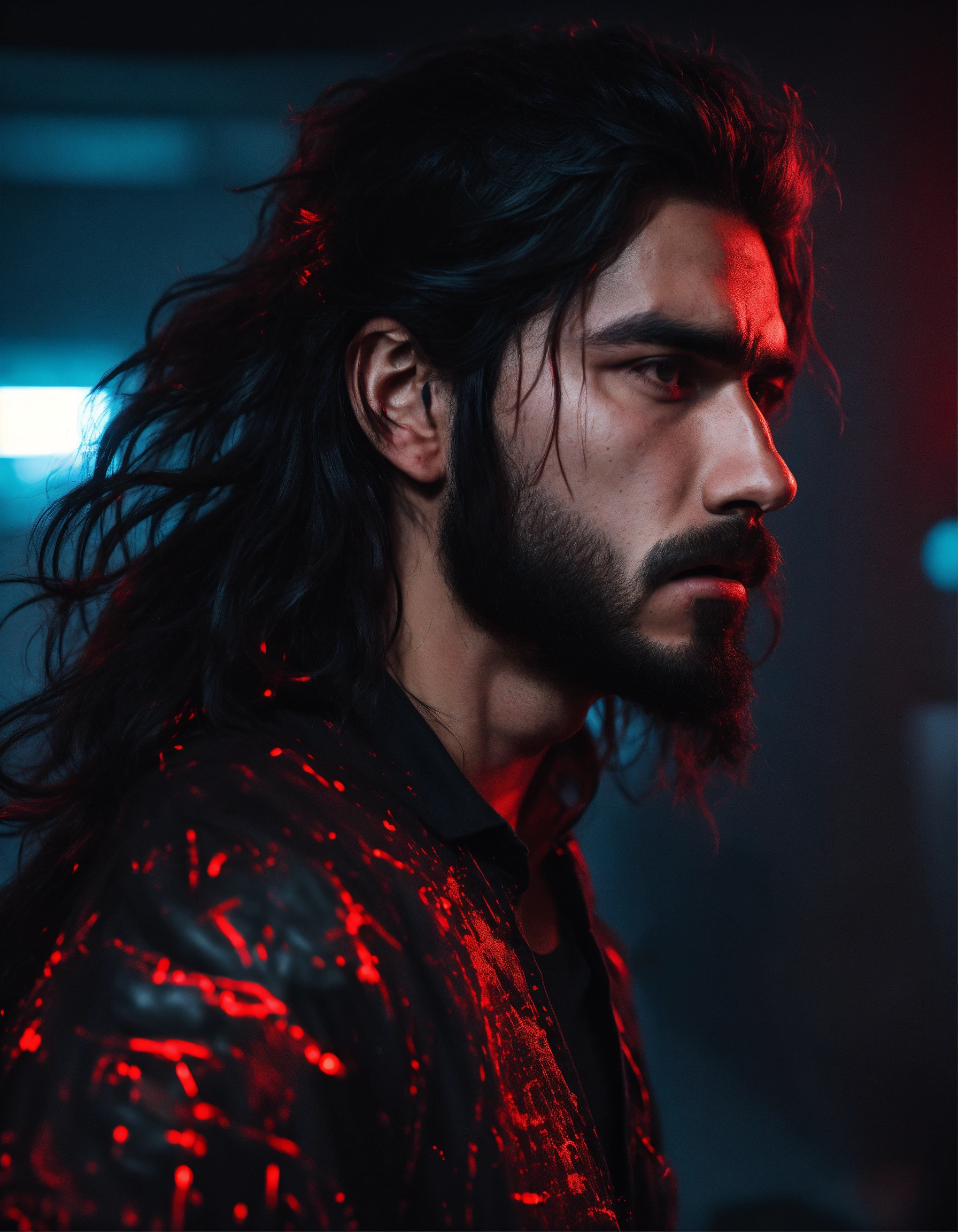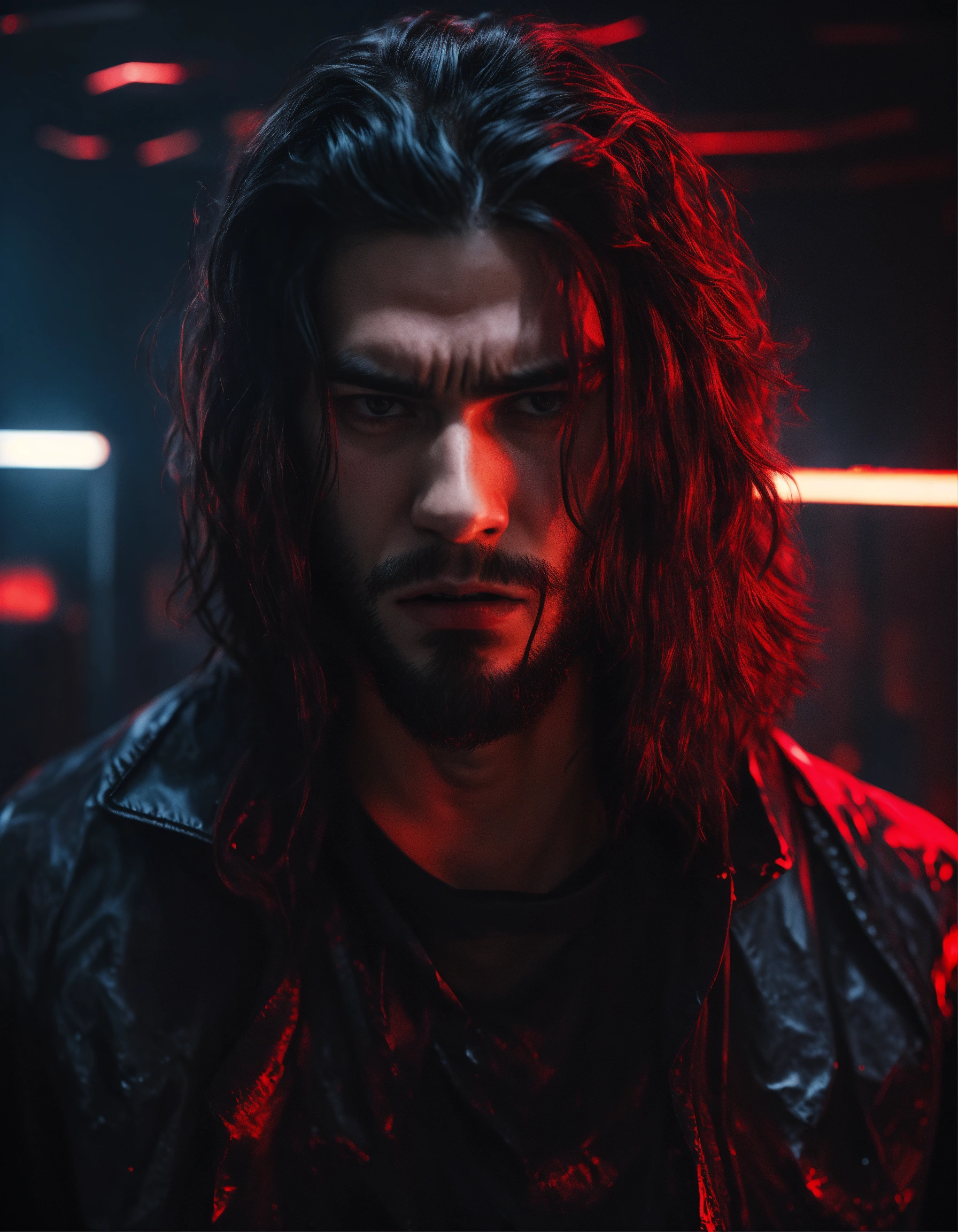 A realistic photograph of a 20-year-old man, with a scary angry expression, black messy very long hair covering part of the face, dark black eyes, with a little beard, strong constitution, wearing a black futuristic polymer shirt, with a dark background with red leds, dramatic illumination, hyperdetailed, hyperrealistic, 8 k