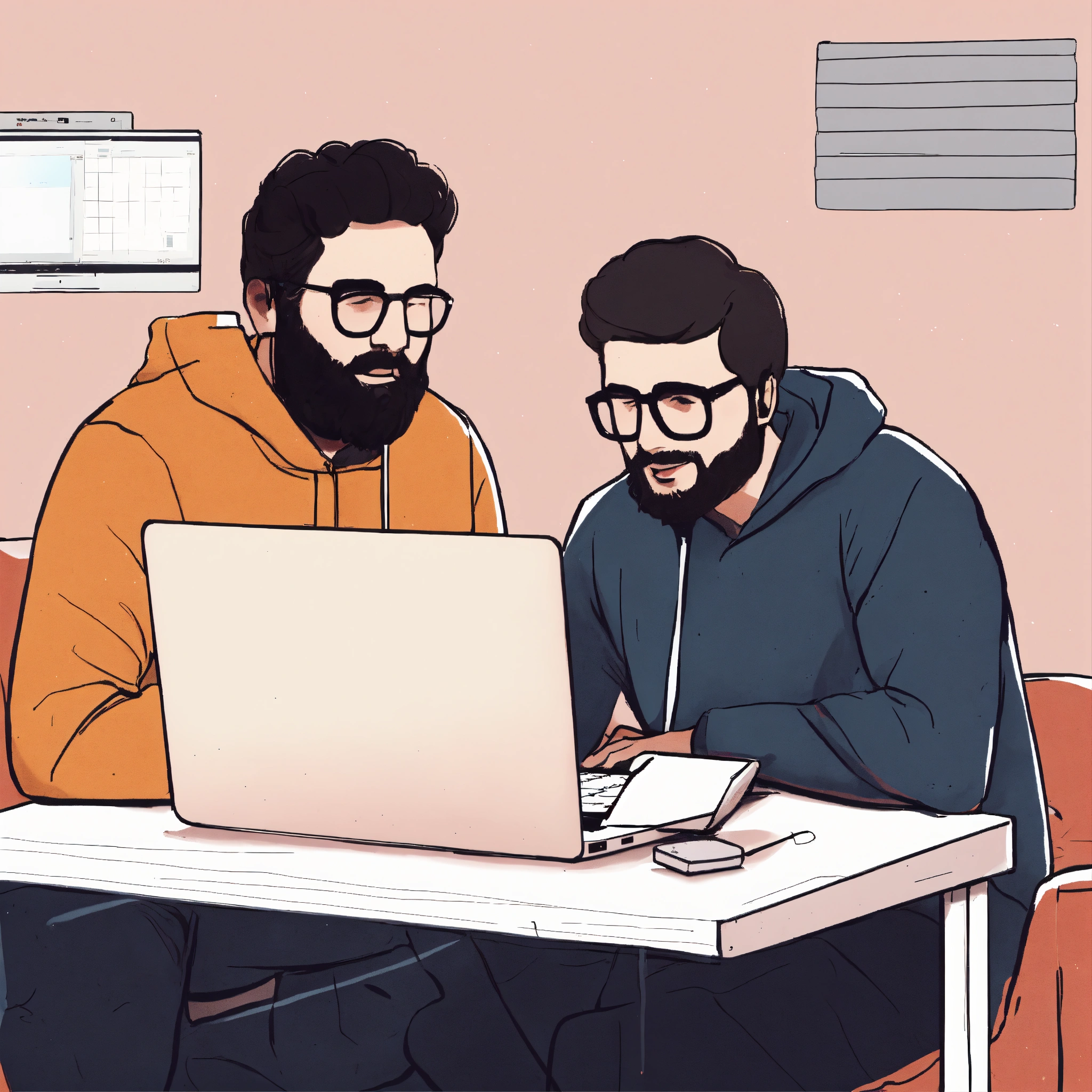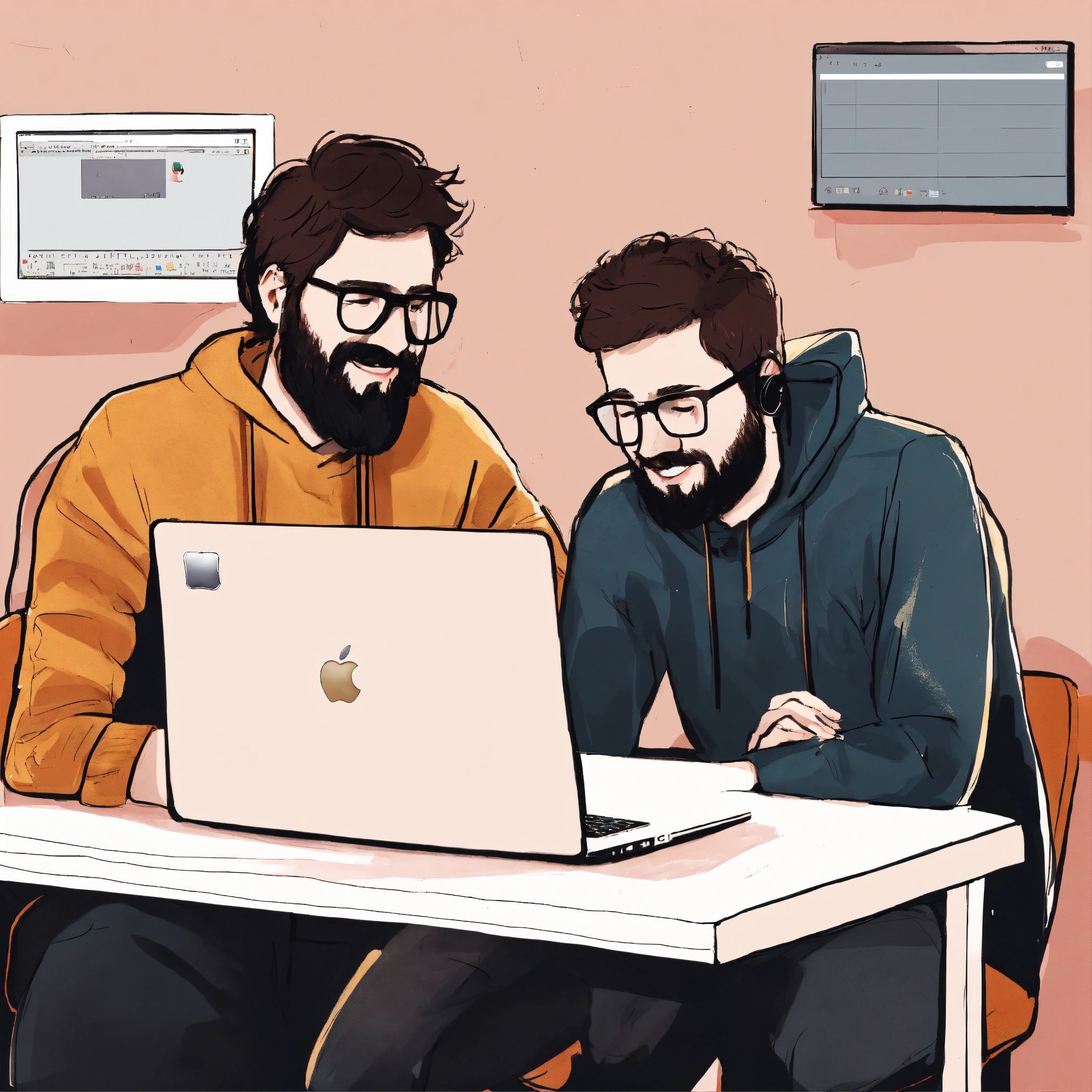 Very simple drawing of two developers that enjoy collaborating with a single macbook,