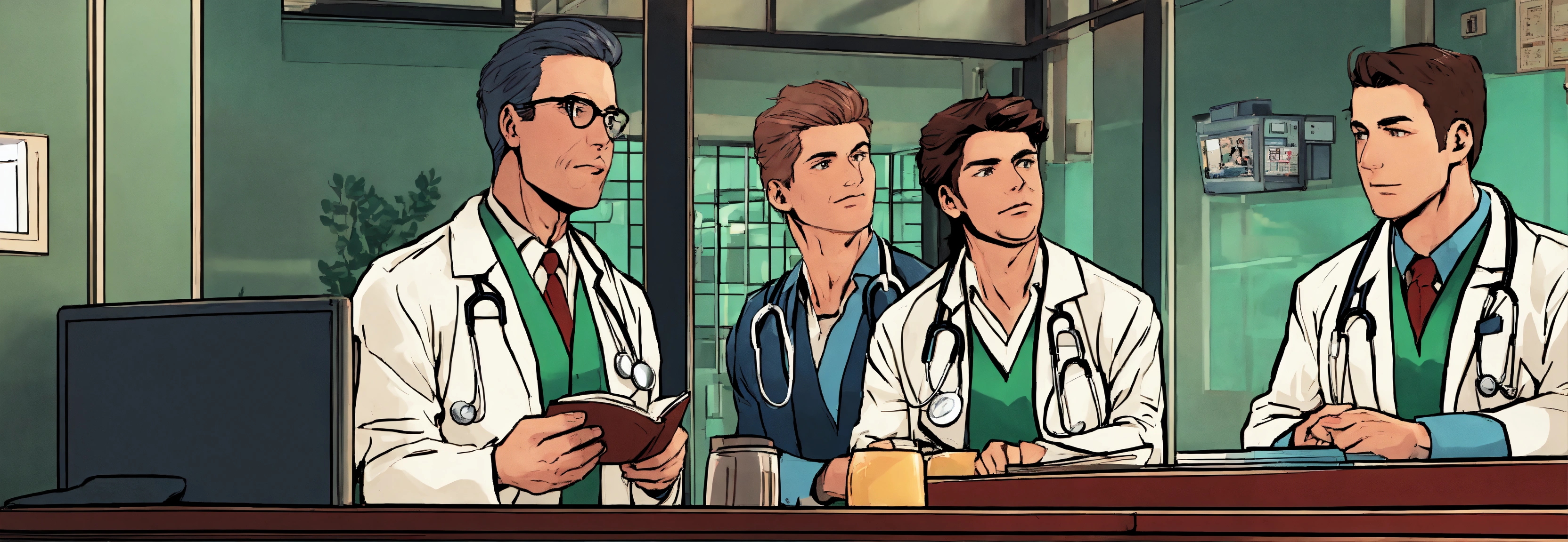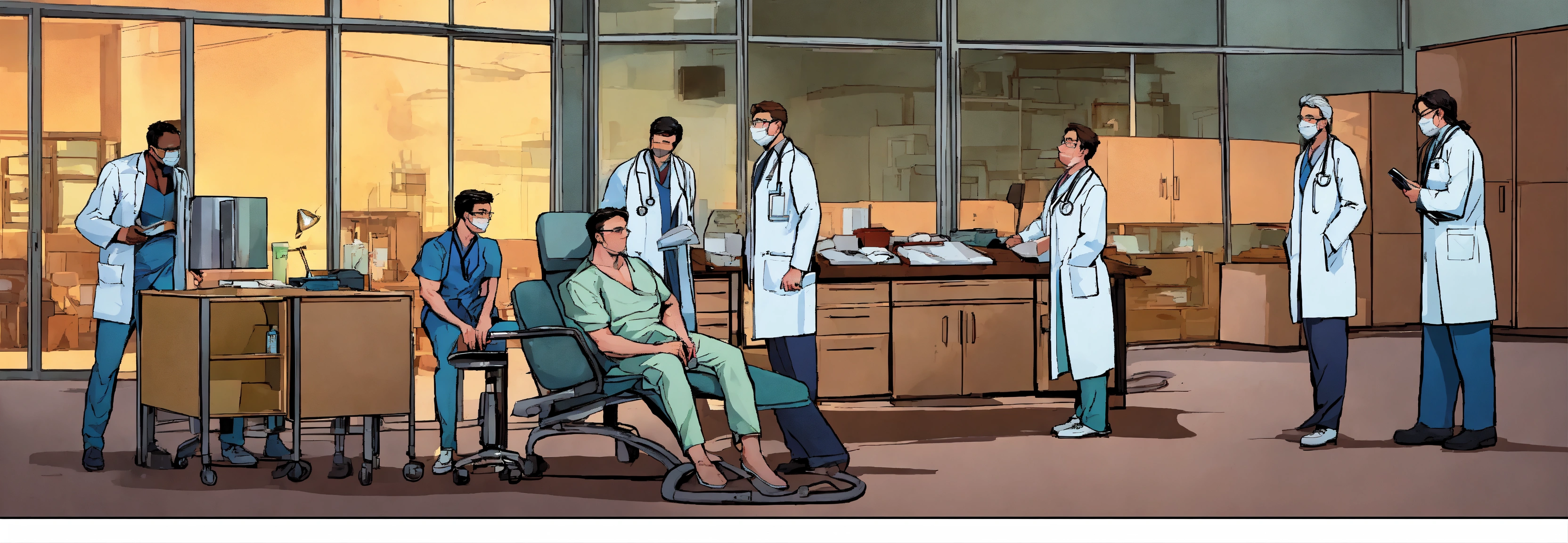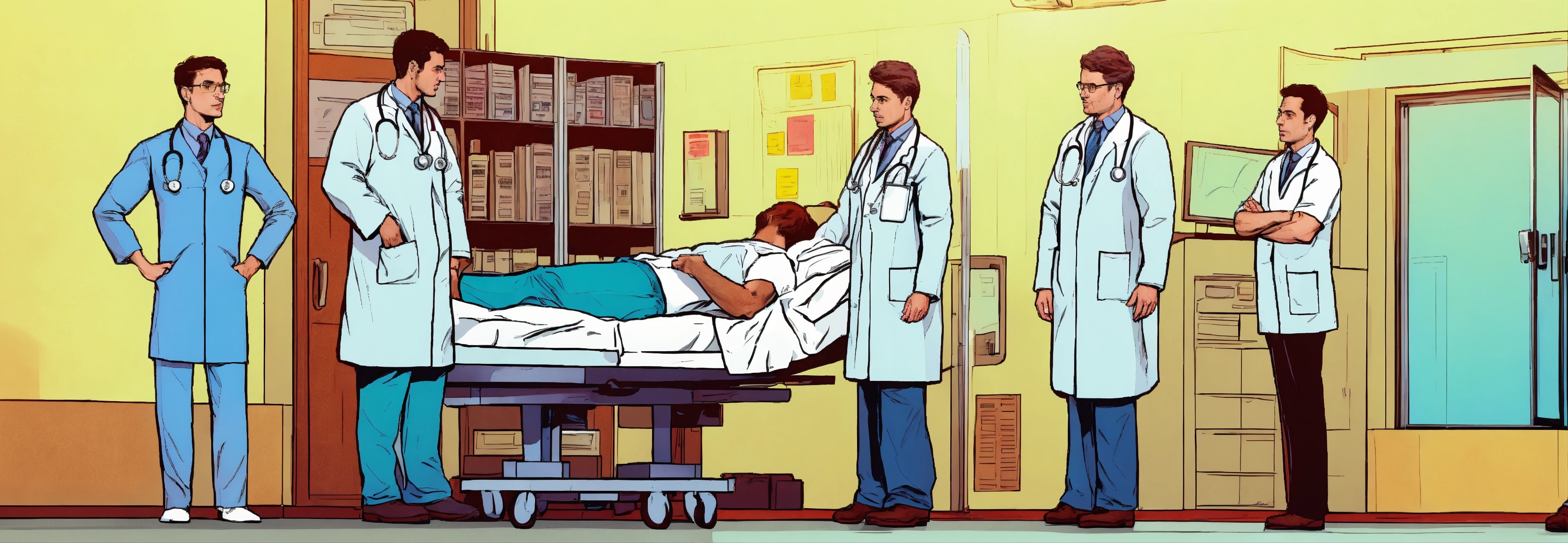 Comic a group of doctors looking at muscular patient