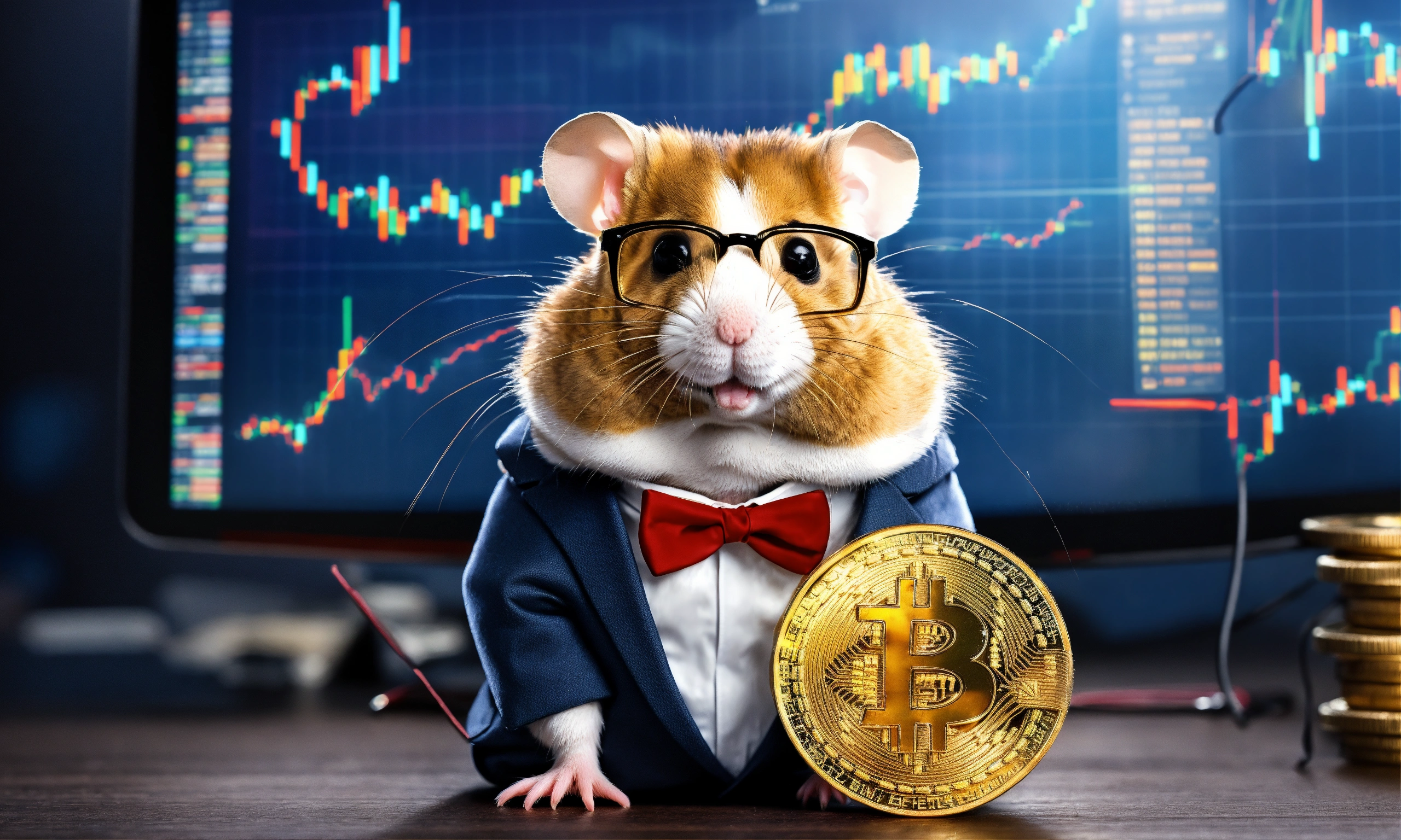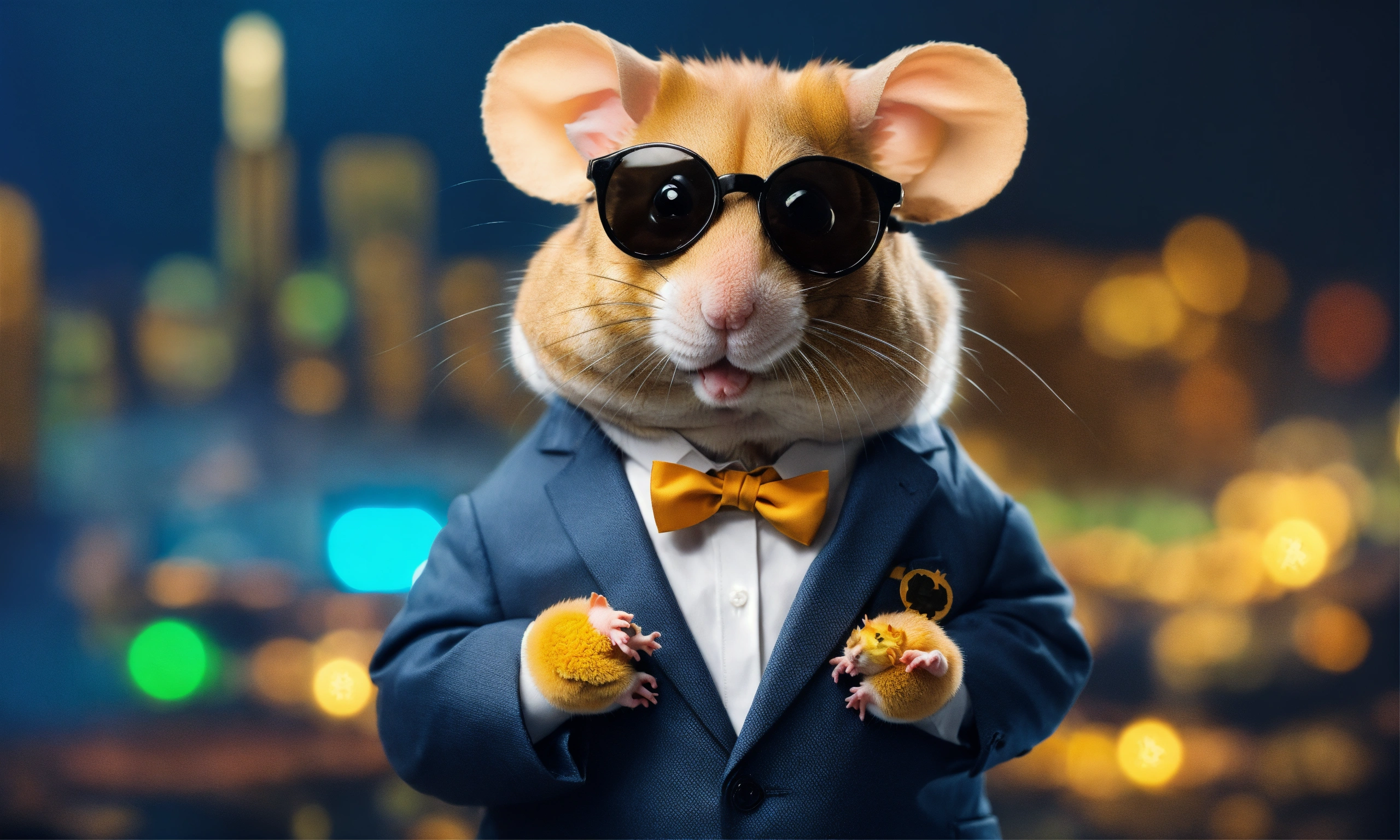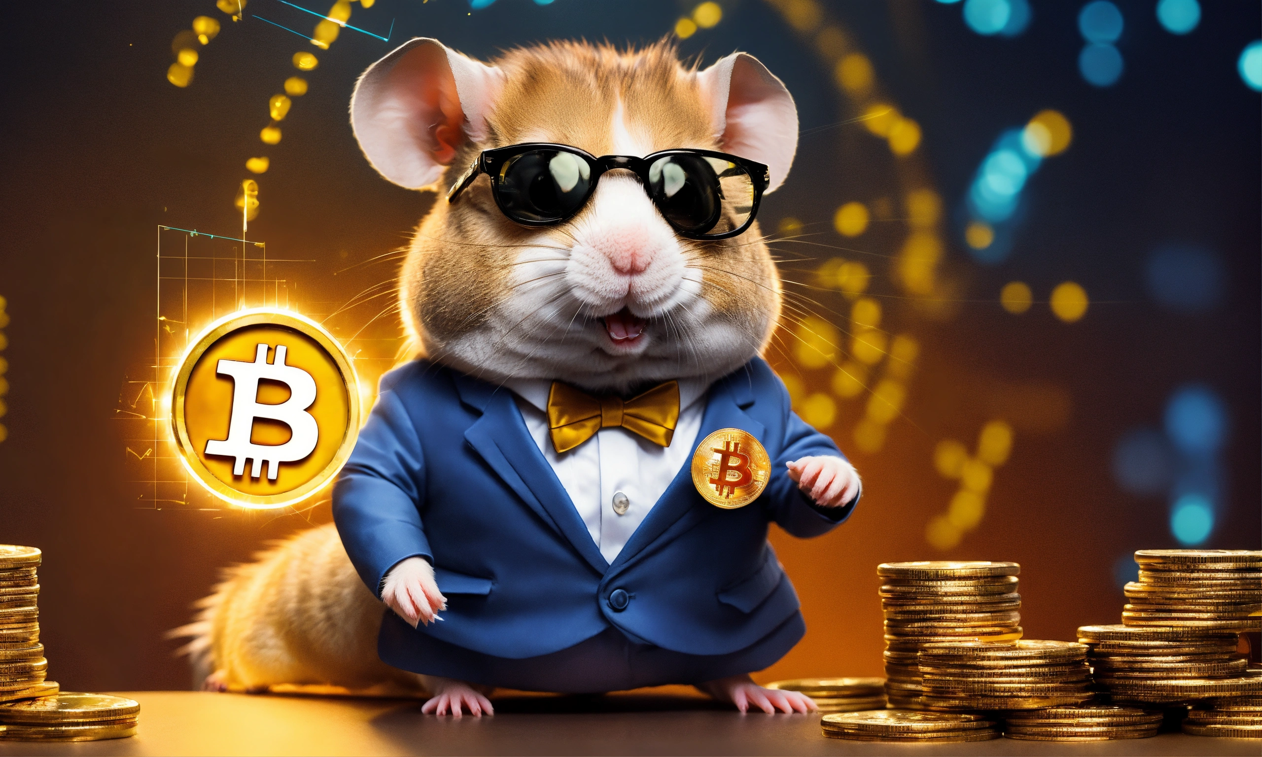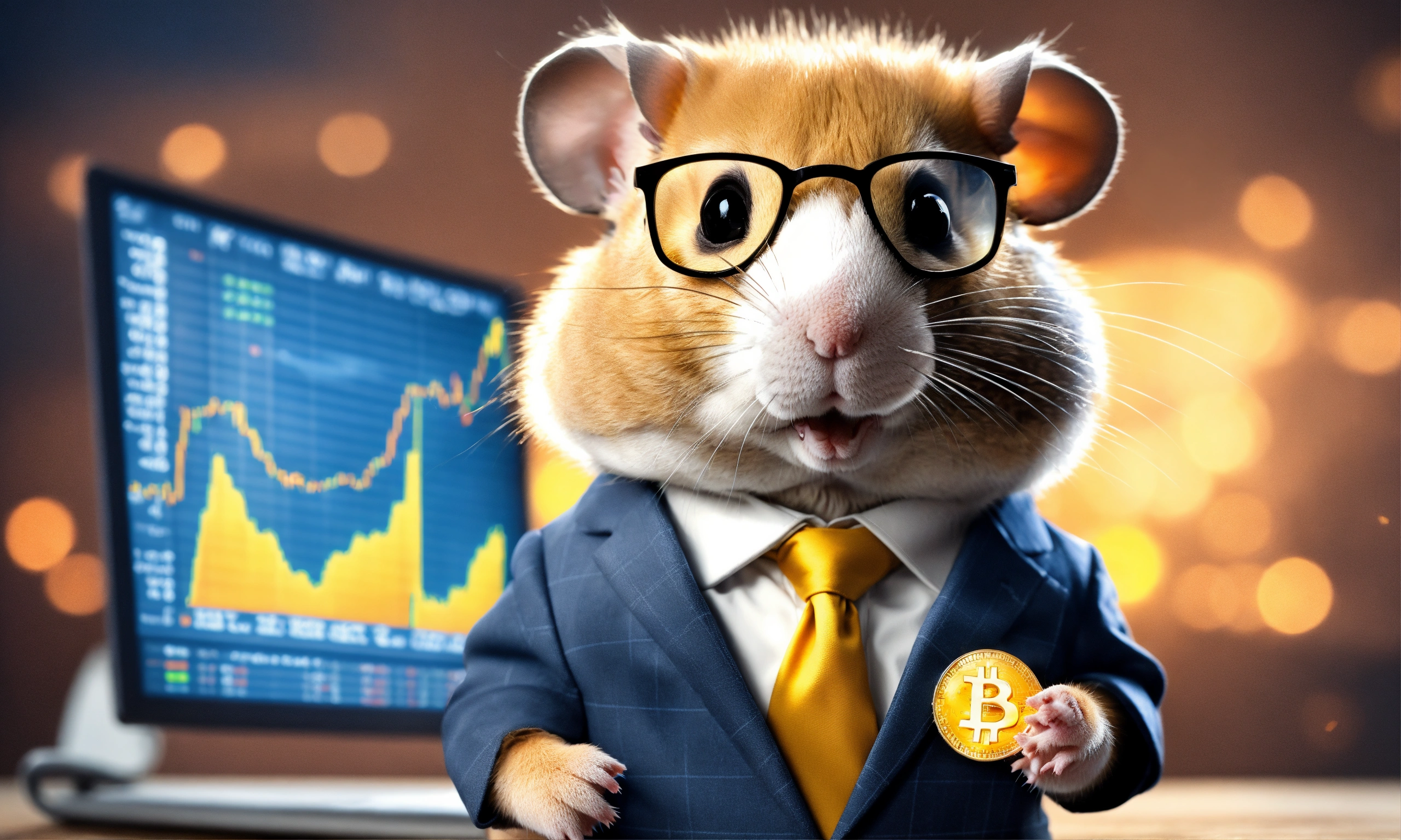 A hamster dressed in a suit and glasses holds a bitcoin and smiles