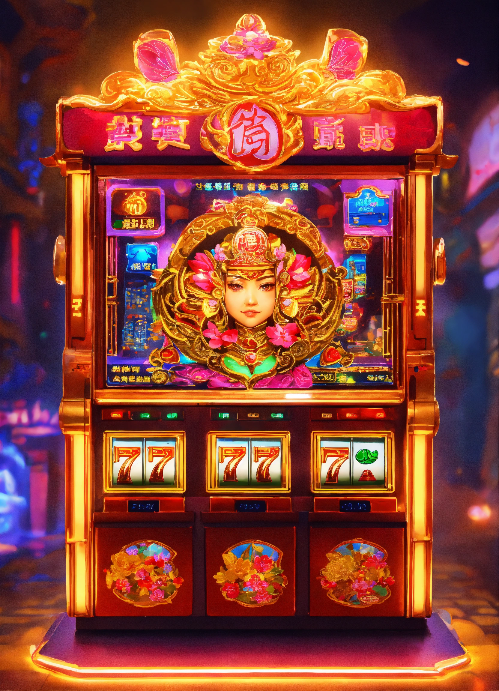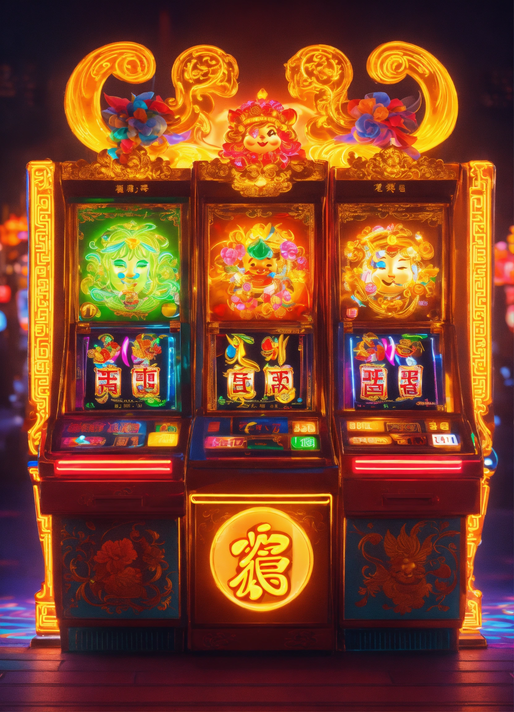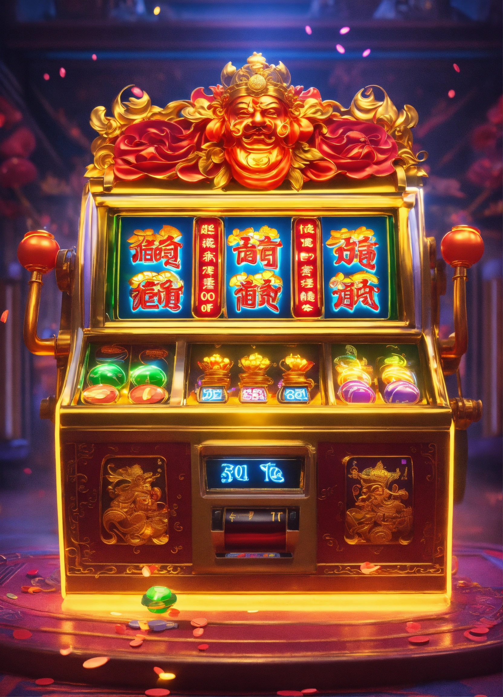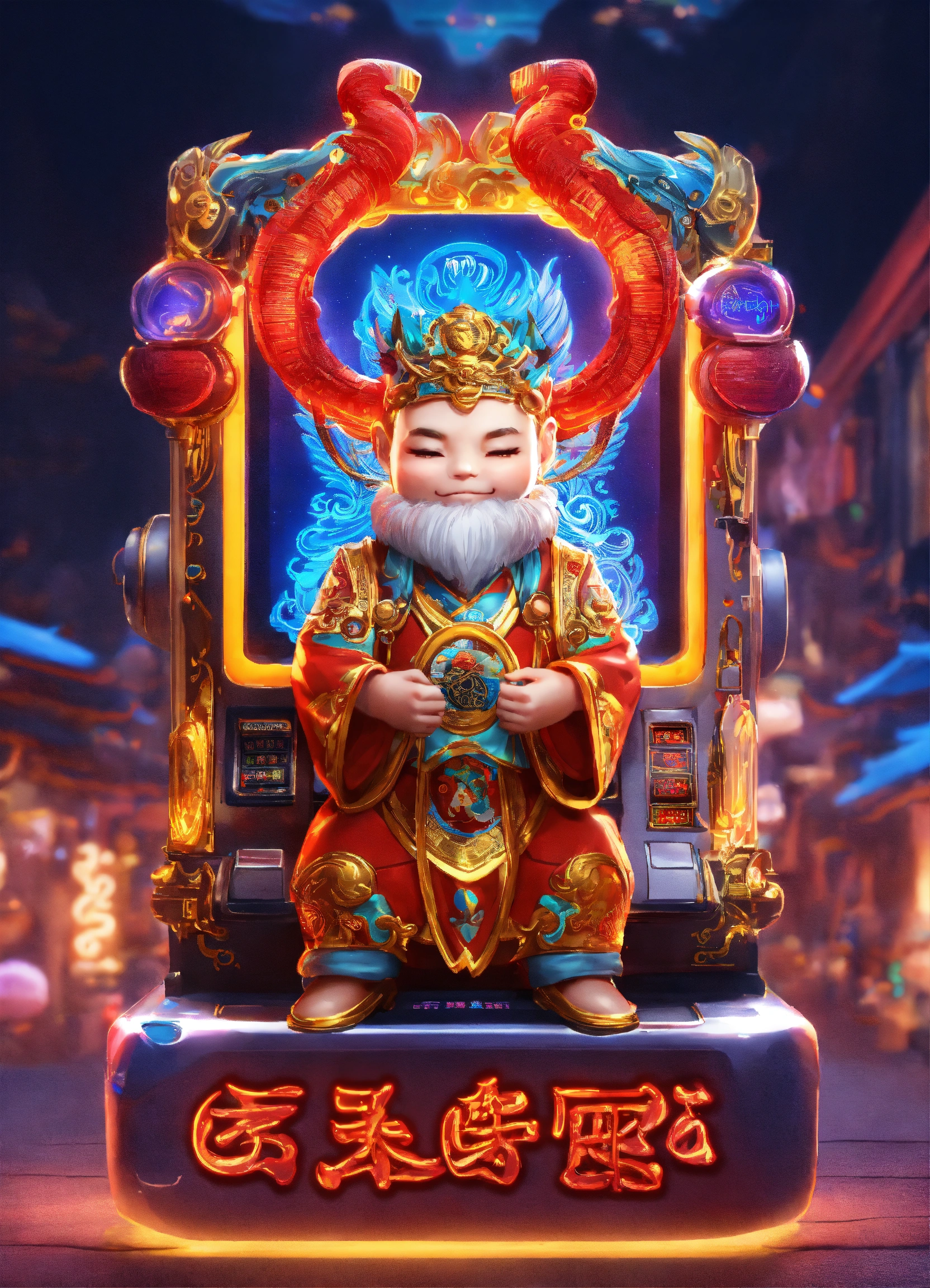 Q version character cutie god of weath chinese,slot machine backgroup with 8k and neon light