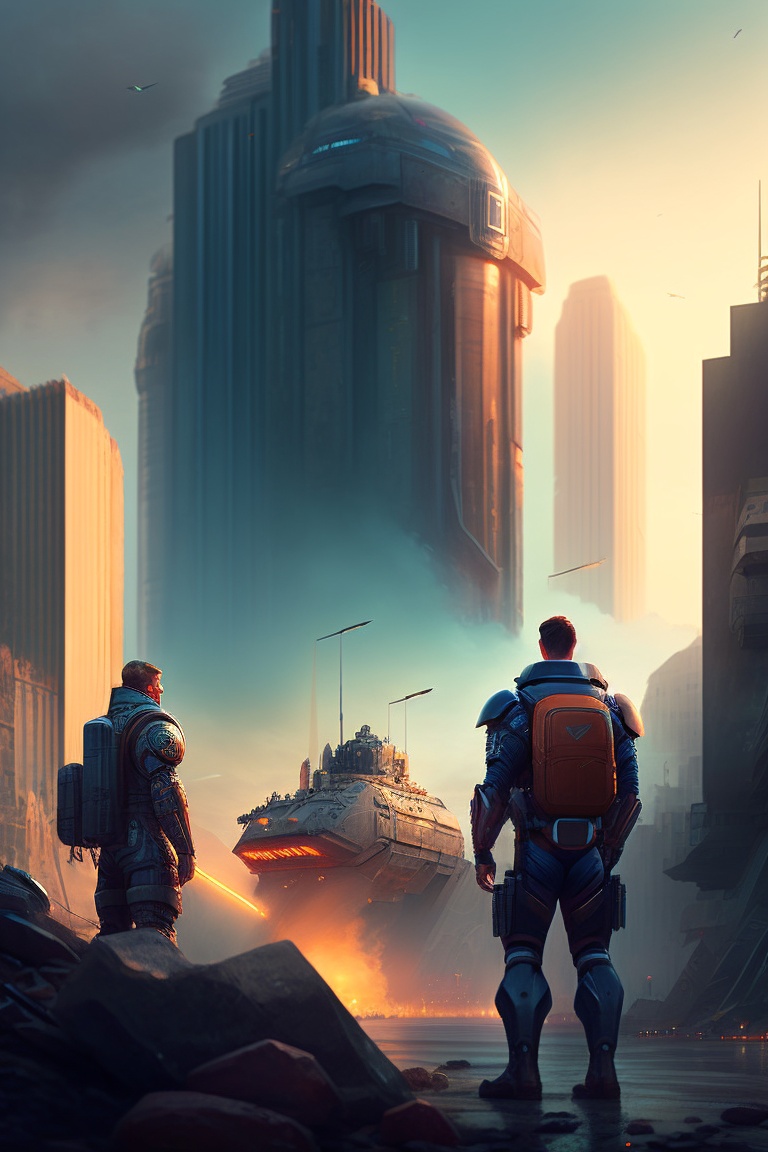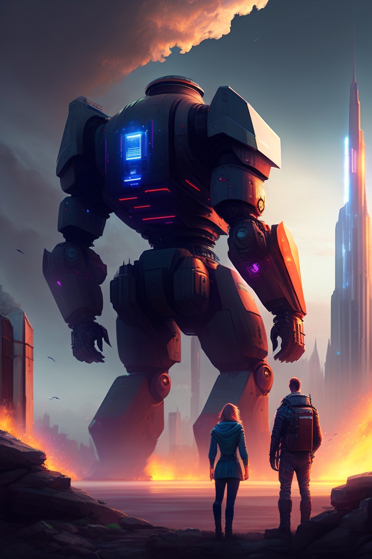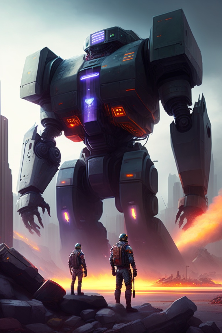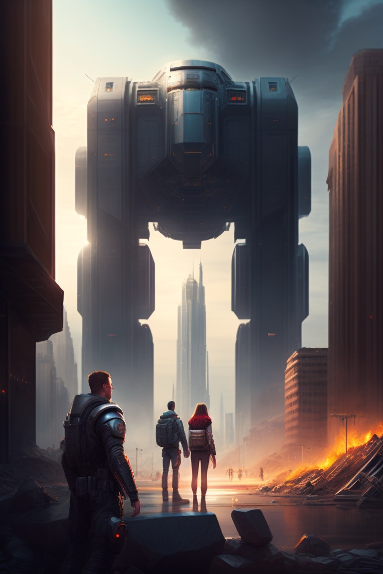 Scifi scene people looking at giant robot standing destroyed city digital art illustration, highly detailed