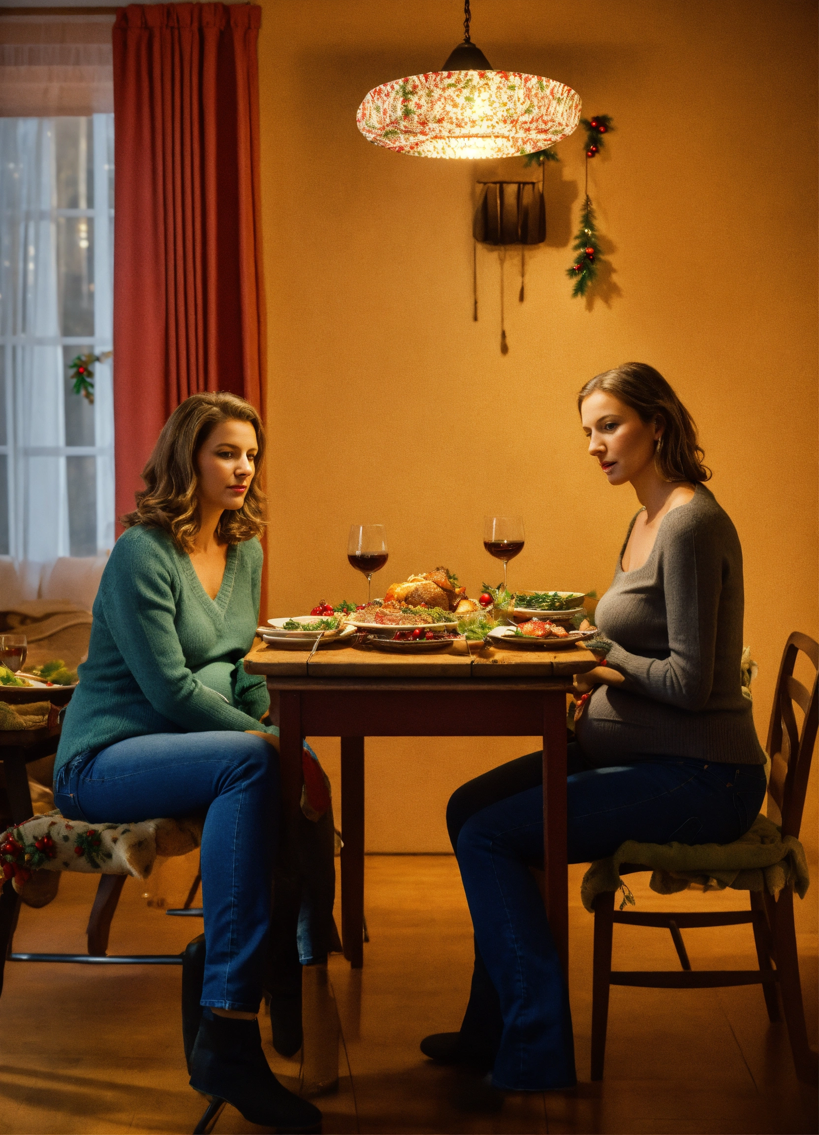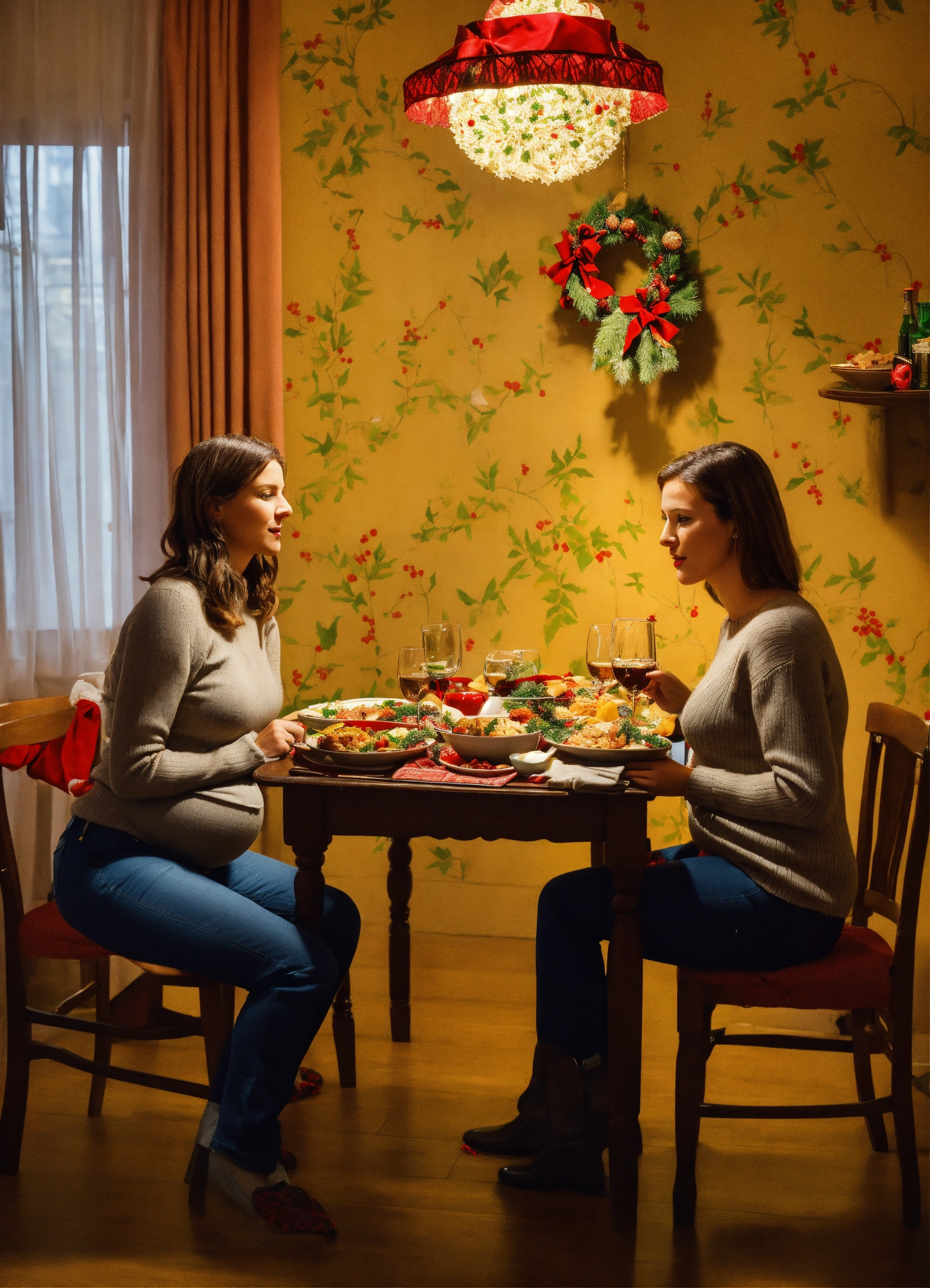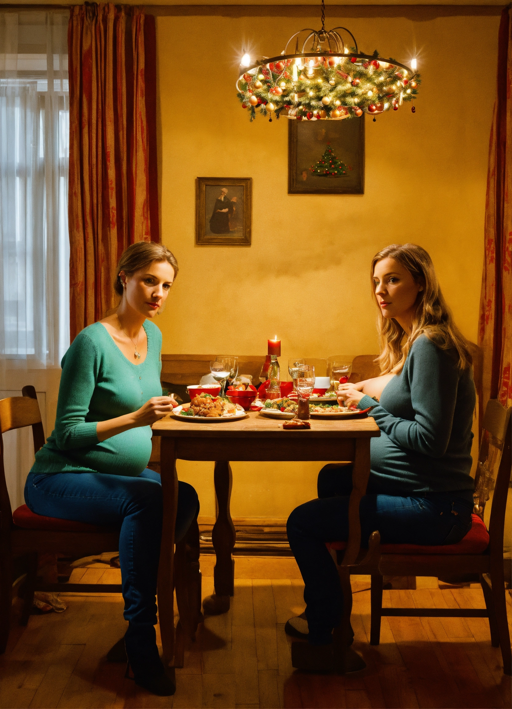 "annett möller" and "evelyn weigert". modern. sitting at christmas.slender with pregnant-looking bellies. dinner table. gluttony. jeans. christmas sweater. they are leaning back in their chairs, stuffed to the brim, with their jeans unbuttoned. the table is cluttered with dirty plates, and a nearly completely eaten turkey, representing a typical scene after the meal. realistic.