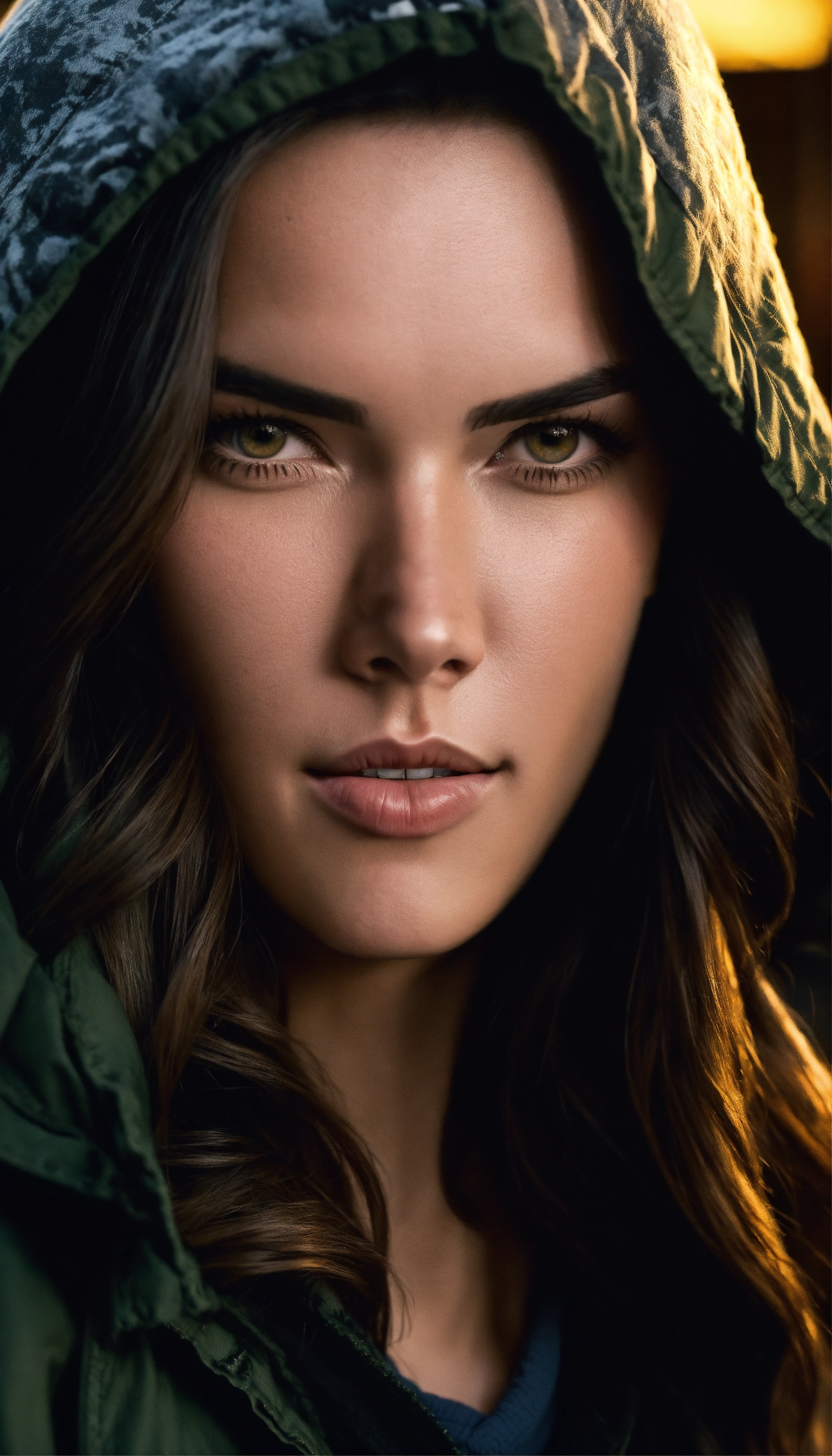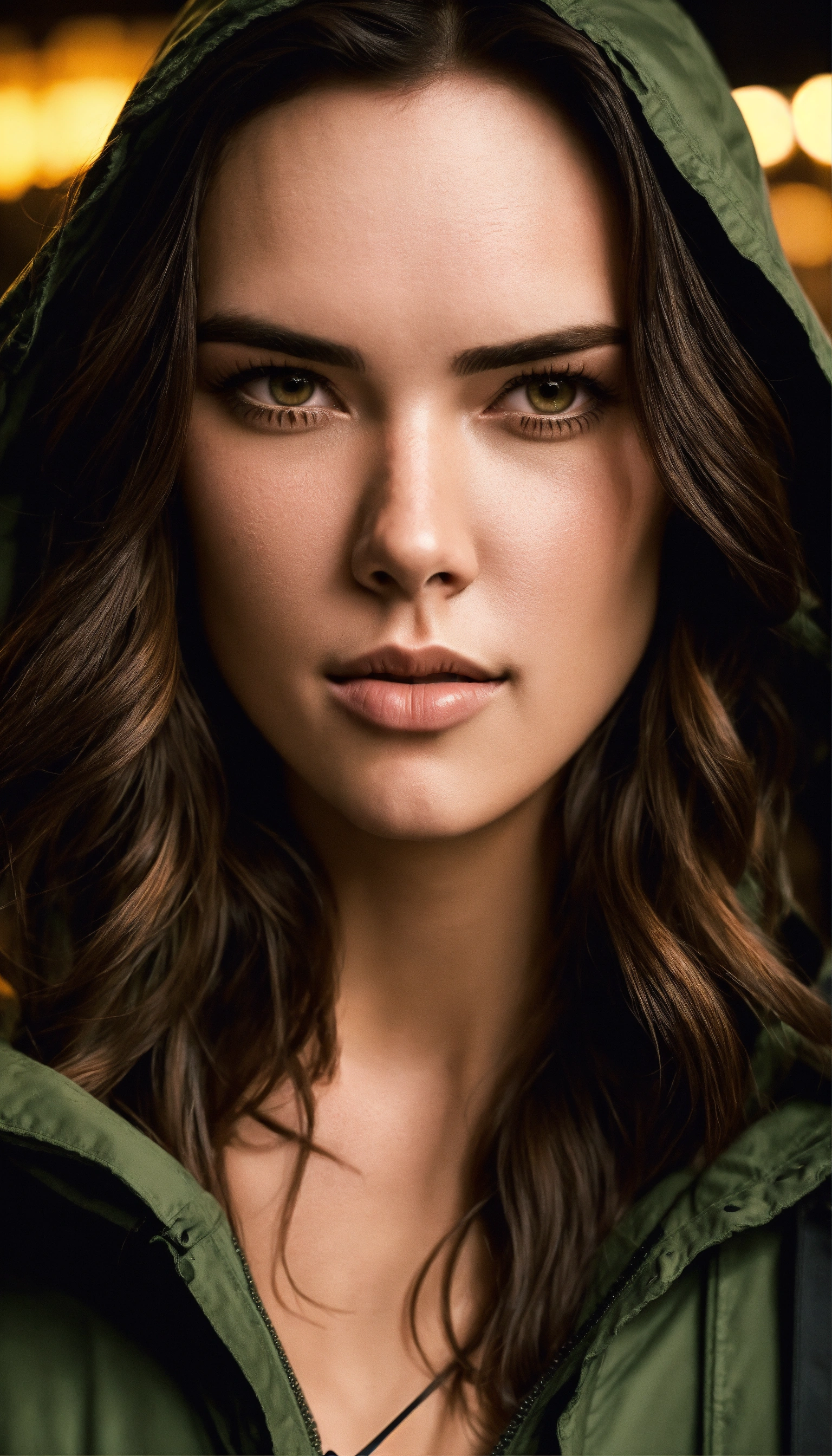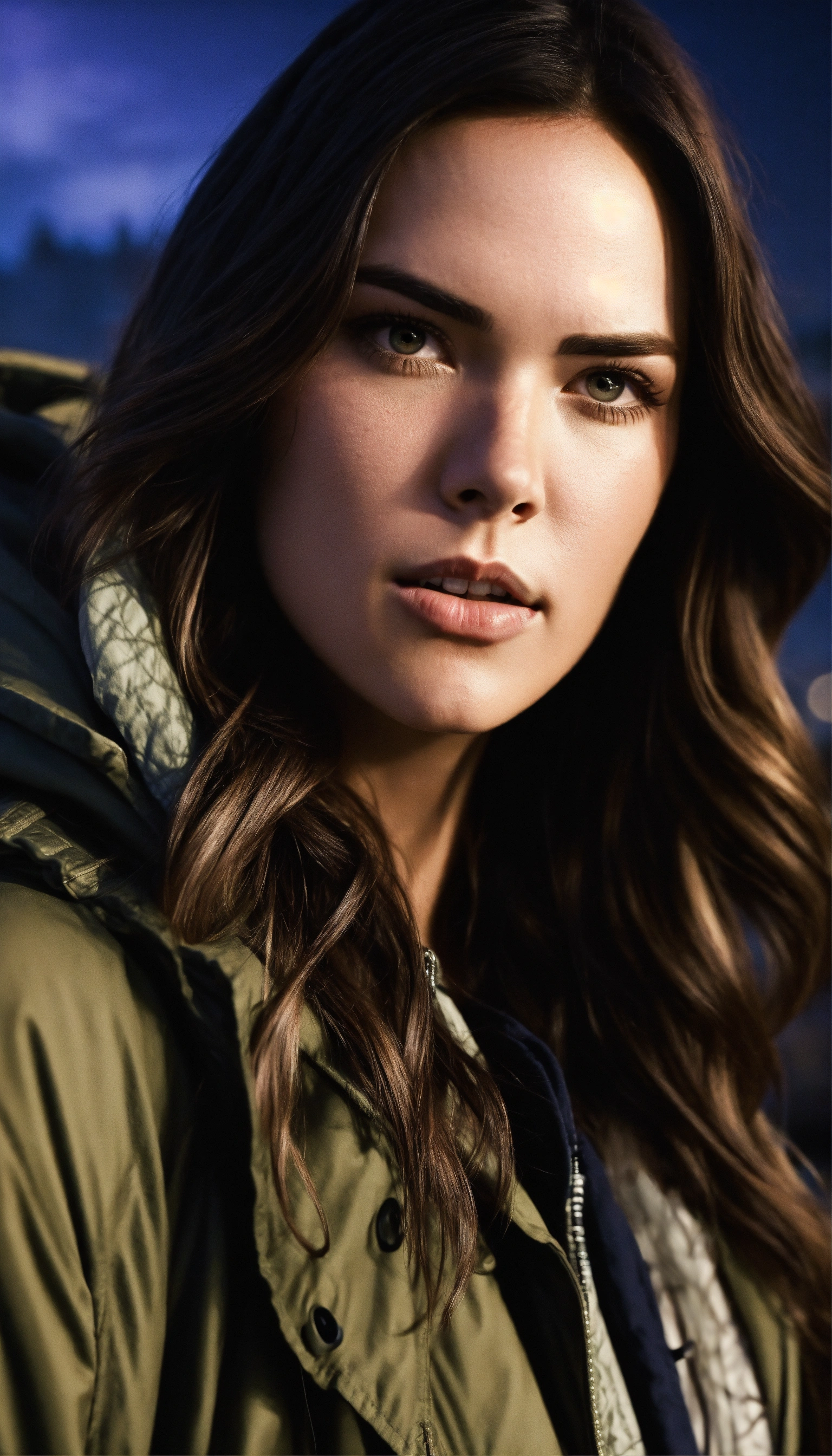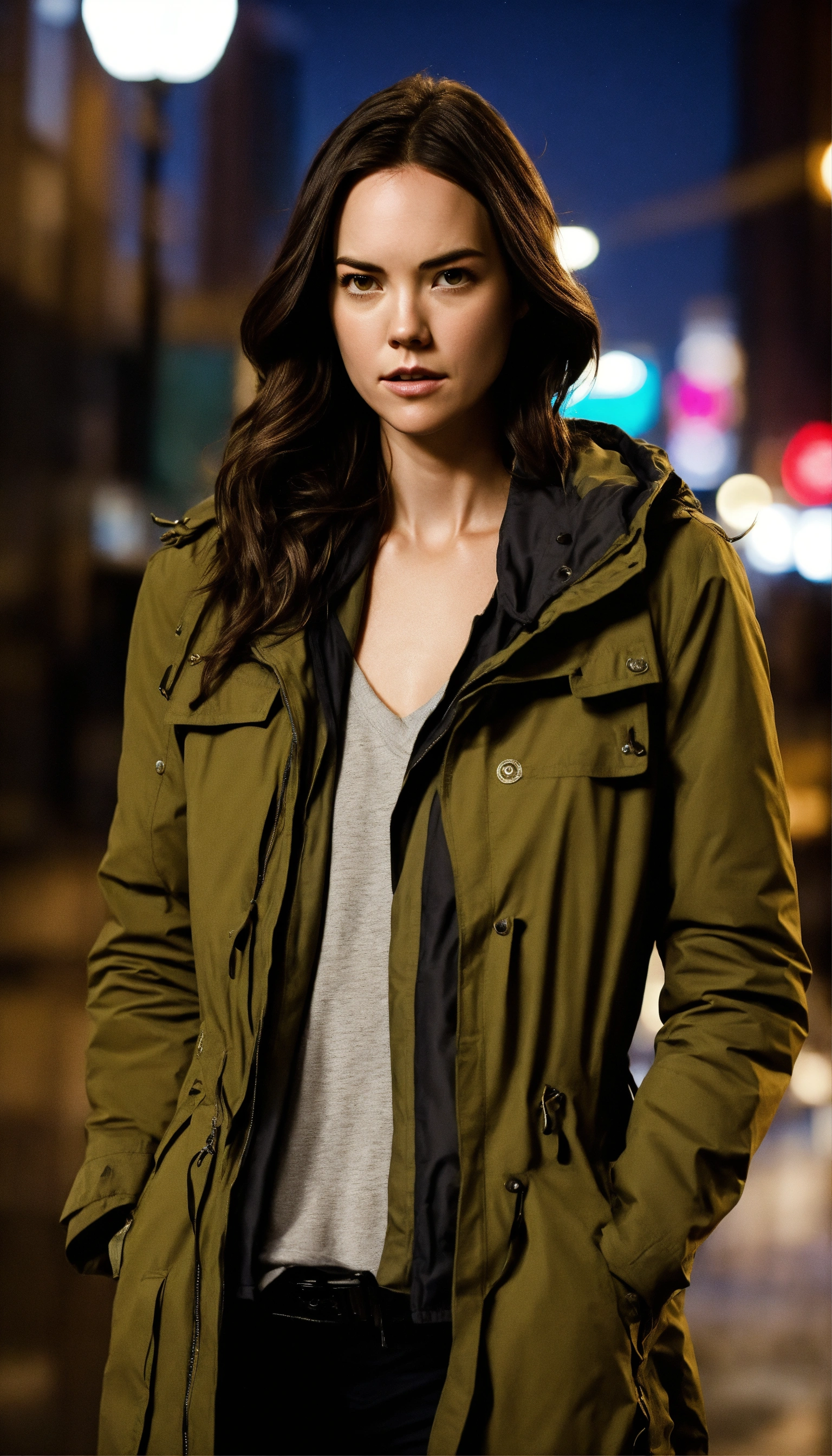 Very beautiful 30 years old odette annable, cute big hazel eyes, long hair, fearless detective, night, city, life-or-death situation, parka, cinematic, realistic walk, closed mouth serious face arrow tv show