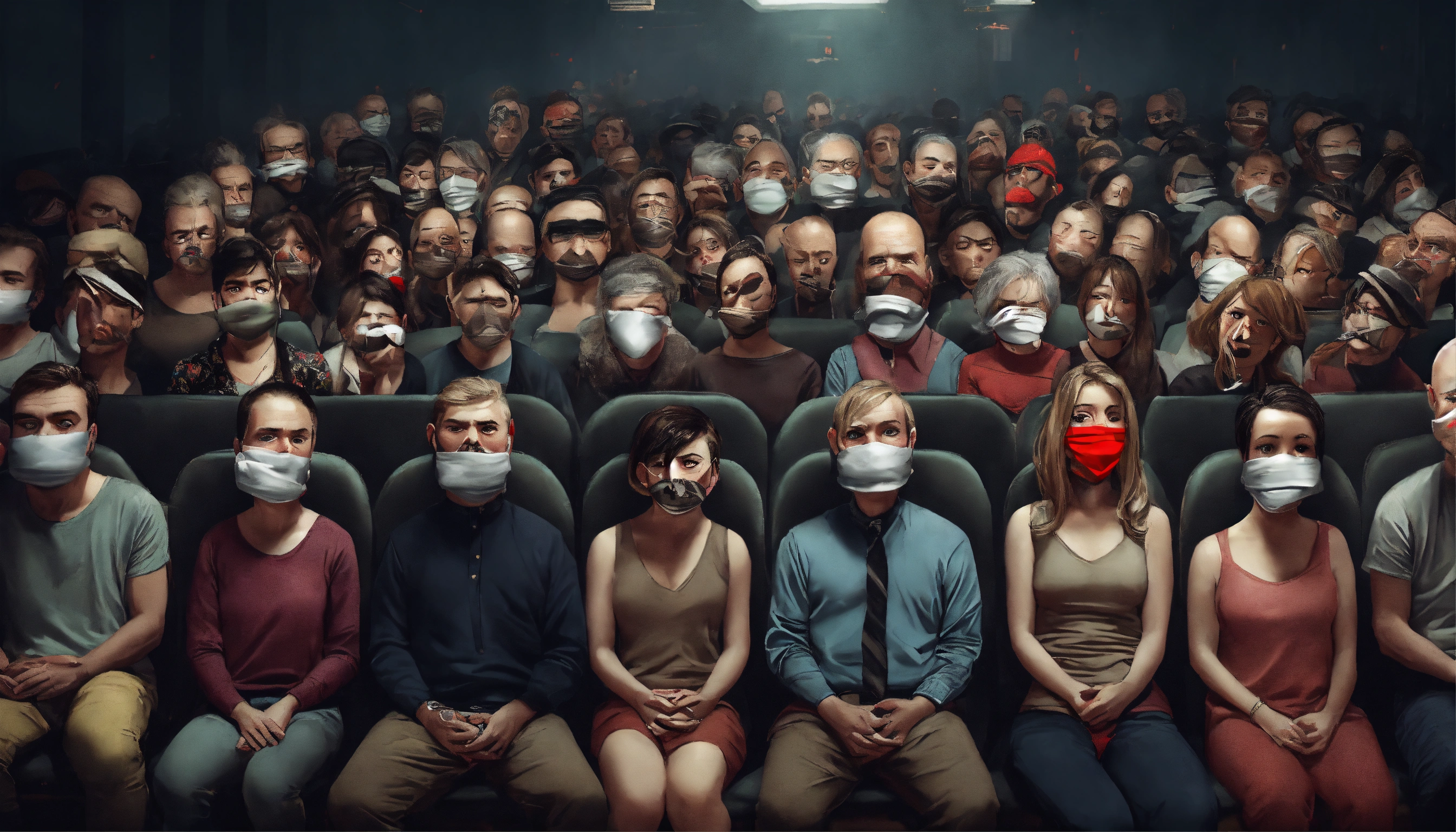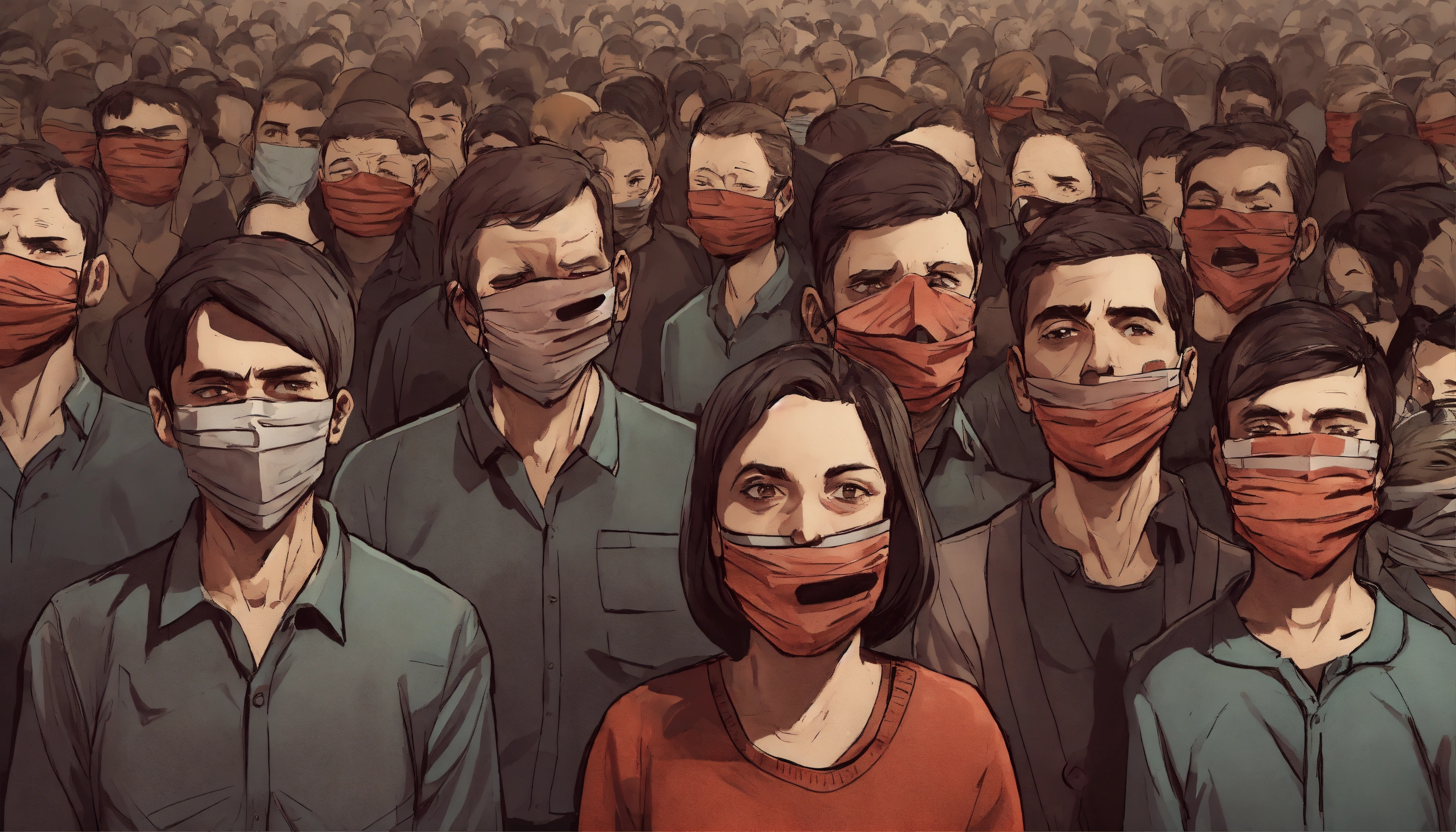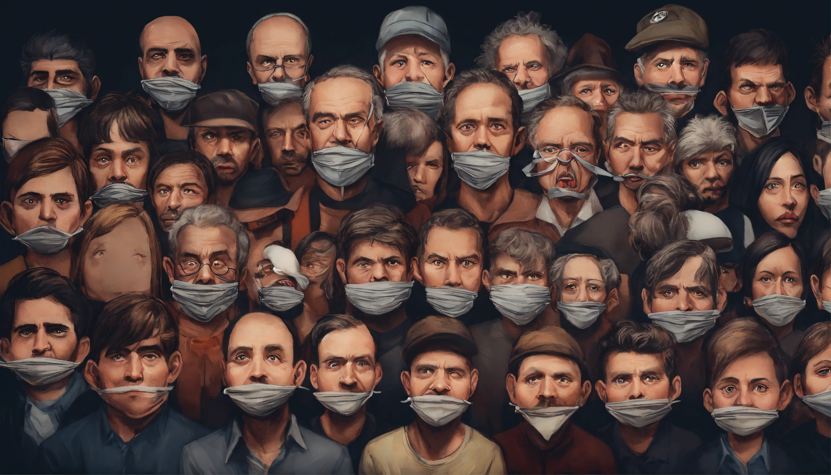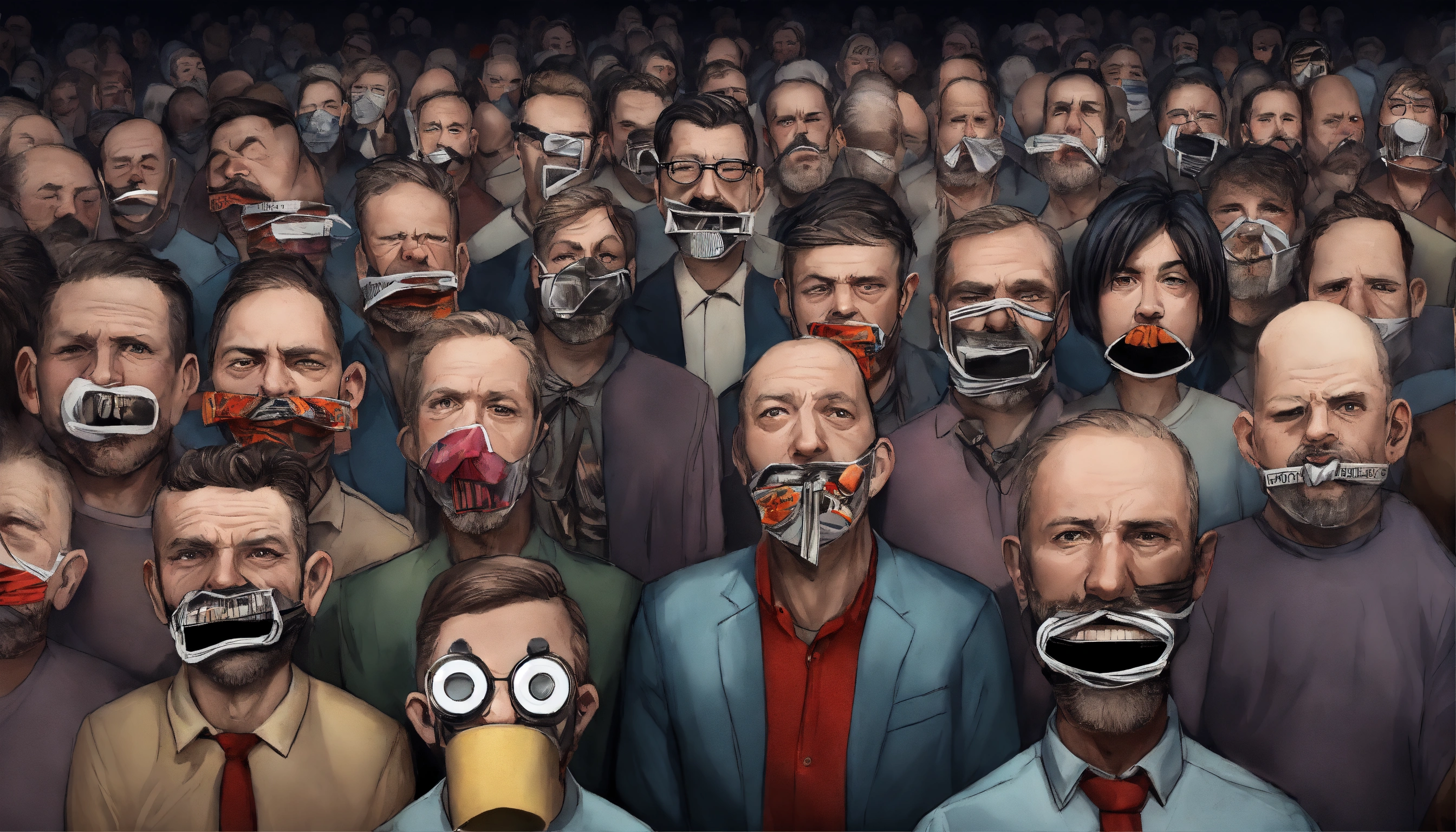 A bunch of people with their mouths taped shut, ominous and eery, censored people, caricature dark mood cartoon, extremely creative and unique, highly detailed and realistic