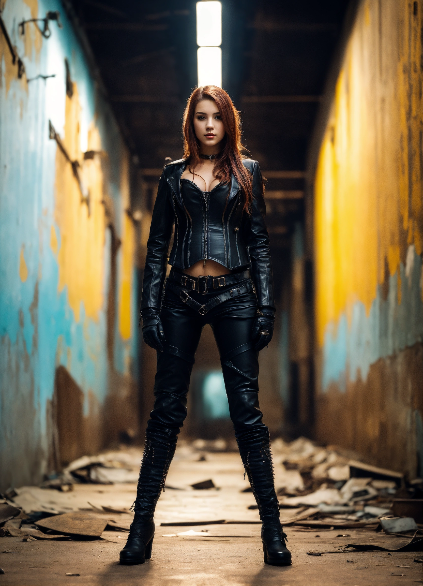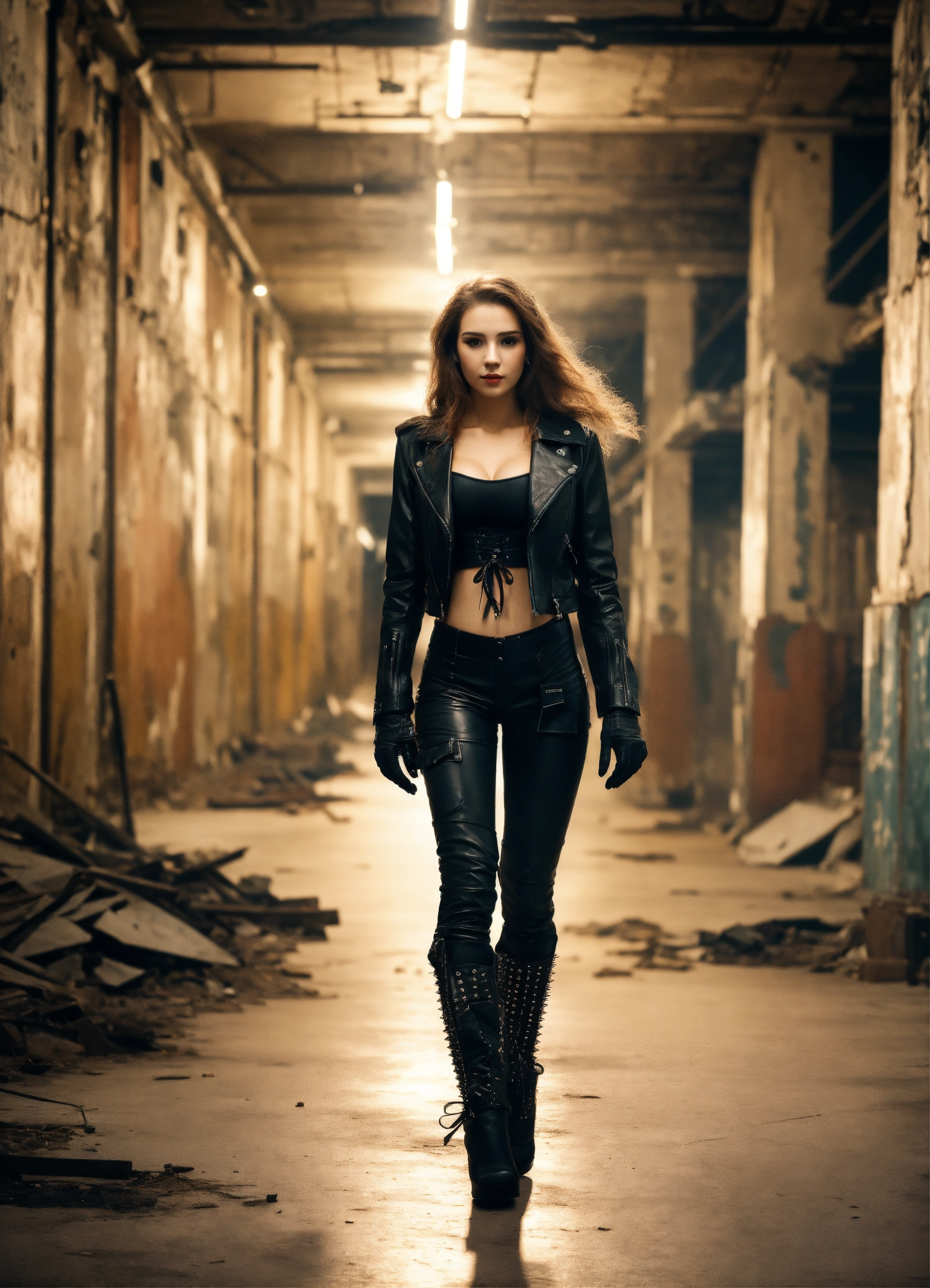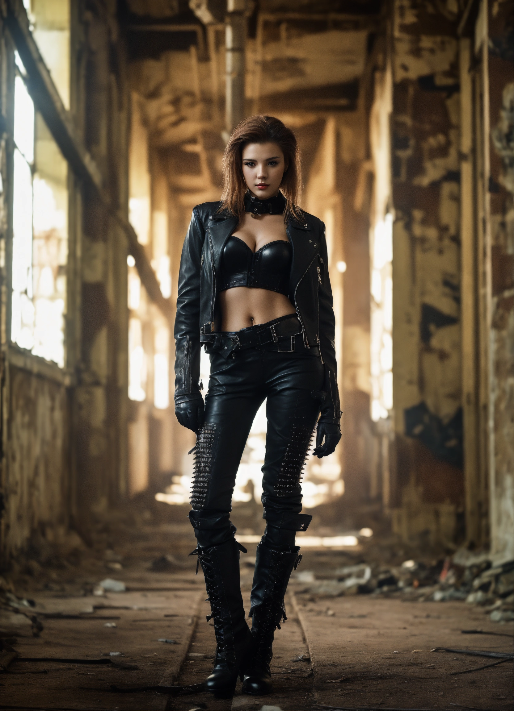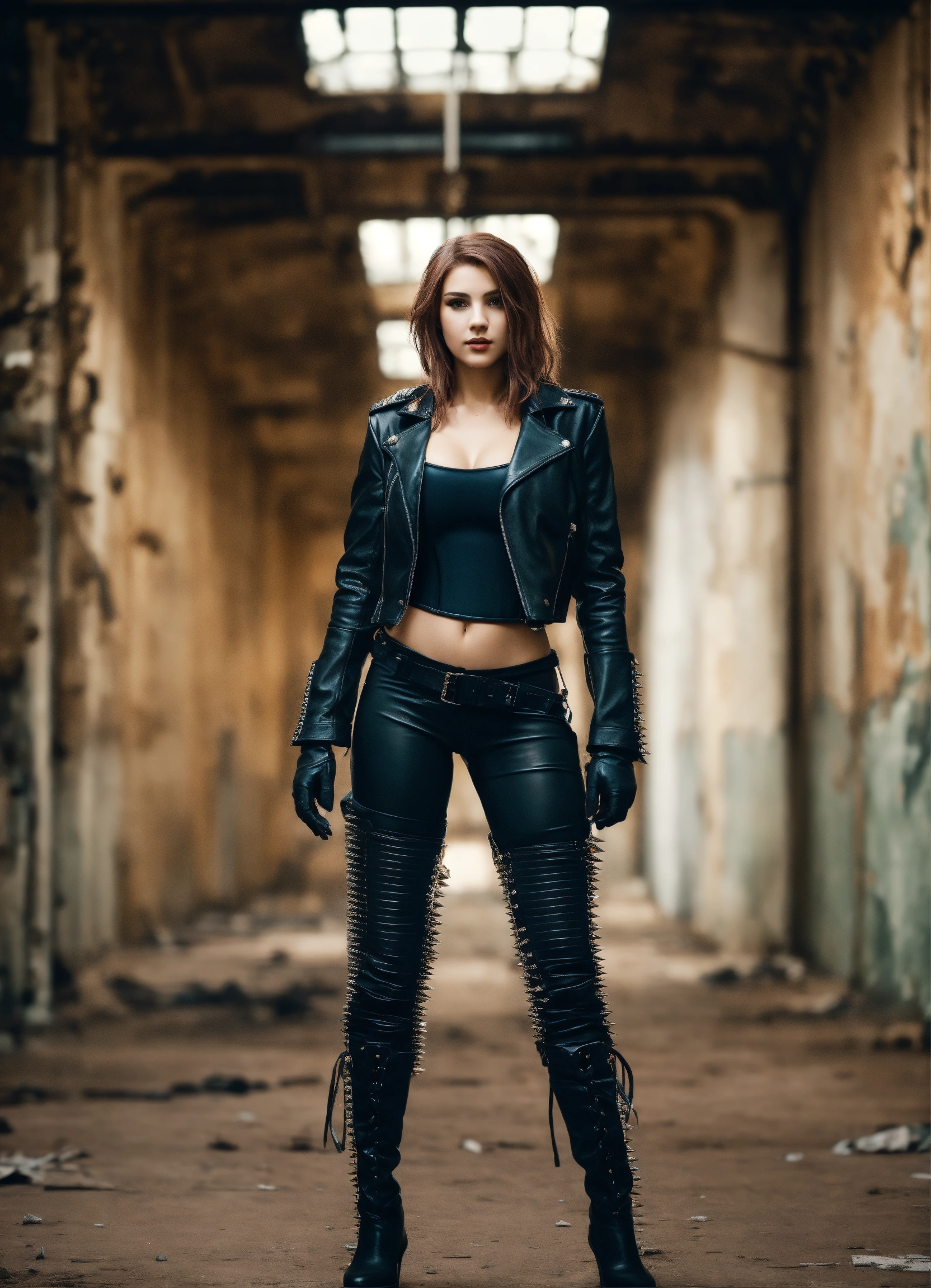 A beautiful 20 years old woman wearing a black leather jacket, corset, pants and gloves posing in an abandoned faktory corridor, high definition, 8k render fullbody, looks like a real life version of alicent hightower heavy metal style, spikes